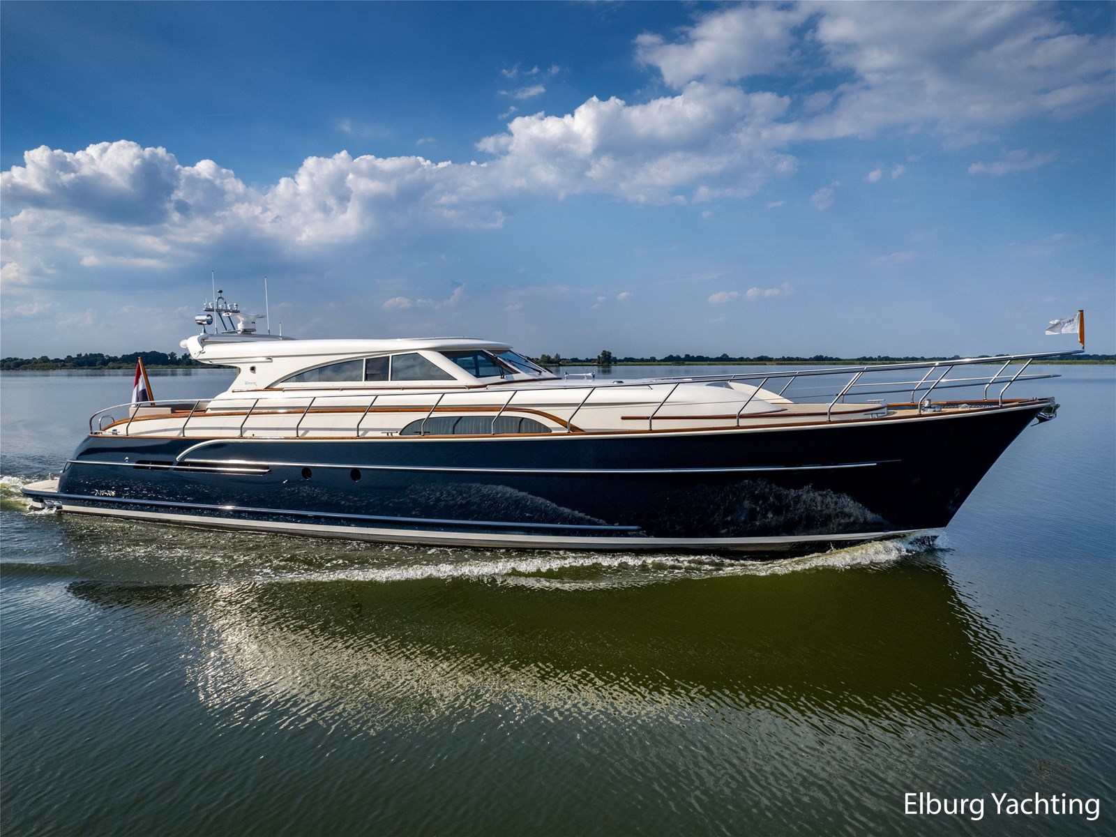 Beautiful Mulder 68 Convertible - Stabilizers, A timeless design by Guido de Groot, built by the renowned shipyard Mulder. This Mulder 68 Convertible underwent a refit in 2021. The following matters were carried out: All navigation equipment upgraded to the latest generation of Raymarine, upholstery in the saloon/wheelhouse/aft deck renewed, carpet in the saloon/wheelhouse renewed, teak deck sanded and impregnated hull and superstructure polished, new antifouling, propellers polished, new lighting inside and outside, outside cushion set on foredeck, maintenance performed on both main engines/generator/pumps. This beautiful Mulder 68 Convertible - Stabilizers is ready to sail and fully equipped for long trips over inland water and/or open sea. She has : Salon + dinette on same level, large sliding door to afterdeck, 2 x stairs to bathing platform, large sliding roof in saloon, headway height appr. 5.75 m, min. height approx 3.60 m, Alcantara upholstery, stainless steel railing + stainless steel hand guides, dimming lights trough entire ship, large steering sofa electrically adjustable in height + large sofa (next steering position), 3 x 2-armed Exalto wippers + sprinkler system, Corian worktops, Grohe taps, stainless steel portholes + blinds, anti rattle locks, a lot of storage space, Miele dishwasher, ship has always been located in own shiphouse, Miele WT945 washer dryer, TFT camera system, outside entrance engine room, sunscreens over afterdeck, 2 x side stairs, owner's cabin midships. For questions and/or making an appointment you are welcome 7 days a week at Elburg Yachting.