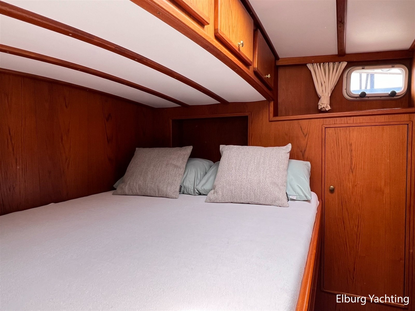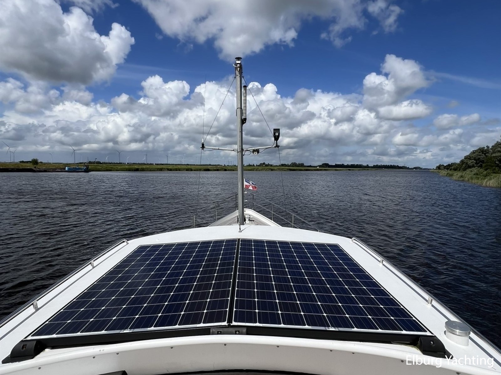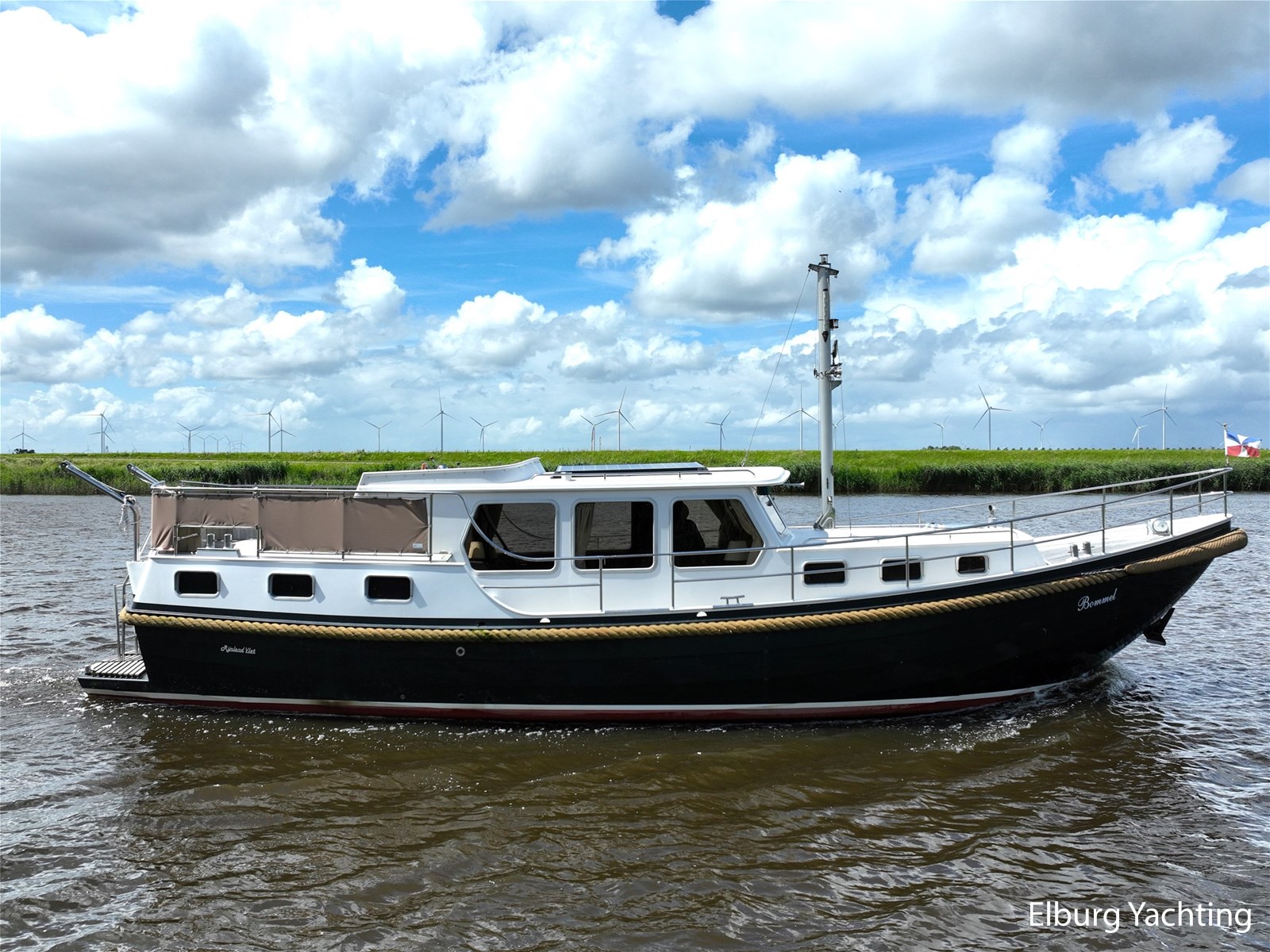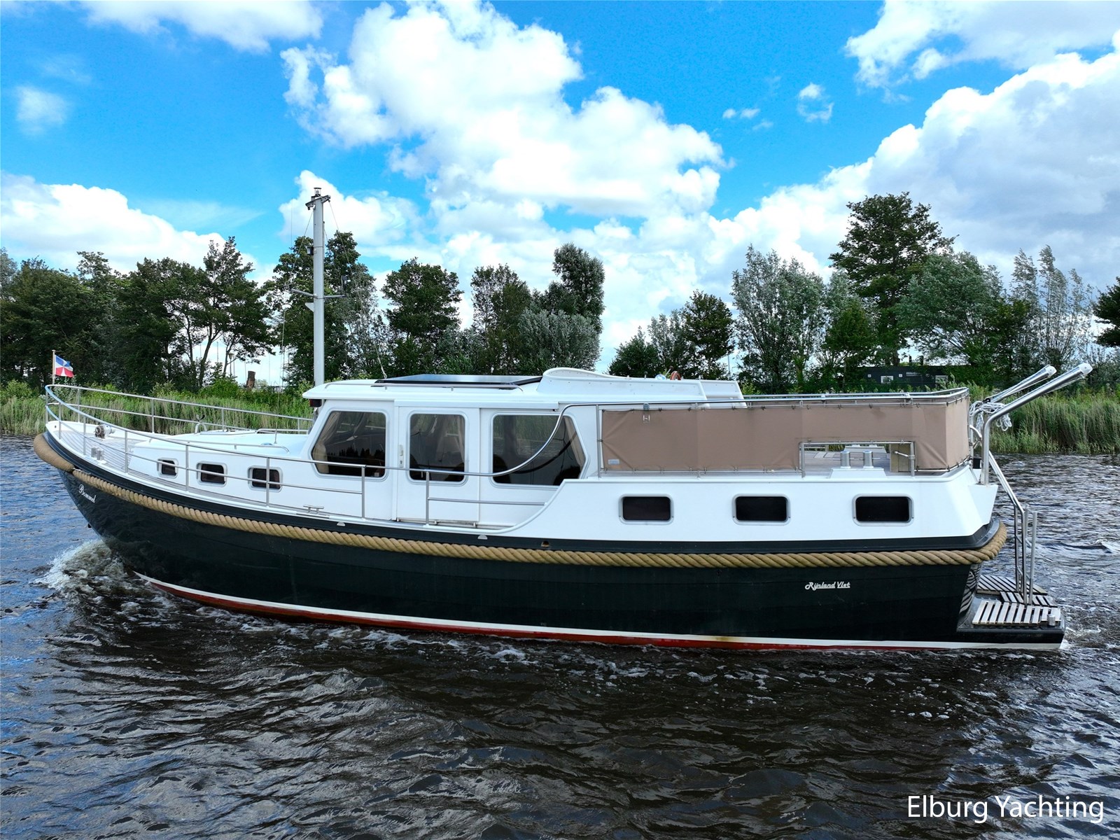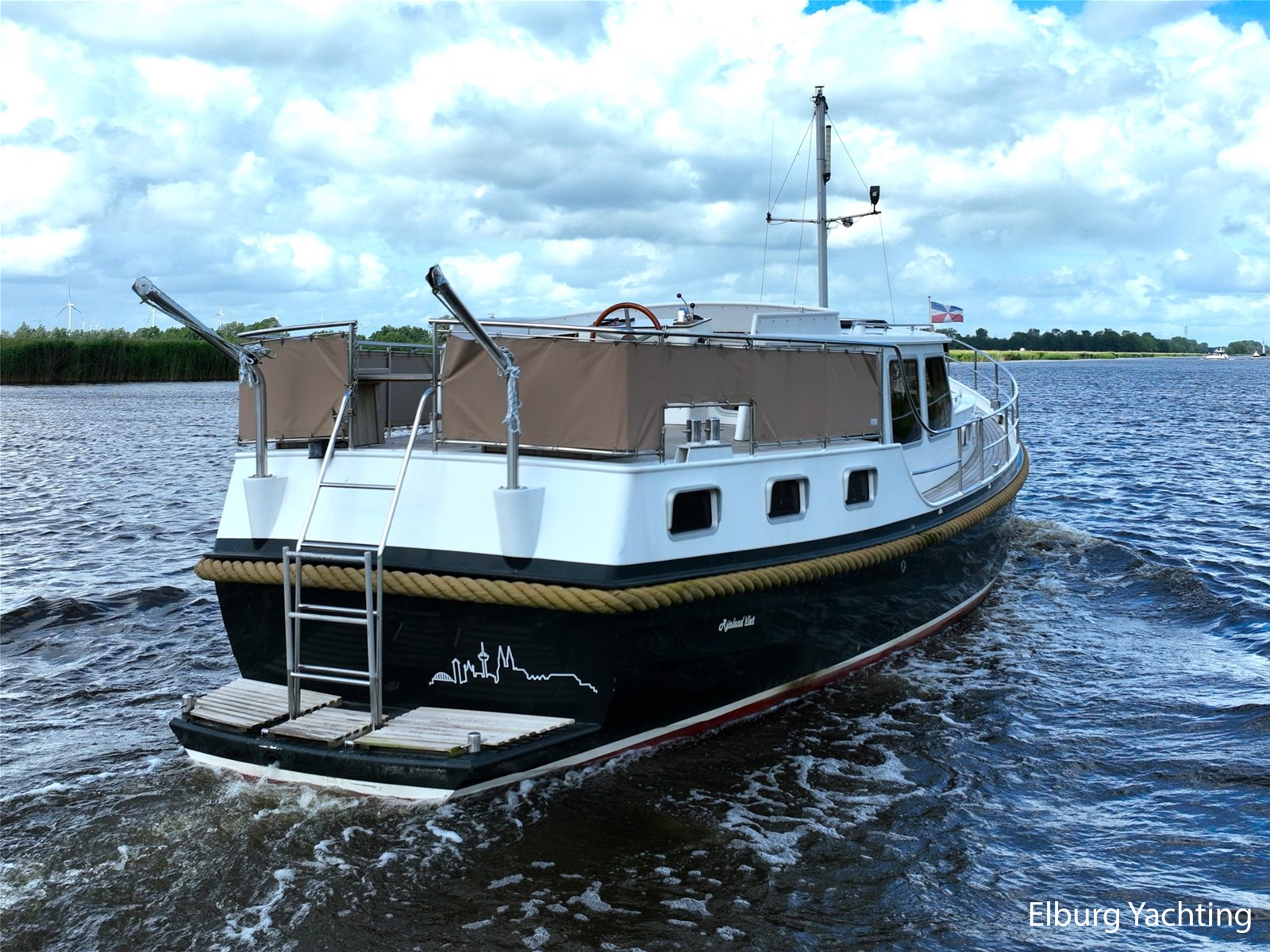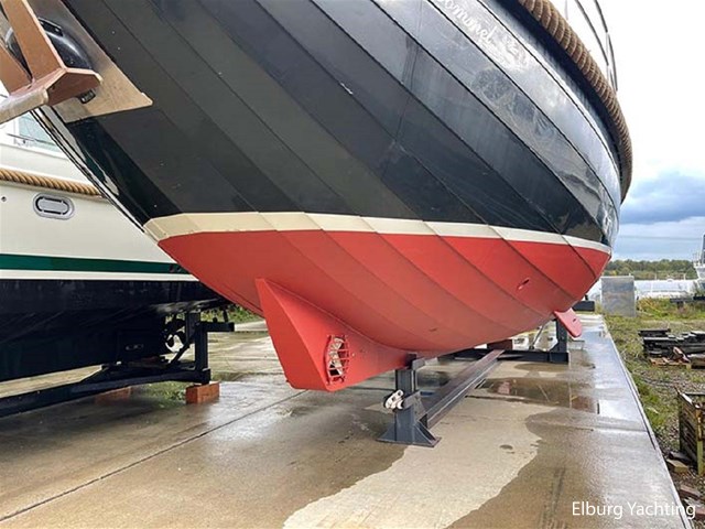 Classic Rijnlandvlet with beautiful clinker-built hull. This Rijnlandvlet 12.50 with aft cabin is equipped with: complete tent around aft deck with removable parts (2022), entry to saloon/wheelhouse via aft deck and BB side door, double stainless steel railing, large storage hatch in forepeak, foldable mast on foredeck, dinette against galley can also be used as an extra berth by mechanically lowering the table, wooden floor in saloon, separate shower and toilet in aft ship, large portholes, raised saloon settee for outside view, engine room accessible through insulated floor hatches, 2 x 330W solar panels + Victron BlueSolar charge controller MPPT 100 | 30, mosquito nets for portholes, cable fender all around, forward cabin with own washbasin, minimum clearance height appr. 2.50 metres.