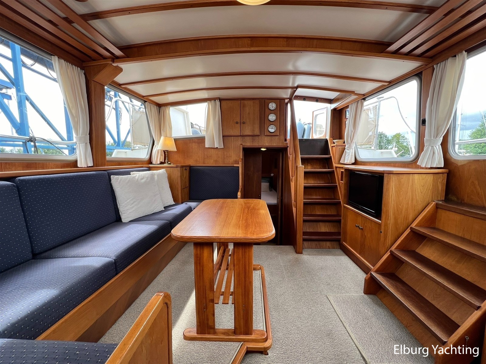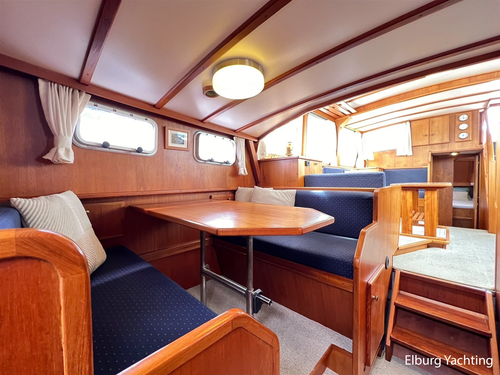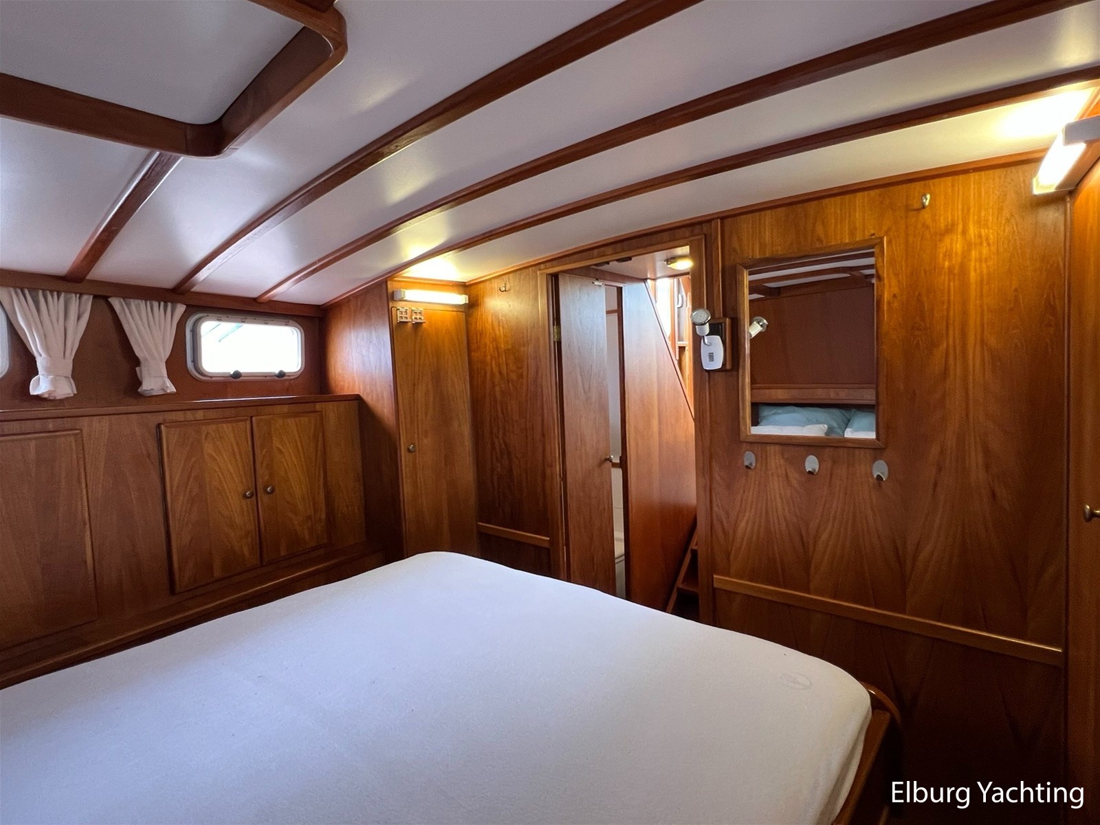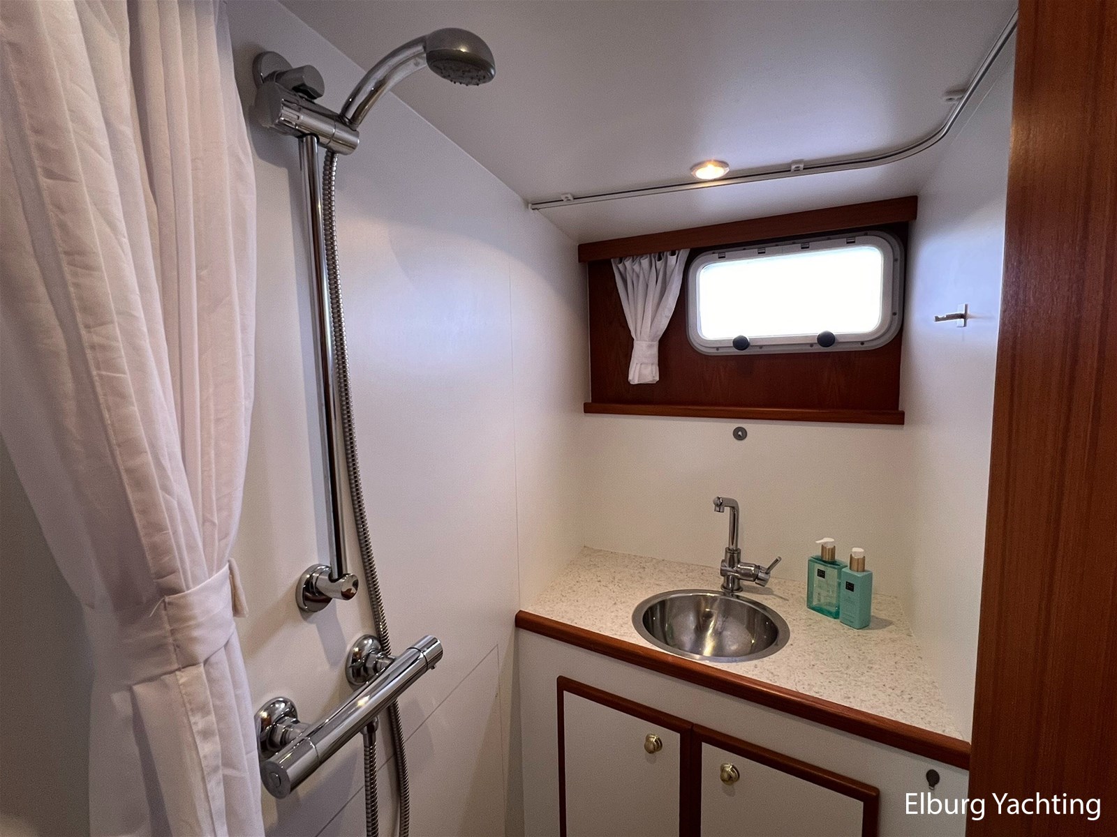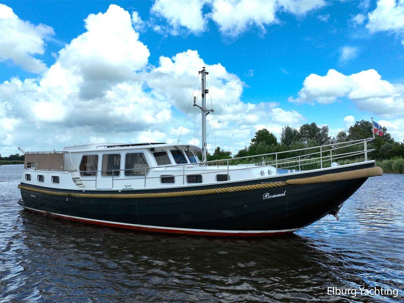 Classic Rijnlandvlet with beautiful clinker-built hull. This Rijnlandvlet 12.50 with aft cabin is equipped with: complete tent around aft deck with removable parts (2022), entry to saloon/wheelhouse via aft deck and BB side door, double stainless steel railing, large storage hatch in forepeak, foldable mast on foredeck, dinette against galley can also be used as an extra berth by mechanically lowering the table, wooden floor in saloon, separate shower and toilet in aft ship, large portholes, raised saloon settee for outside view, engine room accessible through insulated floor hatches, 2 x 330W solar panels + Victron BlueSolar charge controller MPPT 100 | 30, mosquito nets for portholes, cable fender all around, forward cabin with own washbasin, minimum clearance height appr. 2.50 metres.