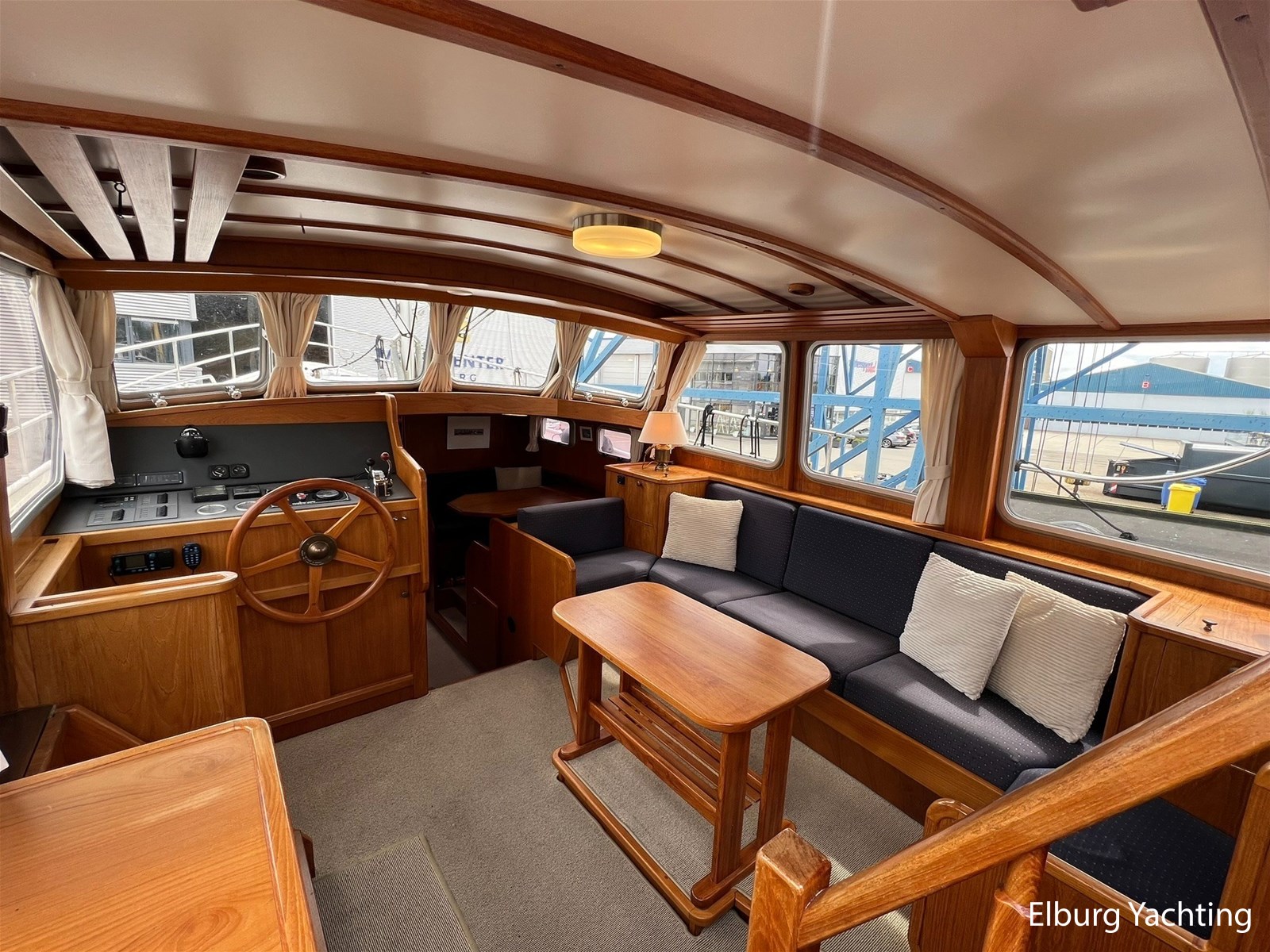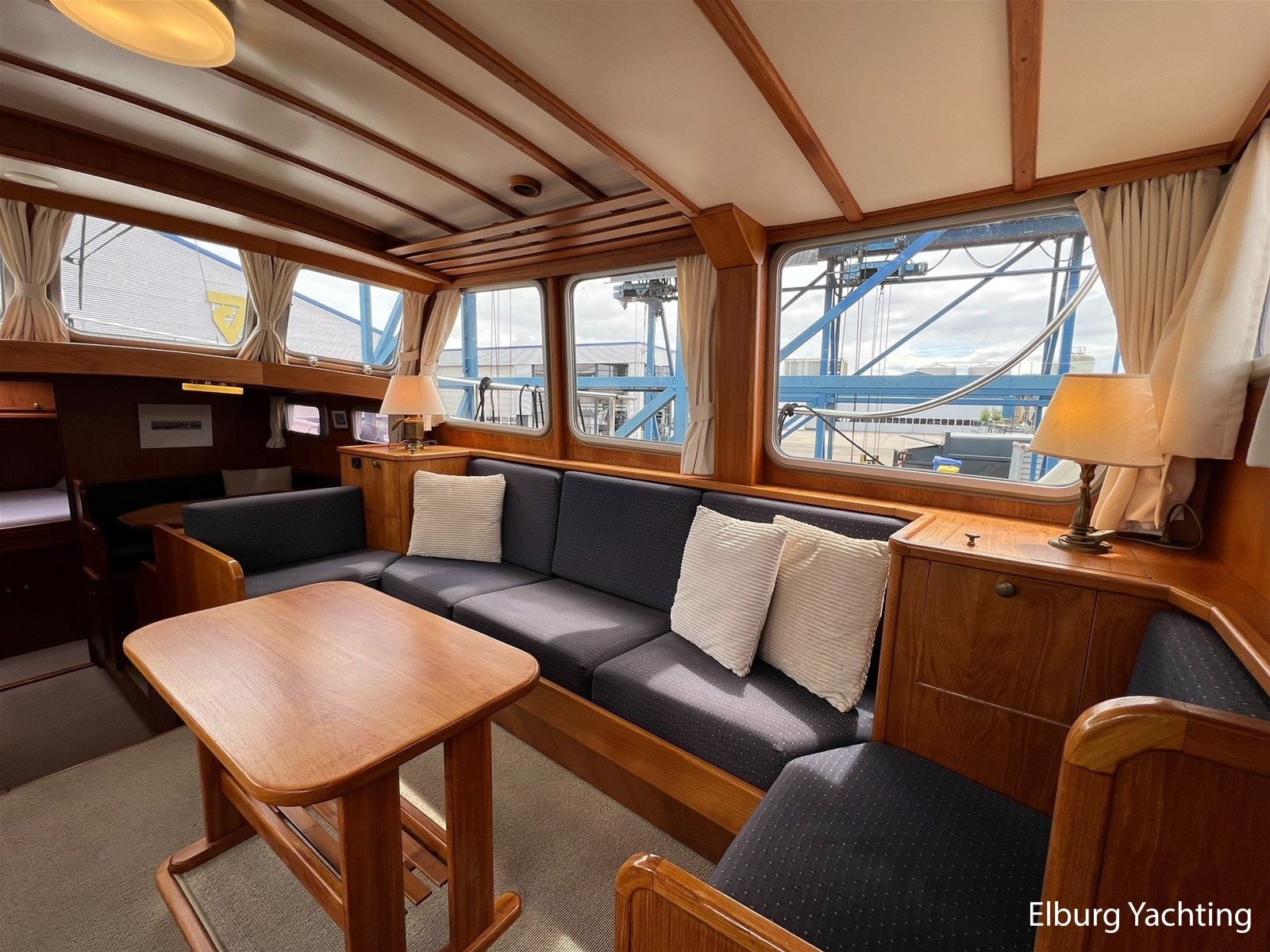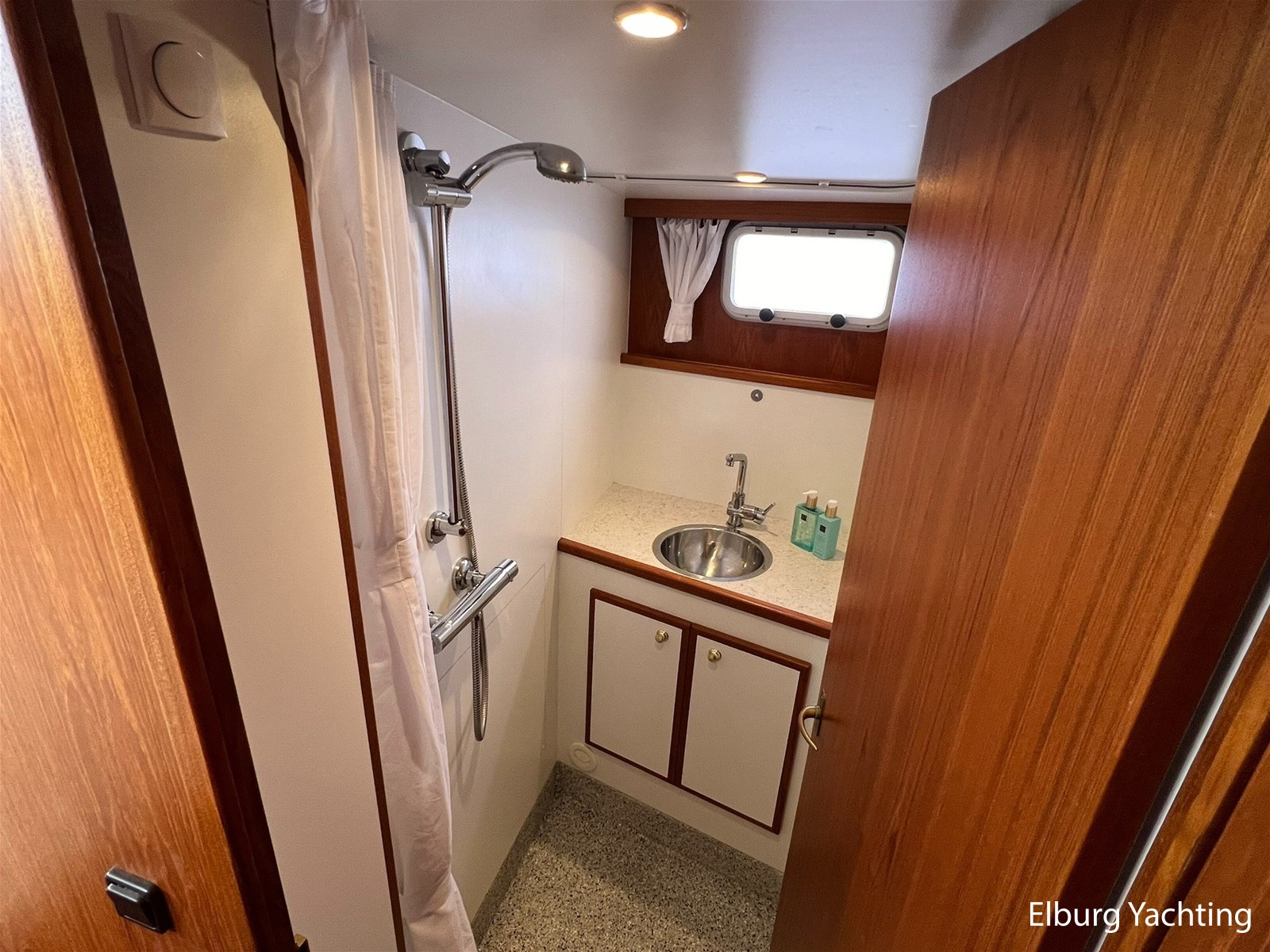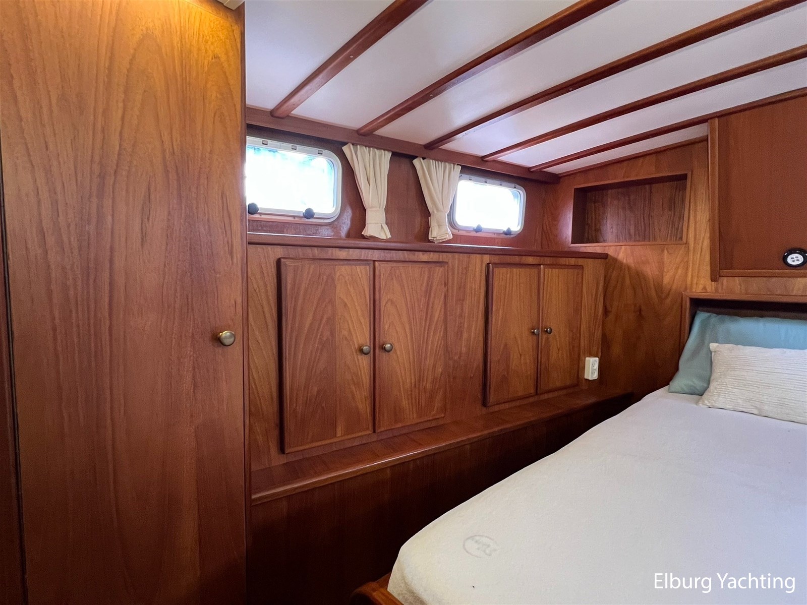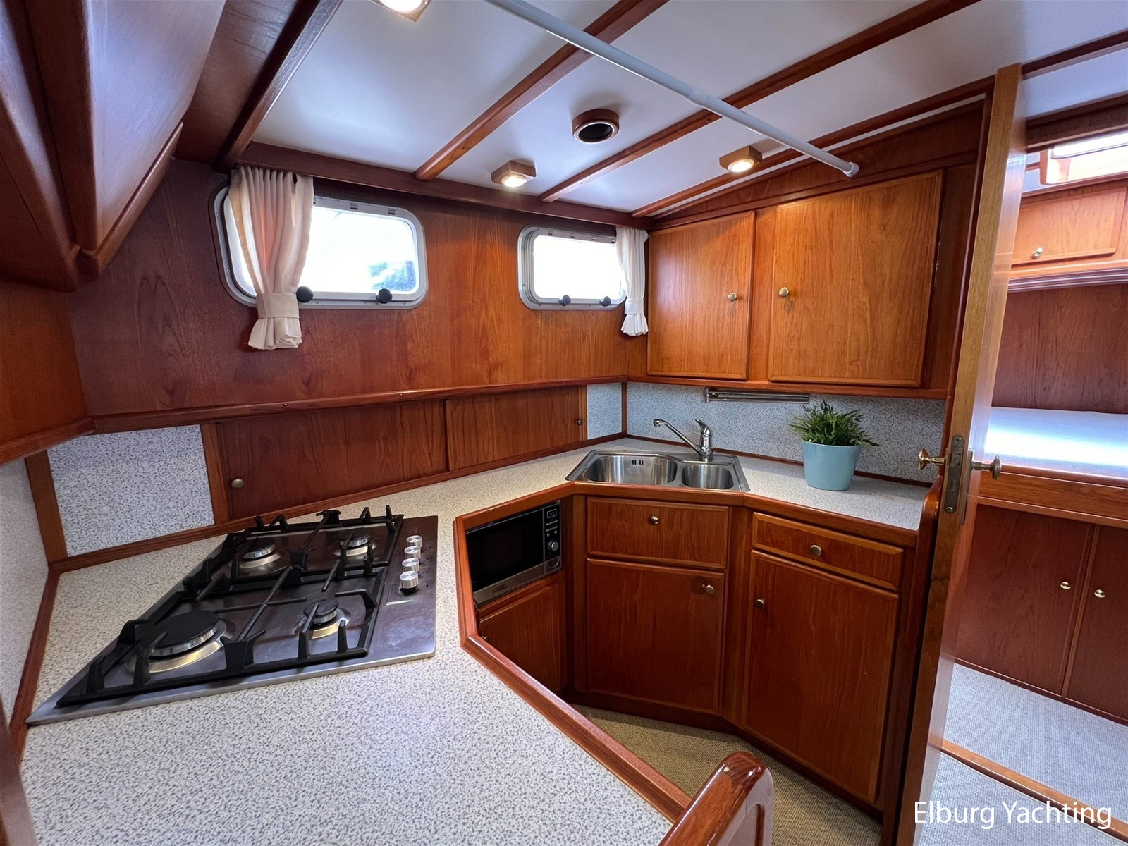 Classic Rijnlandvlet with beautiful clinker-built hull. This Rijnlandvlet 12.50 with aft cabin is equipped with: complete tent around aft deck with removable parts (2022), entry to saloon/wheelhouse via aft deck and BB side door, double stainless steel railing, large storage hatch in forepeak, foldable mast on foredeck, dinette against galley can also be used as an extra berth by mechanically lowering the table, wooden floor in saloon, separate shower and toilet in aft ship, large portholes, raised saloon settee for outside view, engine room accessible through insulated floor hatches, 2 x 330W solar panels + Victron BlueSolar charge controller MPPT 100 | 30, mosquito nets for portholes, cable fender all around, forward cabin with own washbasin, minimum clearance height appr. 2.50 metres.