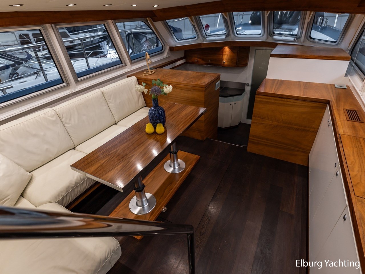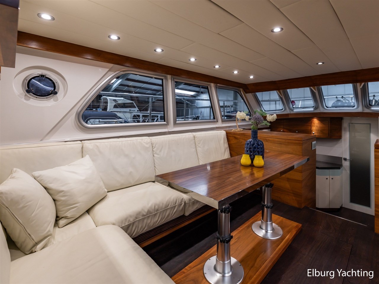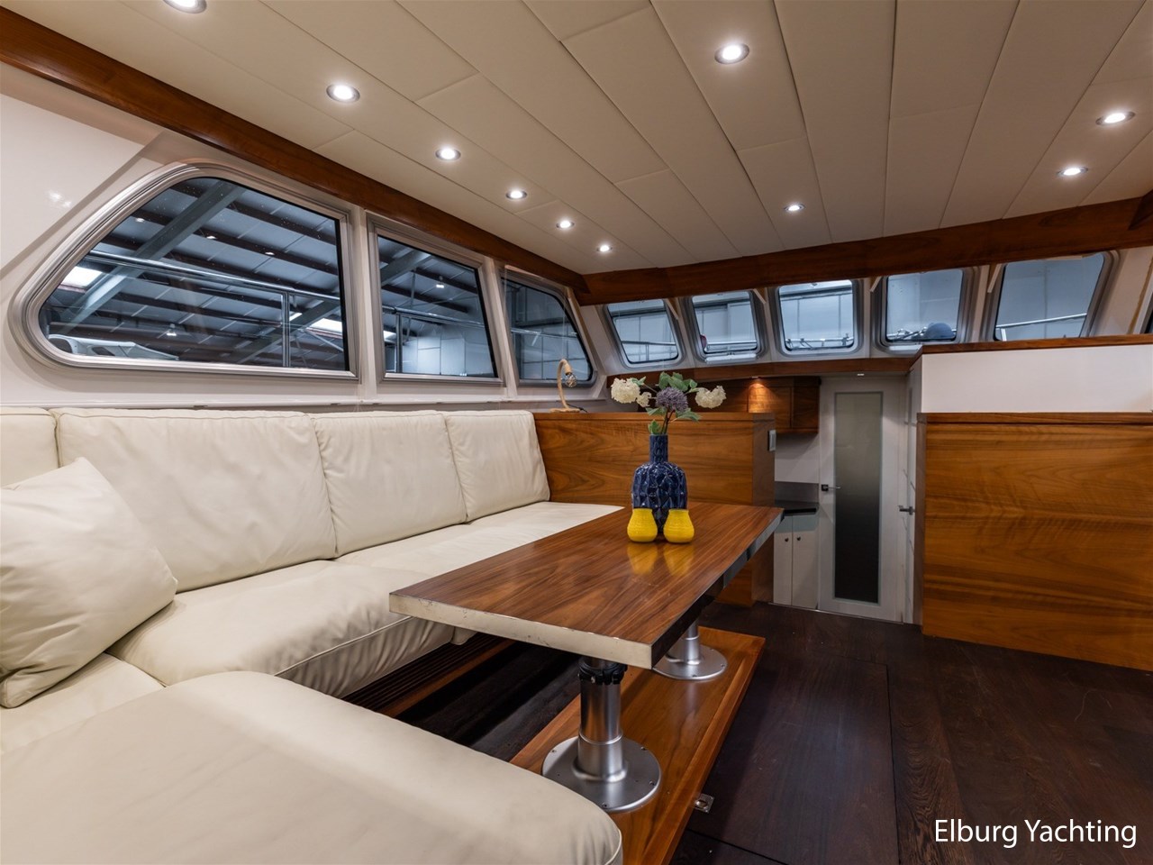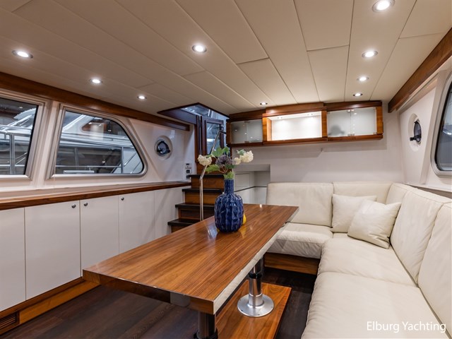 The Holterman 50 Cabrio is an elegant and classic/modern lined motoryacht with a high level of finishing. The design comes from Pieter Beeldsnijder. Eye-catching features are the round bilge underwater hull with stabilizers, the electrically operated cabrio hood, flaired bow and the negative stern with integrated bathing platform. The vessel is equipped with: Full tent over aft deck with removable parts, fixed bulwark with safe stainless steel railing all around, 2 x door in transom for passage to bathing platform, integrated bench on foredeck with removable seat cushion, John Deere engine management displays, storage space below bench aft deck, deck wash pump, 8 x stainless steel bollards on deck + 2 x on swim platform, removable side ladder for access side decks, lockable storage in stern with lighting and 220V WCD, 2 x fixed helm seats with adjustment possibilities, Hydronautica remote control + joystick controls at helm position, Utility room with cupboard space and a Miele WT 2670 washer/dryer combination, Miele dishwasher in galley, access engine room via floor hatch in saloon, pleated blinds, TV on lift, walk-in closet in owner's cabin + access to electrical cabinet, extra storage space under front and rear bed, in two parts folding radar mast which provides a minimum clearance height of approx. 3,60m. For questions and/or making an appointment, you are welcome 7 days a week at Elburg Yachting.