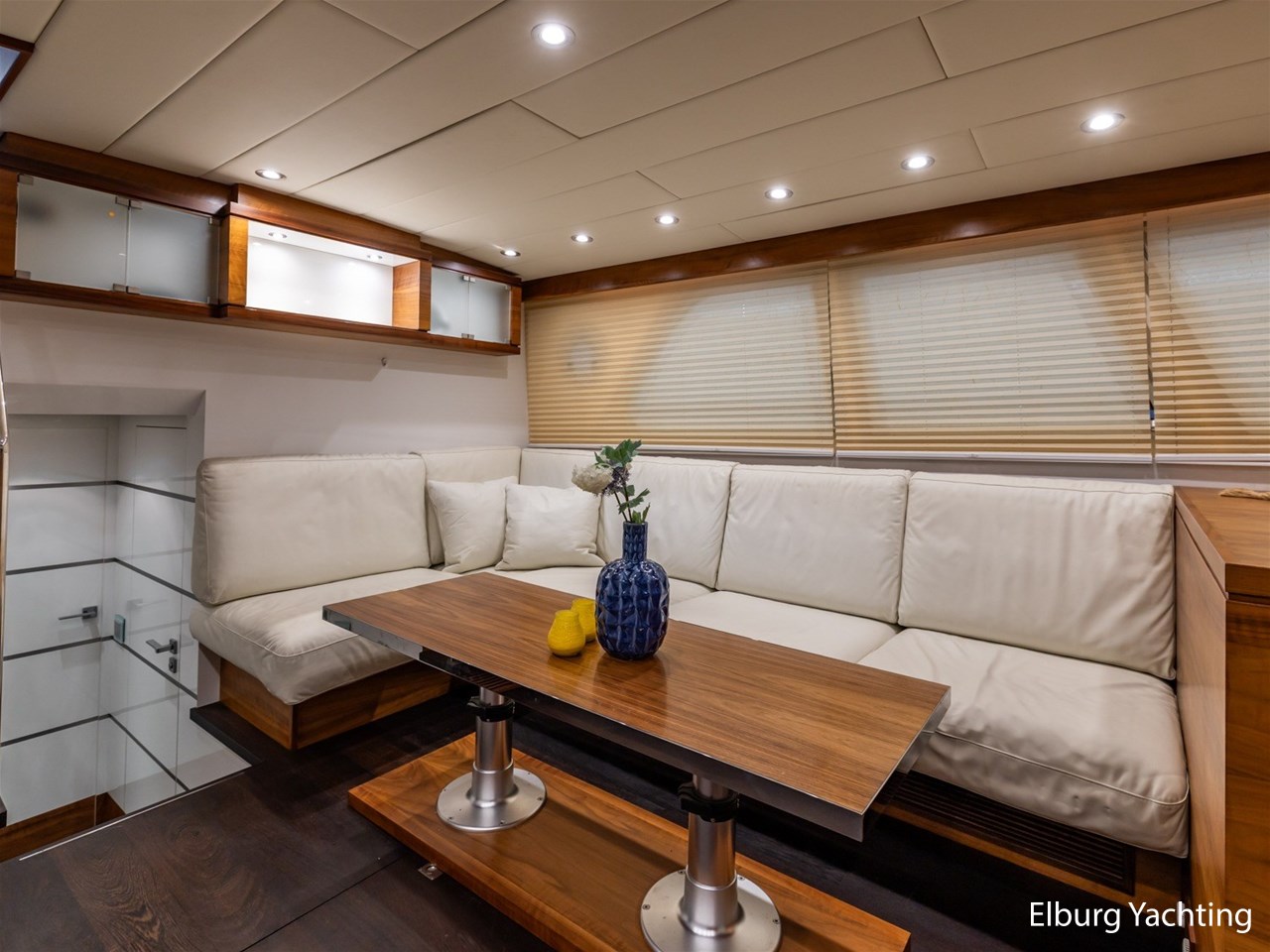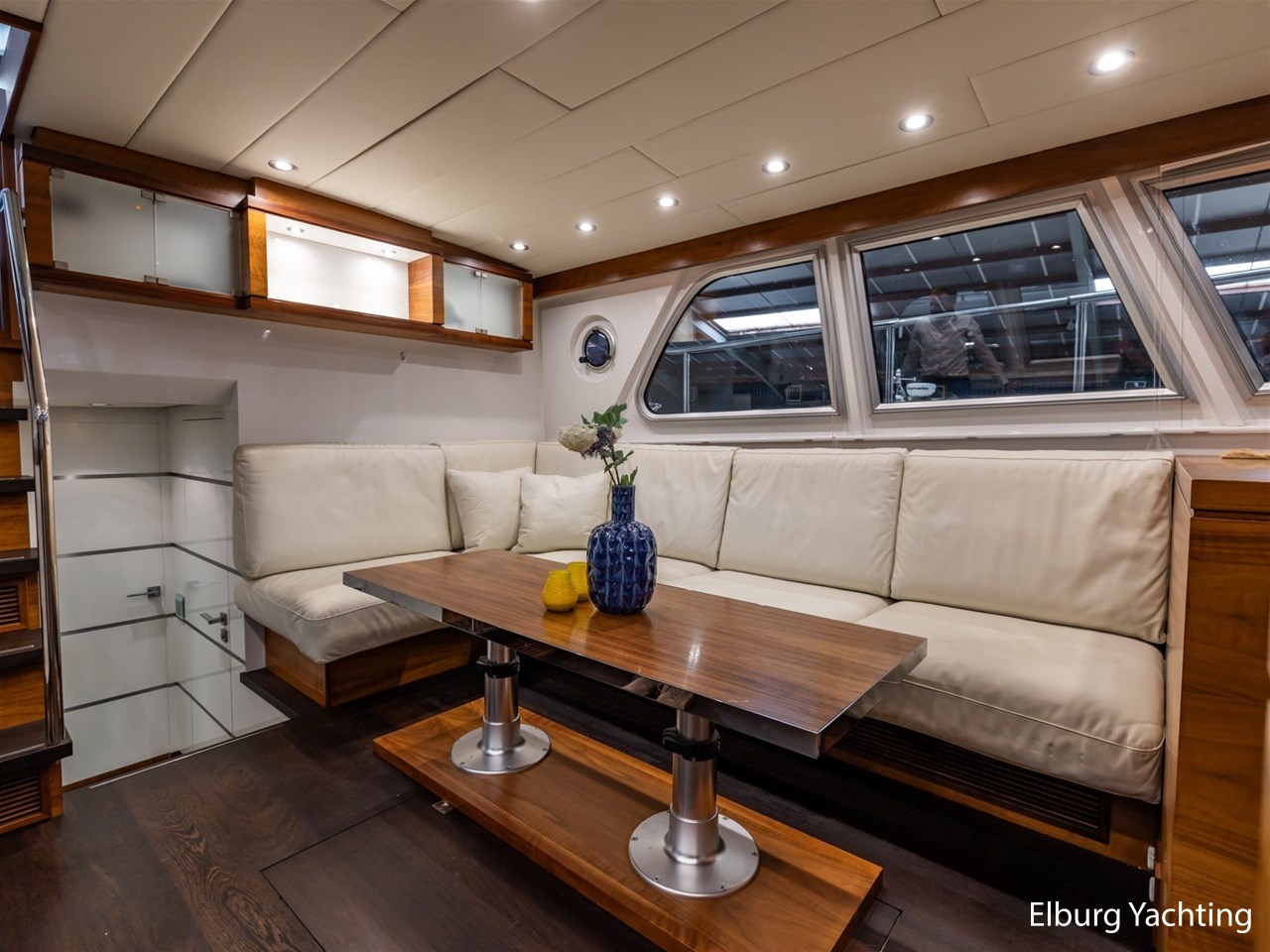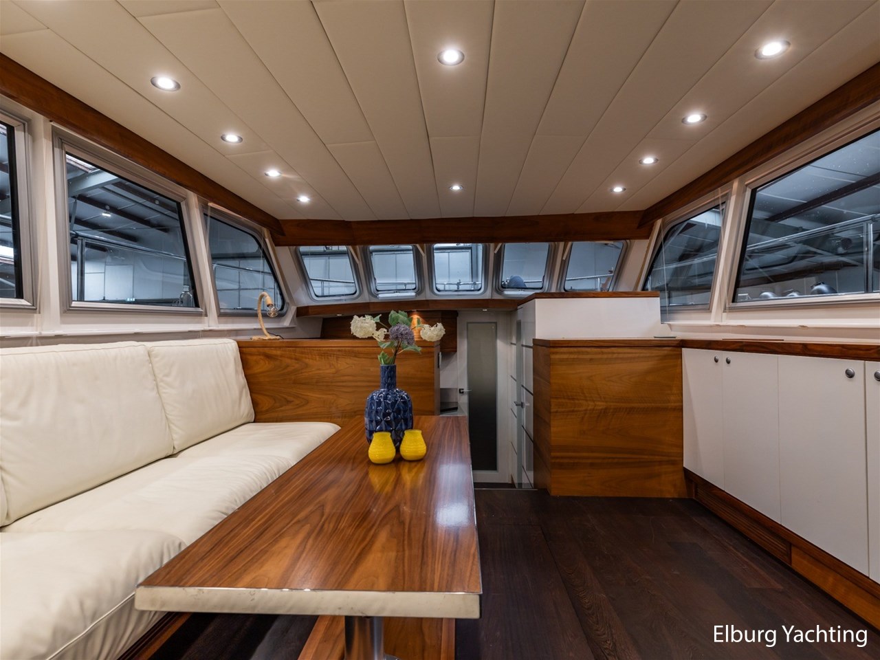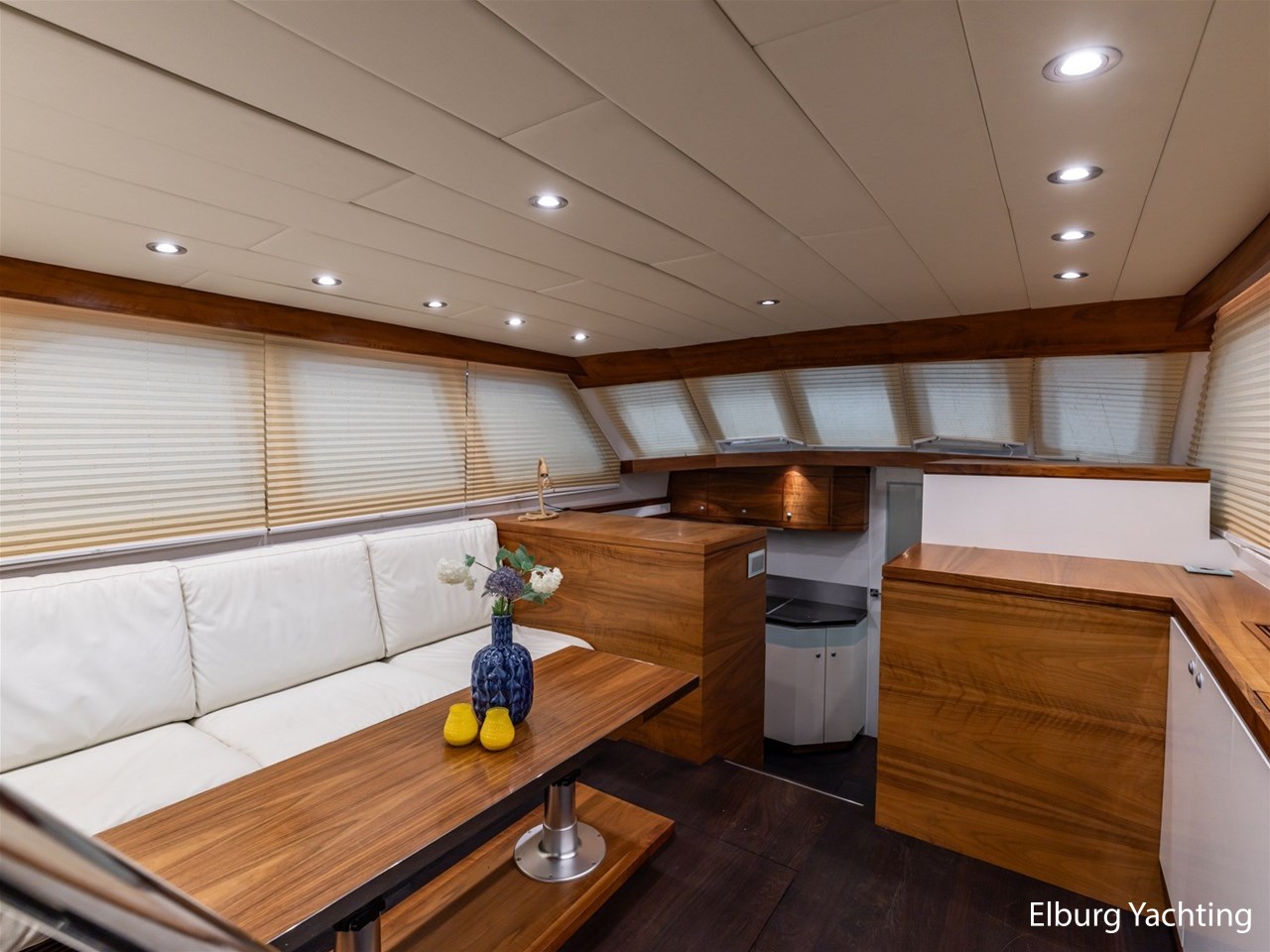 The Holterman 50 Cabrio is an elegant and classic/modern lined motoryacht with a high level of finishing. The design comes from Pieter Beeldsnijder. Eye-catching features are the round bilge underwater hull with stabilizers, the electrically operated cabrio hood, flaired bow and the negative stern with integrated bathing platform. The vessel is equipped with: Full tent over aft deck with removable parts, fixed bulwark with safe stainless steel railing all around, 2 x door in transom for passage to bathing platform, integrated bench on foredeck with removable seat cushion, John Deere engine management displays, storage space below bench aft deck, deck wash pump, 8 x stainless steel bollards on deck + 2 x on swim platform, removable side ladder for access side decks, lockable storage in stern with lighting and 220V WCD, 2 x fixed helm seats with adjustment possibilities, Hydronautica remote control + joystick controls at helm position, Utility room with cupboard space and a Miele WT 2670 washer/dryer combination, Miele dishwasher in galley, access engine room via floor hatch in saloon, pleated blinds, TV on lift, walk-in closet in owner's cabin + access to electrical cabinet, extra storage space under front and rear bed, in two parts folding radar mast which provides a minimum clearance height of approx. 3,60m. For questions and/or making an appointment, you are welcome 7 days a week at Elburg Yachting.
