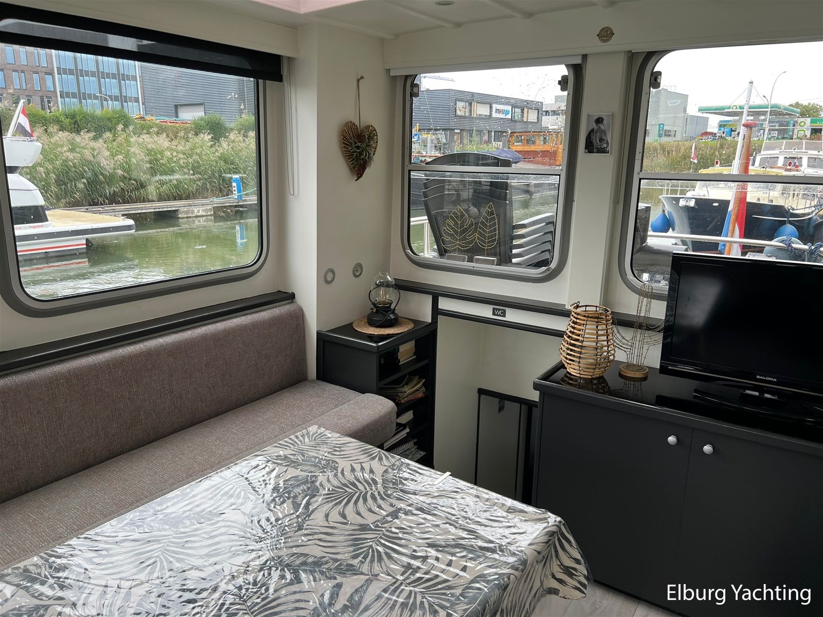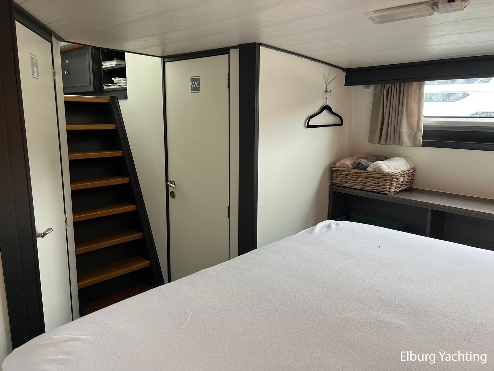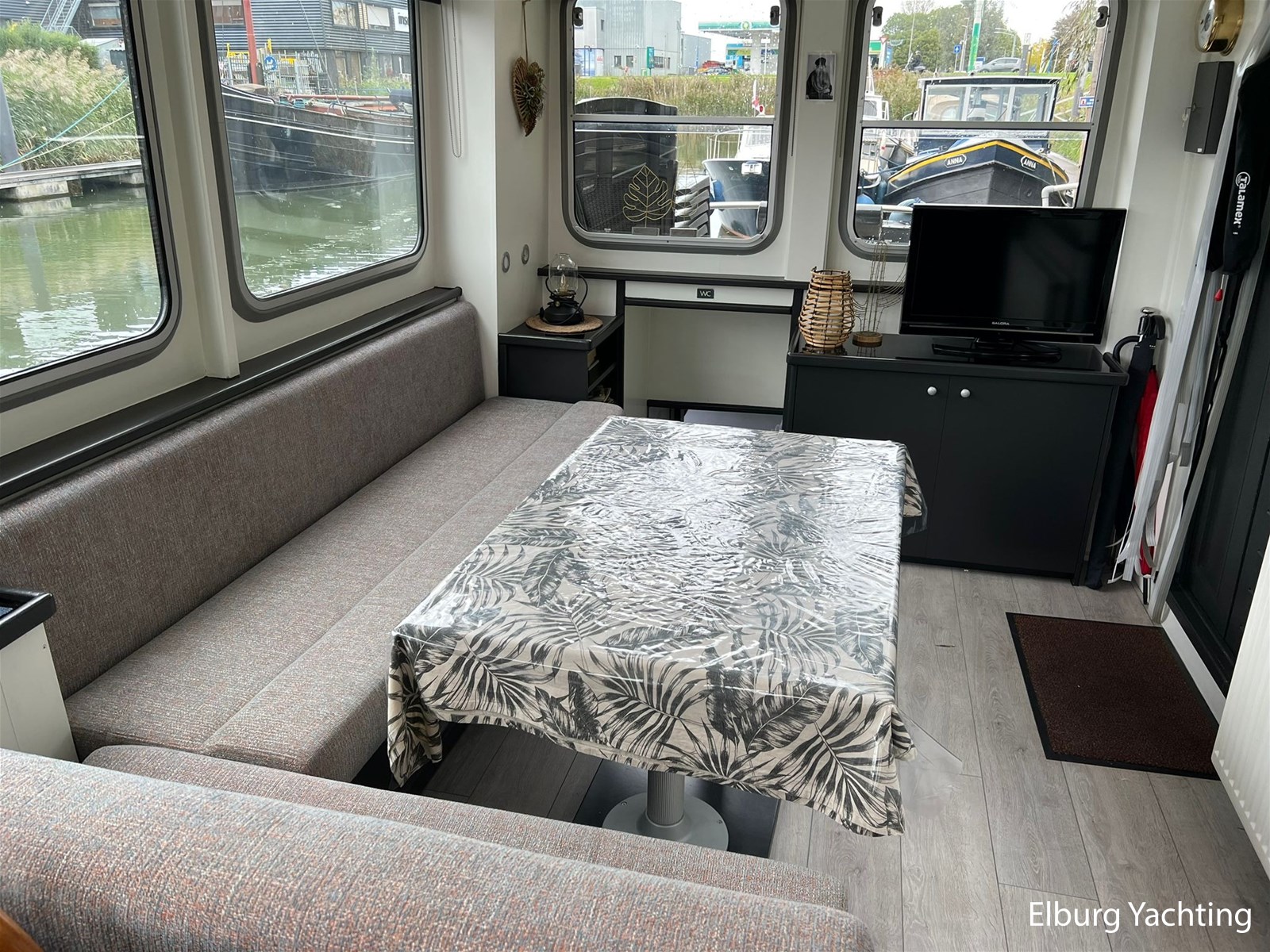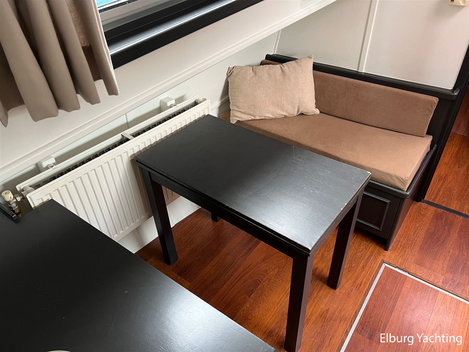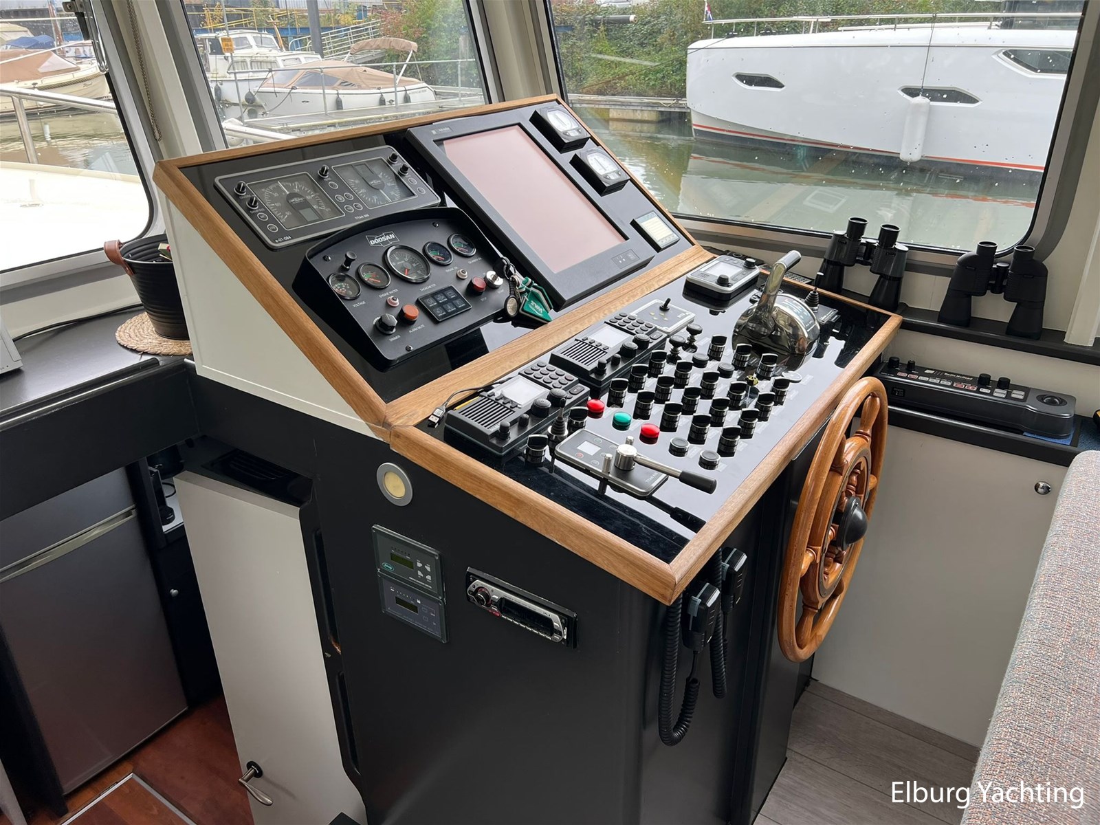 Professional push/tow boat with the finishing of a yacht. The vessel is CVO approved and has a Europa number. The central saloon/steering area is accessible via a SB side door, the dinette offers seating for 6 persons, the steering bench is electrically adjustable in height and the backrest can be folded down so that it can be included with the dinette table, professionally equipped steering position, follow-up steering, tanks with manholes, various windows and portholes can be opened for extra ventilation, double stainless steel railing all around, enclosed engine room, deck wash pump, rubber bumper all around.