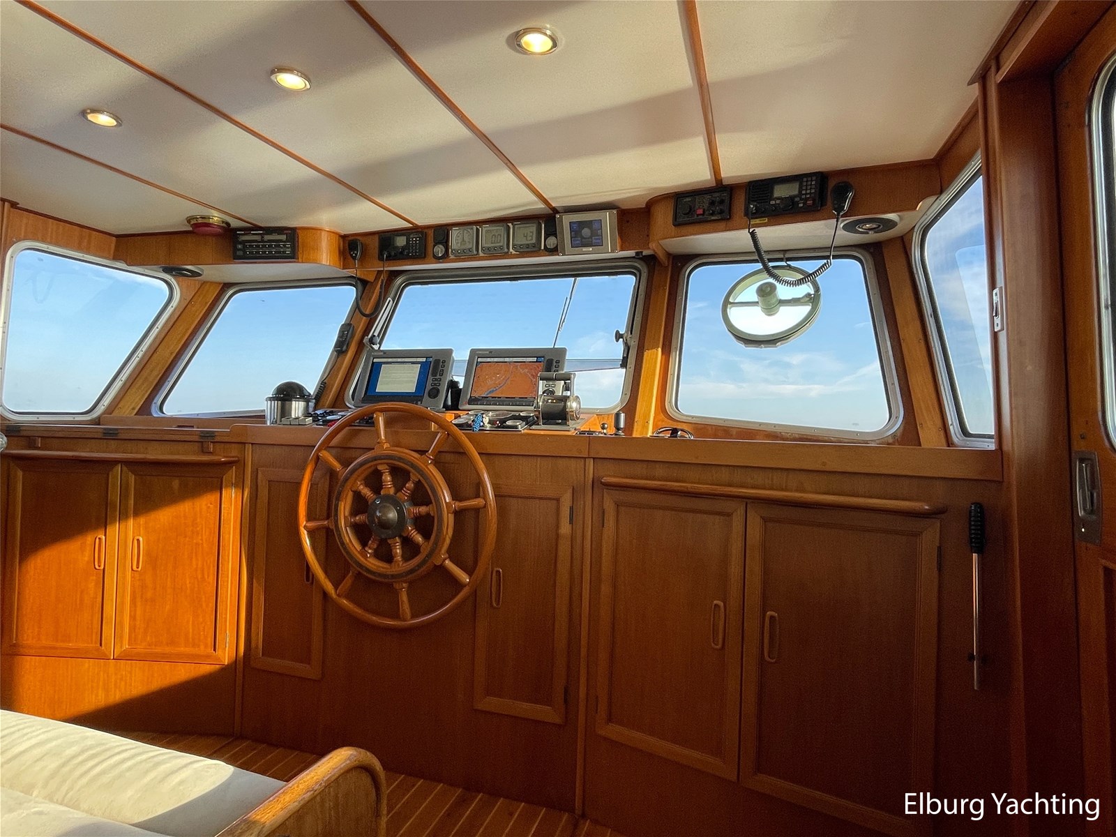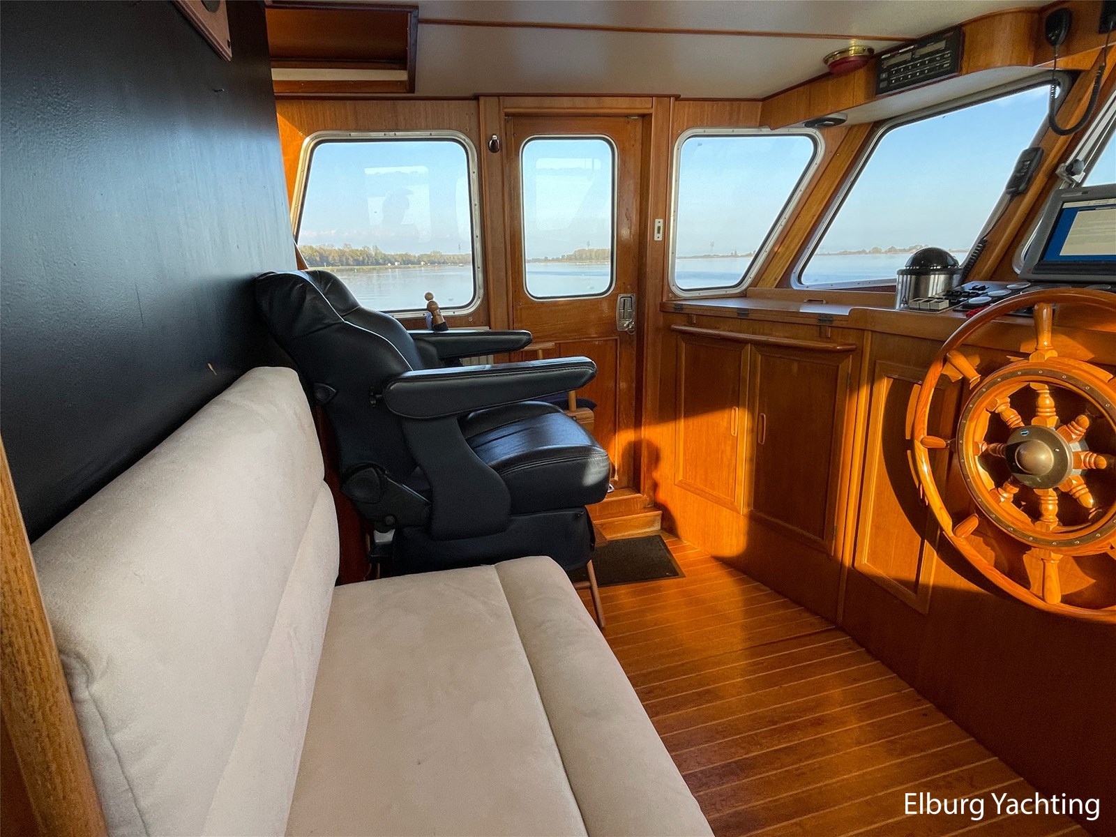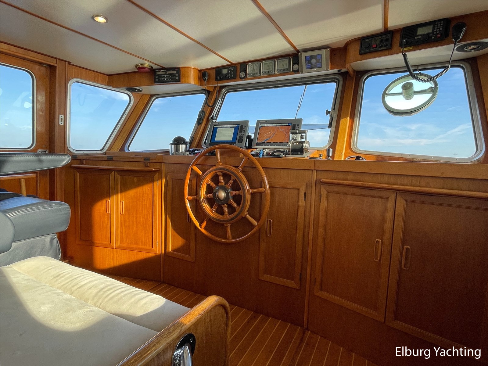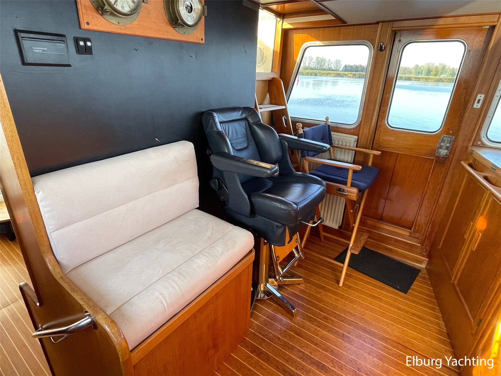 Teak floors in saloon and wheelhouse combined with dark upholstery