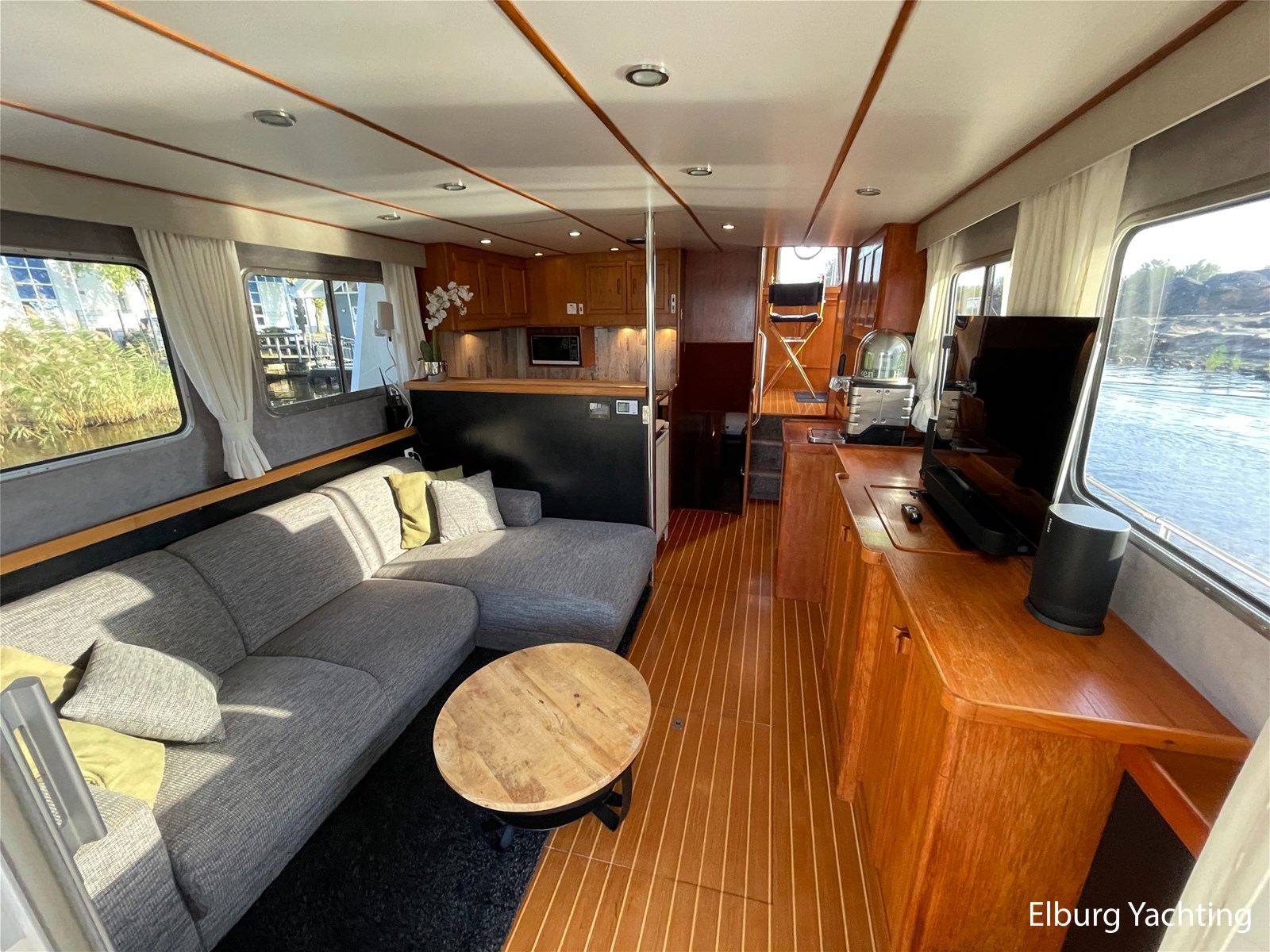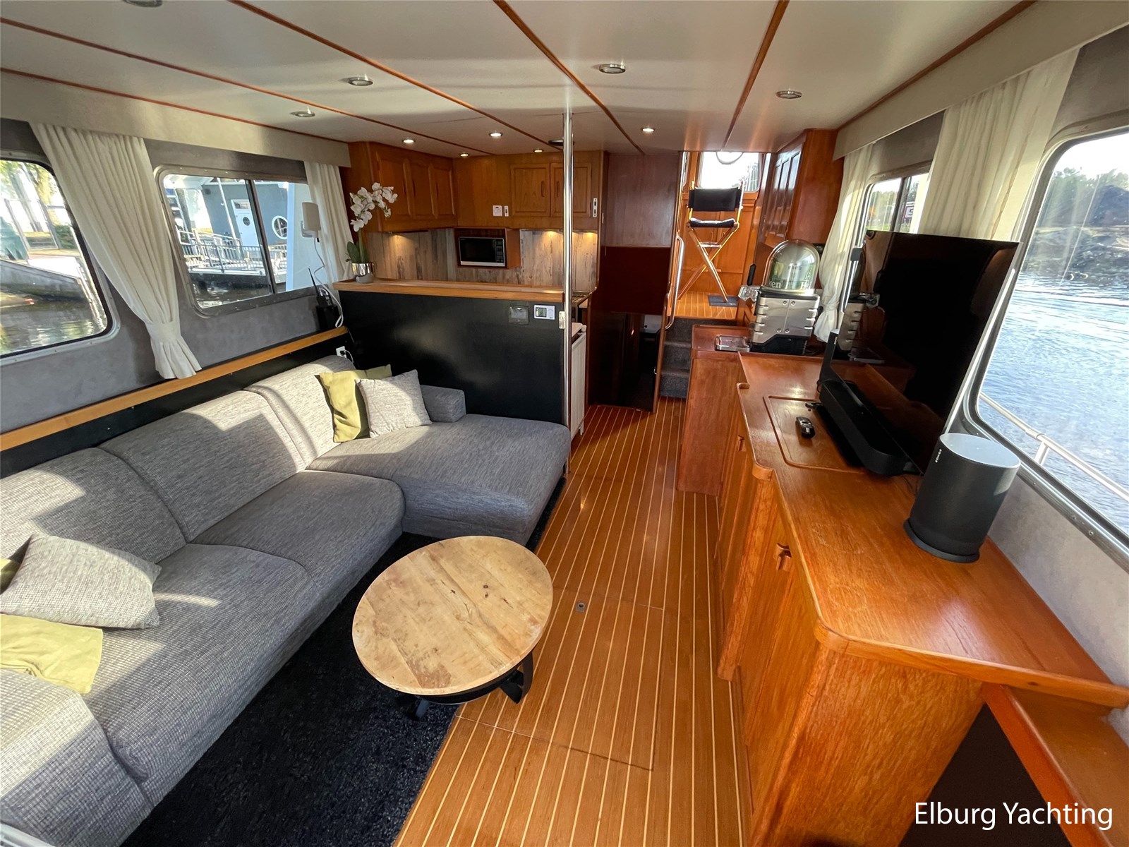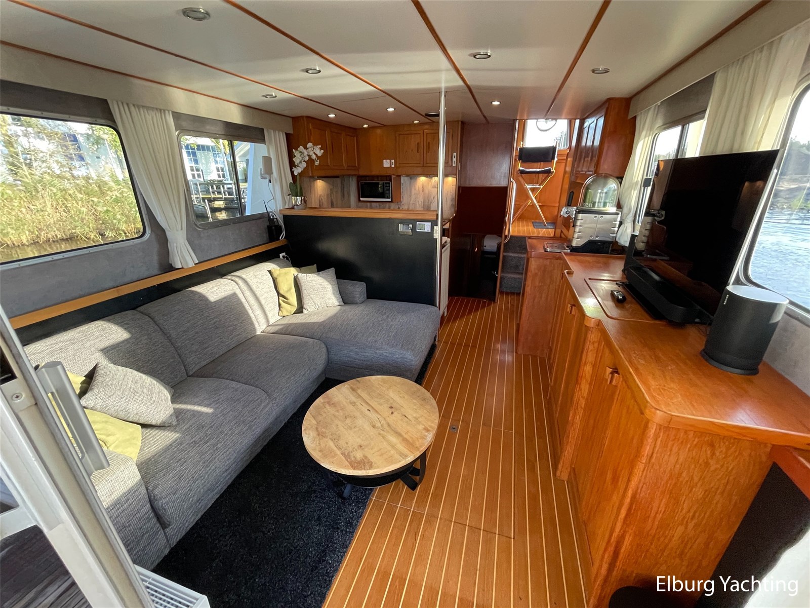 Teak floors in saloon and wheelhouse combined with dark upholstery