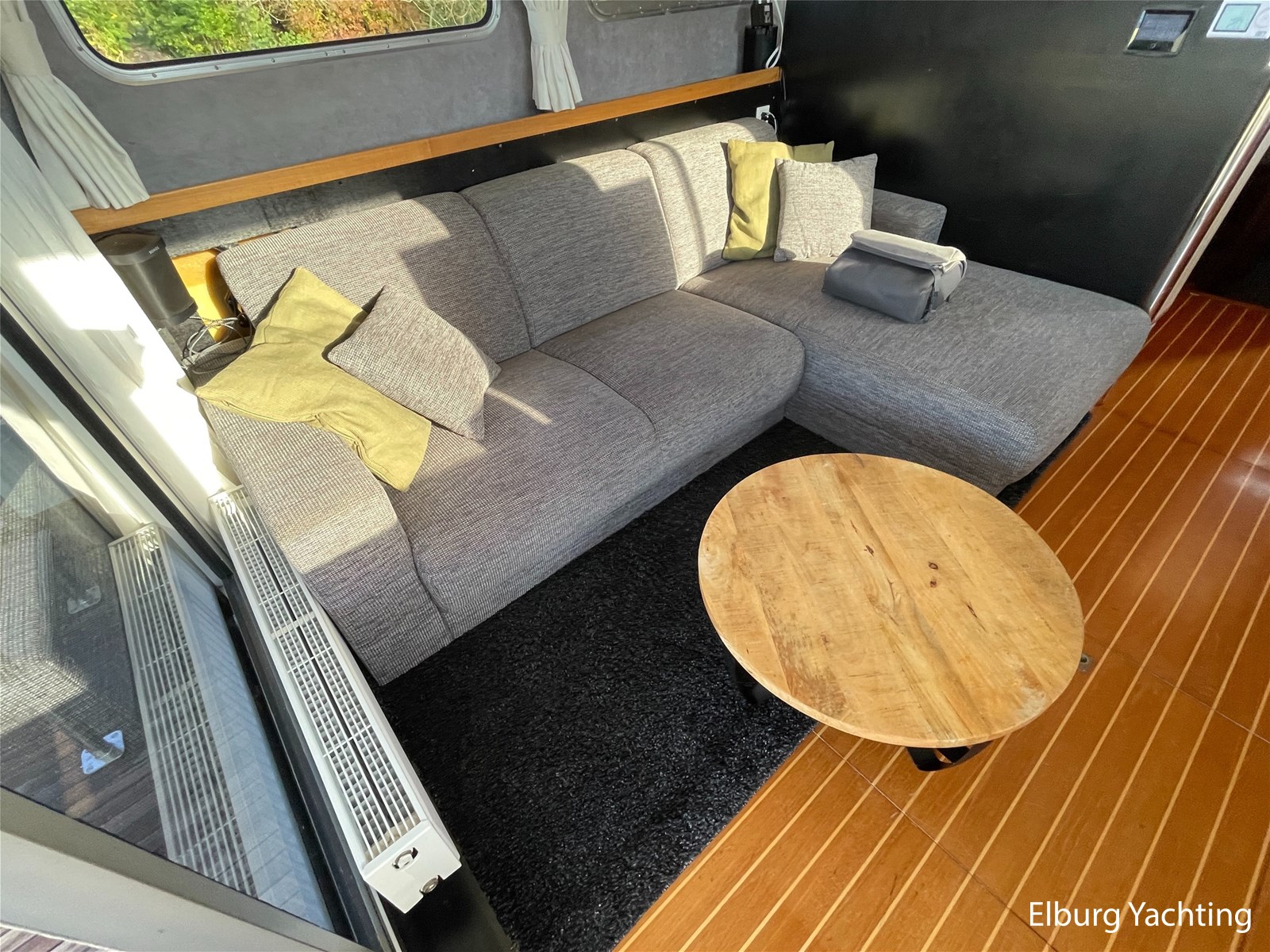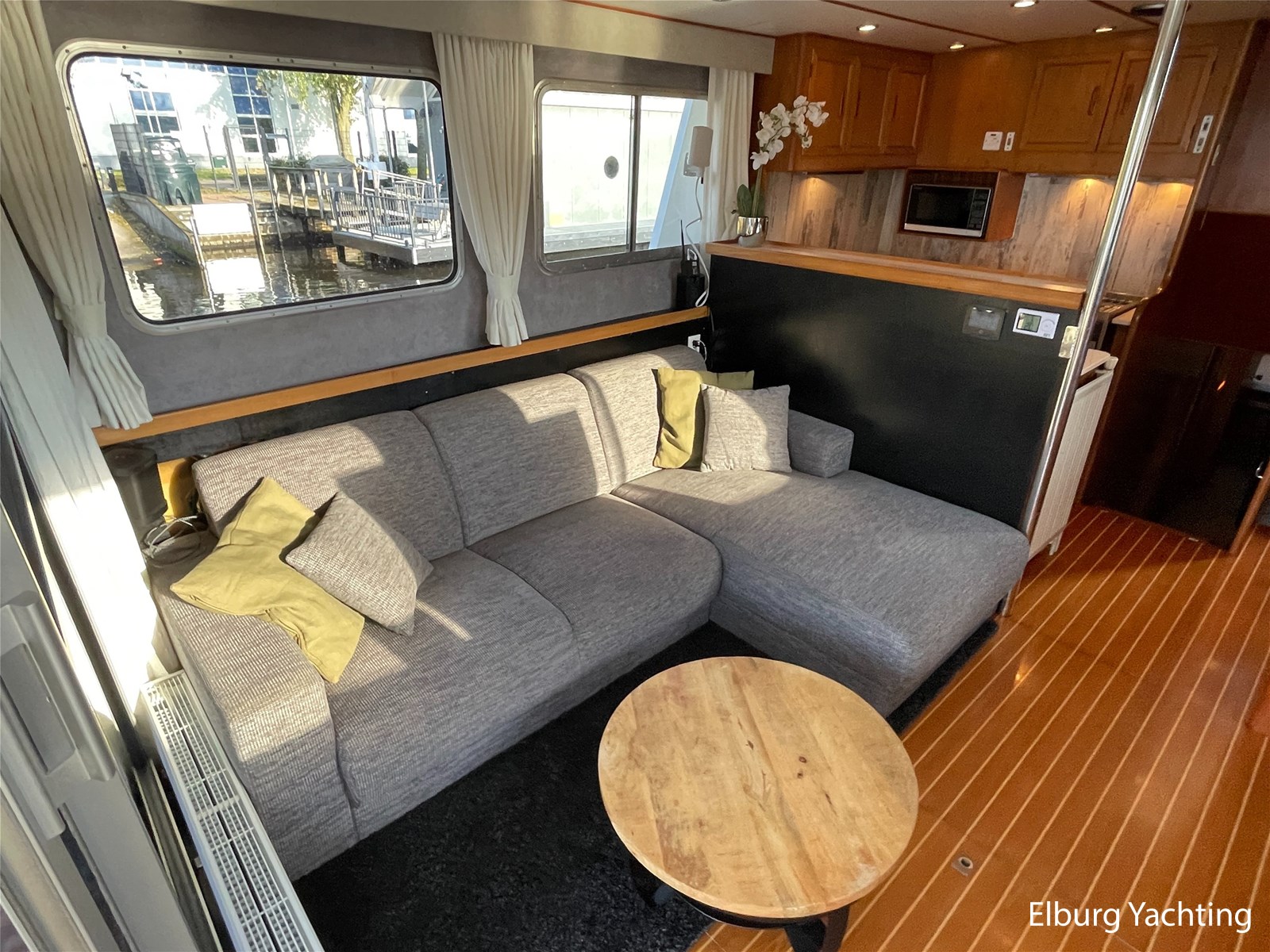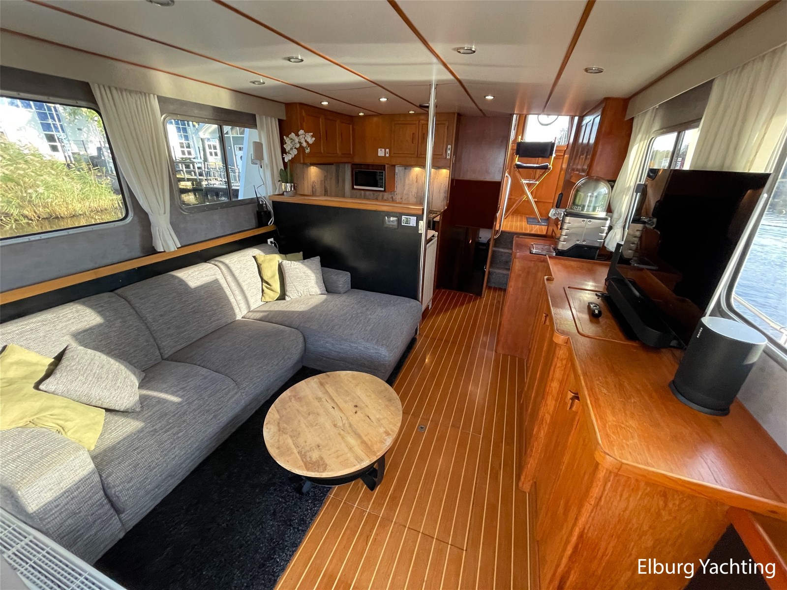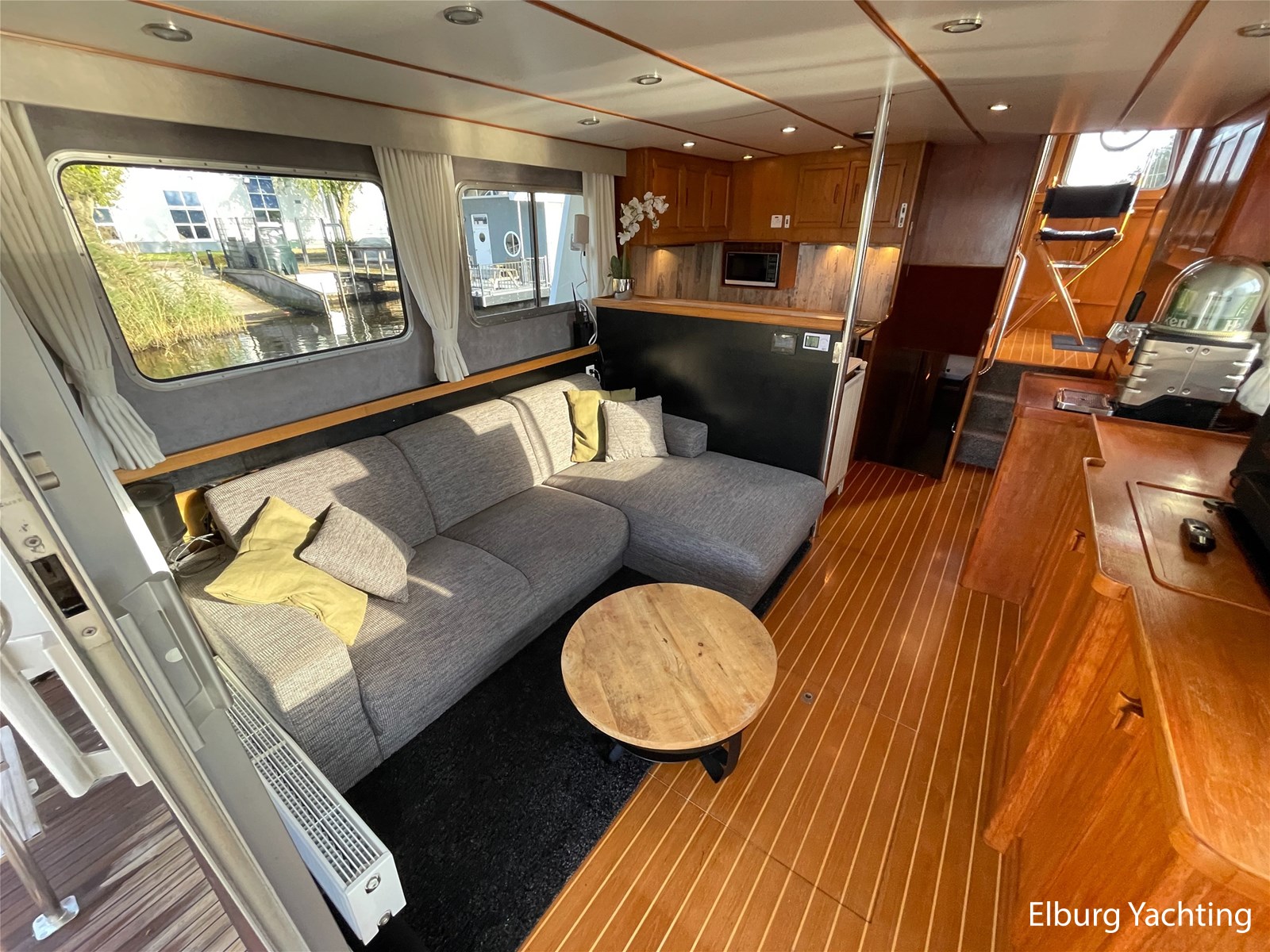 Teak floors in saloon and wheelhouse combined with dark upholstery