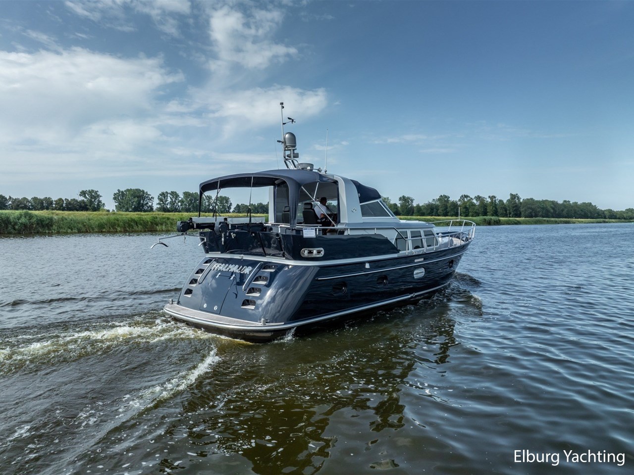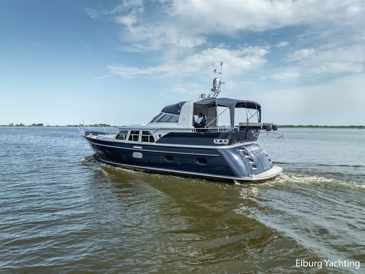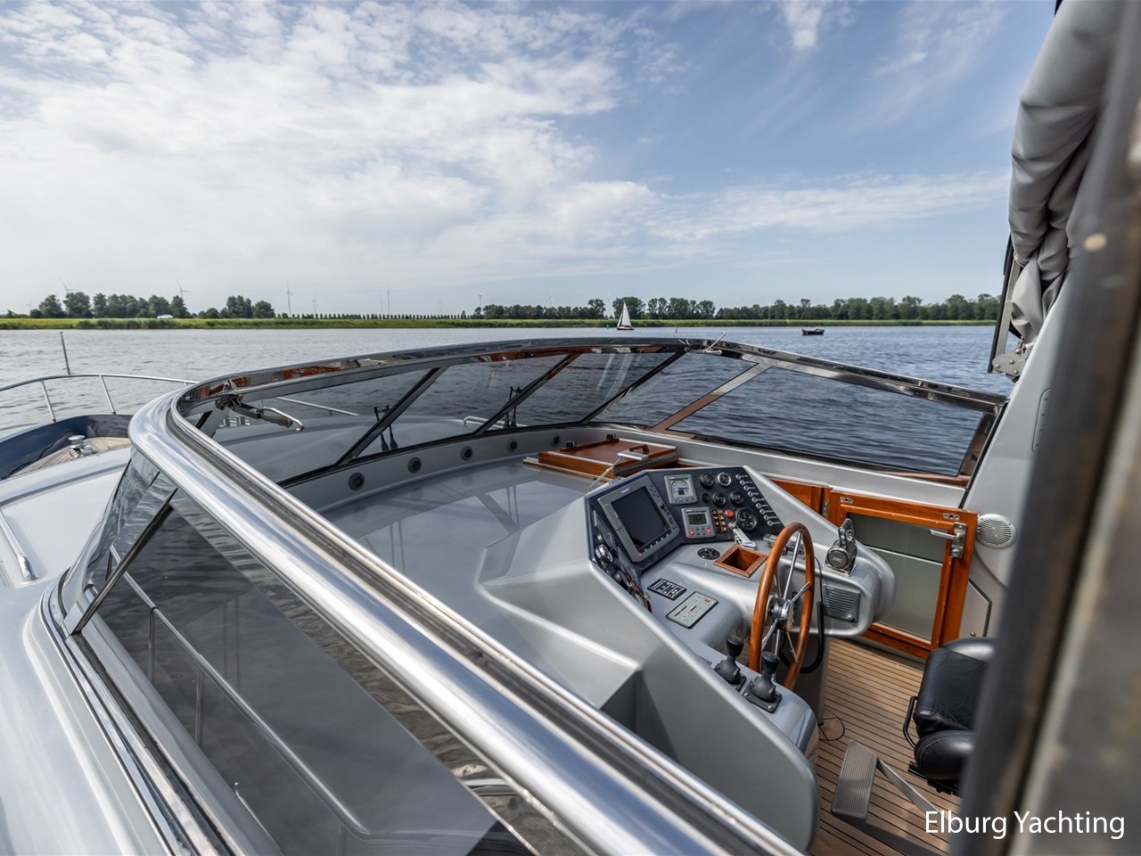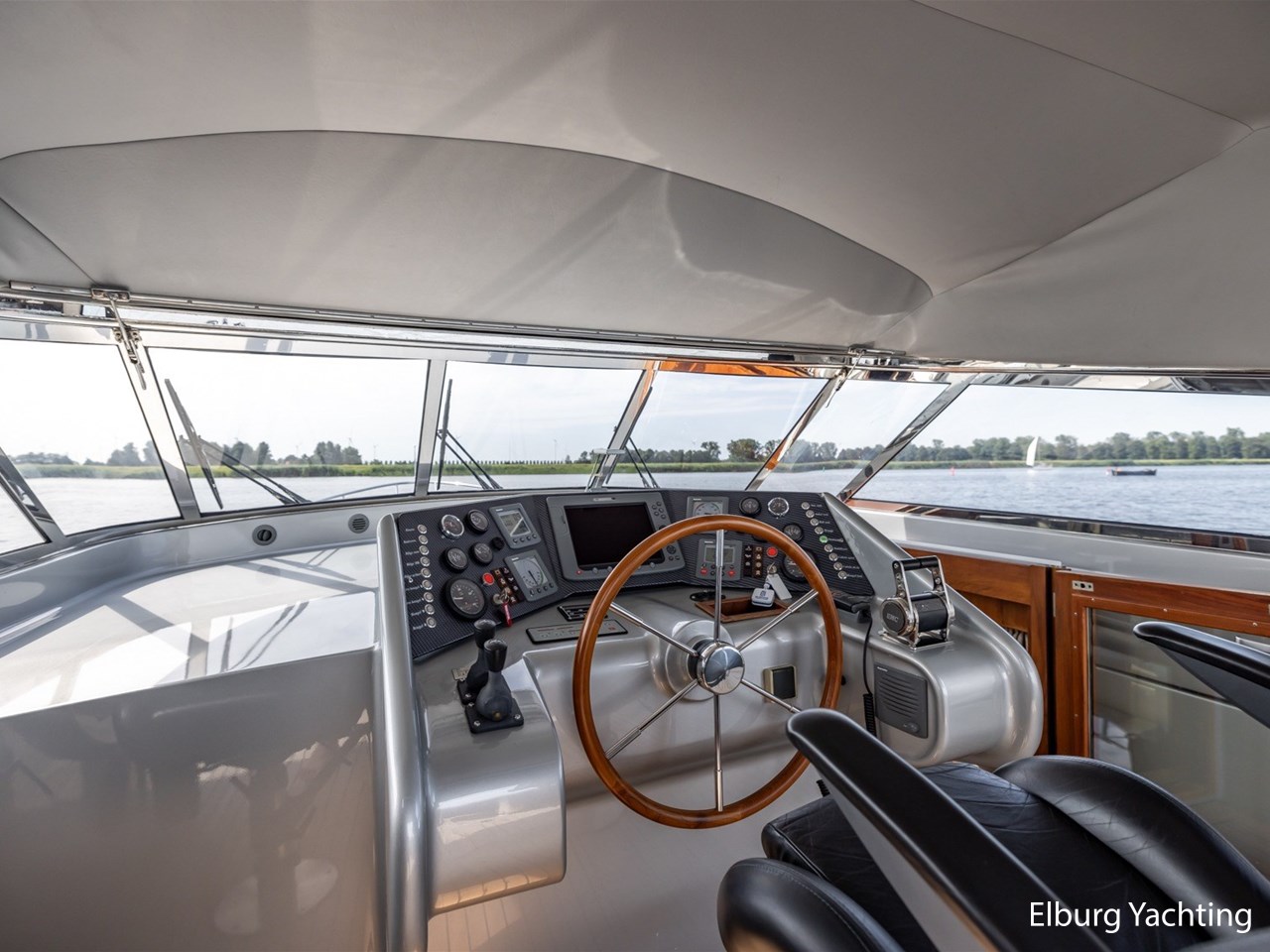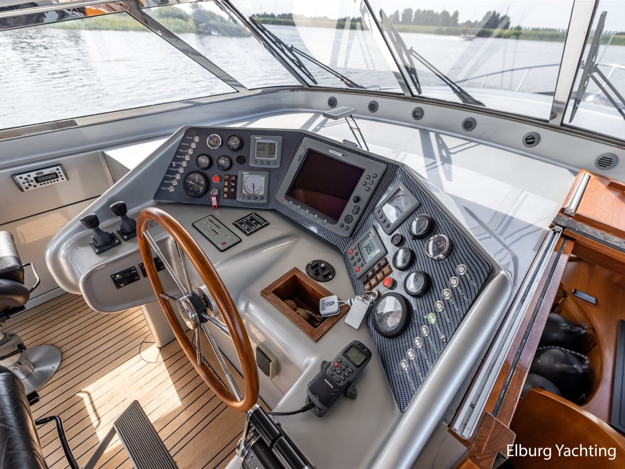 A true Dutch yacht, experience luxury on the water with this exclusive Holterman 50 motor yacht. This Dutch yacht features a spectacular interior design, a chic blue and grey metallic exterior colour scheme and a new Variotop convertible for an unrivalled cruising experience. With a flawless technical system and an advanced stabiliser system, this motor yacht ensures smooth sailing for carefree journeys anywhere. Elevate your maritime lifestyle with this top-class gem. Her features include: electric foldable aluminium radar arch, hydraulic fin stabilisers, electric convertible top, name lights, deck lights, rudder indicator, stereo, EMC electric engine controls, front window heater helm station, fixed cockpit table, 2 x deluxe helm seat, windscreen wiper control, enclosed bulwark, electric blinds for both bulwarks saloon plus front window, electric front window excluder, LED lighting, dimmers, dishwasher, washer-dryer Bosch Maxx 5, safe, wine cooler, tracvision, TV on lift, wind meter, rear view camera, UV filter water system, Stork hydrophore, horn, Kabola heating throughout the yacht, Webasto air conditioning (24. 000 BTU), Somfy system for electric operation of blinds in saloon, JVC DVD player with audio for TV, Hyab hydraulic Tender crane on aft deck, spacious settee in saloon, spacious owner's cabin, clearance approx. 3.40 m, spacious gangways, modern interior, beautiful engine room, AWL grip metallic paint. For questions and/or to make an appointment, you are welcome 7 days a week at Elburg Yachting.