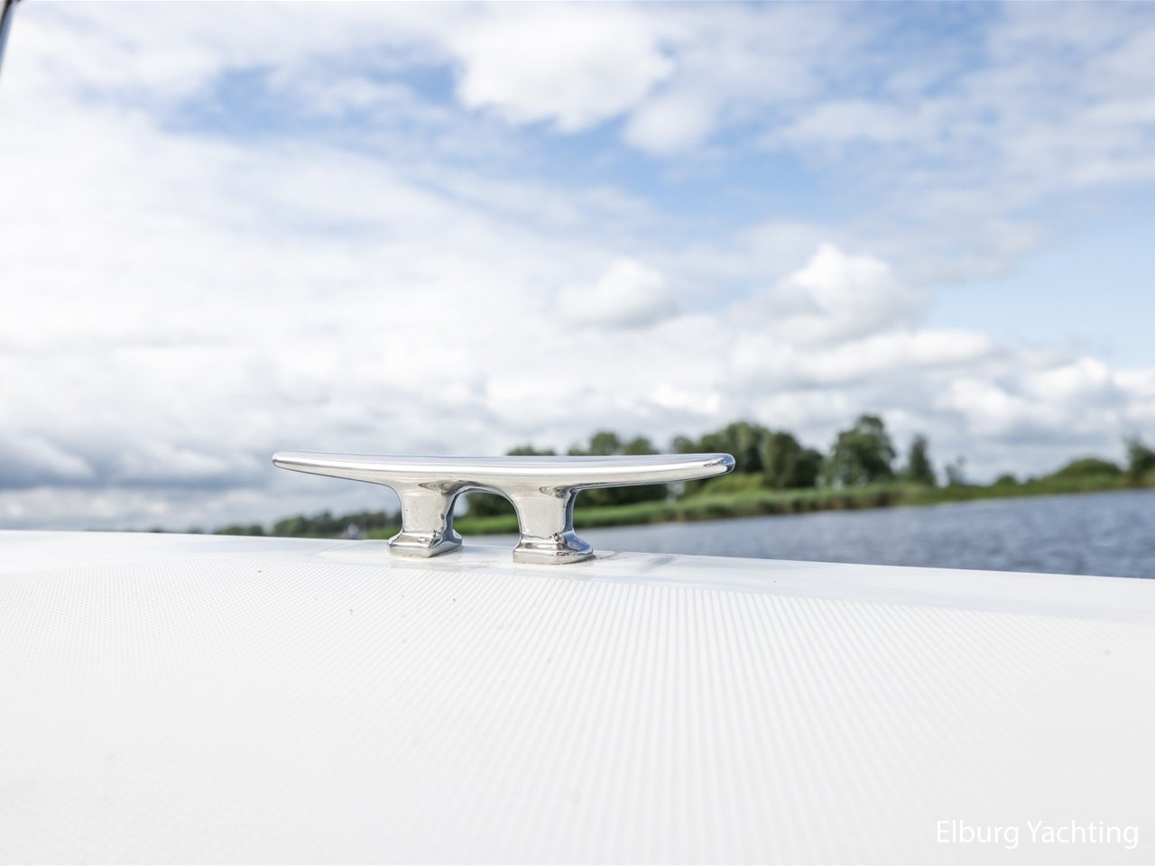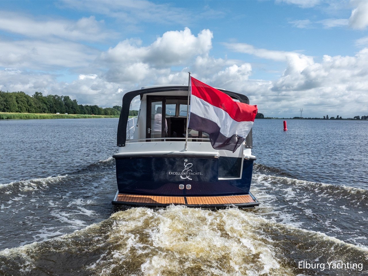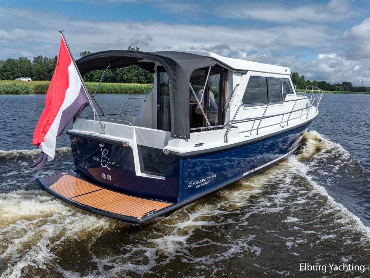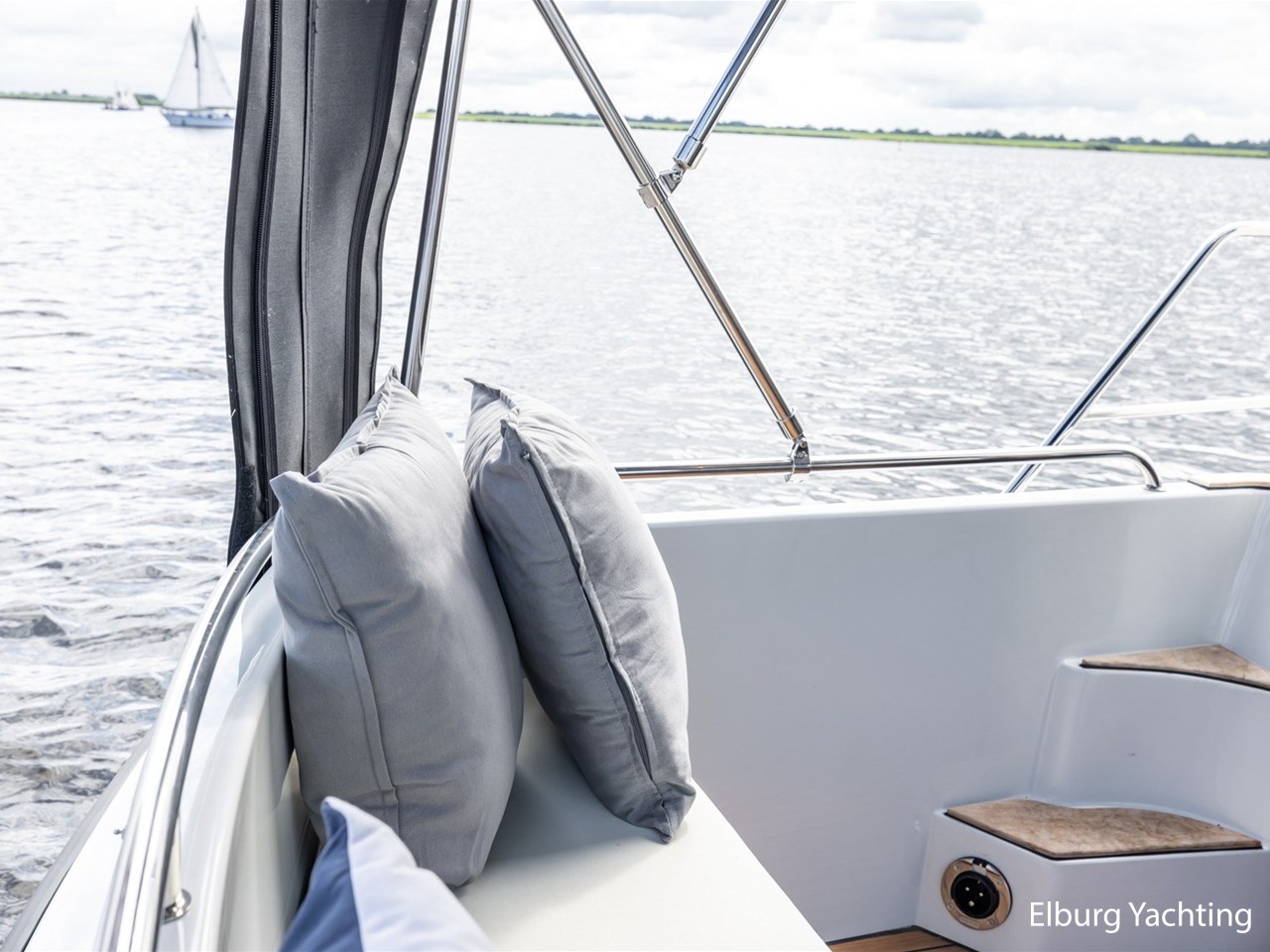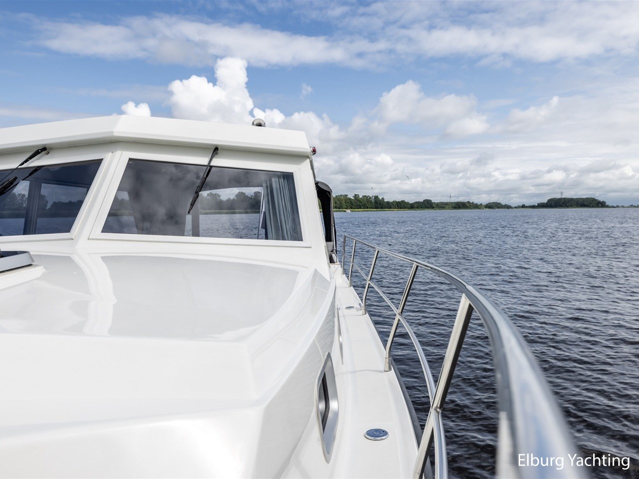 Extremely beautifully designed Excellent 1000 Touring with a spacious layout. Outside, the sporty line of the yacht stands out in combination with classic details such as the double stainless steel sea railing in combination with the stainless steel anchor and stainless steel anchor fittings. The Excellent has comfortable gangways and is easy to moor and unmoor using the 10 stainless steel bollards in combination with the Quick electric bow and stern thruster. The cosy open cockpit has a lockable tent, a hull door to the attached swimming platform and a pleasant settee. From the open cockpit, the floor-level saloon can be reached through the four French doors. The saloon features a comfortable dinette with a spacious table, the clear steering position and plenty of storage space. The spacious windows in the saloon let in a lot of natural light. There are 2 sliding windows on both sides with window screens and a beautiful sliding roof. The interior has a modern, spacious layout with beautiful walnut wood and natural colours. The galley is located to starboard with a sink, large Dometic refrigerator and a 3-burner gas cooker with Dometic extractor system. On port side, the wet room is located with electric toilet, fine shower and sink. In the front, the owner's cabin is situated with a free-standing French bed with plenty of storage space. For questions and/or to make an appointment, you are welcome 7 days a week at Elburg Yachting.