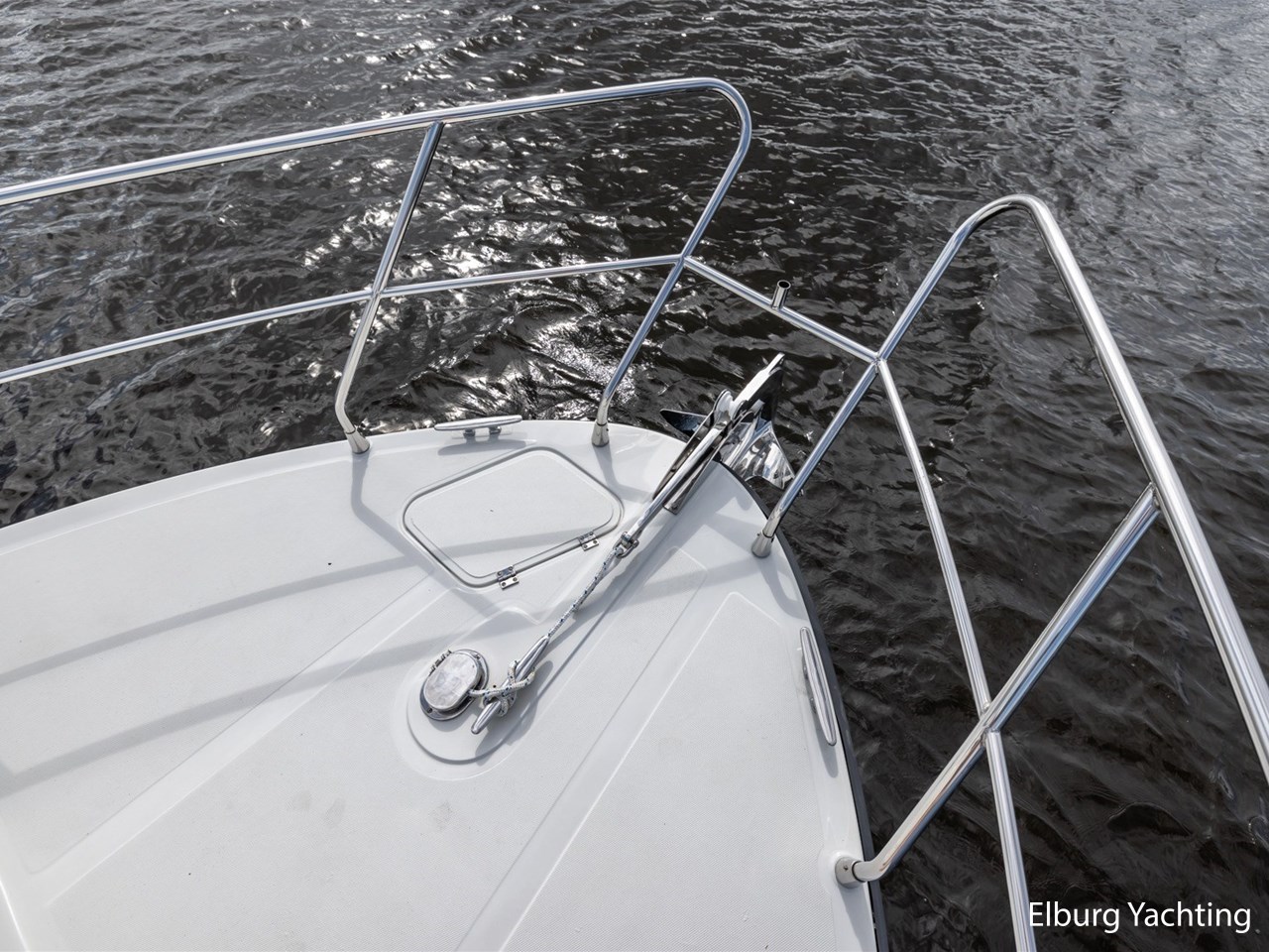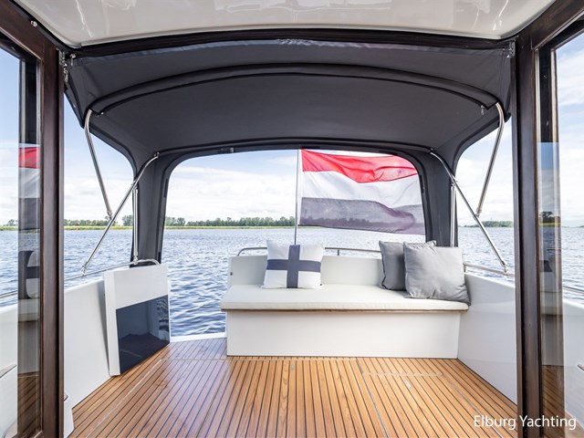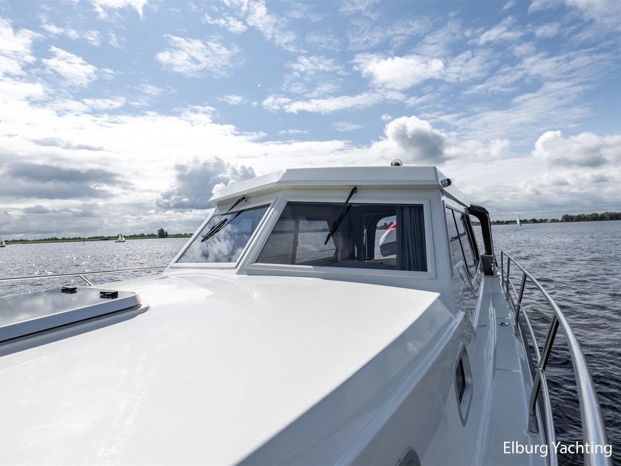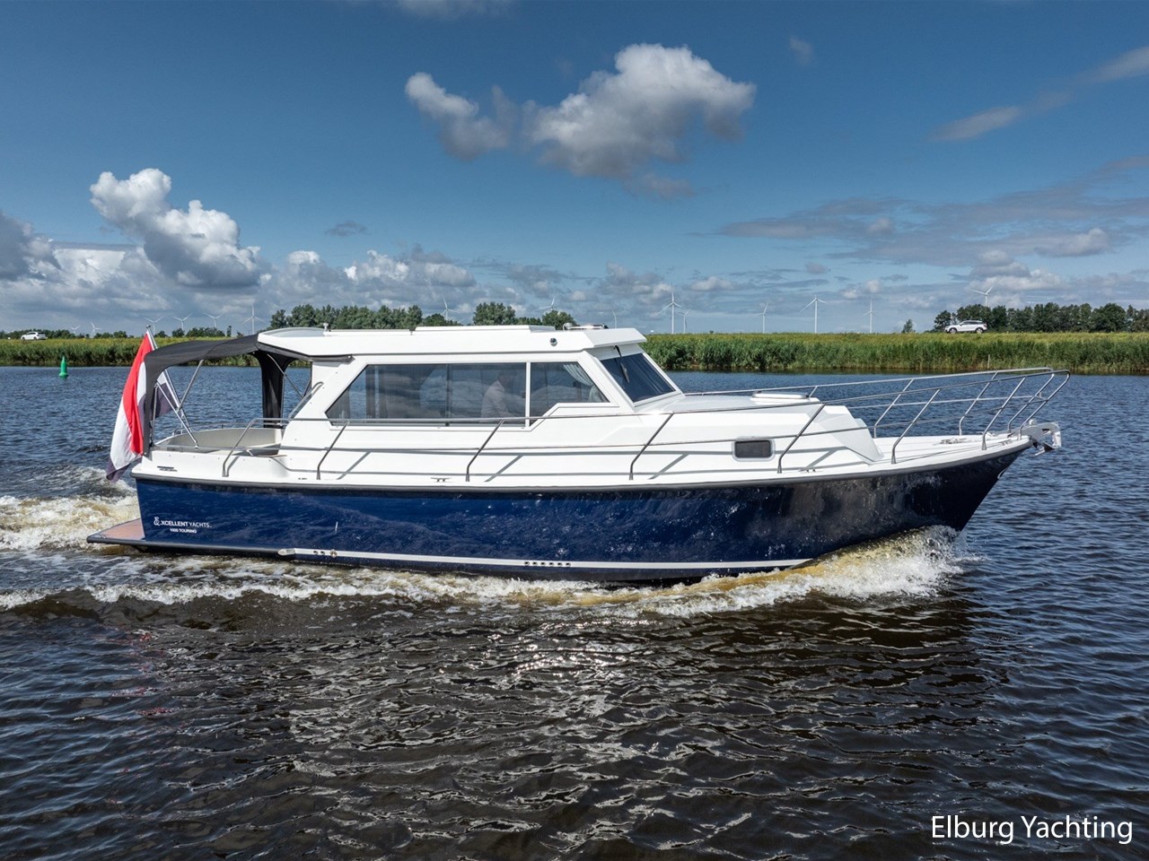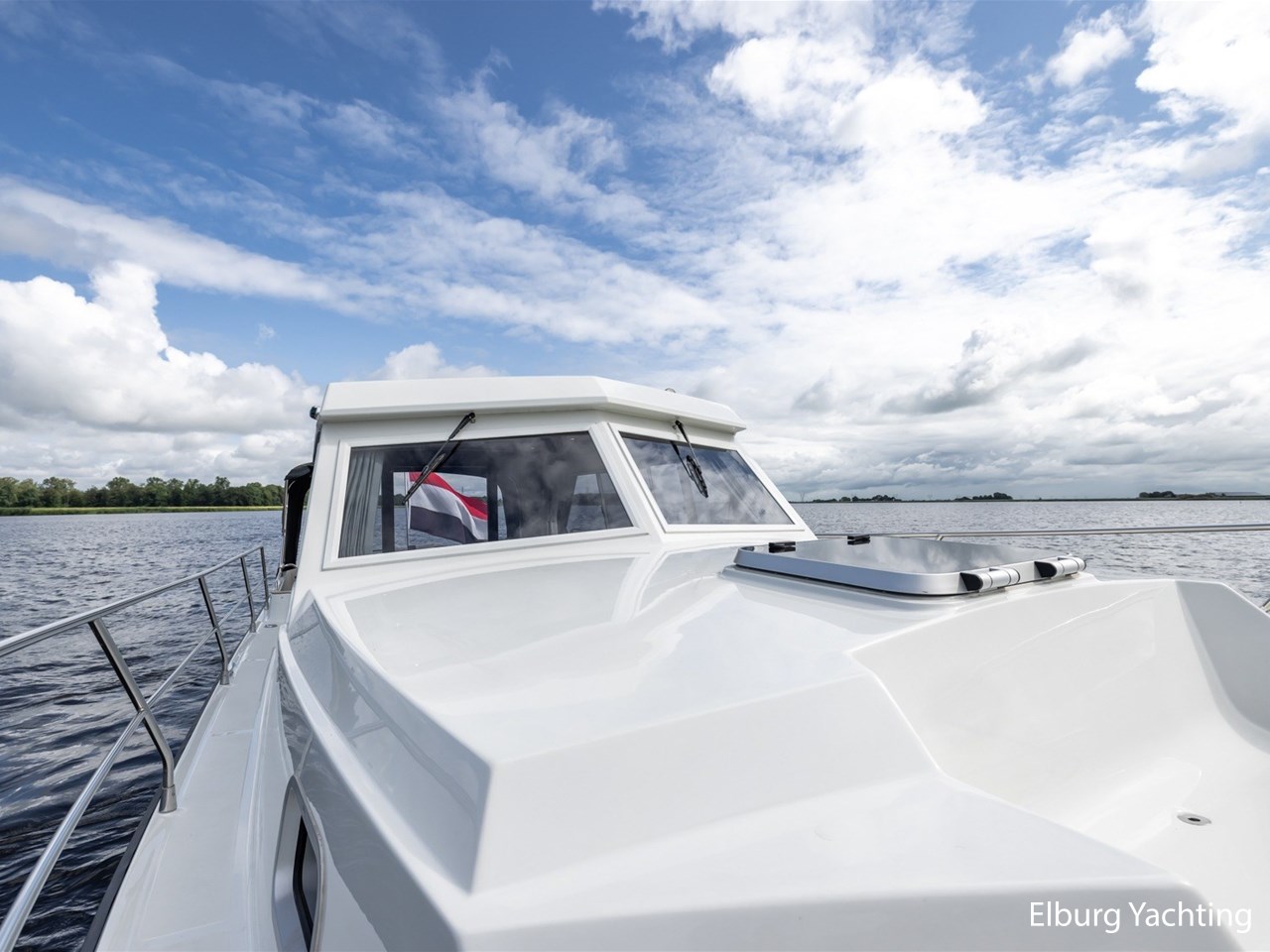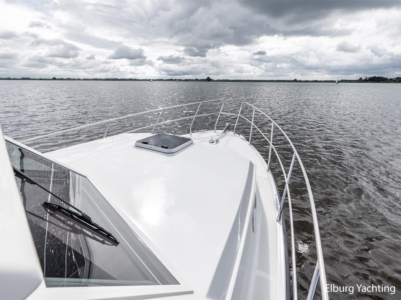 Extremely beautifully designed Excellent 1000 Touring with a spacious layout. Outside, the sporty line of the yacht stands out in combination with classic details such as the double stainless steel sea railing in combination with the stainless steel anchor and stainless steel anchor fittings. The Excellent has comfortable gangways and is easy to moor and unmoor using the 10 stainless steel bollards in combination with the Quick electric bow and stern thruster. The cosy open cockpit has a lockable tent, a hull door to the attached swimming platform and a pleasant settee. From the open cockpit, the floor-level saloon can be reached through the four French doors. The saloon features a comfortable dinette with a spacious table, the clear steering position and plenty of storage space. The spacious windows in the saloon let in a lot of natural light. There are 2 sliding windows on both sides with window screens and a beautiful sliding roof. The interior has a modern, spacious layout with beautiful walnut wood and natural colours. The galley is located to starboard with a sink, large Dometic refrigerator and a 3-burner gas cooker with Dometic extractor system. On port side, the wet room is located with electric toilet, fine shower and sink. In the front, the owner's cabin is situated with a free-standing French bed with plenty of storage space. For questions and/or to make an appointment, you are welcome 7 days a week at Elburg Yachting.
