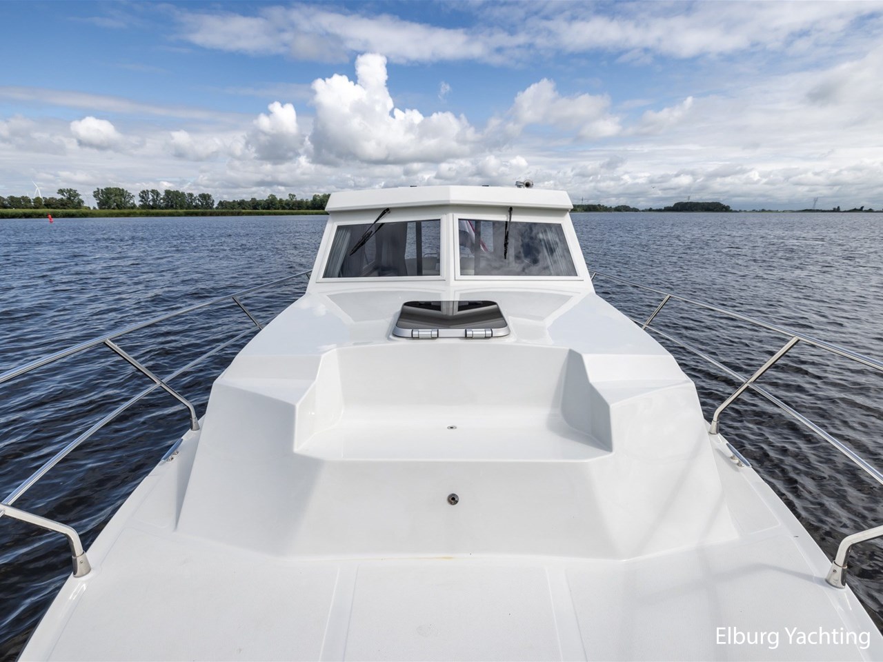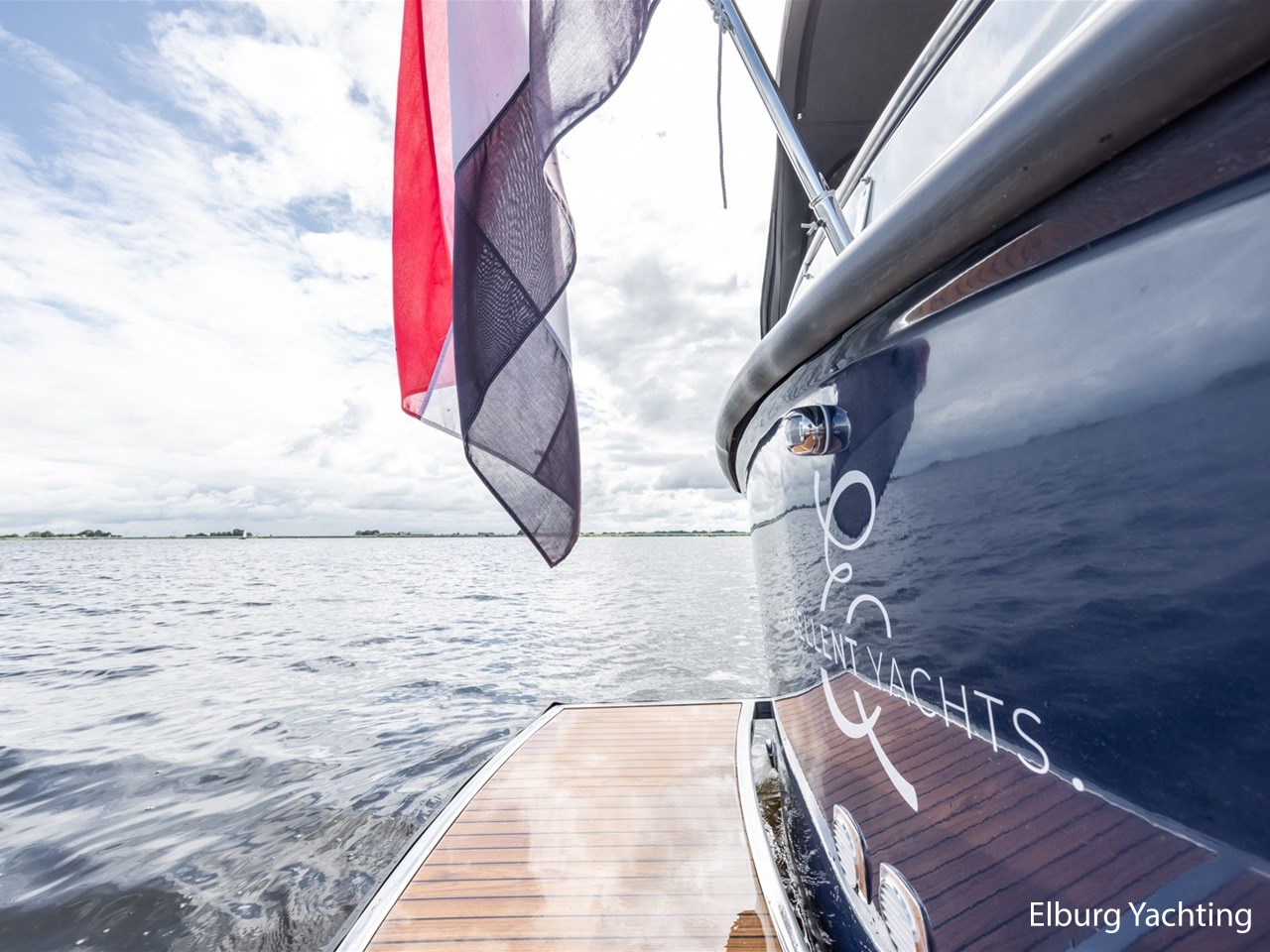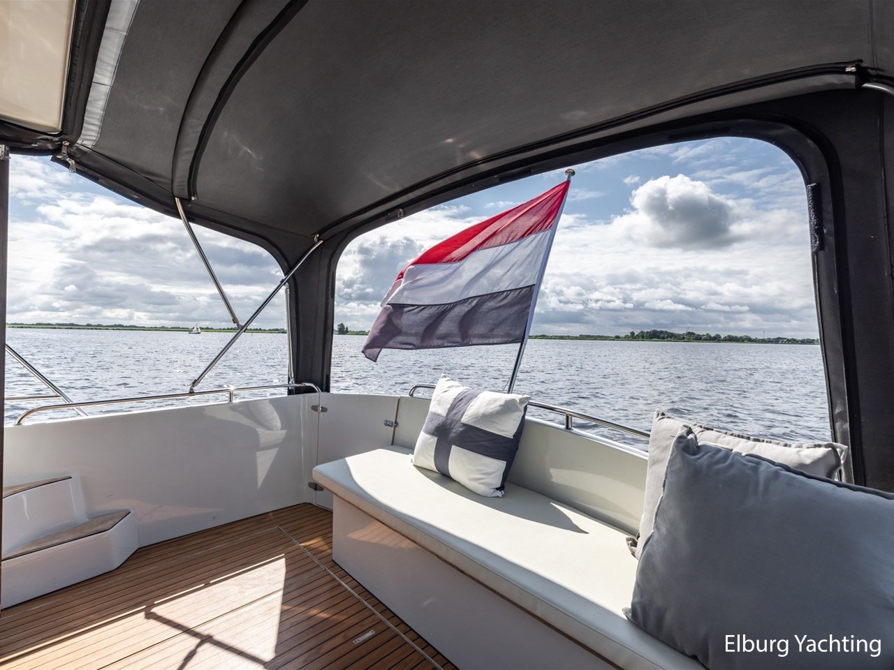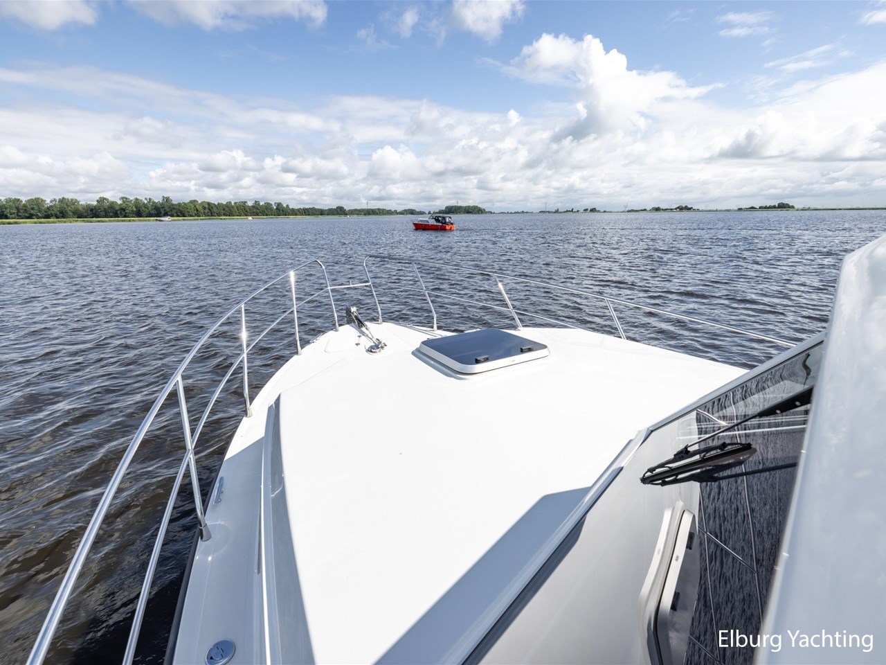 Extremely beautifully designed Excellent 1000 Touring with a spacious layout. Outside, the sporty line of the yacht stands out in combination with classic details such as the double stainless steel sea railing in combination with the stainless steel anchor and stainless steel anchor fittings. The Excellent has comfortable gangways and is easy to moor and unmoor using the 10 stainless steel bollards in combination with the Quick electric bow and stern thruster. The cosy open cockpit has a lockable tent, a hull door to the attached swimming platform and a pleasant settee. From the open cockpit, the floor-level saloon can be reached through the four French doors. The saloon features a comfortable dinette with a spacious table, the clear steering position and plenty of storage space. The spacious windows in the saloon let in a lot of natural light. There are 2 sliding windows on both sides with window screens and a beautiful sliding roof. The interior has a modern, spacious layout with beautiful walnut wood and natural colours. The galley is located to starboard with a sink, large Dometic refrigerator and a 3-burner gas cooker with Dometic extractor system. On port side, the wet room is located with electric toilet, fine shower and sink. In the front, the owner's cabin is situated with a free-standing French bed with plenty of storage space. For questions and/or to make an appointment, you are welcome 7 days a week at Elburg Yachting.