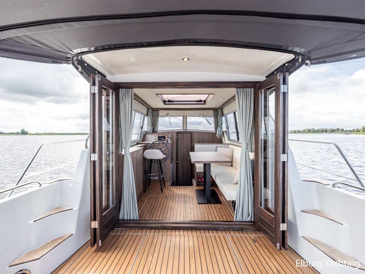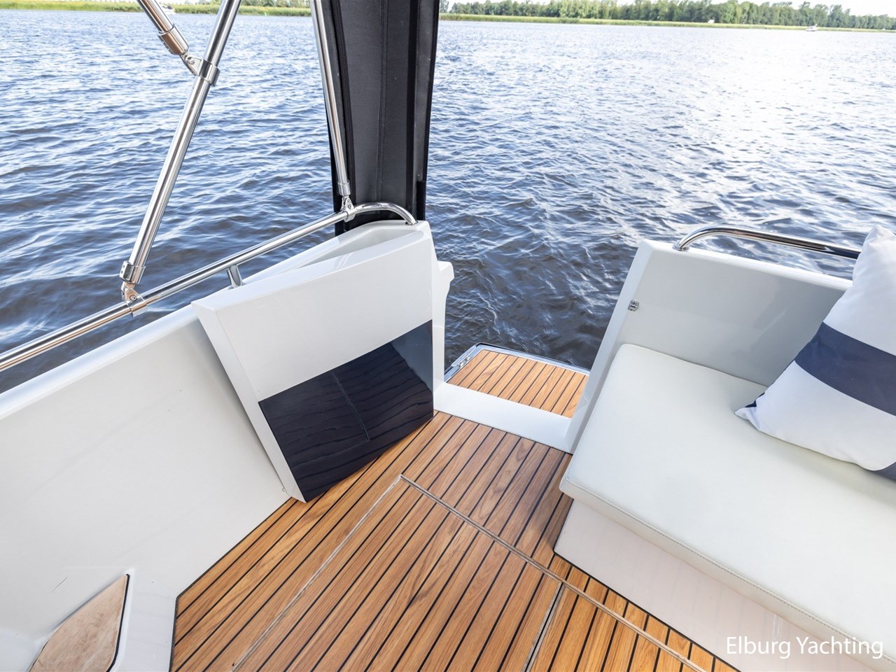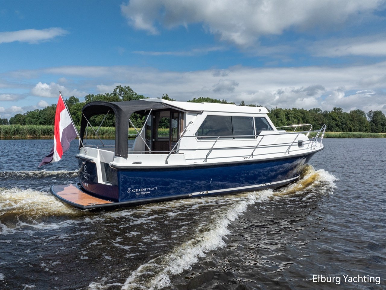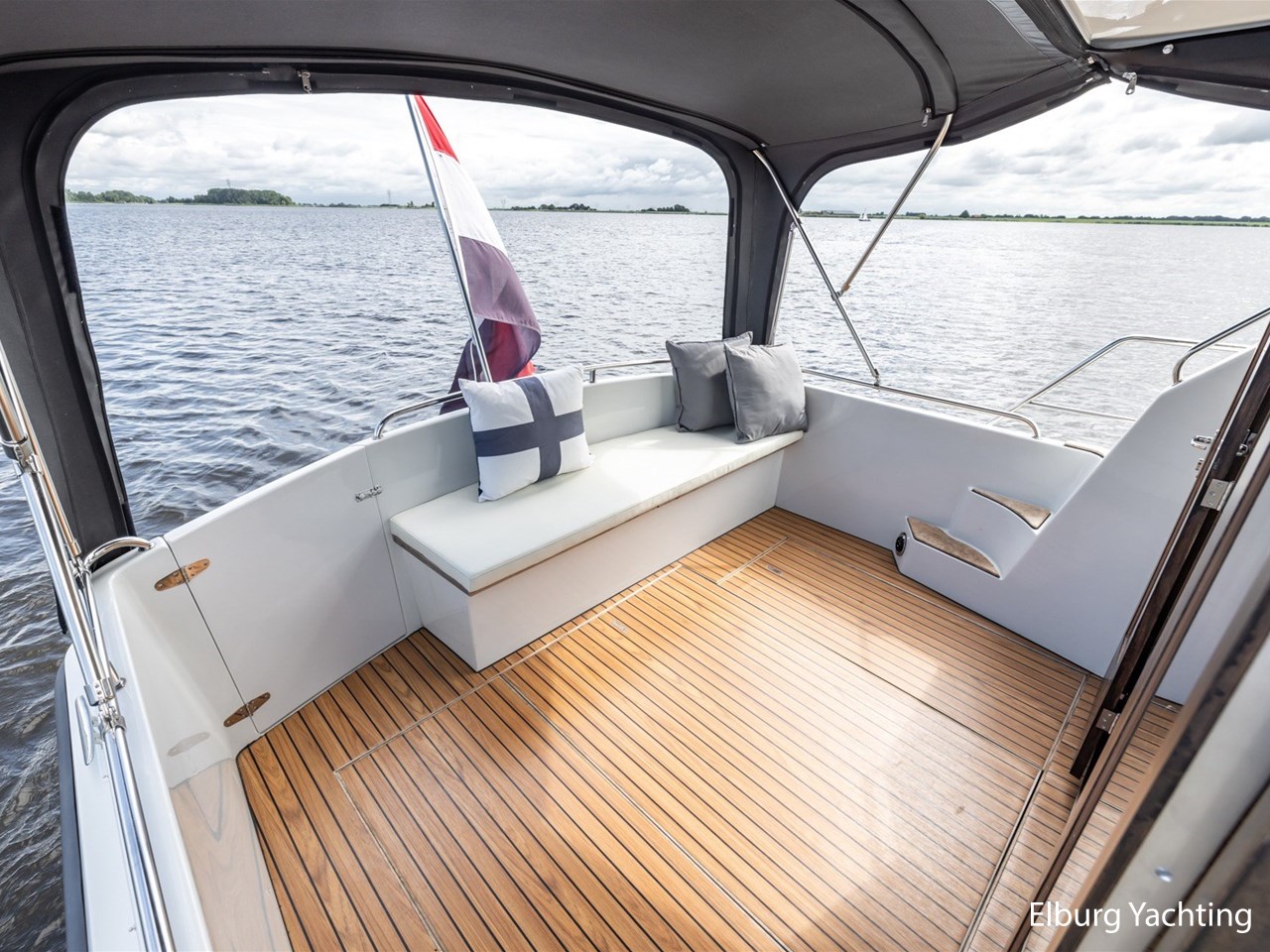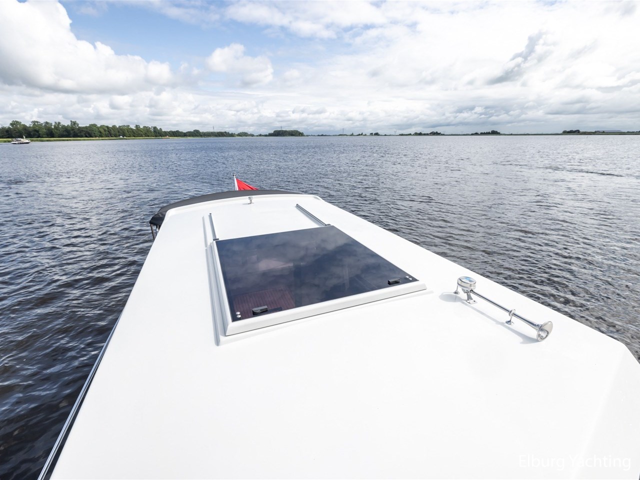 Extremely beautifully designed Excellent 1000 Touring with a spacious layout. Outside, the sporty line of the yacht stands out in combination with classic details such as the double stainless steel sea railing in combination with the stainless steel anchor and stainless steel anchor fittings. The Excellent has comfortable gangways and is easy to moor and unmoor using the 10 stainless steel bollards in combination with the Quick electric bow and stern thruster. The cosy open cockpit has a lockable tent, a hull door to the attached swimming platform and a pleasant settee. From the open cockpit, the floor-level saloon can be reached through the four French doors. The saloon features a comfortable dinette with a spacious table, the clear steering position and plenty of storage space. The spacious windows in the saloon let in a lot of natural light. There are 2 sliding windows on both sides with window screens and a beautiful sliding roof. The interior has a modern, spacious layout with beautiful walnut wood and natural colours. The galley is located to starboard with a sink, large Dometic refrigerator and a 3-burner gas cooker with Dometic extractor system. On port side, the wet room is located with electric toilet, fine shower and sink. In the front, the owner's cabin is situated with a free-standing French bed with plenty of storage space. For questions and/or to make an appointment, you are welcome 7 days a week at Elburg Yachting.