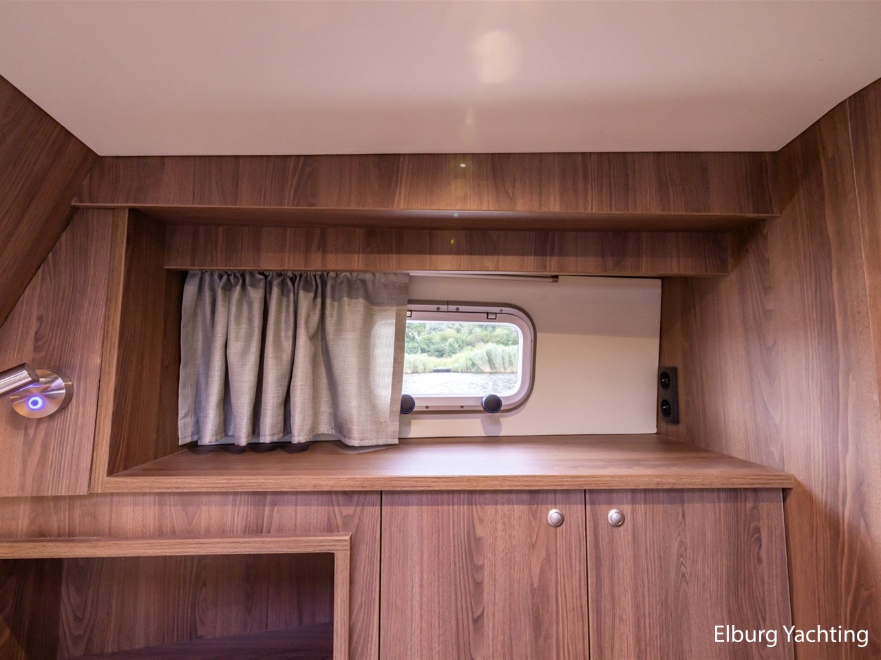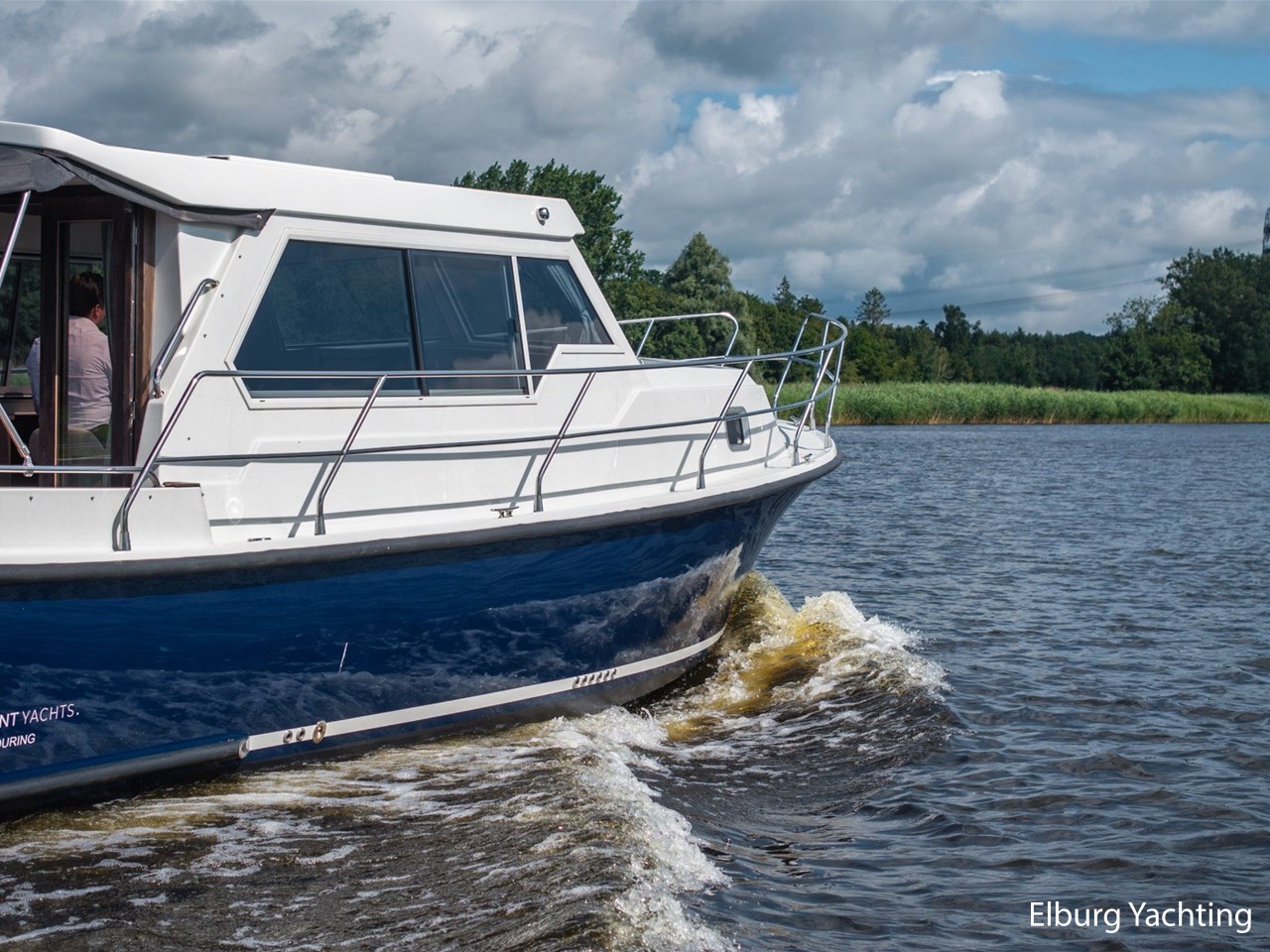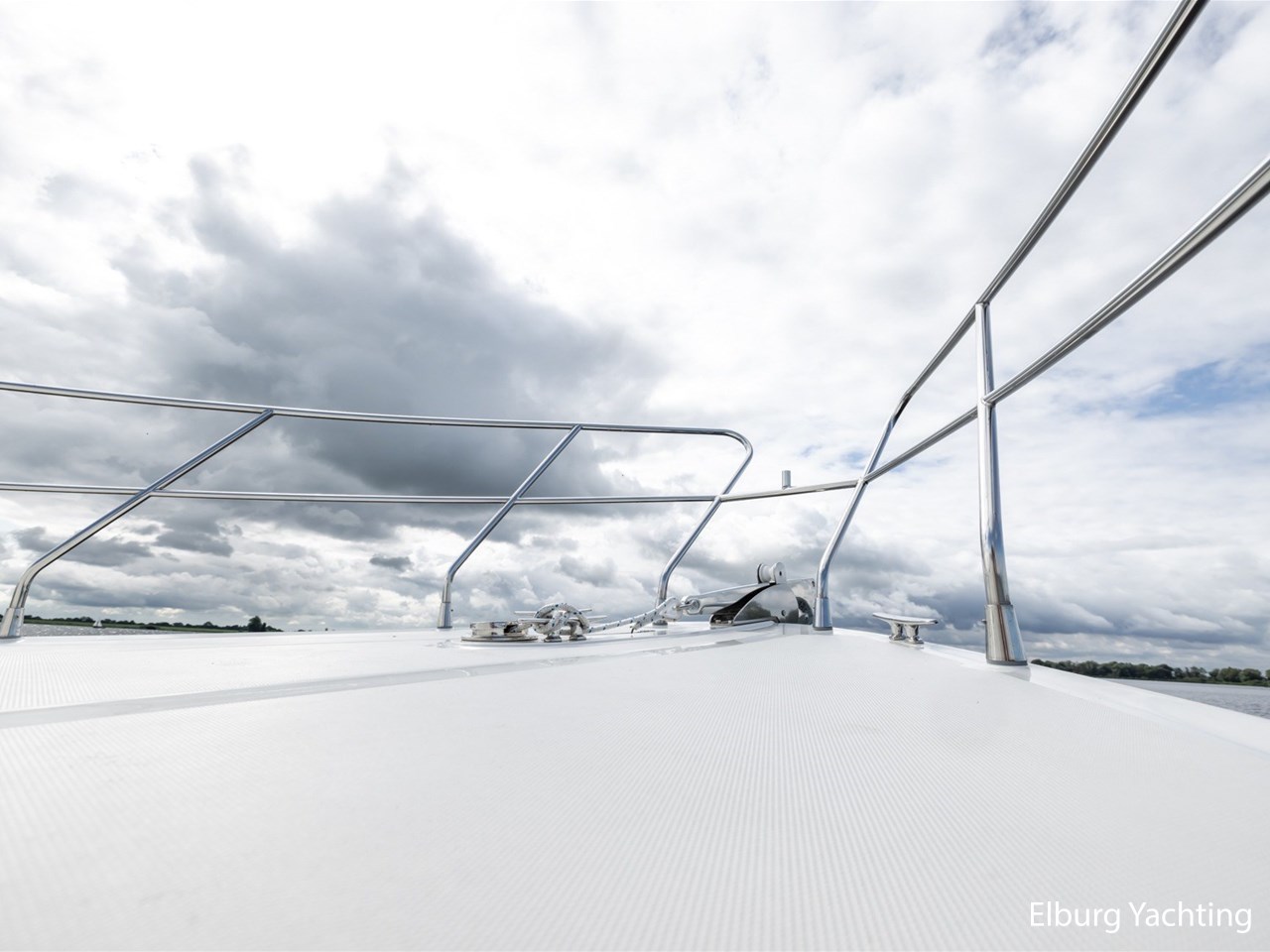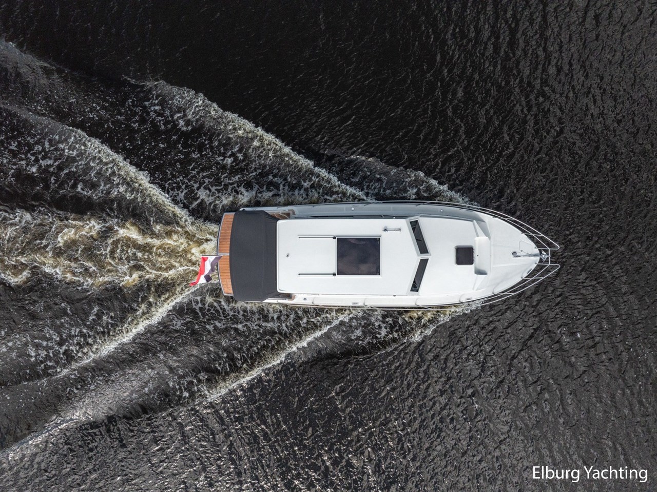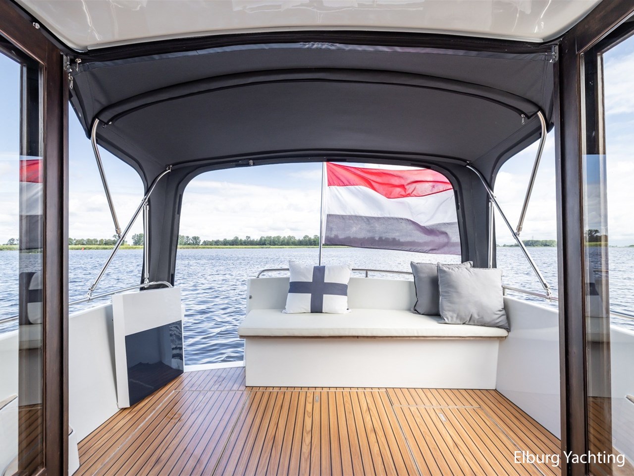 Extremely beautifully designed Excellent 1000 Touring with a spacious layout. Outside, the sporty line of the yacht stands out in combination with classic details such as the double stainless steel sea railing in combination with the stainless steel anchor and stainless steel anchor fittings. The Excellent has comfortable gangways and is easy to moor and unmoor using the 10 stainless steel bollards in combination with the Quick electric bow and stern thruster. The cosy open cockpit has a lockable tent, a hull door to the attached swimming platform and a pleasant settee. From the open cockpit, the floor-level saloon can be reached through the four French doors. The saloon features a comfortable dinette with a spacious table, the clear steering position and plenty of storage space. The spacious windows in the saloon let in a lot of natural light. There are 2 sliding windows on both sides with window screens and a beautiful sliding roof. The interior has a modern, spacious layout with beautiful walnut wood and natural colours. The galley is located to starboard with a sink, large Dometic refrigerator and a 3-burner gas cooker with Dometic extractor system. On port side, the wet room is located with electric toilet, fine shower and sink. In the front, the owner's cabin is situated with a free-standing French bed with plenty of storage space. For questions and/or to make an appointment, you are welcome 7 days a week at Elburg Yachting.