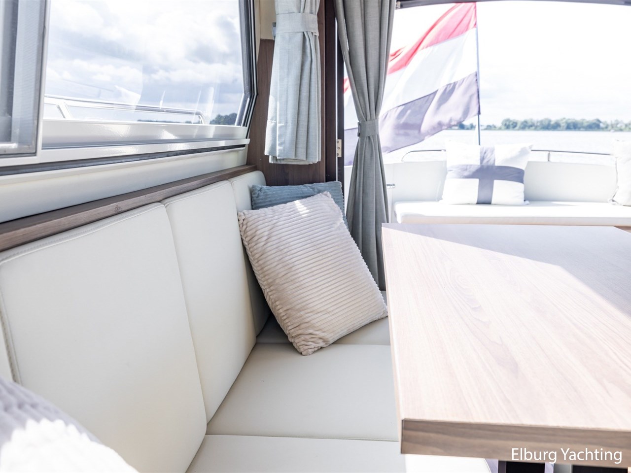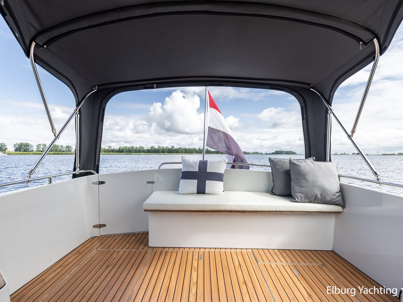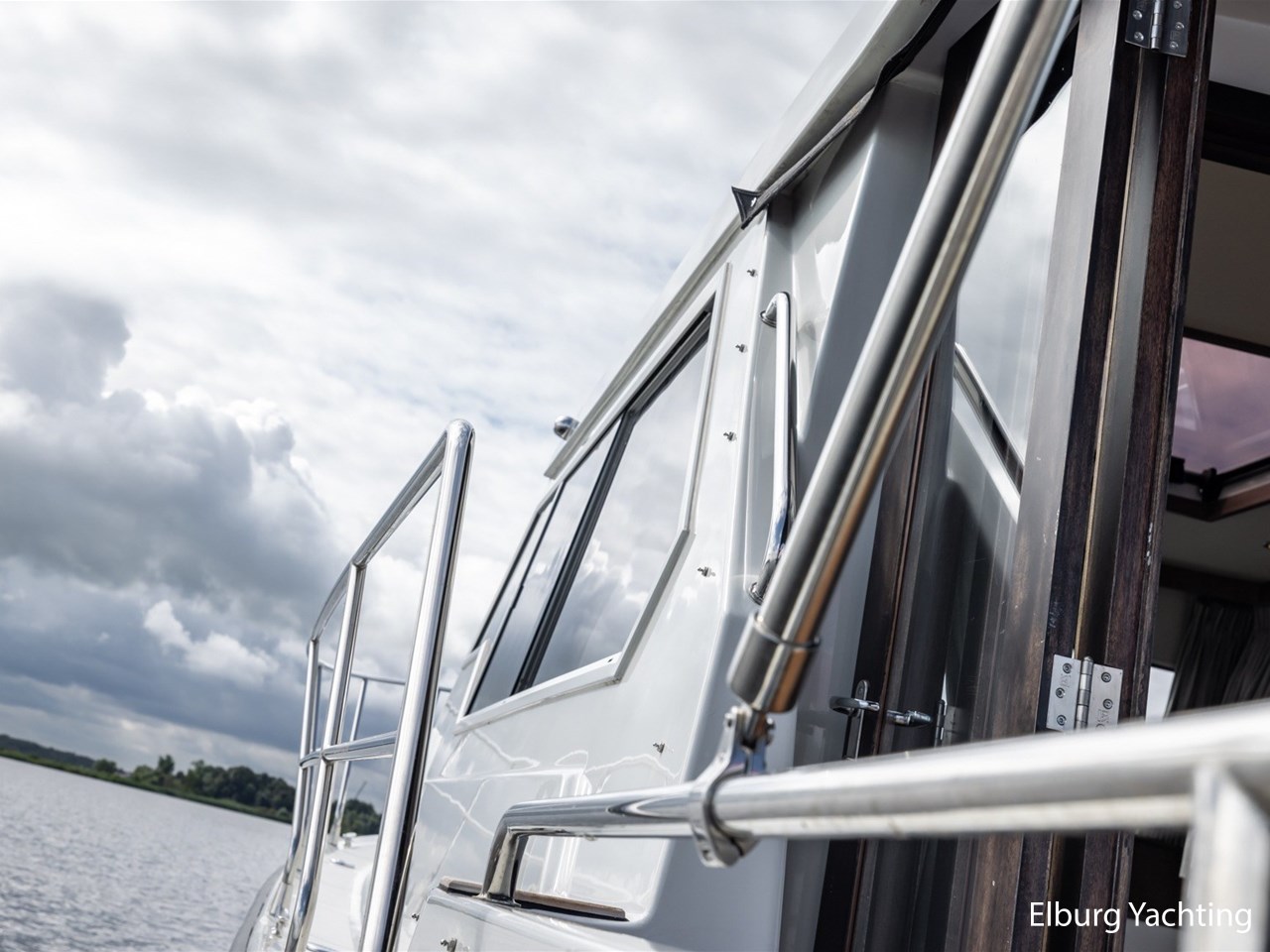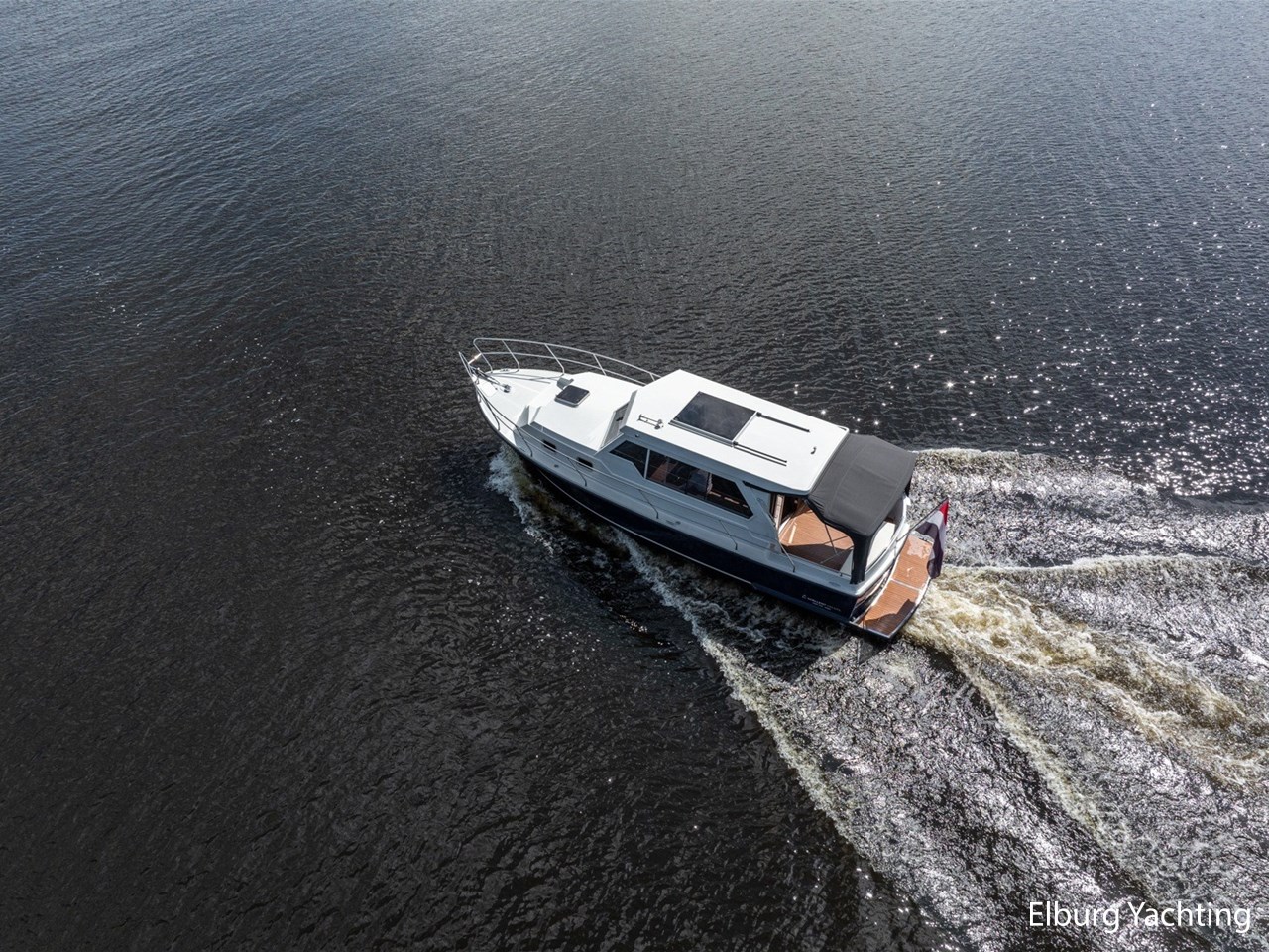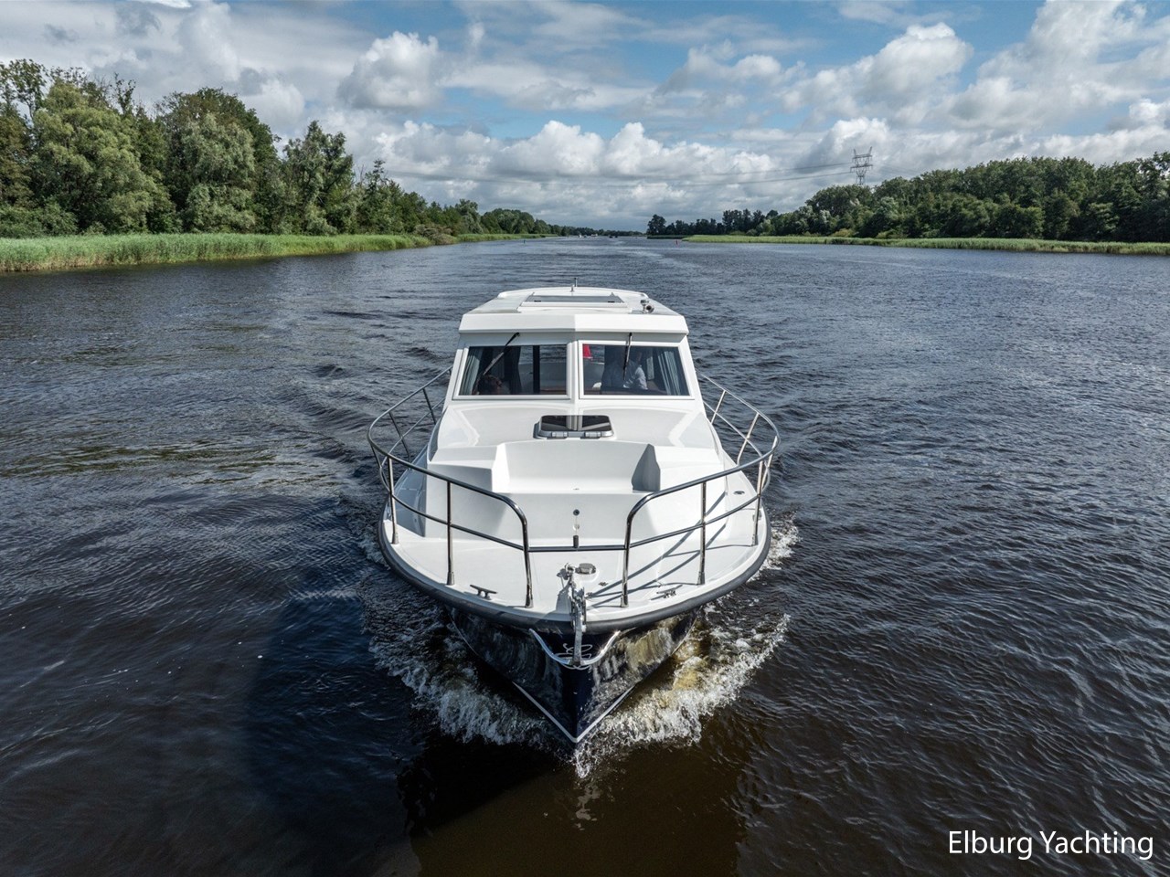 Extremely beautifully designed Excellent 1000 Touring with a spacious layout. Outside, the sporty line of the yacht stands out in combination with classic details such as the double stainless steel sea railing in combination with the stainless steel anchor and stainless steel anchor fittings. The Excellent has comfortable gangways and is easy to moor and unmoor using the 10 stainless steel bollards in combination with the Quick electric bow and stern thruster. The cosy open cockpit has a lockable tent, a hull door to the attached swimming platform and a pleasant settee. From the open cockpit, the floor-level saloon can be reached through the four French doors. The saloon features a comfortable dinette with a spacious table, the clear steering position and plenty of storage space. The spacious windows in the saloon let in a lot of natural light. There are 2 sliding windows on both sides with window screens and a beautiful sliding roof. The interior has a modern, spacious layout with beautiful walnut wood and natural colours. The galley is located to starboard with a sink, large Dometic refrigerator and a 3-burner gas cooker with Dometic extractor system. On port side, the wet room is located with electric toilet, fine shower and sink. In the front, the owner's cabin is situated with a free-standing French bed with plenty of storage space. For questions and/or to make an appointment, you are welcome 7 days a week at Elburg Yachting.