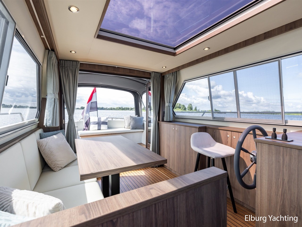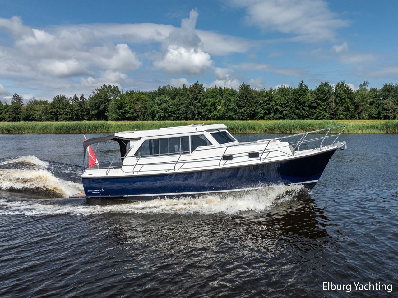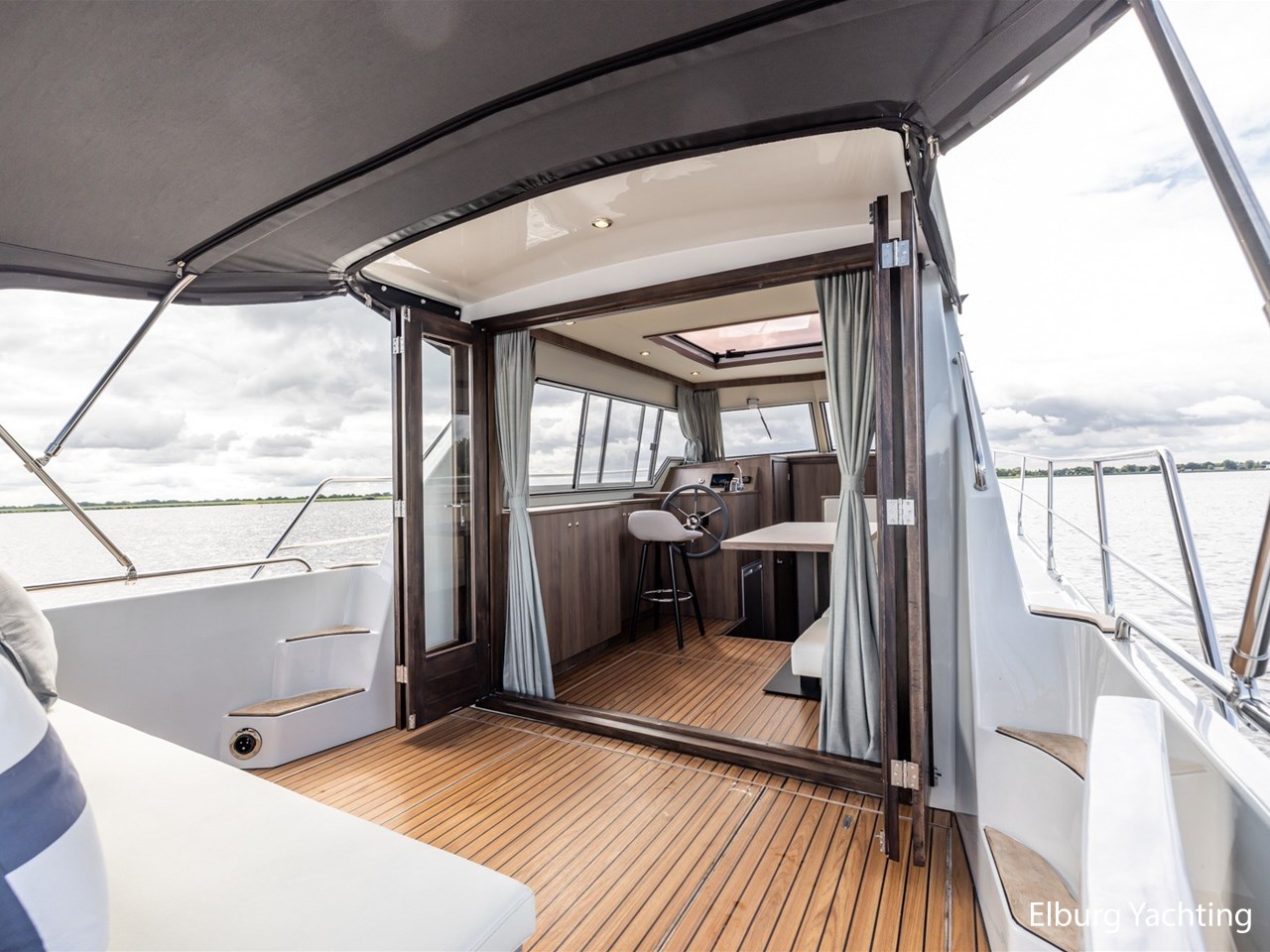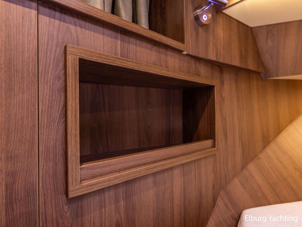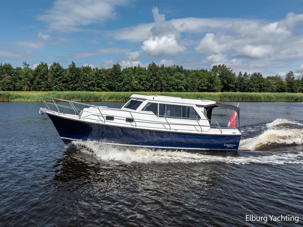 Extremely beautifully designed Excellent 1000 Touring with a spacious layout. Outside, the sporty line of the yacht stands out in combination with classic details such as the double stainless steel sea railing in combination with the stainless steel anchor and stainless steel anchor fittings. The Excellent has comfortable gangways and is easy to moor and unmoor using the 10 stainless steel bollards in combination with the Quick electric bow and stern thruster. The cosy open cockpit has a lockable tent, a hull door to the attached swimming platform and a pleasant settee. From the open cockpit, the floor-level saloon can be reached through the four French doors. The saloon features a comfortable dinette with a spacious table, the clear steering position and plenty of storage space. The spacious windows in the saloon let in a lot of natural light. There are 2 sliding windows on both sides with window screens and a beautiful sliding roof. The interior has a modern, spacious layout with beautiful walnut wood and natural colours. The galley is located to starboard with a sink, large Dometic refrigerator and a 3-burner gas cooker with Dometic extractor system. On port side, the wet room is located with electric toilet, fine shower and sink. In the front, the owner's cabin is situated with a free-standing French bed with plenty of storage space. For questions and/or to make an appointment, you are welcome 7 days a week at Elburg Yachting.