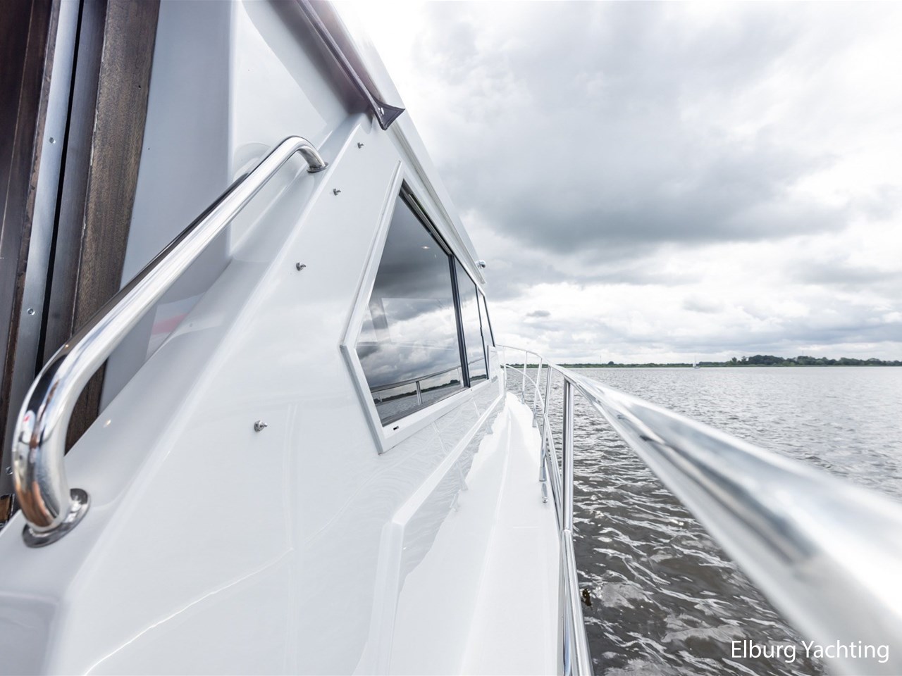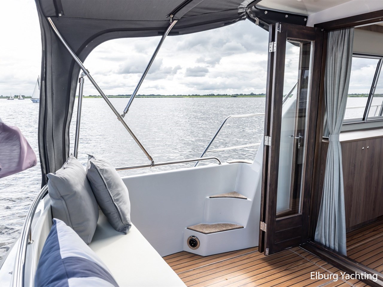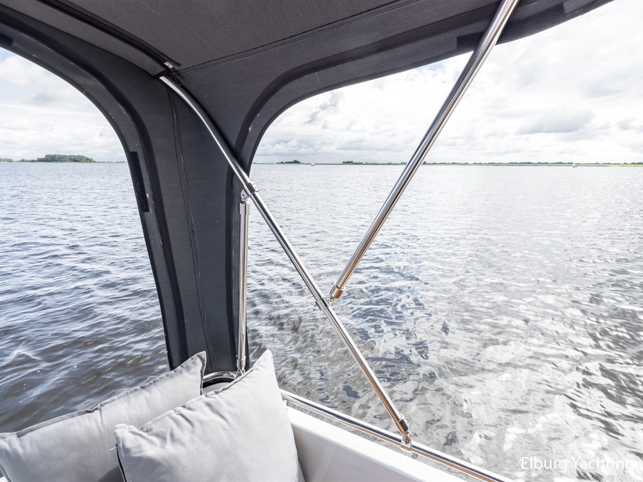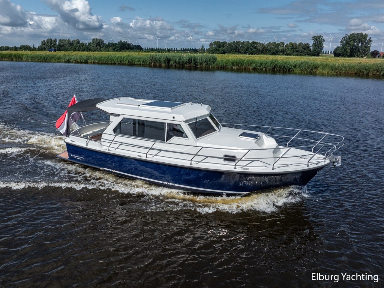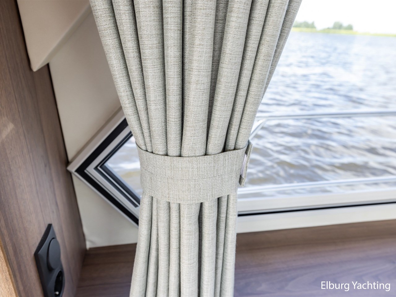 Extremely beautifully designed Excellent 1000 Touring with a spacious layout. Outside, the sporty line of the yacht stands out in combination with classic details such as the double stainless steel sea railing in combination with the stainless steel anchor and stainless steel anchor fittings. The Excellent has comfortable gangways and is easy to moor and unmoor using the 10 stainless steel bollards in combination with the Quick electric bow and stern thruster. The cosy open cockpit has a lockable tent, a hull door to the attached swimming platform and a pleasant settee. From the open cockpit, the floor-level saloon can be reached through the four French doors. The saloon features a comfortable dinette with a spacious table, the clear steering position and plenty of storage space. The spacious windows in the saloon let in a lot of natural light. There are 2 sliding windows on both sides with window screens and a beautiful sliding roof. The interior has a modern, spacious layout with beautiful walnut wood and natural colours. The galley is located to starboard with a sink, large Dometic refrigerator and a 3-burner gas cooker with Dometic extractor system. On port side, the wet room is located with electric toilet, fine shower and sink. In the front, the owner's cabin is situated with a free-standing French bed with plenty of storage space. For questions and/or to make an appointment, you are welcome 7 days a week at Elburg Yachting.