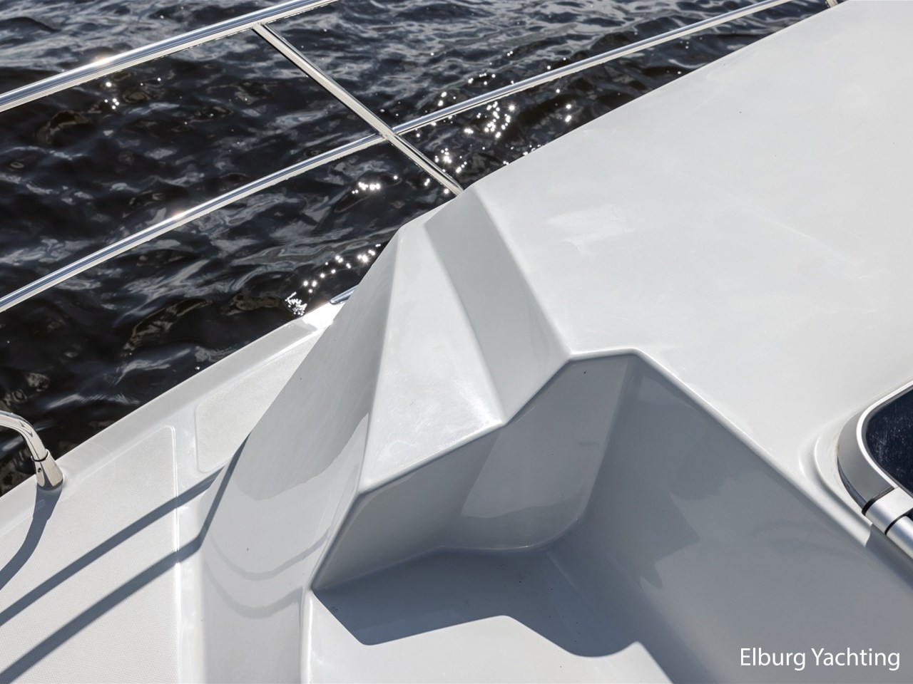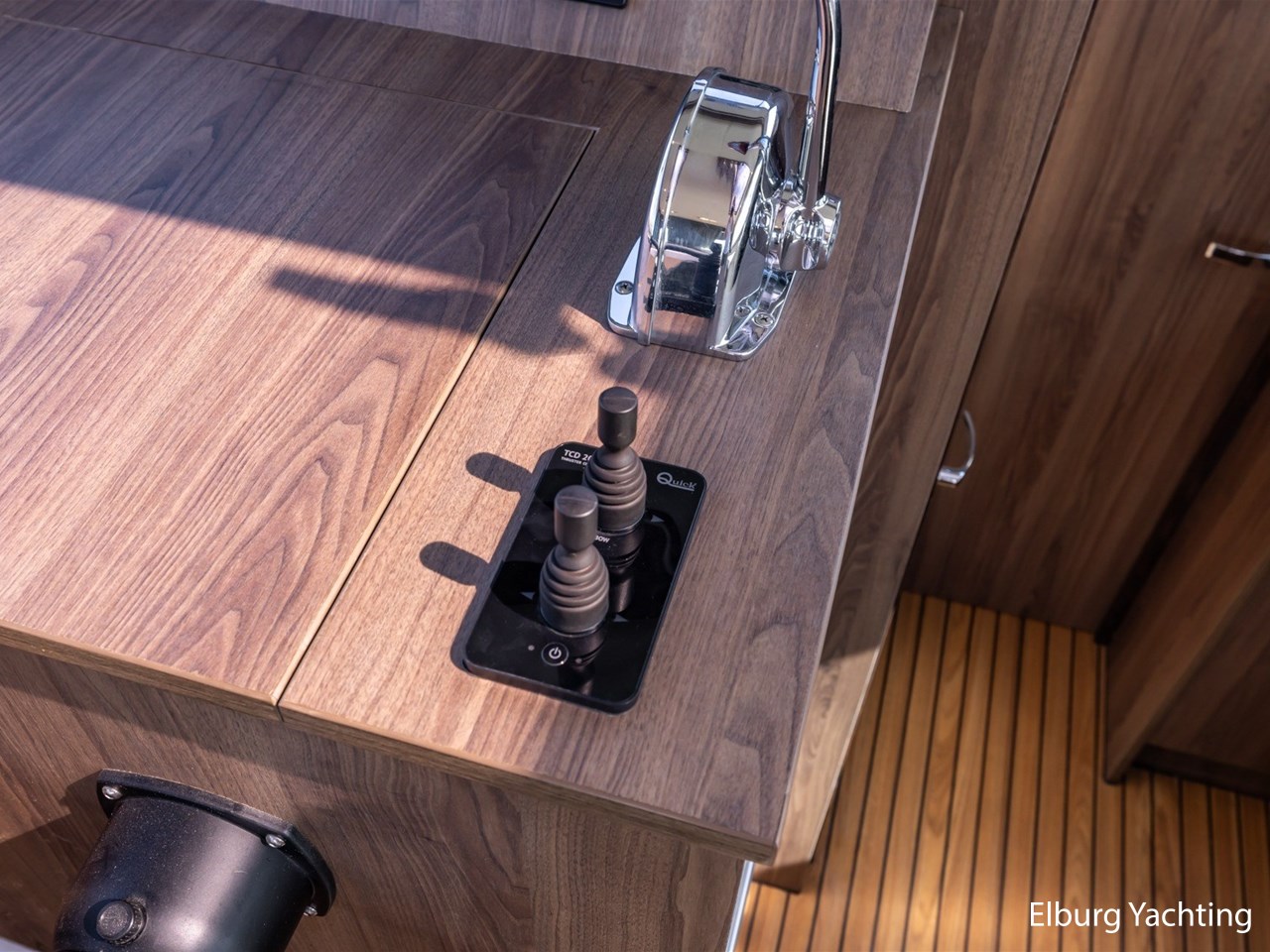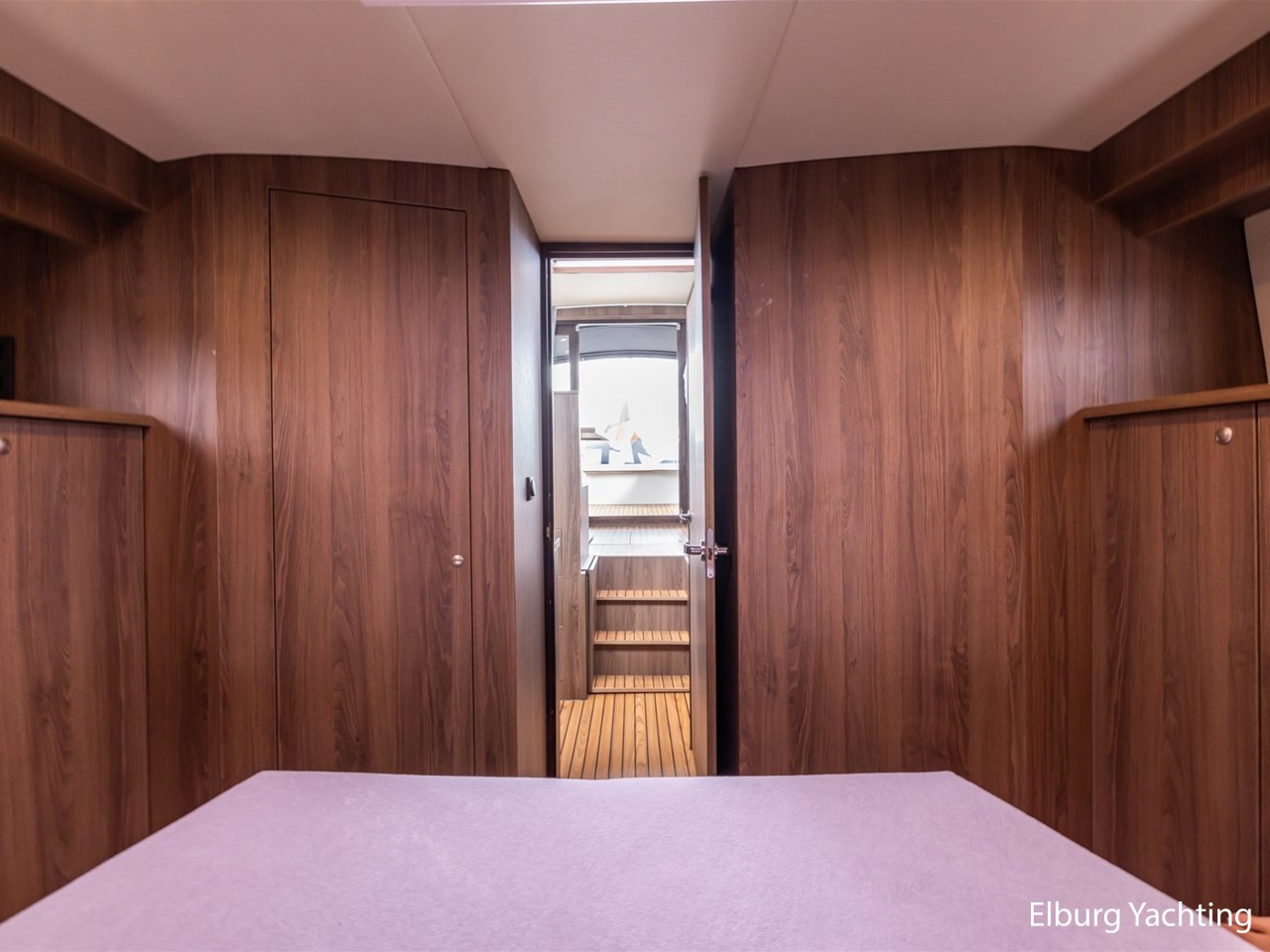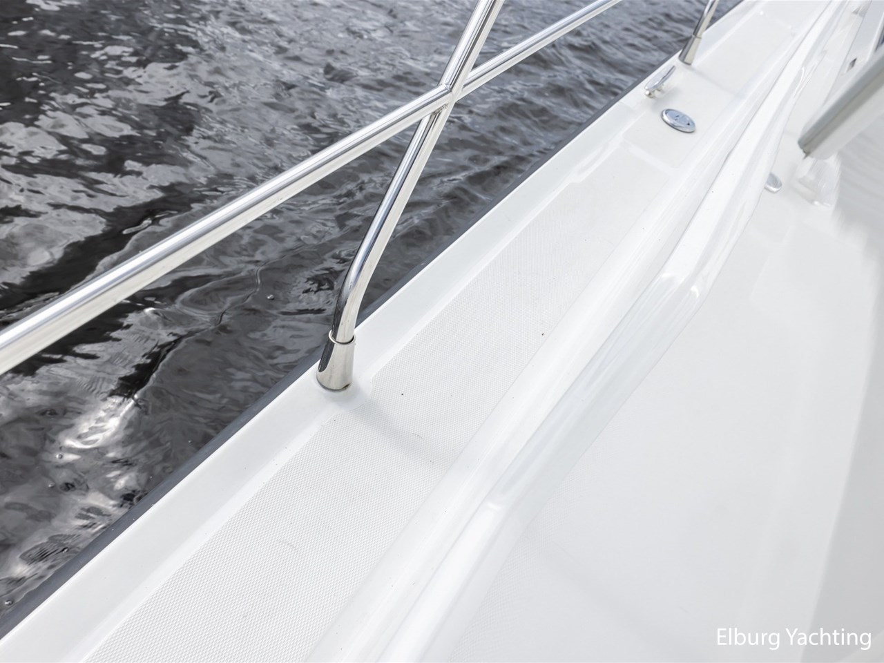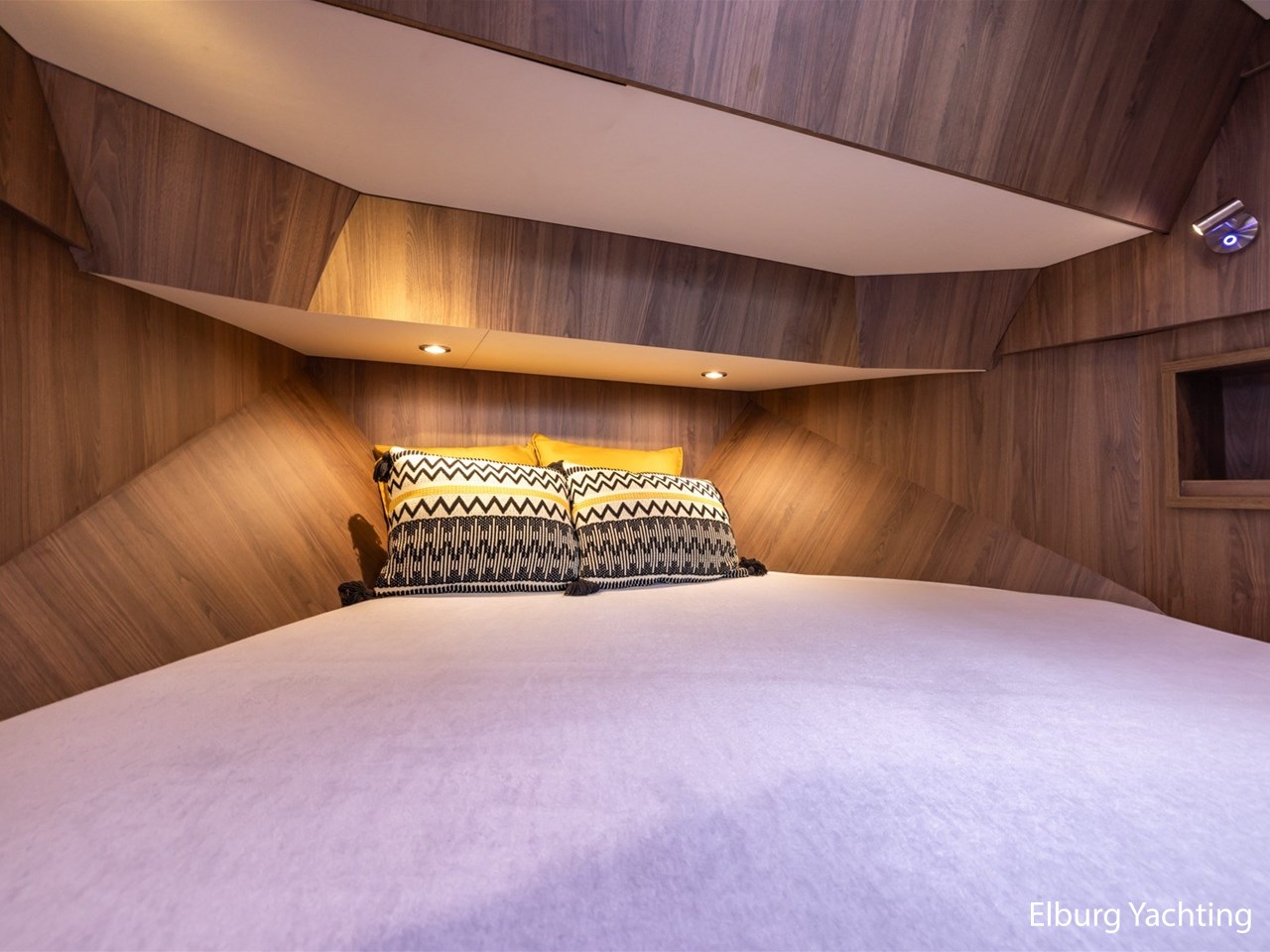 Extremely beautifully designed Excellent 1000 Touring with a spacious layout. Outside, the sporty line of the yacht stands out in combination with classic details such as the double stainless steel sea railing in combination with the stainless steel anchor and stainless steel anchor fittings. The Excellent has comfortable gangways and is easy to moor and unmoor using the 10 stainless steel bollards in combination with the Quick electric bow and stern thruster. The cosy open cockpit has a lockable tent, a hull door to the attached swimming platform and a pleasant settee. From the open cockpit, the floor-level saloon can be reached through the four French doors. The saloon features a comfortable dinette with a spacious table, the clear steering position and plenty of storage space. The spacious windows in the saloon let in a lot of natural light. There are 2 sliding windows on both sides with window screens and a beautiful sliding roof. The interior has a modern, spacious layout with beautiful walnut wood and natural colours. The galley is located to starboard with a sink, large Dometic refrigerator and a 3-burner gas cooker with Dometic extractor system. On port side, the wet room is located with electric toilet, fine shower and sink. In the front, the owner's cabin is situated with a free-standing French bed with plenty of storage space. For questions and/or to make an appointment, you are welcome 7 days a week at Elburg Yachting.