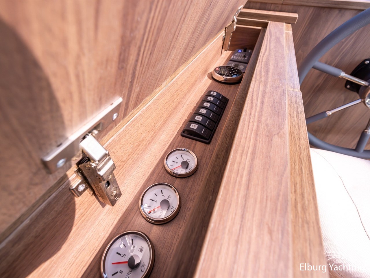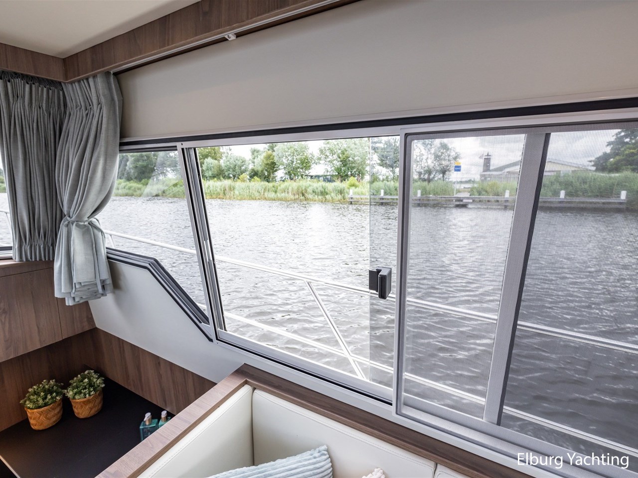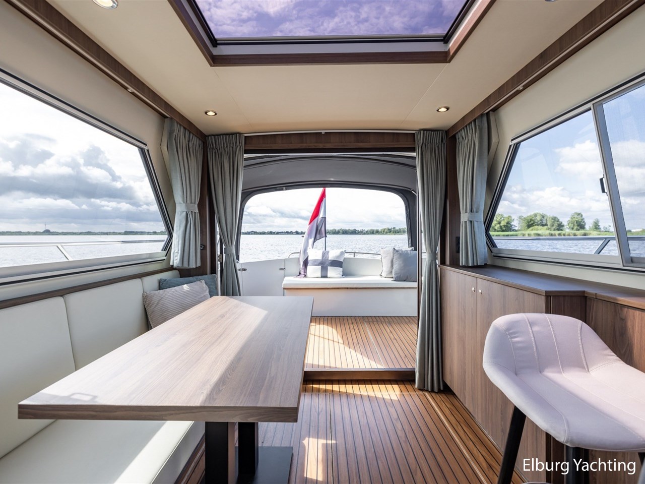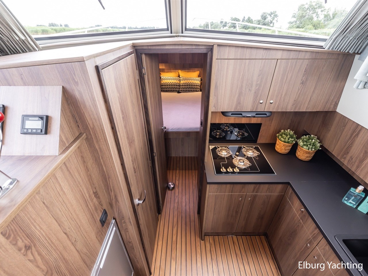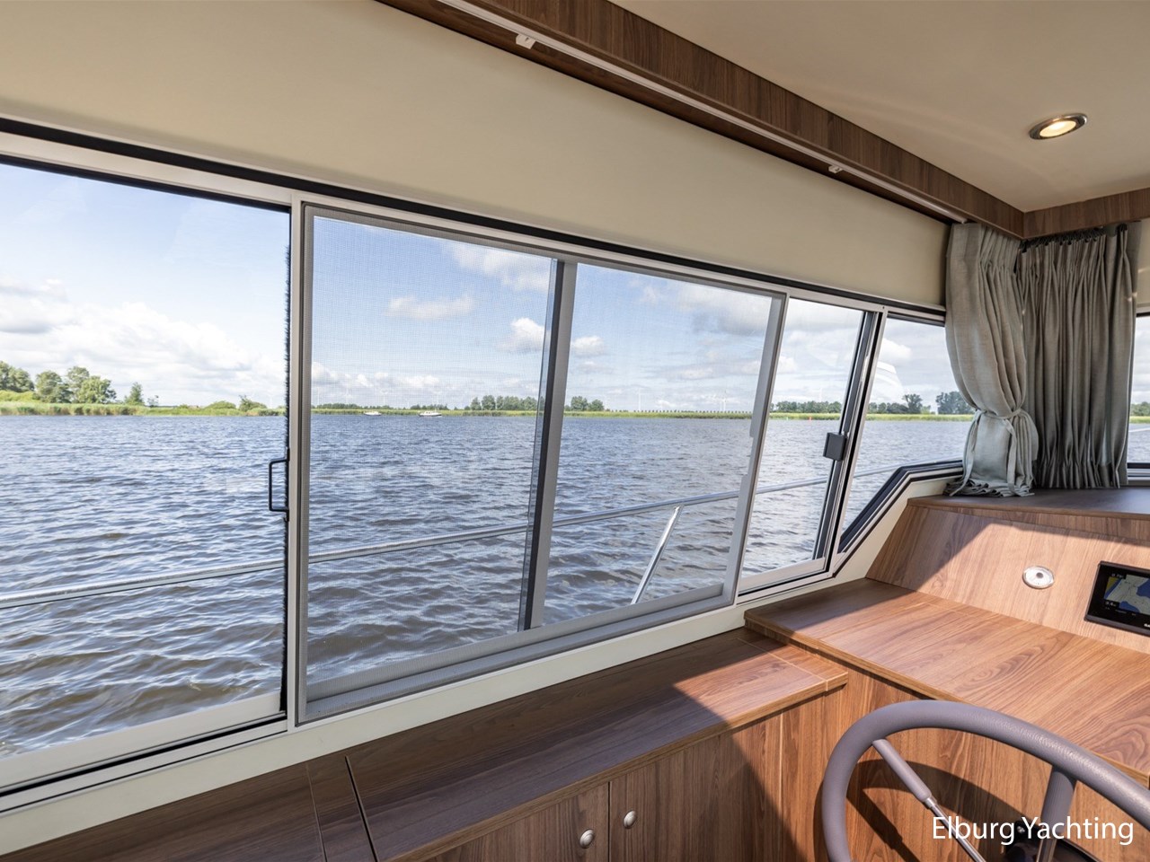 Extremely beautifully designed Excellent 1000 Touring with a spacious layout. Outside, the sporty line of the yacht stands out in combination with classic details such as the double stainless steel sea railing in combination with the stainless steel anchor and stainless steel anchor fittings. The Excellent has comfortable gangways and is easy to moor and unmoor using the 10 stainless steel bollards in combination with the Quick electric bow and stern thruster. The cosy open cockpit has a lockable tent, a hull door to the attached swimming platform and a pleasant settee. From the open cockpit, the floor-level saloon can be reached through the four French doors. The saloon features a comfortable dinette with a spacious table, the clear steering position and plenty of storage space. The spacious windows in the saloon let in a lot of natural light. There are 2 sliding windows on both sides with window screens and a beautiful sliding roof. The interior has a modern, spacious layout with beautiful walnut wood and natural colours. The galley is located to starboard with a sink, large Dometic refrigerator and a 3-burner gas cooker with Dometic extractor system. On port side, the wet room is located with electric toilet, fine shower and sink. In the front, the owner's cabin is situated with a free-standing French bed with plenty of storage space. For questions and/or to make an appointment, you are welcome 7 days a week at Elburg Yachting.
