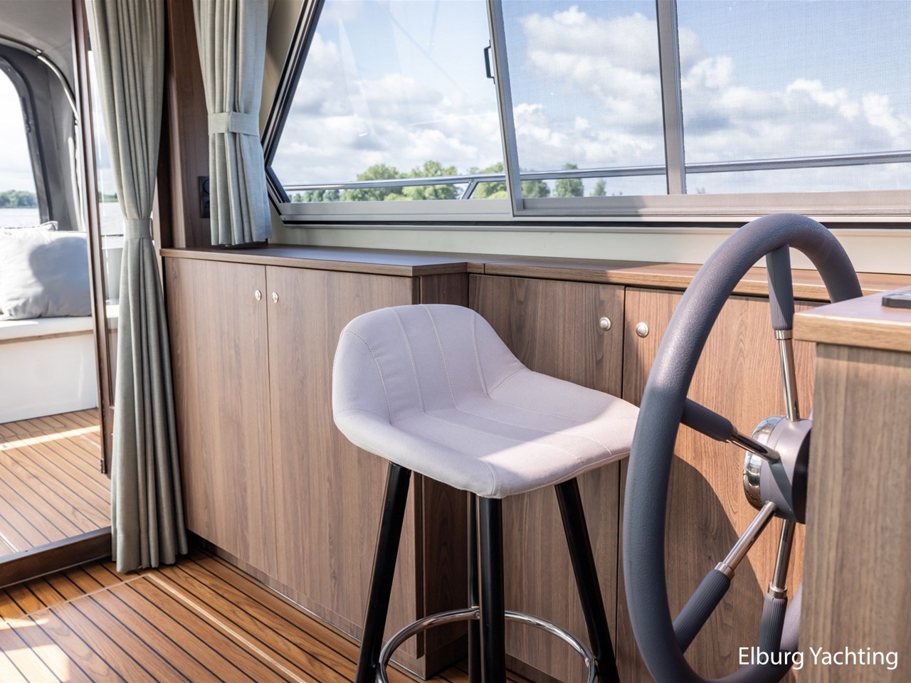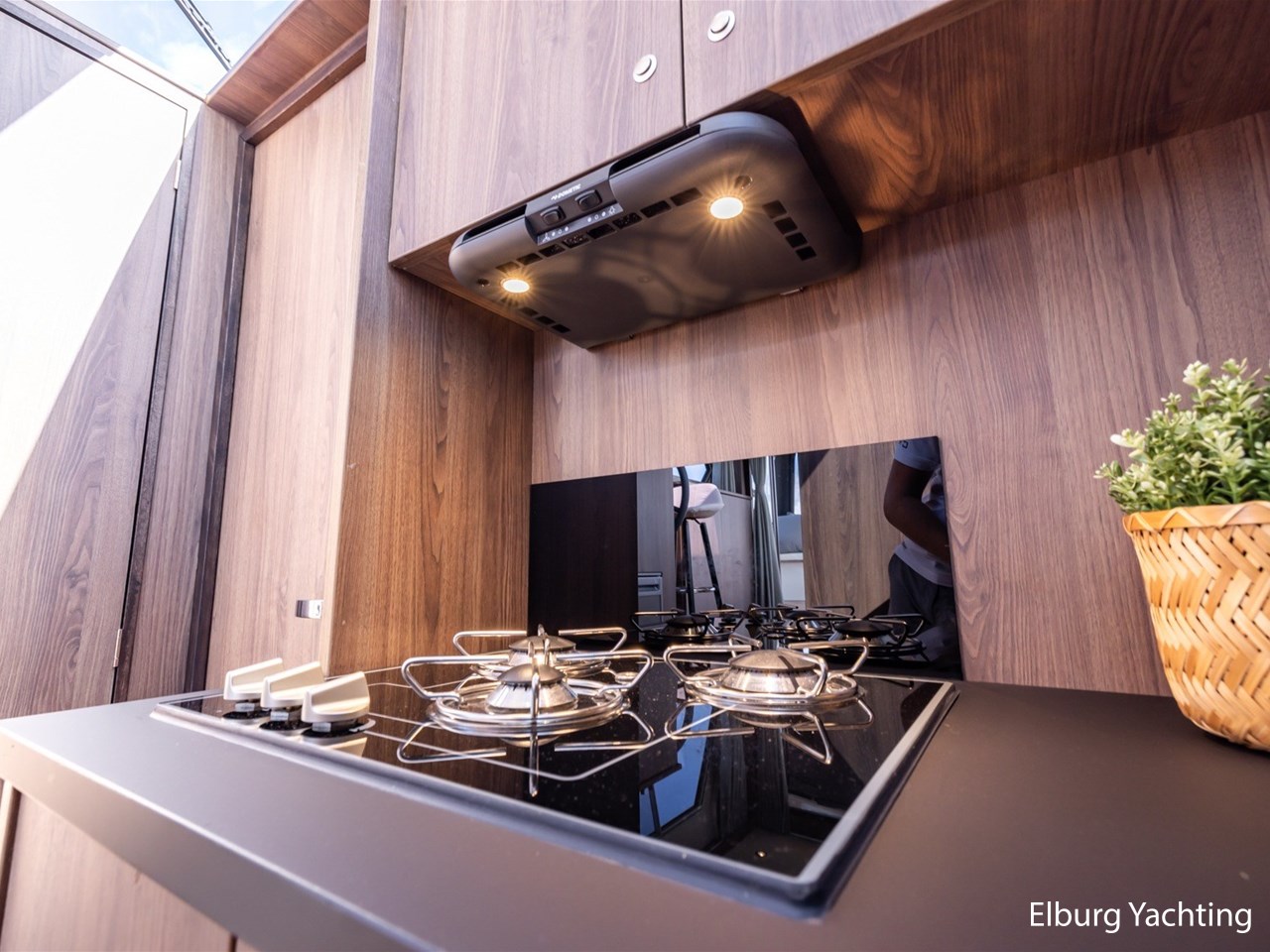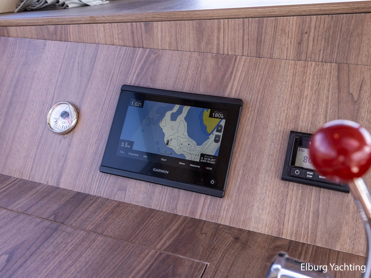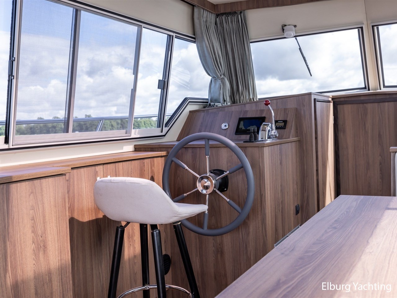 Extremely beautifully designed Excellent 1000 Touring with a spacious layout. Outside, the sporty line of the yacht stands out in combination with classic details such as the double stainless steel sea railing in combination with the stainless steel anchor and stainless steel anchor fittings. The Excellent has comfortable gangways and is easy to moor and unmoor using the 10 stainless steel bollards in combination with the Quick electric bow and stern thruster. The cosy open cockpit has a lockable tent, a hull door to the attached swimming platform and a pleasant settee. From the open cockpit, the floor-level saloon can be reached through the four French doors. The saloon features a comfortable dinette with a spacious table, the clear steering position and plenty of storage space. The spacious windows in the saloon let in a lot of natural light. There are 2 sliding windows on both sides with window screens and a beautiful sliding roof. The interior has a modern, spacious layout with beautiful walnut wood and natural colours. The galley is located to starboard with a sink, large Dometic refrigerator and a 3-burner gas cooker with Dometic extractor system. On port side, the wet room is located with electric toilet, fine shower and sink. In the front, the owner's cabin is situated with a free-standing French bed with plenty of storage space. For questions and/or to make an appointment, you are welcome 7 days a week at Elburg Yachting.