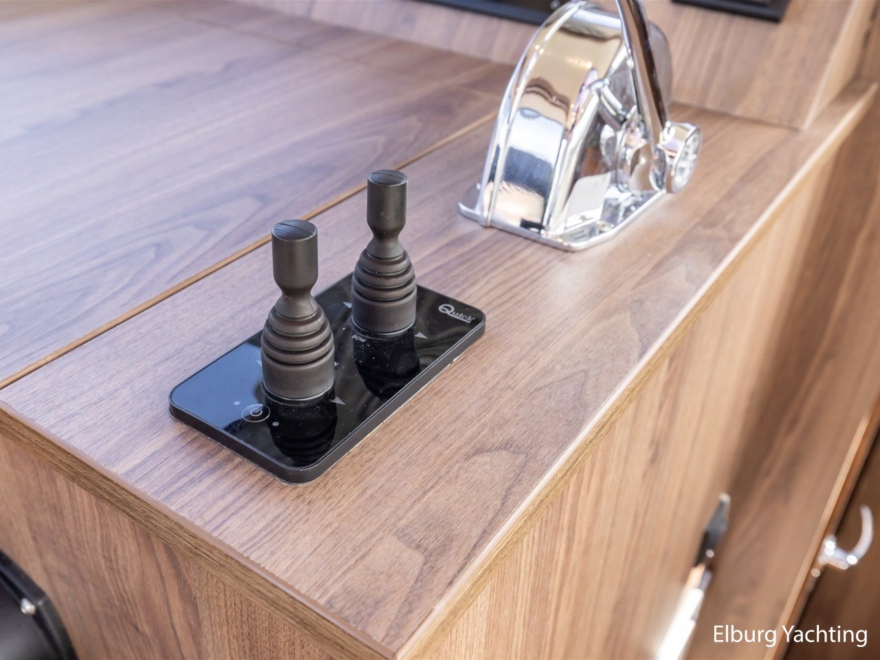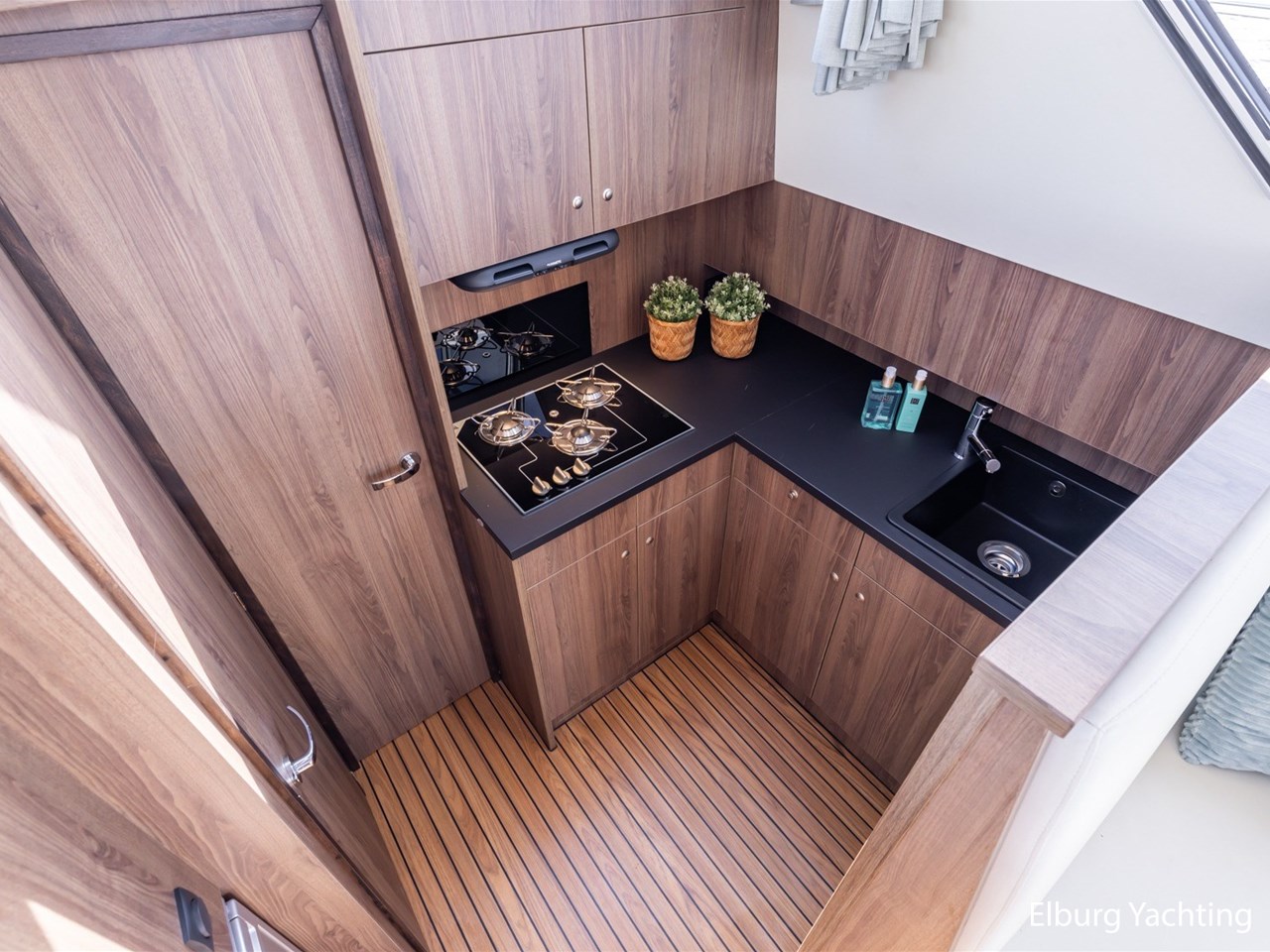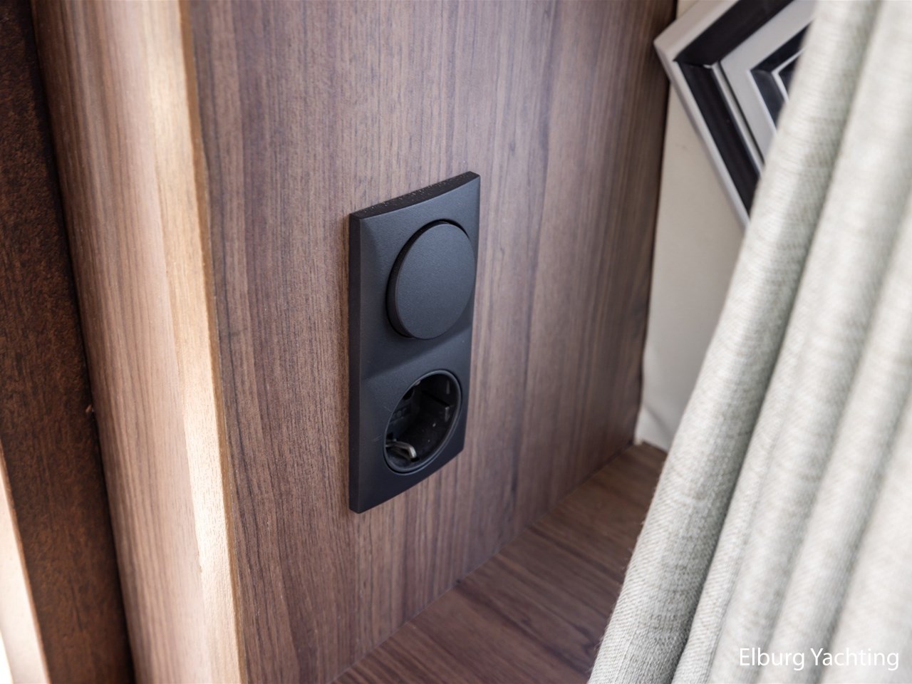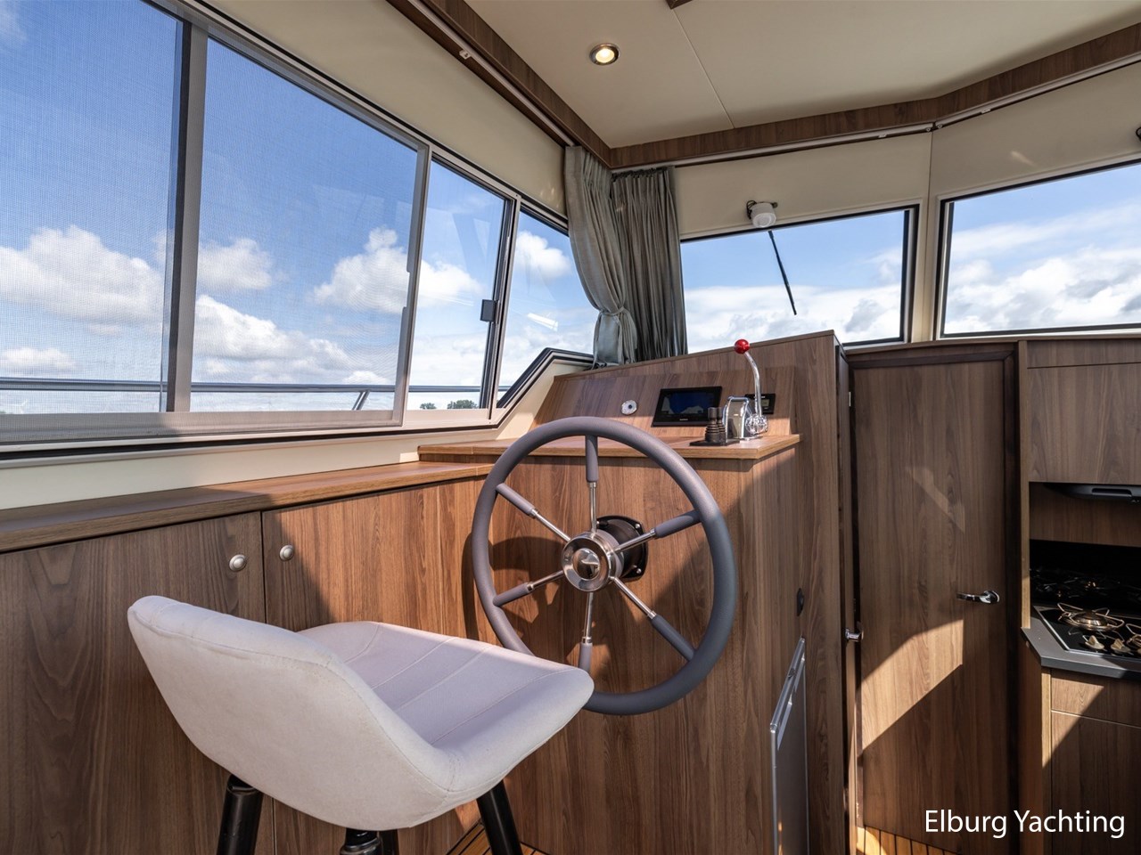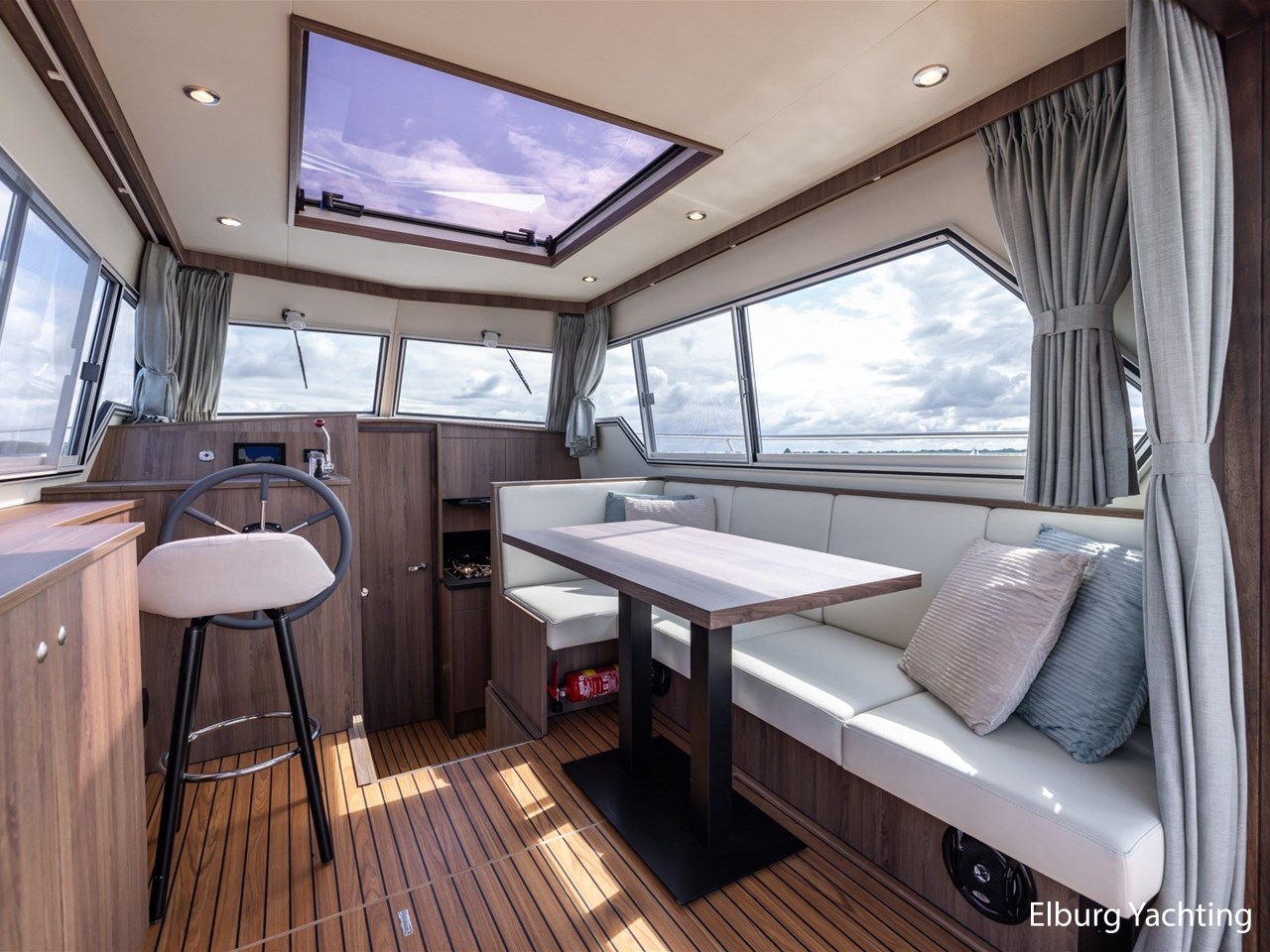 Extremely beautifully designed Excellent 1000 Touring with a spacious layout. Outside, the sporty line of the yacht stands out in combination with classic details such as the double stainless steel sea railing in combination with the stainless steel anchor and stainless steel anchor fittings. The Excellent has comfortable gangways and is easy to moor and unmoor using the 10 stainless steel bollards in combination with the Quick electric bow and stern thruster. The cosy open cockpit has a lockable tent, a hull door to the attached swimming platform and a pleasant settee. From the open cockpit, the floor-level saloon can be reached through the four French doors. The saloon features a comfortable dinette with a spacious table, the clear steering position and plenty of storage space. The spacious windows in the saloon let in a lot of natural light. There are 2 sliding windows on both sides with window screens and a beautiful sliding roof. The interior has a modern, spacious layout with beautiful walnut wood and natural colours. The galley is located to starboard with a sink, large Dometic refrigerator and a 3-burner gas cooker with Dometic extractor system. On port side, the wet room is located with electric toilet, fine shower and sink. In the front, the owner's cabin is situated with a free-standing French bed with plenty of storage space. For questions and/or to make an appointment, you are welcome 7 days a week at Elburg Yachting.