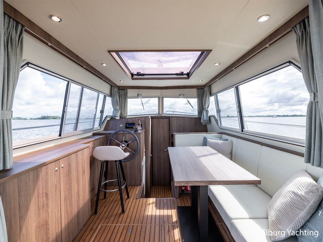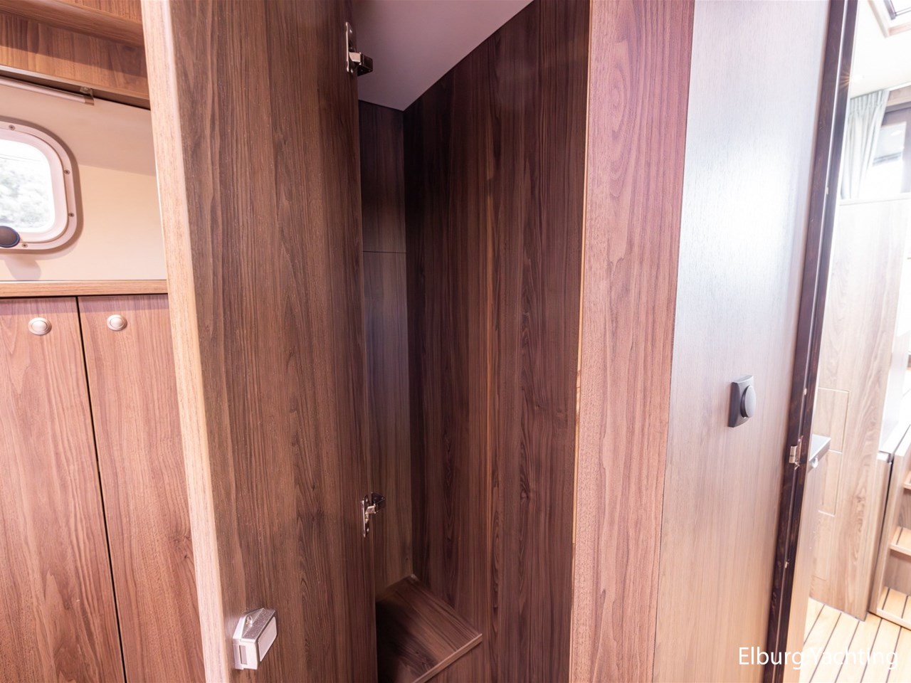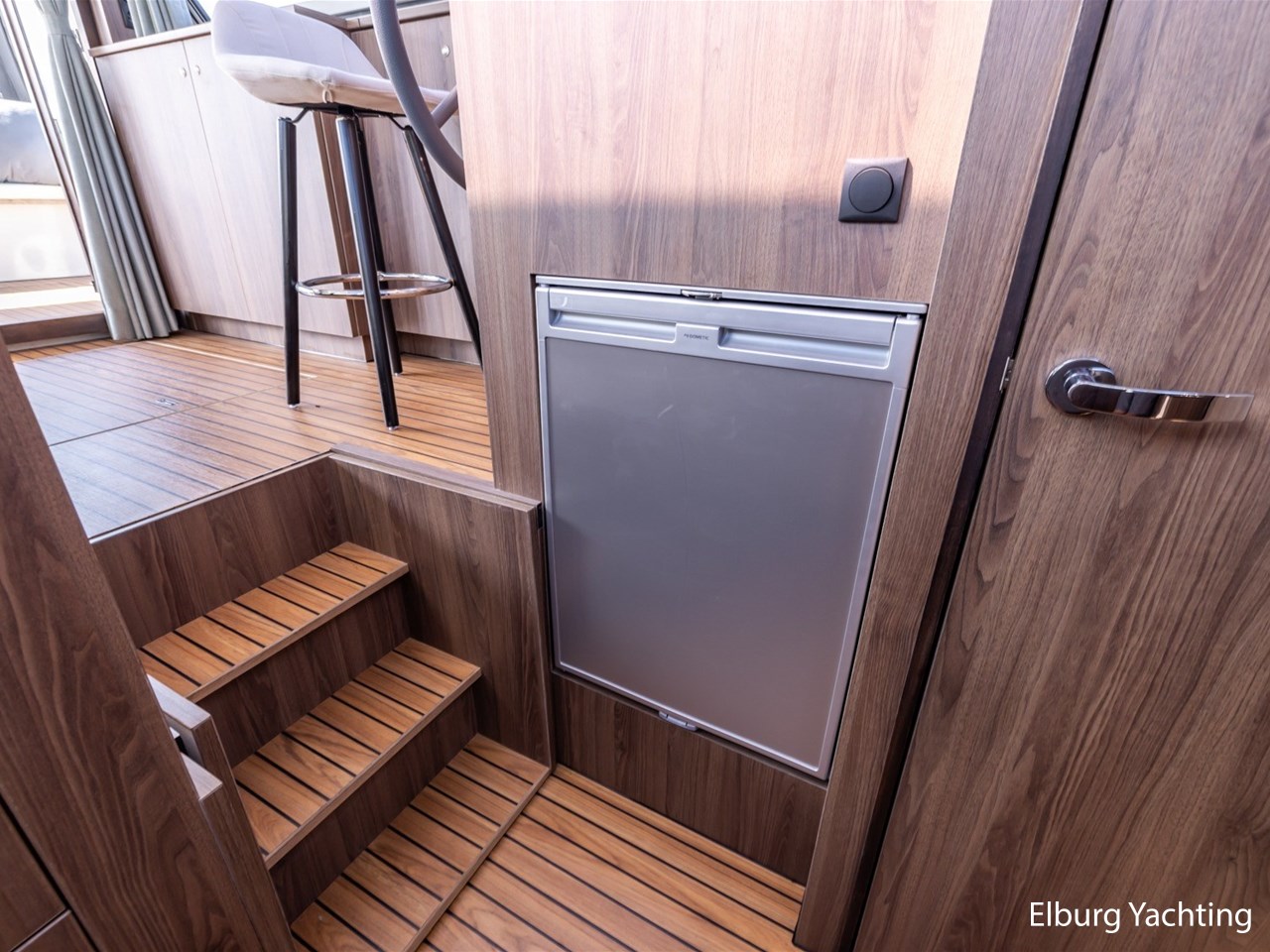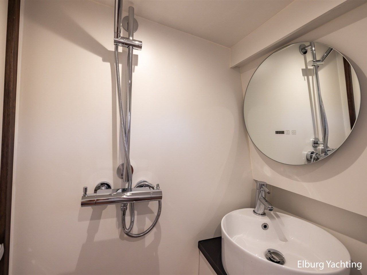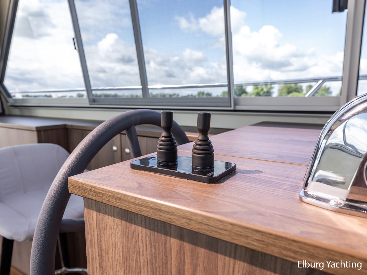 Extremely beautifully designed Excellent 1000 Touring with a spacious layout. Outside, the sporty line of the yacht stands out in combination with classic details such as the double stainless steel sea railing in combination with the stainless steel anchor and stainless steel anchor fittings. The Excellent has comfortable gangways and is easy to moor and unmoor using the 10 stainless steel bollards in combination with the Quick electric bow and stern thruster. The cosy open cockpit has a lockable tent, a hull door to the attached swimming platform and a pleasant settee. From the open cockpit, the floor-level saloon can be reached through the four French doors. The saloon features a comfortable dinette with a spacious table, the clear steering position and plenty of storage space. The spacious windows in the saloon let in a lot of natural light. There are 2 sliding windows on both sides with window screens and a beautiful sliding roof. The interior has a modern, spacious layout with beautiful walnut wood and natural colours. The galley is located to starboard with a sink, large Dometic refrigerator and a 3-burner gas cooker with Dometic extractor system. On port side, the wet room is located with electric toilet, fine shower and sink. In the front, the owner's cabin is situated with a free-standing French bed with plenty of storage space. For questions and/or to make an appointment, you are welcome 7 days a week at Elburg Yachting.