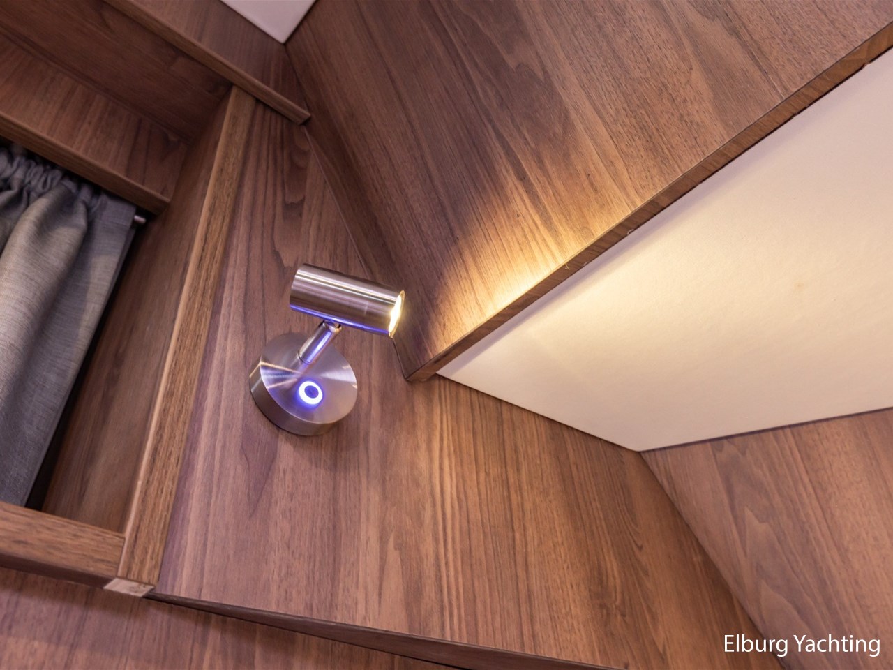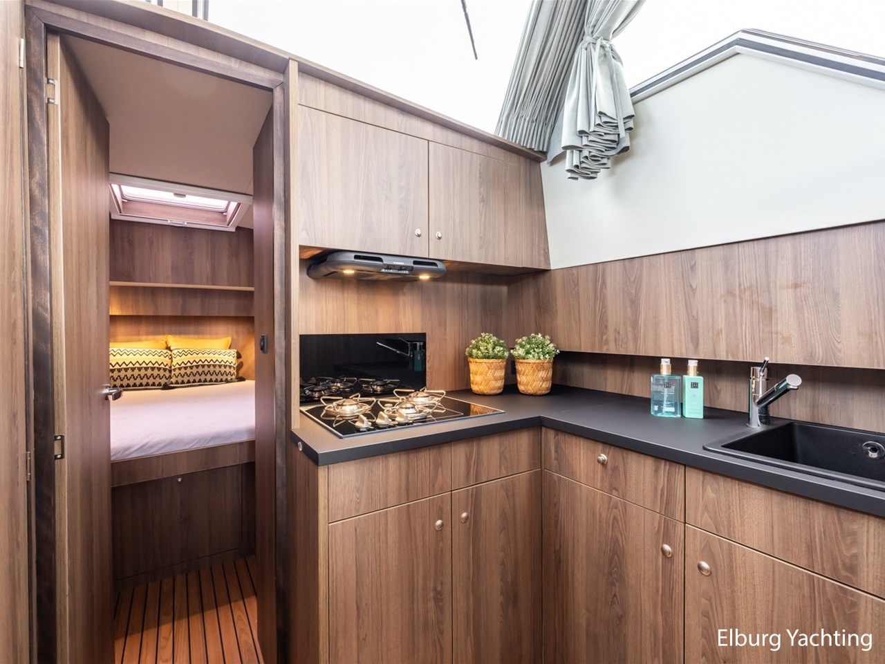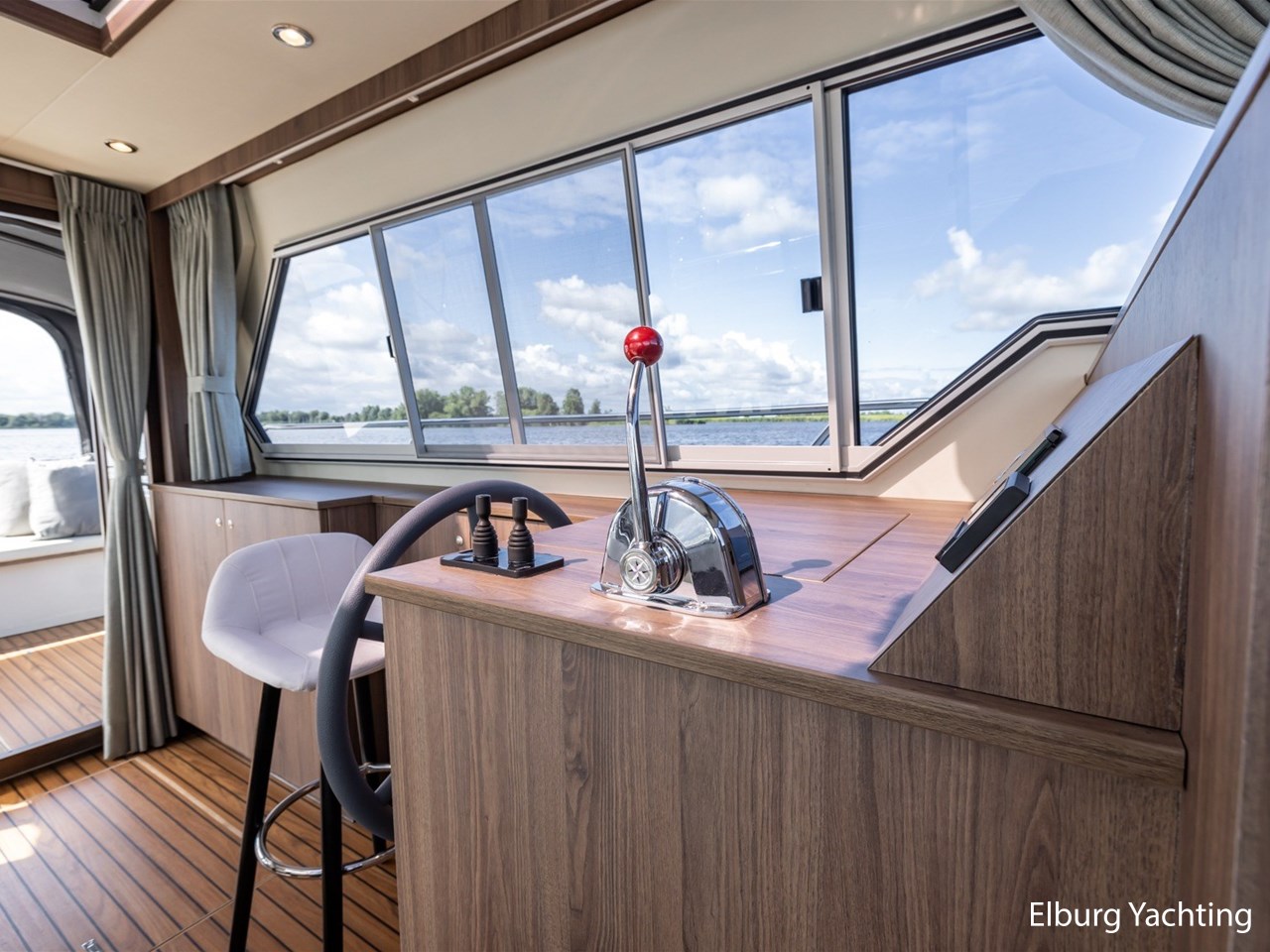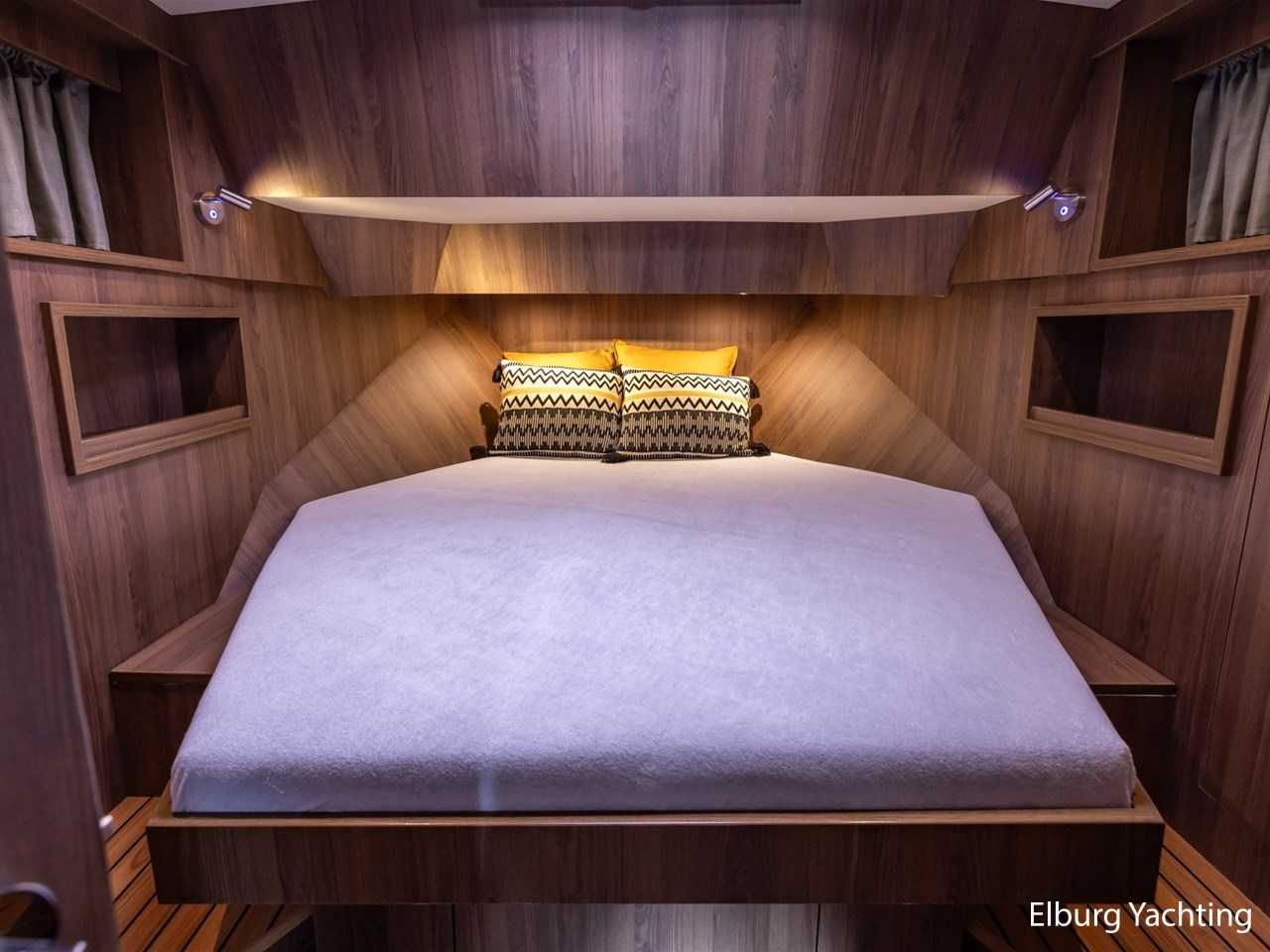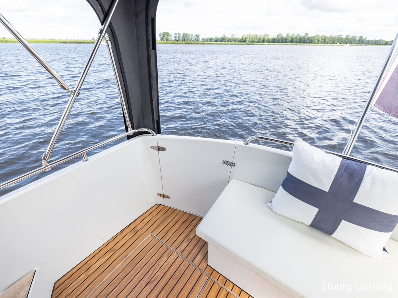 Extremely beautifully designed Excellent 1000 Touring with a spacious layout. Outside, the sporty line of the yacht stands out in combination with classic details such as the double stainless steel sea railing in combination with the stainless steel anchor and stainless steel anchor fittings. The Excellent has comfortable gangways and is easy to moor and unmoor using the 10 stainless steel bollards in combination with the Quick electric bow and stern thruster. The cosy open cockpit has a lockable tent, a hull door to the attached swimming platform and a pleasant settee. From the open cockpit, the floor-level saloon can be reached through the four French doors. The saloon features a comfortable dinette with a spacious table, the clear steering position and plenty of storage space. The spacious windows in the saloon let in a lot of natural light. There are 2 sliding windows on both sides with window screens and a beautiful sliding roof. The interior has a modern, spacious layout with beautiful walnut wood and natural colours. The galley is located to starboard with a sink, large Dometic refrigerator and a 3-burner gas cooker with Dometic extractor system. On port side, the wet room is located with electric toilet, fine shower and sink. In the front, the owner's cabin is situated with a free-standing French bed with plenty of storage space. For questions and/or to make an appointment, you are welcome 7 days a week at Elburg Yachting.