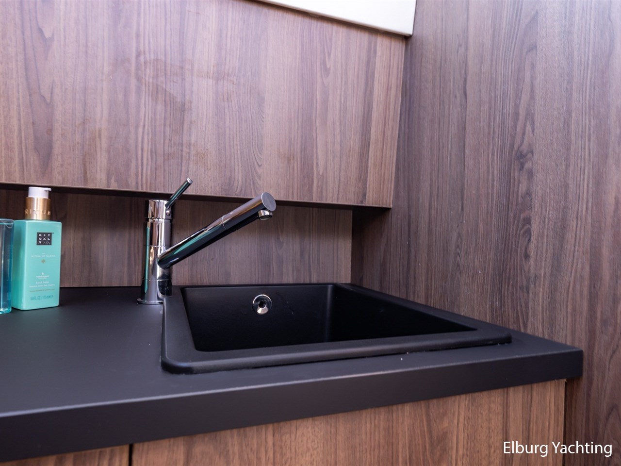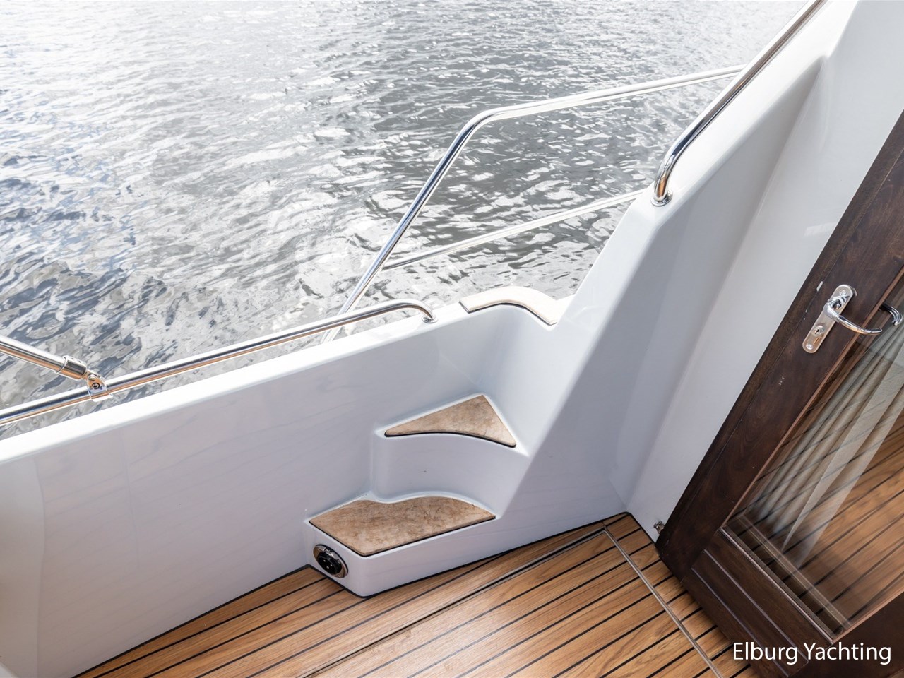 - Integrated bathing platform fitted with HPL teak deck with black trim with rubber buffer strip