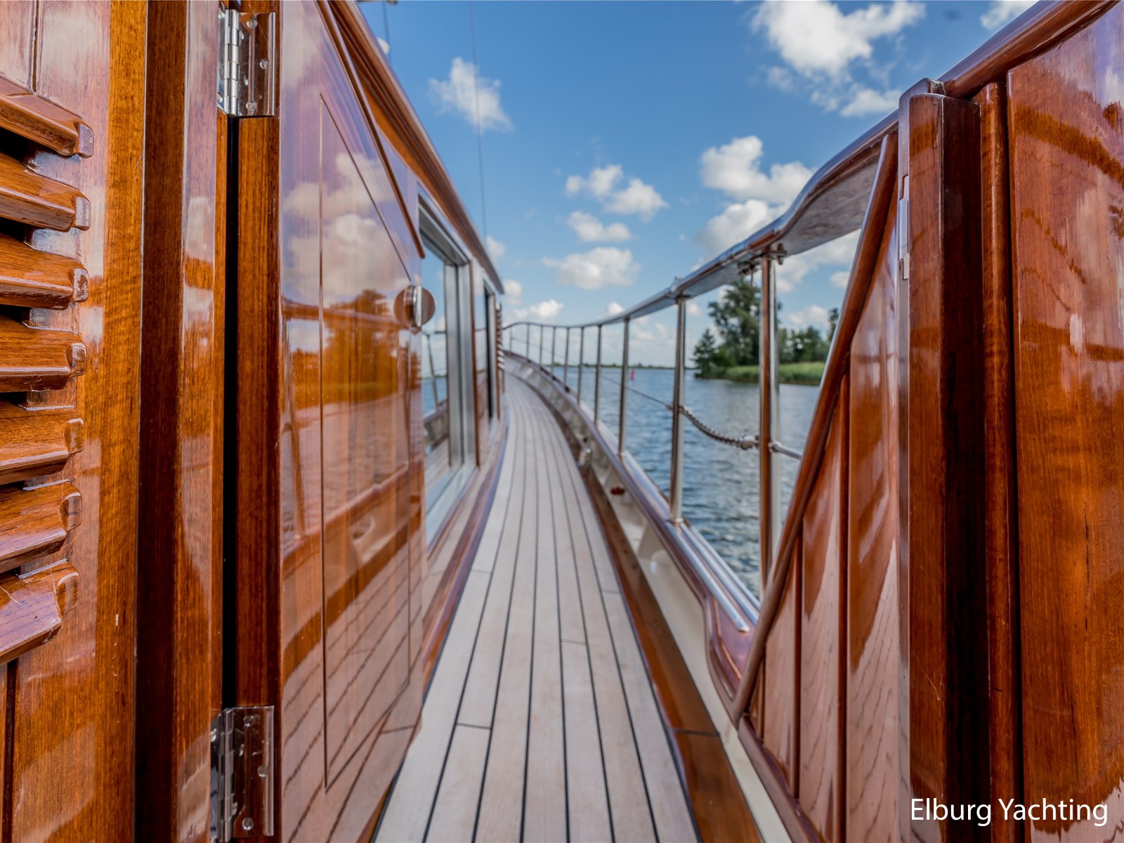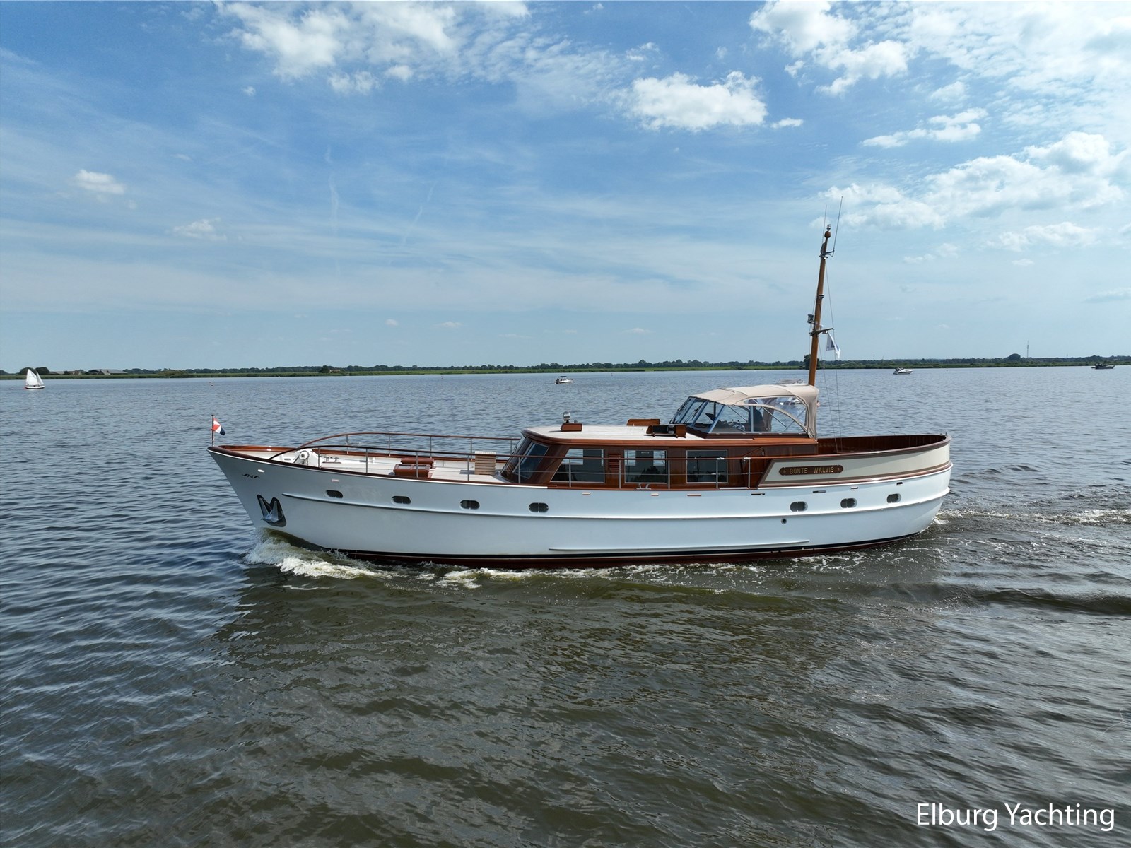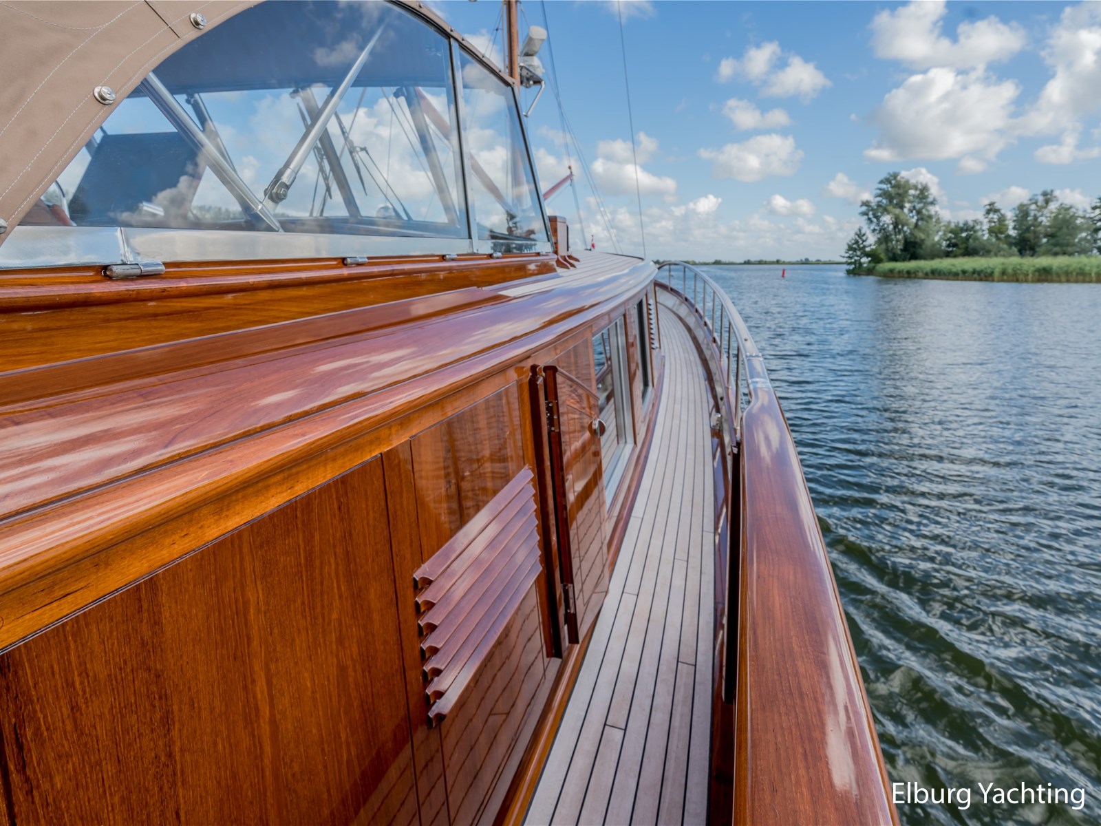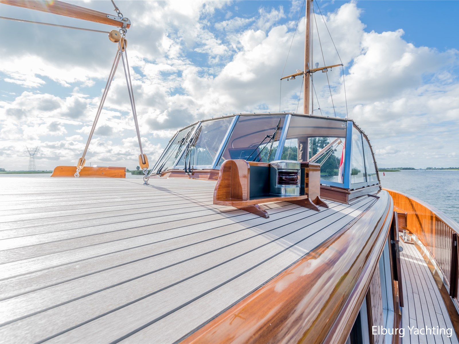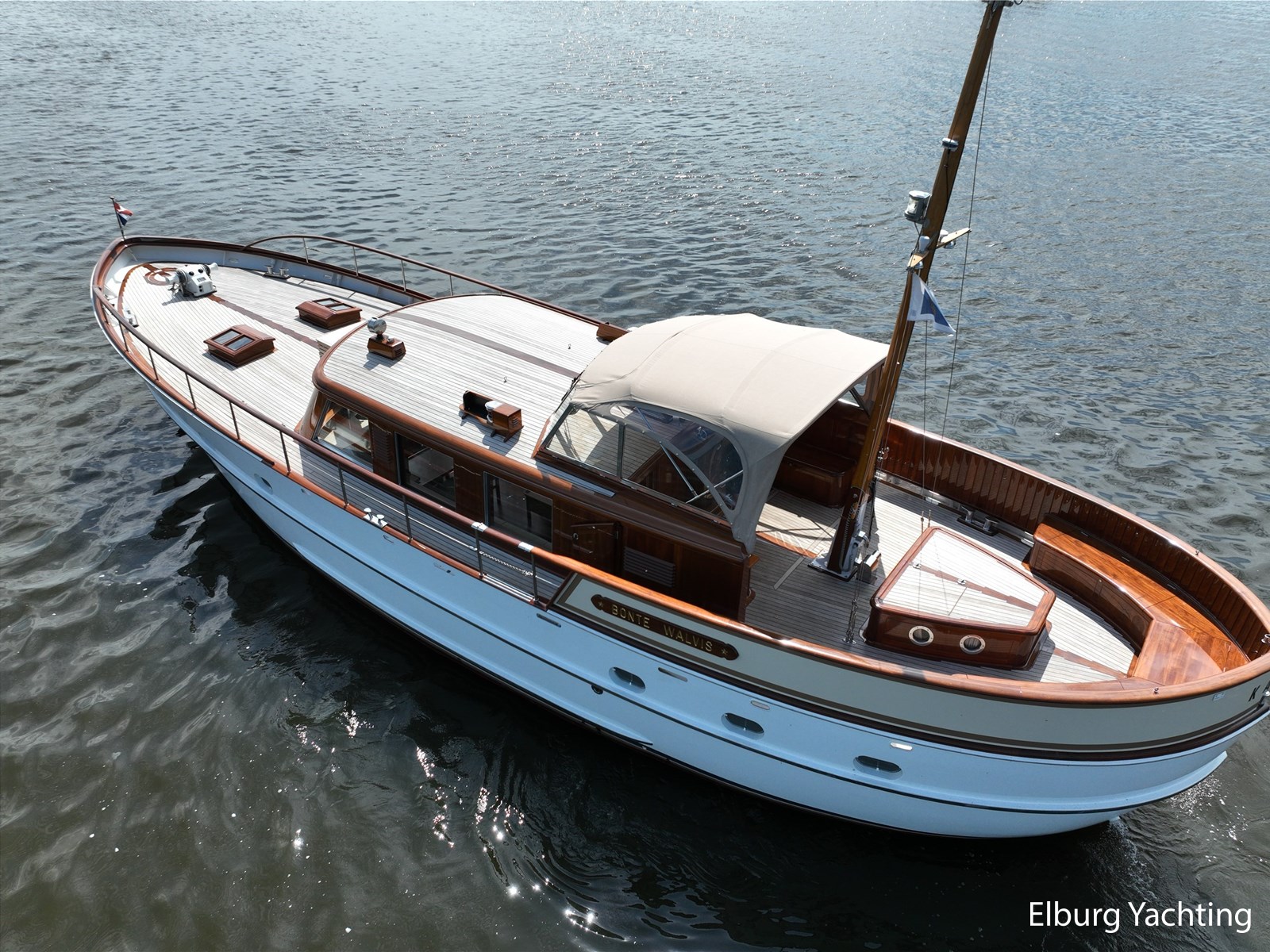 The Lunstroo 56 is a unique and one-of-a-kind piece of Dutch Craftsmanship, and a ture treasure to the long tradition of yachtbuilding that the Netherlands are known for. The vessel was launched in 1974, but has had a complete refit in 2015 at the Nicolaas Witsen yard, where no expense has been spared. The vessel has 2 x 135 hp new Perkins engines, which are known for their low revs and low noise level. During the refit, the following was carried out: New solid teak deck (22 mm), new teak cabin roof (15 mm), All varnished teak elements of the cabinroof superstructure are newly manufactured, chromed portholes, newly lined window frames, Entire electrical installation has been renewed incl. pumps and other equipment, new navigation equipment, new propeller shafts, propeller shaft bearings, thrust bearings and propellers. All tanks have been opened, cleaned and inspected. (Both diesel, water and waste water tanks.) Piping is measured by wall thickness. Hull newly painted in Awl Grip. All clear coat with impregnating resin and Double UV Coating from Dubbelcoat Van de IJssel. (with the exception of mast and boom), Morse engine control converted to electronic control, Kabola CV with hot water supply installed, new upholstery, new mattresses. The Lunstroo 56 has a lot of living space in the saloon and on the aft deck. It is a unique motor yacht with high-quality finish with modern comfort and new technology, suitable for a longer stay. stainless steel railing, stainless steel edge, spacious seating in the saloon, 7 berths, chrome windshield, rear entrance, 2 x escape hatch in the front, Miele washing machine, headroom approx. 2 meters, rear cabin suitable for crew cabin (including entrance engine room), well-insulated engine room. Stereo set BOSE Indoor and Outdoor (2015), Lowe TV + Lift (2015), CVO certificied, bilge alarm available in 3 zones. It's current owner has stored the front mast and added a winch for easy lowering of the back mast. In one of the front cabins one of the bunk beds was removed to create more space. Document description of the refit available on request. Clearance height with mast up approx. 8,40m and with folded mast and cockpit windows approx. 2,90m. Please Watch the Roundbilge Lunstroo 56 (Total Refit 2015) on YouTube: https://youtu.be/NfP3khQ4EaA For questions and / or to make an appointment, you are welcome at Elburg Yachting 7 days a week.