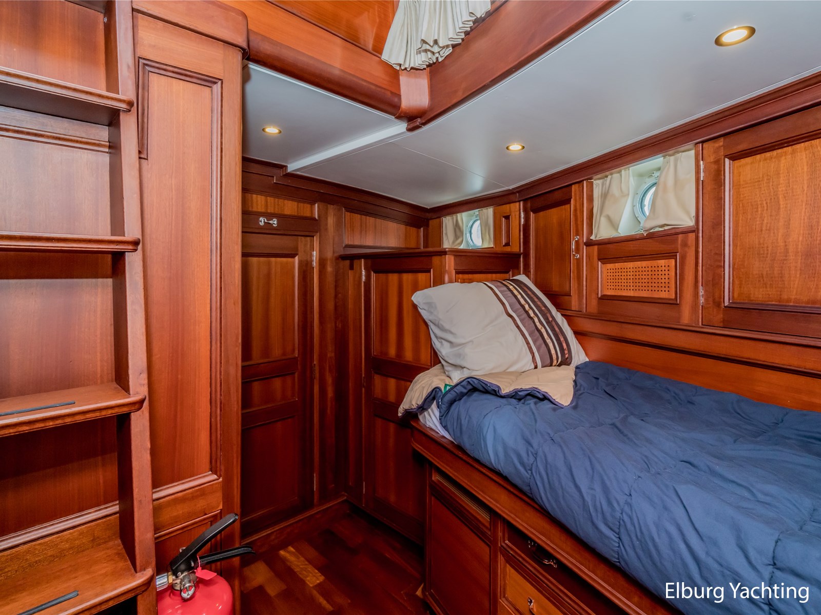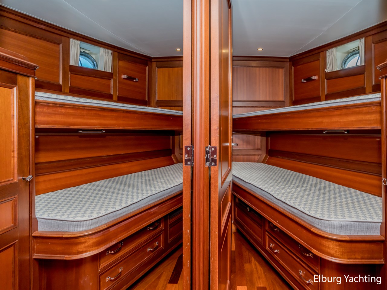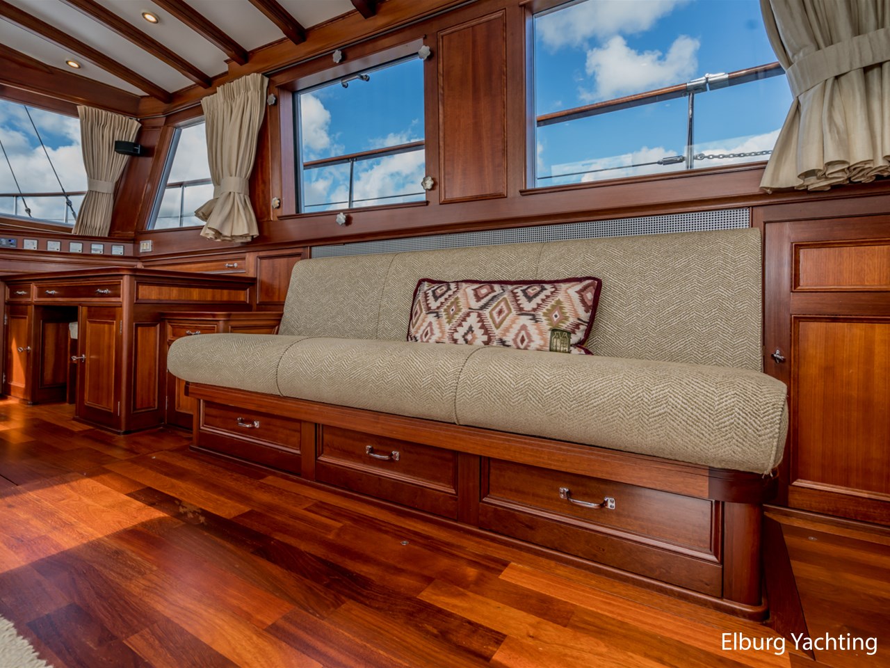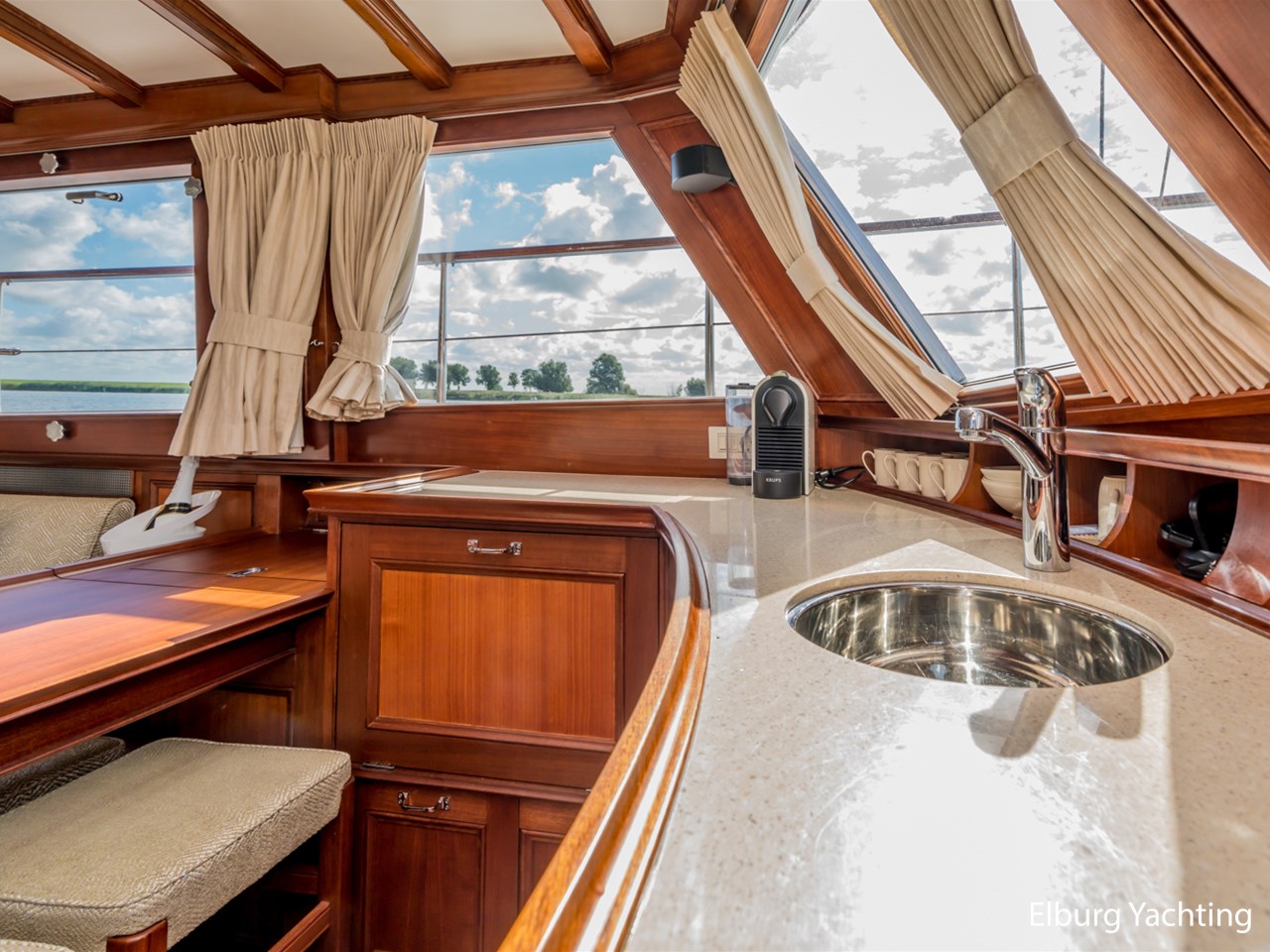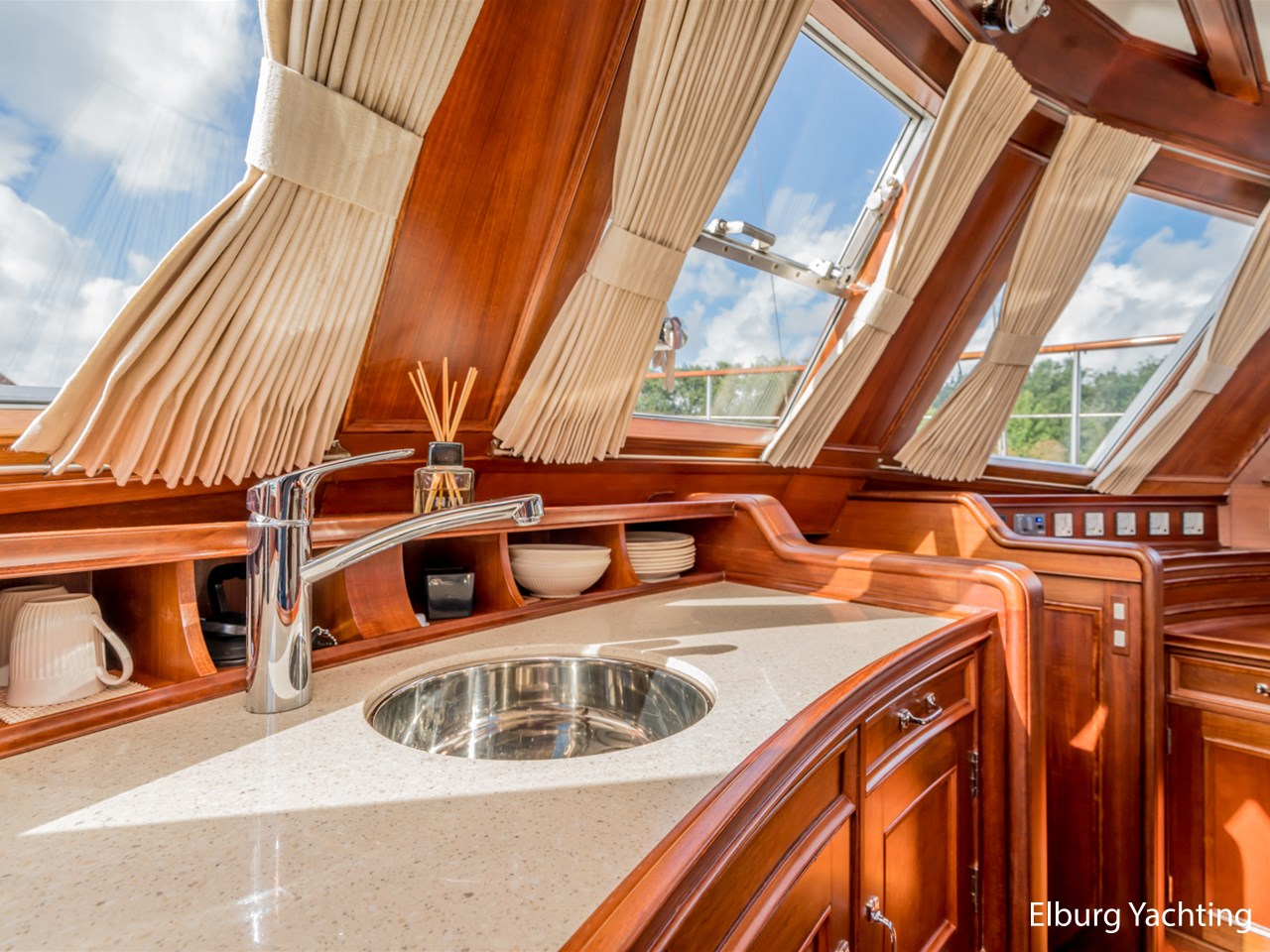 The Lunstroo 56 is a unique and one-of-a-kind piece of Dutch Craftsmanship, and a ture treasure to the long tradition of yachtbuilding that the Netherlands are known for. The vessel was launched in 1974, but has had a complete refit in 2015 at the Nicolaas Witsen yard, where no expense has been spared. The vessel has 2 x 135 hp new Perkins engines, which are known for their low revs and low noise level. During the refit, the following was carried out: New solid teak deck (22 mm), new teak cabin roof (15 mm), All varnished teak elements of the cabinroof superstructure are newly manufactured, chromed portholes, newly lined window frames, Entire electrical installation has been renewed incl. pumps and other equipment, new navigation equipment, new propeller shafts, propeller shaft bearings, thrust bearings and propellers. All tanks have been opened, cleaned and inspected. (Both diesel, water and waste water tanks.) Piping is measured by wall thickness. Hull newly painted in Awl Grip. All clear coat with impregnating resin and Double UV Coating from Dubbelcoat Van de IJssel. (with the exception of mast and boom), Morse engine control converted to electronic control, Kabola CV with hot water supply installed, new upholstery, new mattresses. The Lunstroo 56 has a lot of living space in the saloon and on the aft deck. It is a unique motor yacht with high-quality finish with modern comfort and new technology, suitable for a longer stay. stainless steel railing, stainless steel edge, spacious seating in the saloon, 7 berths, chrome windshield, rear entrance, 2 x escape hatch in the front, Miele washing machine, headroom approx. 2 meters, rear cabin suitable for crew cabin (including entrance engine room), well-insulated engine room. Stereo set BOSE Indoor and Outdoor (2015), Lowe TV + Lift (2015), CVO certificied, bilge alarm available in 3 zones. It's current owner has stored the front mast and added a winch for easy lowering of the back mast. In one of the front cabins one of the bunk beds was removed to create more space. Document description of the refit available on request. Clearance height with mast up approx. 8,40m and with folded mast and cockpit windows approx. 2,90m. Please Watch the Roundbilge Lunstroo 56 (Total Refit 2015) on YouTube: https://youtu.be/NfP3khQ4EaA For questions and / or to make an appointment, you are welcome at Elburg Yachting 7 days a week.