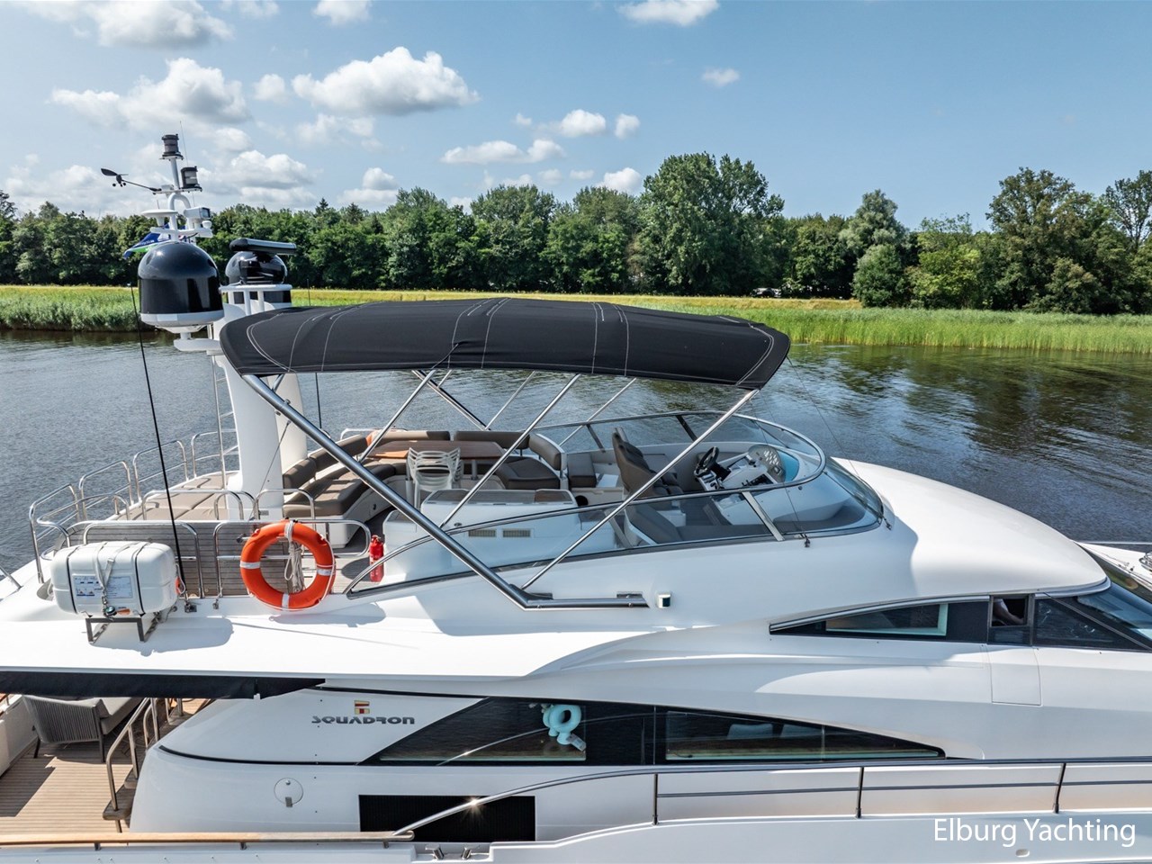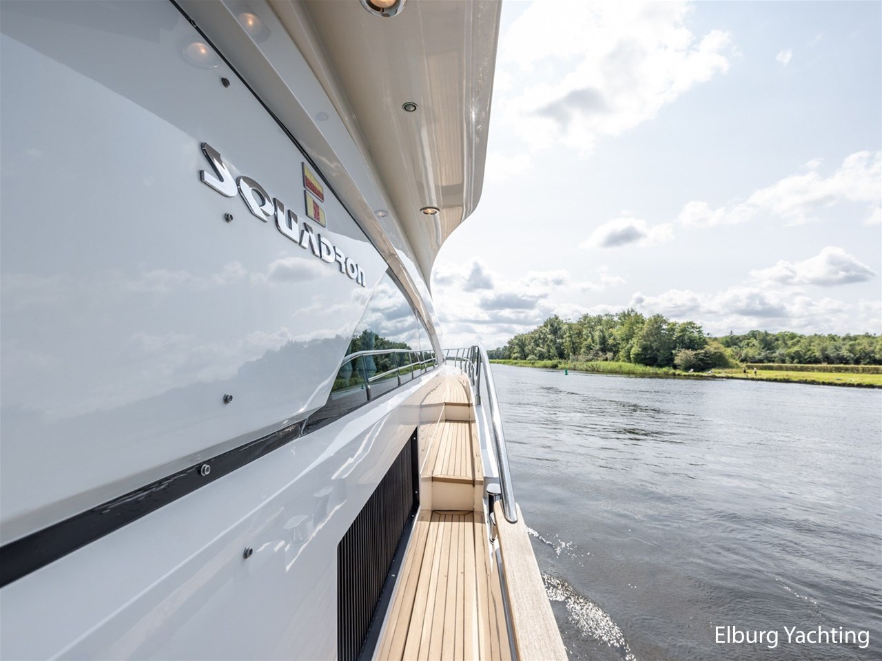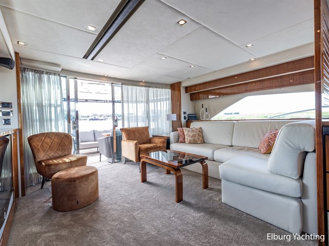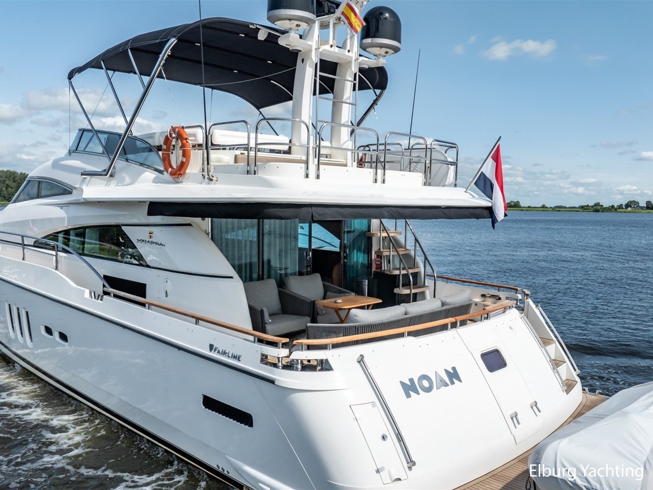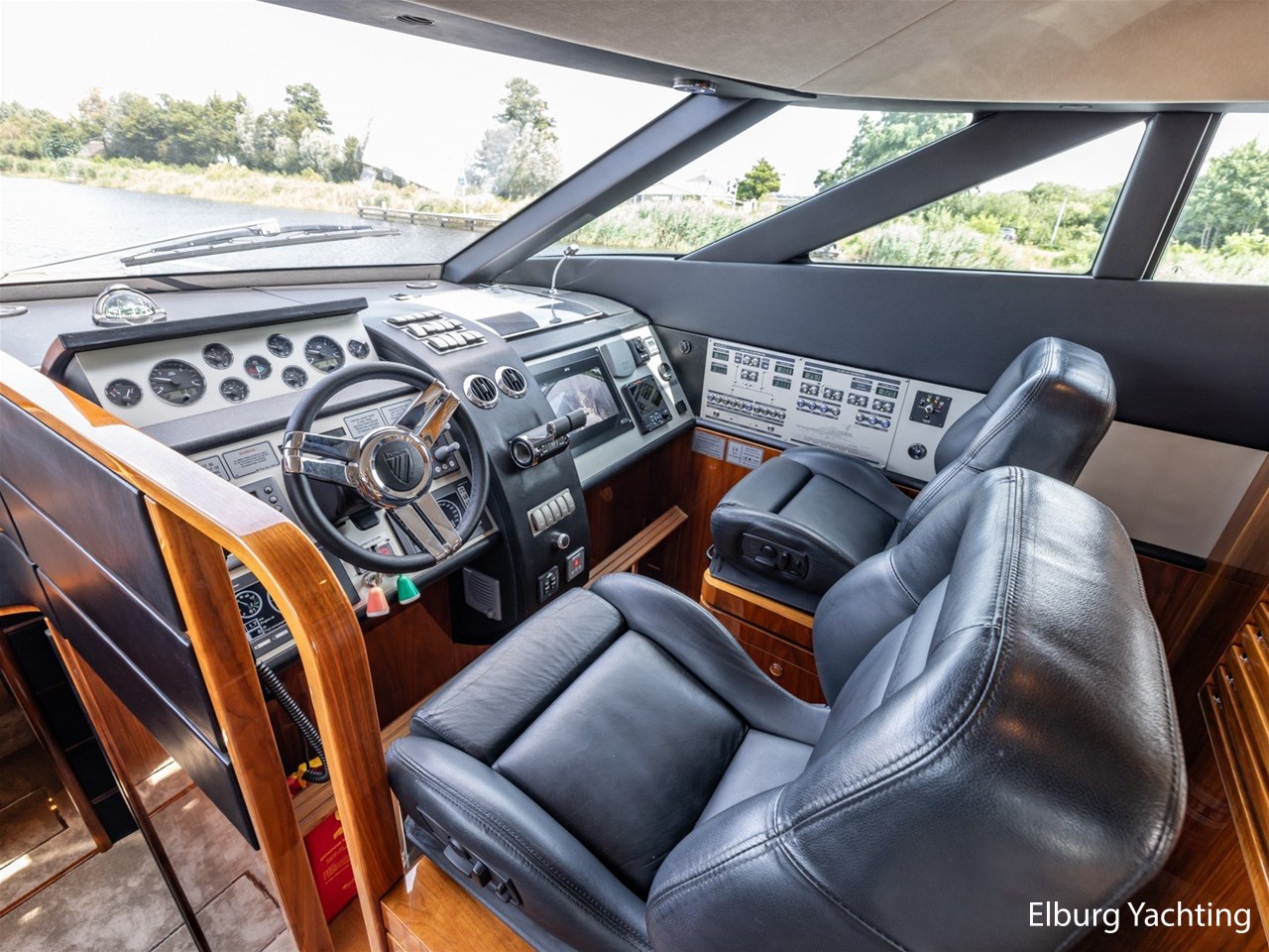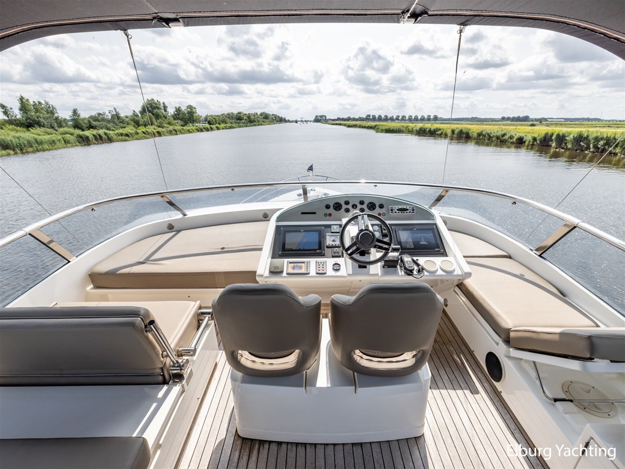 This Fairline Squadron 70 with flybridge is a sport, fast-going GRP built motor yacht. The yacht is very complete and has a luxurious high-quality finish. Recently in 2023/2024, the yacht has undergone a professional update in which the complete upholstery both inside and outside and the tent around the aft deck have been renewed, carpet in the interior has been renewed and the various wall panels have been reupholstered, synthetic permateak has been applied around the side and aft decks, new Raymarine navigation equipment has been installed, service has been carried out on both main engines and the generator. The Fairline has four spacious cabins, three of which have en-suite bathrooms and are all built to the highest standards. The owner's cabin is located amidships with beautiful windows on both sides for a great view on water level. In the aft ship there is a comfortable 2-person (crew) cabin with private bathroom. Luxurious and stylish interior. Spacious open cockpit with sliding door to the saloon, by opening the sliding door the interior space can be expanded even further. The open cockpit can be completely closed off by means of a tent with removable parts, so that the living space on board can be optimally used. The saloon has an L-shaped sofa with 2 lounge chairs and a 6-person dining table, Loewe TV on lift and drink bar. This Fairline Squadron 70 is equipped with walnut interior with high-gloss finish, electrically operated slats, alcantara ceilings, sun blinds around the saloon exterior windows. The yacht is equiped with a full bimini over the flybridge, exterior lighting, 'lazy' stairs to the flybridge, large sunbed on foredeck with foldable awning, dishwasher, Samsung washing machine (2023), Samsung dryer (2023), 2 x electric capstans on the aft deck, trim tabs, flybridge covers, removable shower on the bathing platform, underwater lighting, loose bench with two chairs on the aft deck, WiFi on board (SIM card not included), TVs with chromecast, Bose audio system in saloon, rear view camera via plotter, 2-person sunbed on the flybridge.