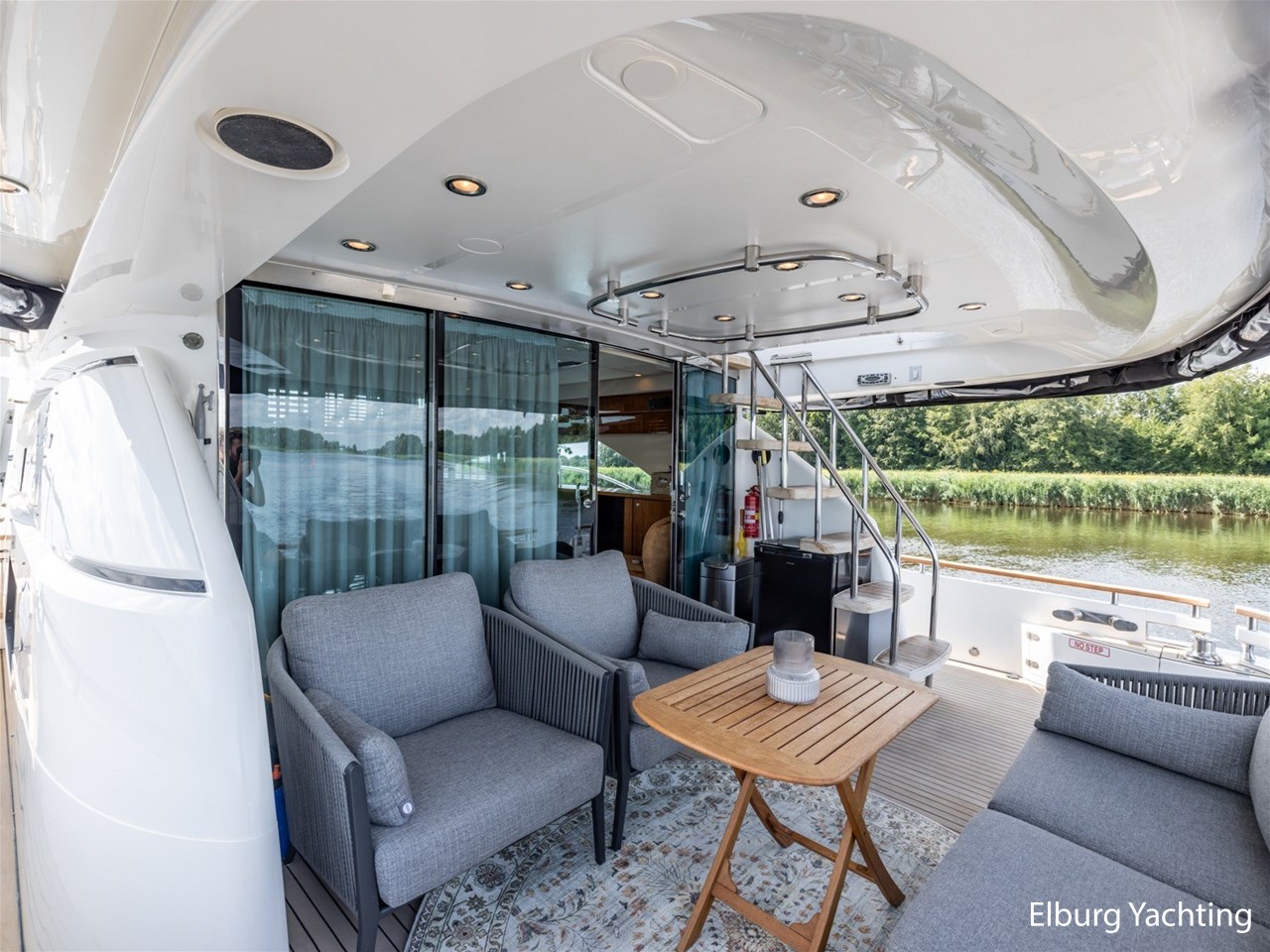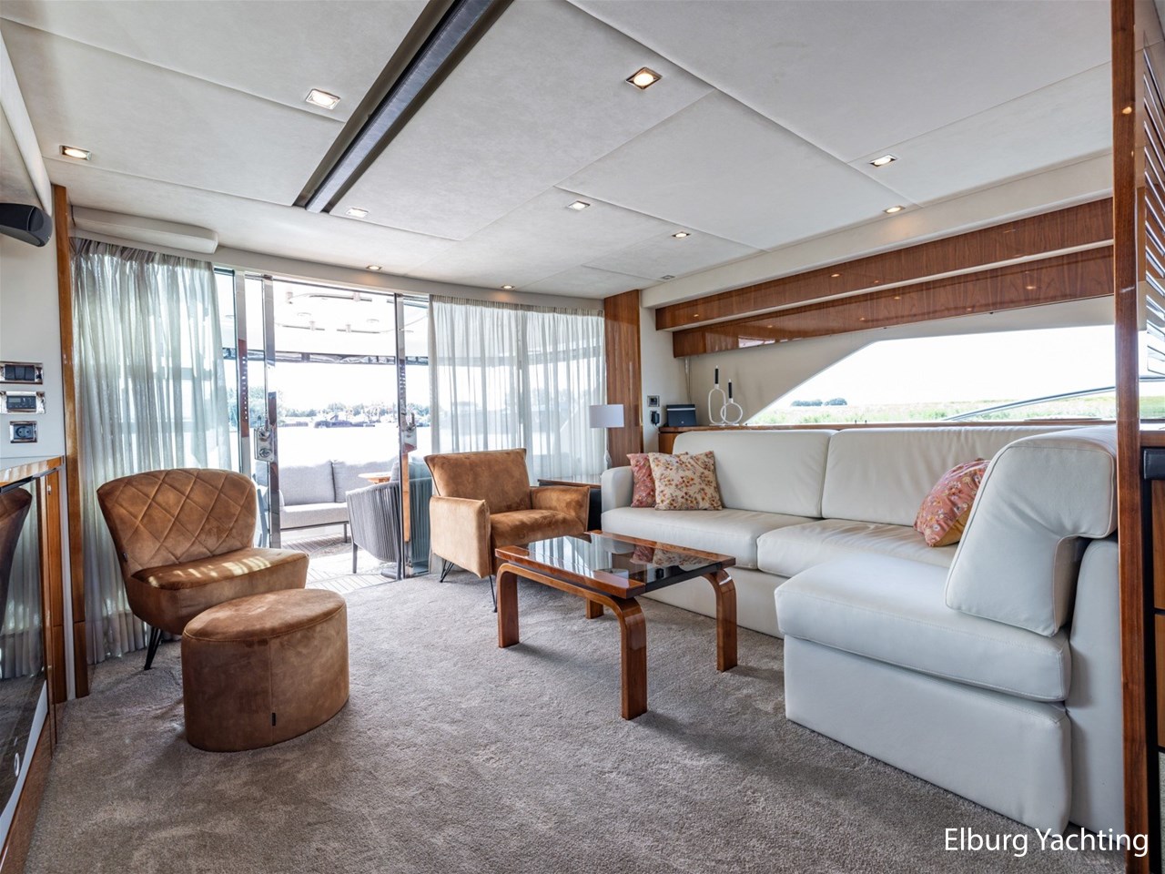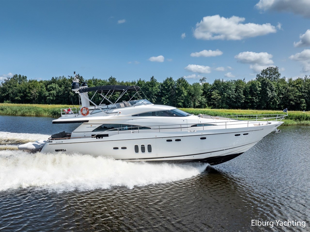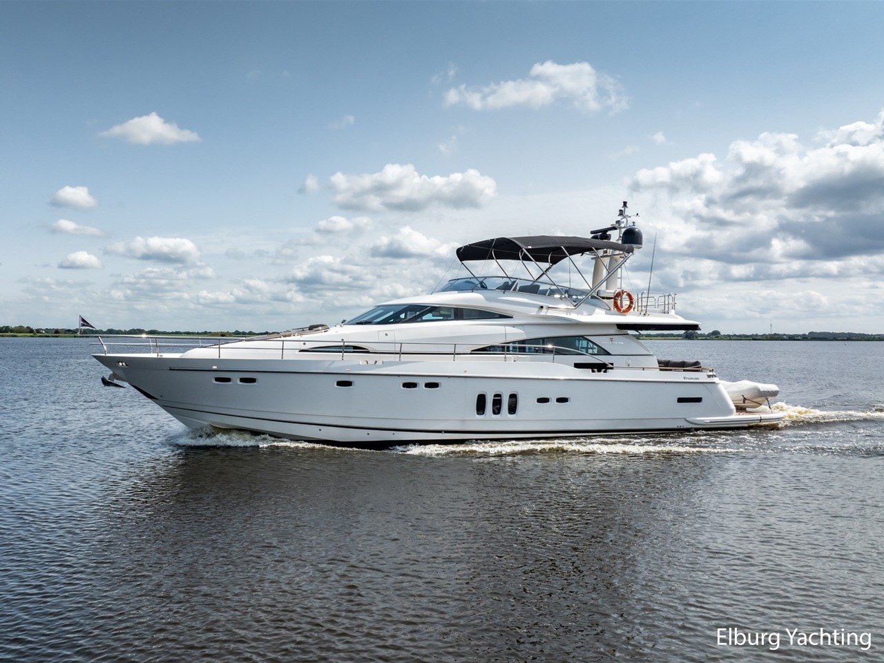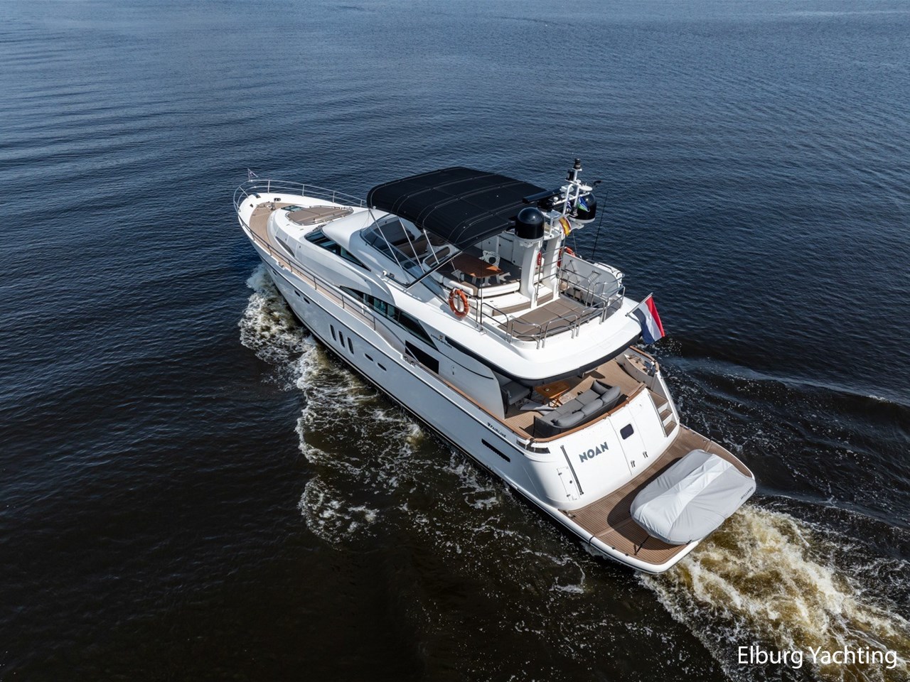 This Fairline Squadron 70 with flybridge is a sport, fast-going GRP built motor yacht. The yacht is very complete and has a luxurious high-quality finish. Recently in 2023/2024, the yacht has undergone a professional update in which the complete upholstery both inside and outside and the tent around the aft deck have been renewed, carpet in the interior has been renewed and the various wall panels have been reupholstered, synthetic permateak has been applied around the side and aft decks, new Raymarine navigation equipment has been installed, service has been carried out on both main engines and the generator. The Fairline has four spacious cabins, three of which have en-suite bathrooms and are all built to the highest standards. The owner's cabin is located amidships with beautiful windows on both sides for a great view on water level. In the aft ship there is a comfortable 2-person (crew) cabin with private bathroom. Luxurious and stylish interior. Spacious open cockpit with sliding door to the saloon, by opening the sliding door the interior space can be expanded even further. The open cockpit can be completely closed off by means of a tent with removable parts, so that the living space on board can be optimally used. The saloon has an L-shaped sofa with 2 lounge chairs and a 6-person dining table, Loewe TV on lift and drink bar. This Fairline Squadron 70 is equipped with walnut interior with high-gloss finish, electrically operated slats, alcantara ceilings, sun blinds around the saloon exterior windows. The yacht is equiped with a full bimini over the flybridge, exterior lighting, 'lazy' stairs to the flybridge, large sunbed on foredeck with foldable awning, dishwasher, Samsung washing machine (2023), Samsung dryer (2023), 2 x electric capstans on the aft deck, trim tabs, flybridge covers, removable shower on the bathing platform, underwater lighting, loose bench with two chairs on the aft deck, WiFi on board (SIM card not included), TVs with chromecast, Bose audio system in saloon, rear view camera via plotter, 2-person sunbed on the flybridge.