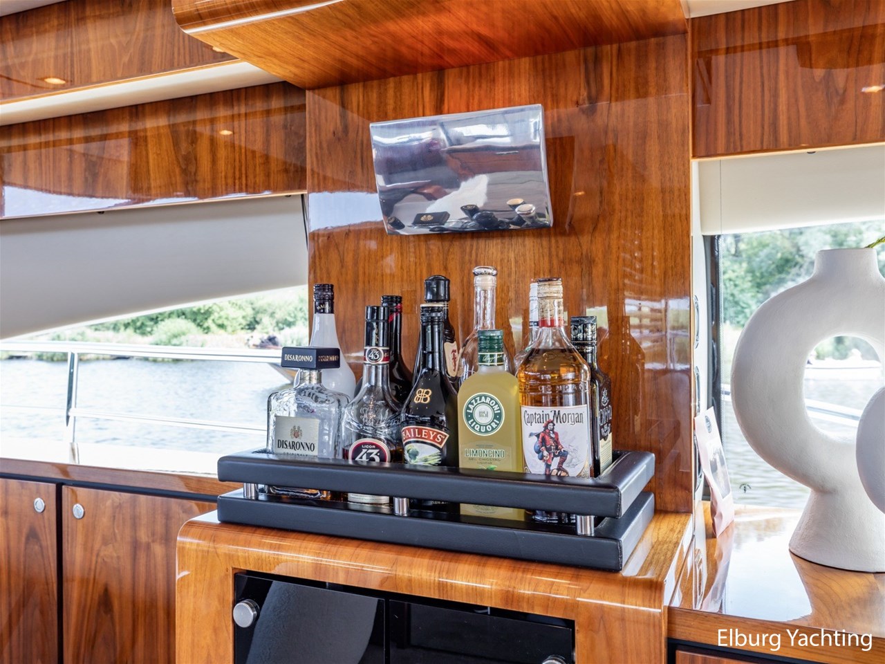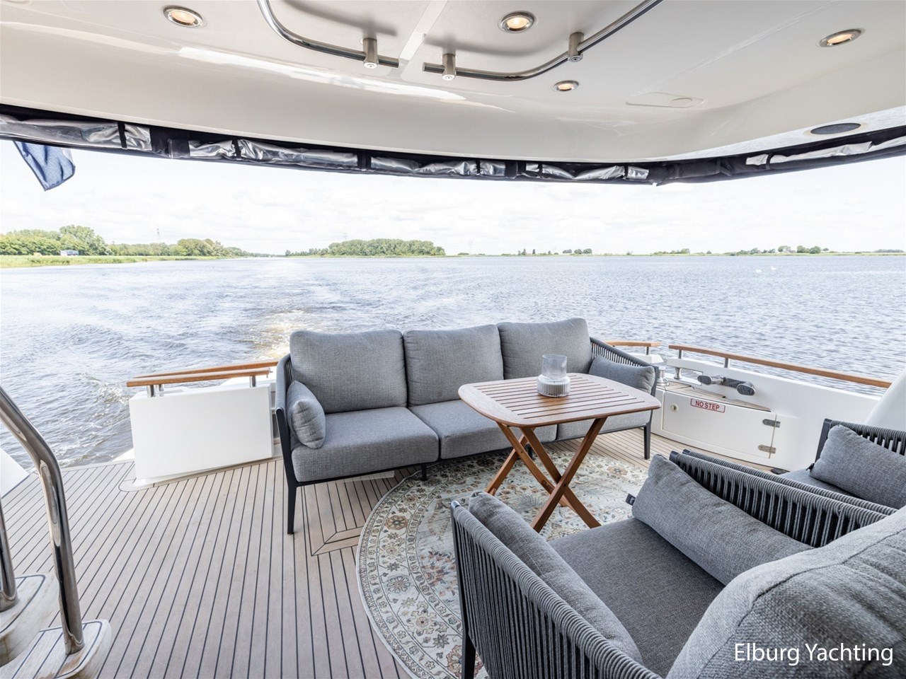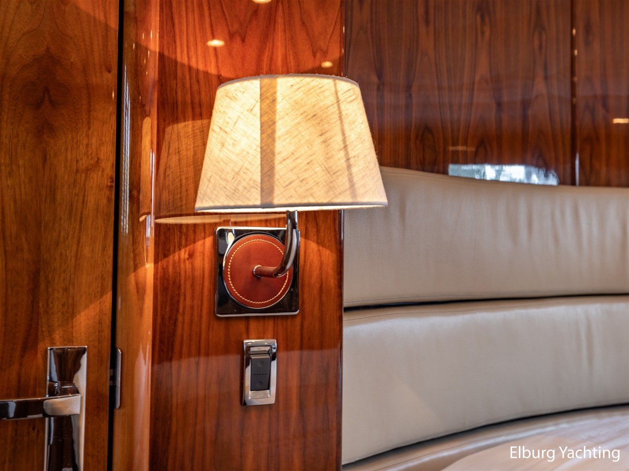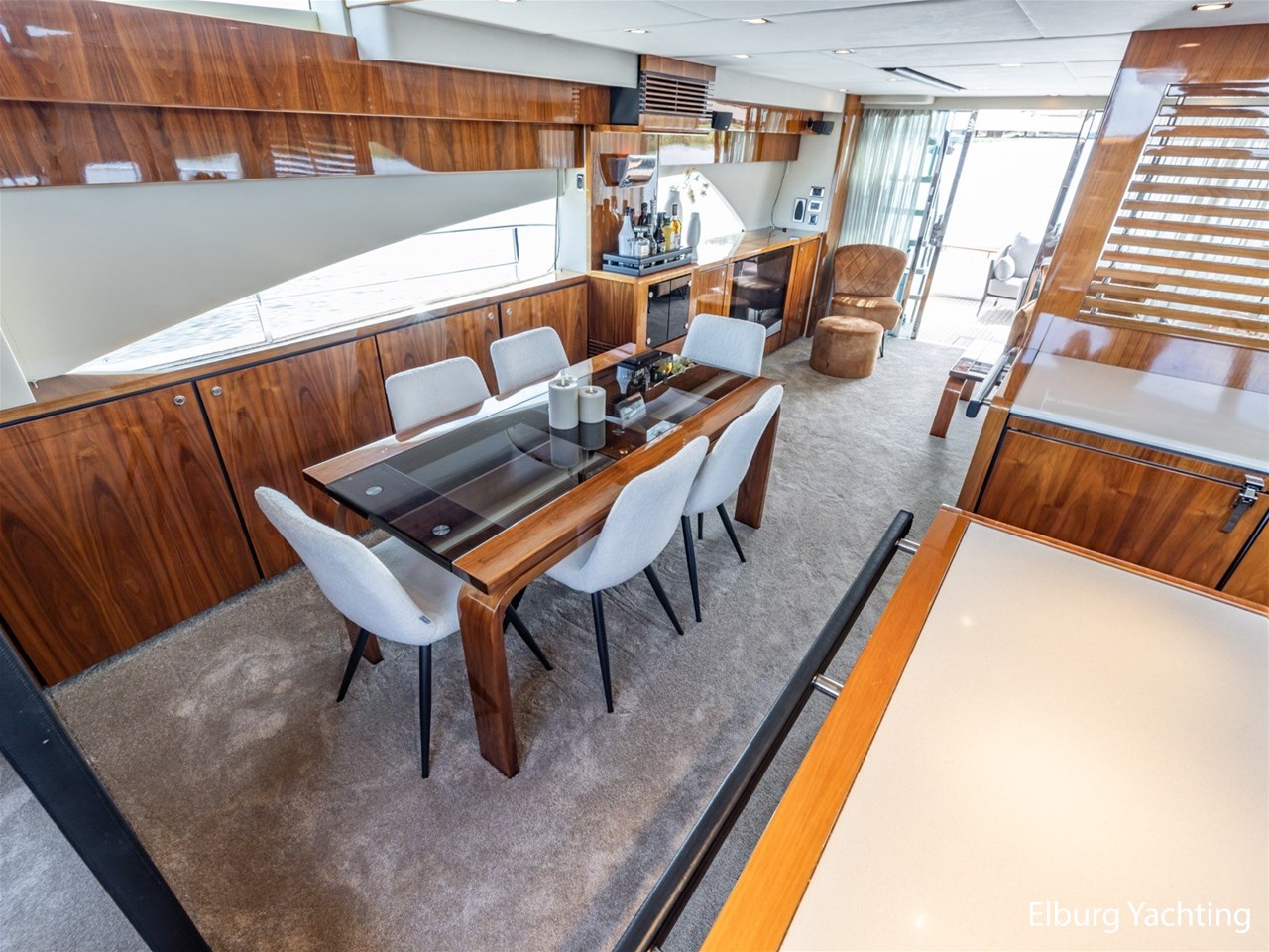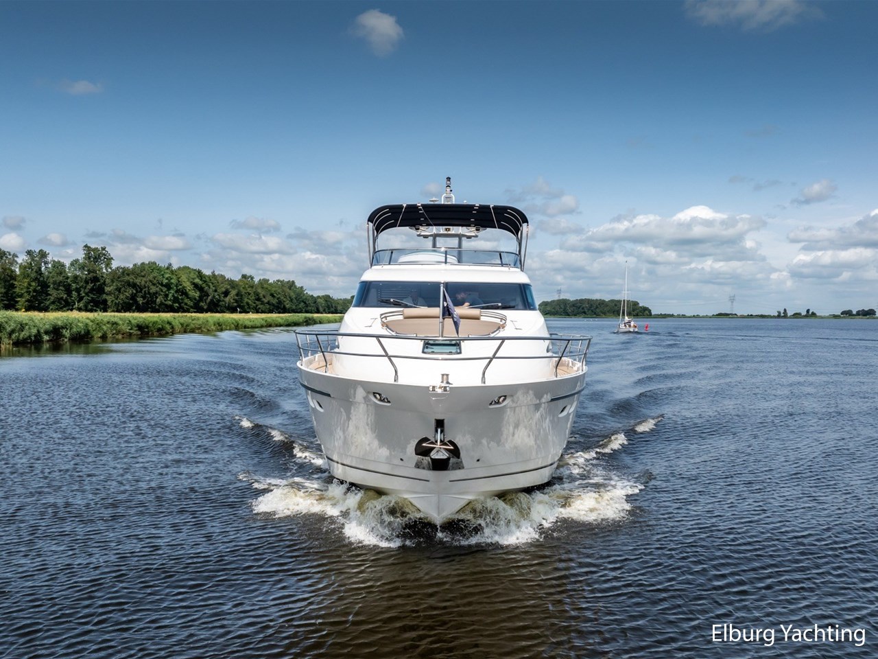 This Fairline Squadron 70 with flybridge is a sport, fast-going GRP built motor yacht. The yacht is very complete and has a luxurious high-quality finish. Recently in 2023/2024, the yacht has undergone a professional update in which the complete upholstery both inside and outside and the tent around the aft deck have been renewed, carpet in the interior has been renewed and the various wall panels have been reupholstered, synthetic permateak has been applied around the side and aft decks, new Raymarine navigation equipment has been installed, service has been carried out on both main engines and the generator. The Fairline has four spacious cabins, three of which have en-suite bathrooms and are all built to the highest standards. The owner's cabin is located amidships with beautiful windows on both sides for a great view on water level. In the aft ship there is a comfortable 2-person (crew) cabin with private bathroom. Luxurious and stylish interior. Spacious open cockpit with sliding door to the saloon, by opening the sliding door the interior space can be expanded even further. The open cockpit can be completely closed off by means of a tent with removable parts, so that the living space on board can be optimally used. The saloon has an L-shaped sofa with 2 lounge chairs and a 6-person dining table, Loewe TV on lift and drink bar. This Fairline Squadron 70 is equipped with walnut interior with high-gloss finish, electrically operated slats, alcantara ceilings, sun blinds around the saloon exterior windows. The yacht is equiped with a full bimini over the flybridge, exterior lighting, 'lazy' stairs to the flybridge, large sunbed on foredeck with foldable awning, dishwasher, Samsung washing machine (2023), Samsung dryer (2023), 2 x electric capstans on the aft deck, trim tabs, flybridge covers, removable shower on the bathing platform, underwater lighting, loose bench with two chairs on the aft deck, WiFi on board (SIM card not included), TVs with chromecast, Bose audio system in saloon, rear view camera via plotter, 2-person sunbed on the flybridge.