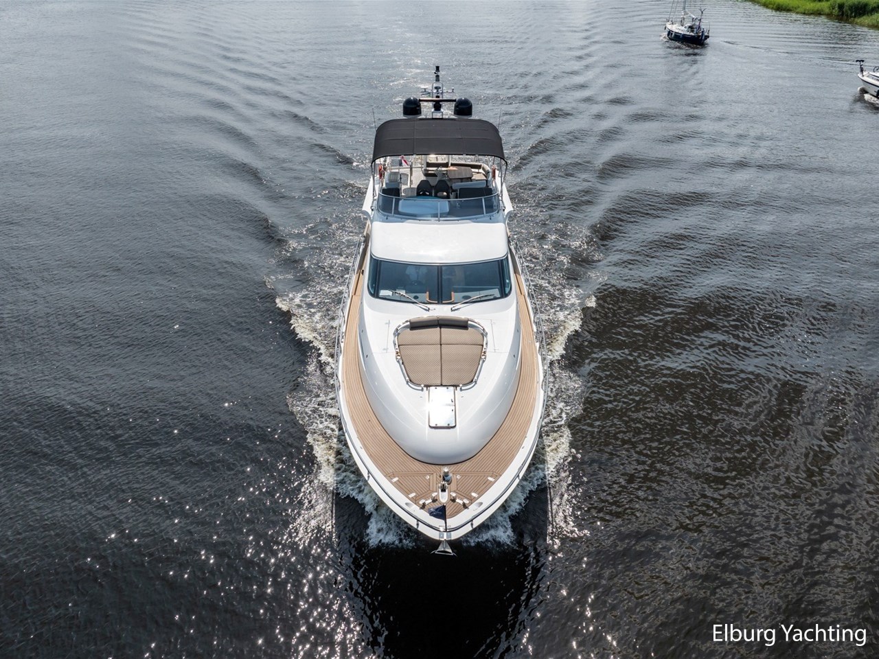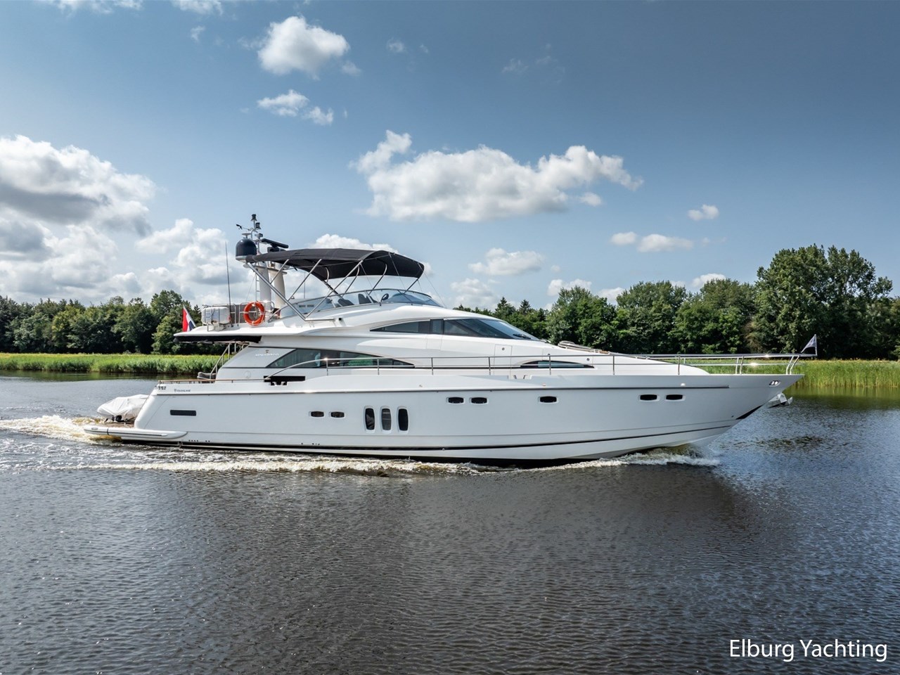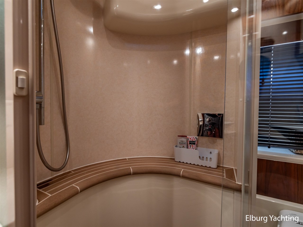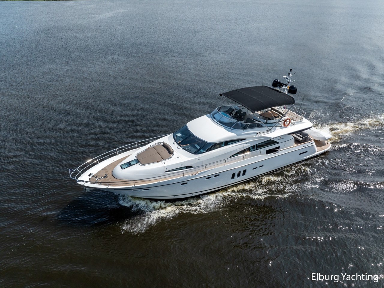 This Fairline Squadron 70 with flybridge is a sport, fast-going GRP built motor yacht. The yacht is very complete and has a luxurious high-quality finish. Recently in 2023/2024, the yacht has undergone a professional update in which the complete upholstery both inside and outside and the tent around the aft deck have been renewed, carpet in the interior has been renewed and the various wall panels have been reupholstered, synthetic permateak has been applied around the side and aft decks, new Raymarine navigation equipment has been installed, service has been carried out on both main engines and the generator. The Fairline has four spacious cabins, three of which have en-suite bathrooms and are all built to the highest standards. The owner's cabin is located amidships with beautiful windows on both sides for a great view on water level. In the aft ship there is a comfortable 2-person (crew) cabin with private bathroom. Luxurious and stylish interior. Spacious open cockpit with sliding door to the saloon, by opening the sliding door the interior space can be expanded even further. The open cockpit can be completely closed off by means of a tent with removable parts, so that the living space on board can be optimally used. The saloon has an L-shaped sofa with 2 lounge chairs and a 6-person dining table, Loewe TV on lift and drink bar. This Fairline Squadron 70 is equipped with walnut interior with high-gloss finish, electrically operated slats, alcantara ceilings, sun blinds around the saloon exterior windows. The yacht is equiped with a full bimini over the flybridge, exterior lighting, 'lazy' stairs to the flybridge, large sunbed on foredeck with foldable awning, dishwasher, Samsung washing machine (2023), Samsung dryer (2023), 2 x electric capstans on the aft deck, trim tabs, flybridge covers, removable shower on the bathing platform, underwater lighting, loose bench with two chairs on the aft deck, WiFi on board (SIM card not included), TVs with chromecast, Bose audio system in saloon, rear view camera via plotter, 2-person sunbed on the flybridge.