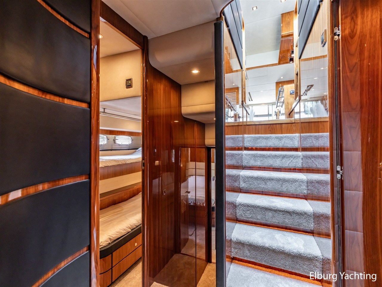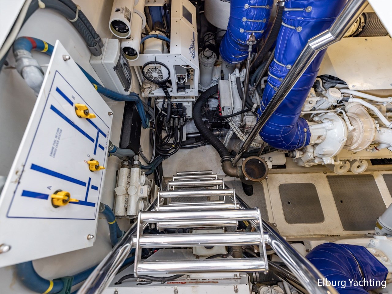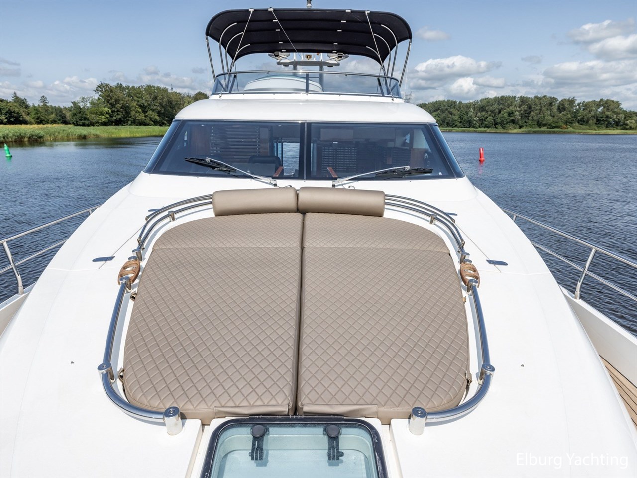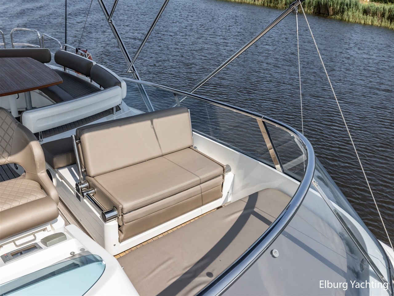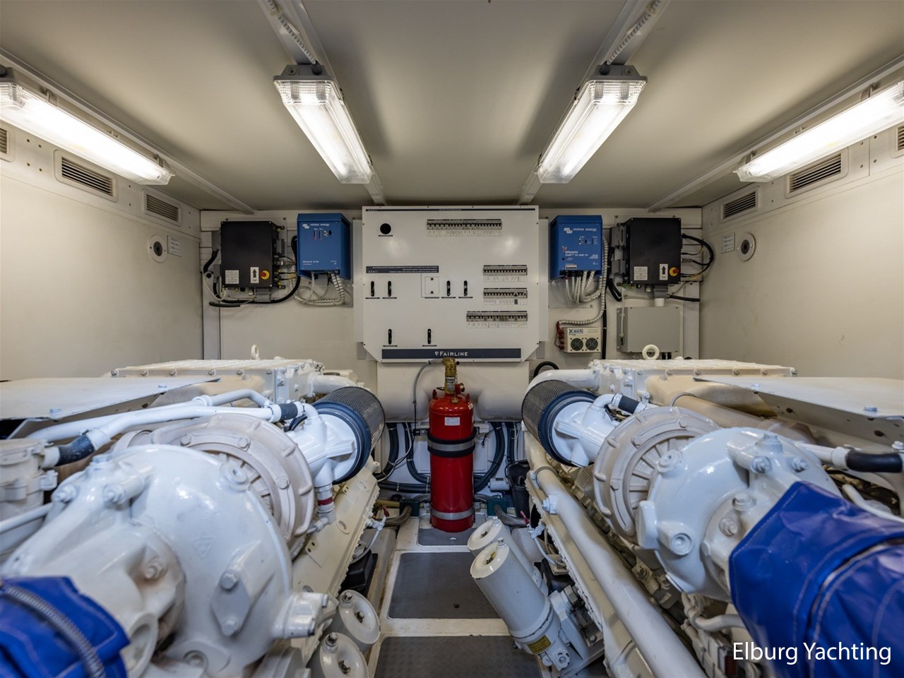 This Fairline Squadron 70 with flybridge is a sport, fast-going GRP built motor yacht. The yacht is very complete and has a luxurious high-quality finish. Recently in 2023/2024, the yacht has undergone a professional update in which the complete upholstery both inside and outside and the tent around the aft deck have been renewed, carpet in the interior has been renewed and the various wall panels have been reupholstered, synthetic permateak has been applied around the side and aft decks, new Raymarine navigation equipment has been installed, service has been carried out on both main engines and the generator. The Fairline has four spacious cabins, three of which have en-suite bathrooms and are all built to the highest standards. The owner's cabin is located amidships with beautiful windows on both sides for a great view on water level. In the aft ship there is a comfortable 2-person (crew) cabin with private bathroom. Luxurious and stylish interior. Spacious open cockpit with sliding door to the saloon, by opening the sliding door the interior space can be expanded even further. The open cockpit can be completely closed off by means of a tent with removable parts, so that the living space on board can be optimally used. The saloon has an L-shaped sofa with 2 lounge chairs and a 6-person dining table, Loewe TV on lift and drink bar. This Fairline Squadron 70 is equipped with walnut interior with high-gloss finish, electrically operated slats, alcantara ceilings, sun blinds around the saloon exterior windows. The yacht is equiped with a full bimini over the flybridge, exterior lighting, 'lazy' stairs to the flybridge, large sunbed on foredeck with foldable awning, dishwasher, Samsung washing machine (2023), Samsung dryer (2023), 2 x electric capstans on the aft deck, trim tabs, flybridge covers, removable shower on the bathing platform, underwater lighting, loose bench with two chairs on the aft deck, WiFi on board (SIM card not included), TVs with chromecast, Bose audio system in saloon, rear view camera via plotter, 2-person sunbed on the flybridge.