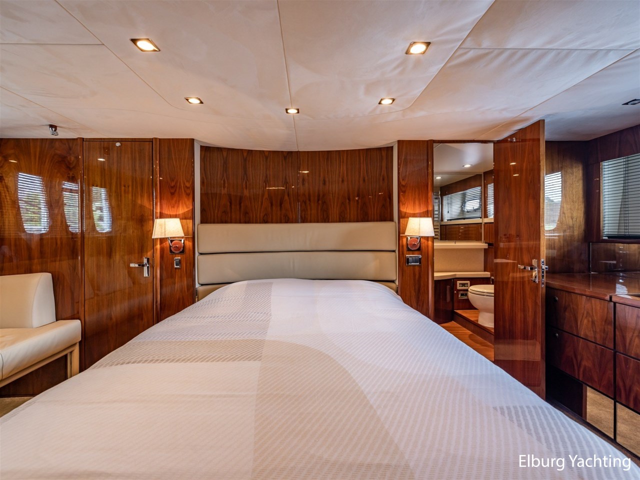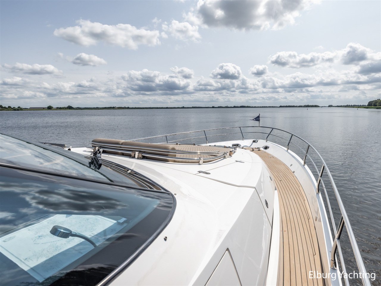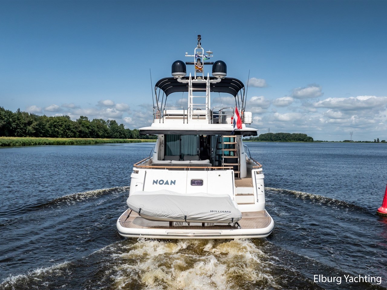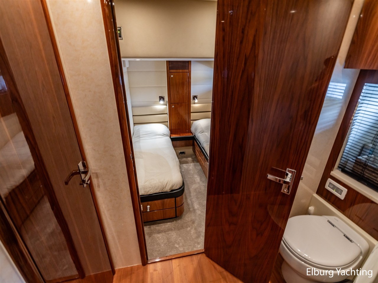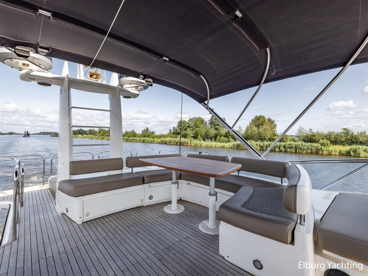 This Fairline Squadron 70 with flybridge is a sport, fast-going GRP built motor yacht. The yacht is very complete and has a luxurious high-quality finish. Recently in 2023/2024, the yacht has undergone a professional update in which the complete upholstery both inside and outside and the tent around the aft deck have been renewed, carpet in the interior has been renewed and the various wall panels have been reupholstered, synthetic permateak has been applied around the side and aft decks, new Raymarine navigation equipment has been installed, service has been carried out on both main engines and the generator. The Fairline has four spacious cabins, three of which have en-suite bathrooms and are all built to the highest standards. The owner's cabin is located amidships with beautiful windows on both sides for a great view on water level. In the aft ship there is a comfortable 2-person (crew) cabin with private bathroom. Luxurious and stylish interior. Spacious open cockpit with sliding door to the saloon, by opening the sliding door the interior space can be expanded even further. The open cockpit can be completely closed off by means of a tent with removable parts, so that the living space on board can be optimally used. The saloon has an L-shaped sofa with 2 lounge chairs and a 6-person dining table, Loewe TV on lift and drink bar. This Fairline Squadron 70 is equipped with walnut interior with high-gloss finish, electrically operated slats, alcantara ceilings, sun blinds around the saloon exterior windows. The yacht is equiped with a full bimini over the flybridge, exterior lighting, 'lazy' stairs to the flybridge, large sunbed on foredeck with foldable awning, dishwasher, Samsung washing machine (2023), Samsung dryer (2023), 2 x electric capstans on the aft deck, trim tabs, flybridge covers, removable shower on the bathing platform, underwater lighting, loose bench with two chairs on the aft deck, WiFi on board (SIM card not included), TVs with chromecast, Bose audio system in saloon, rear view camera via plotter, 2-person sunbed on the flybridge.