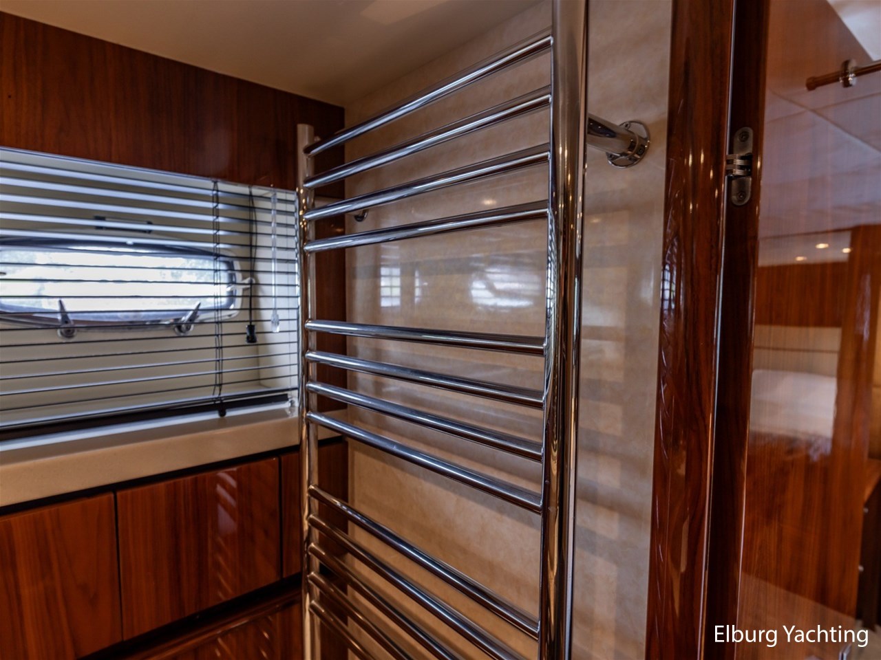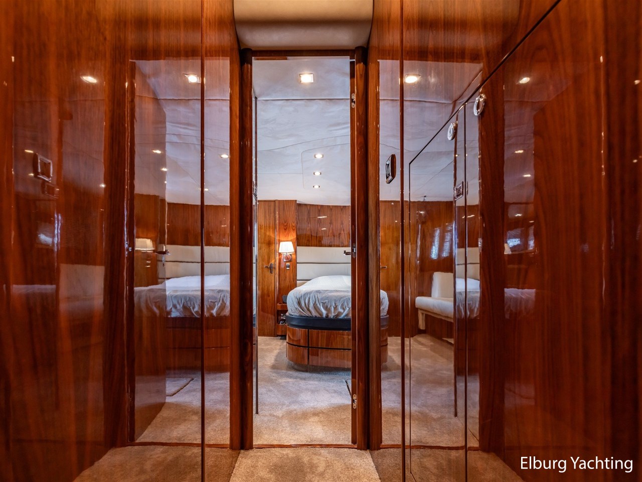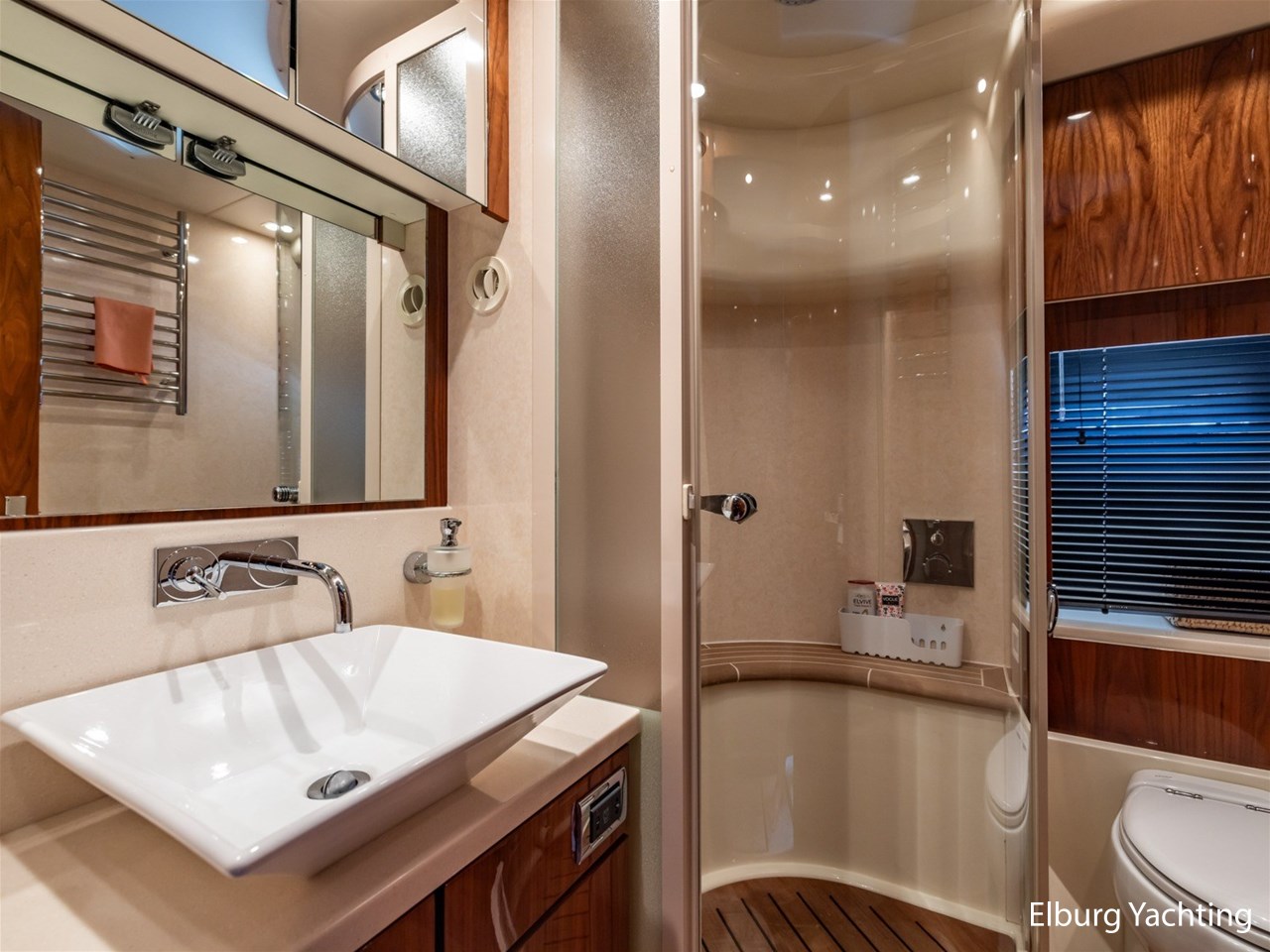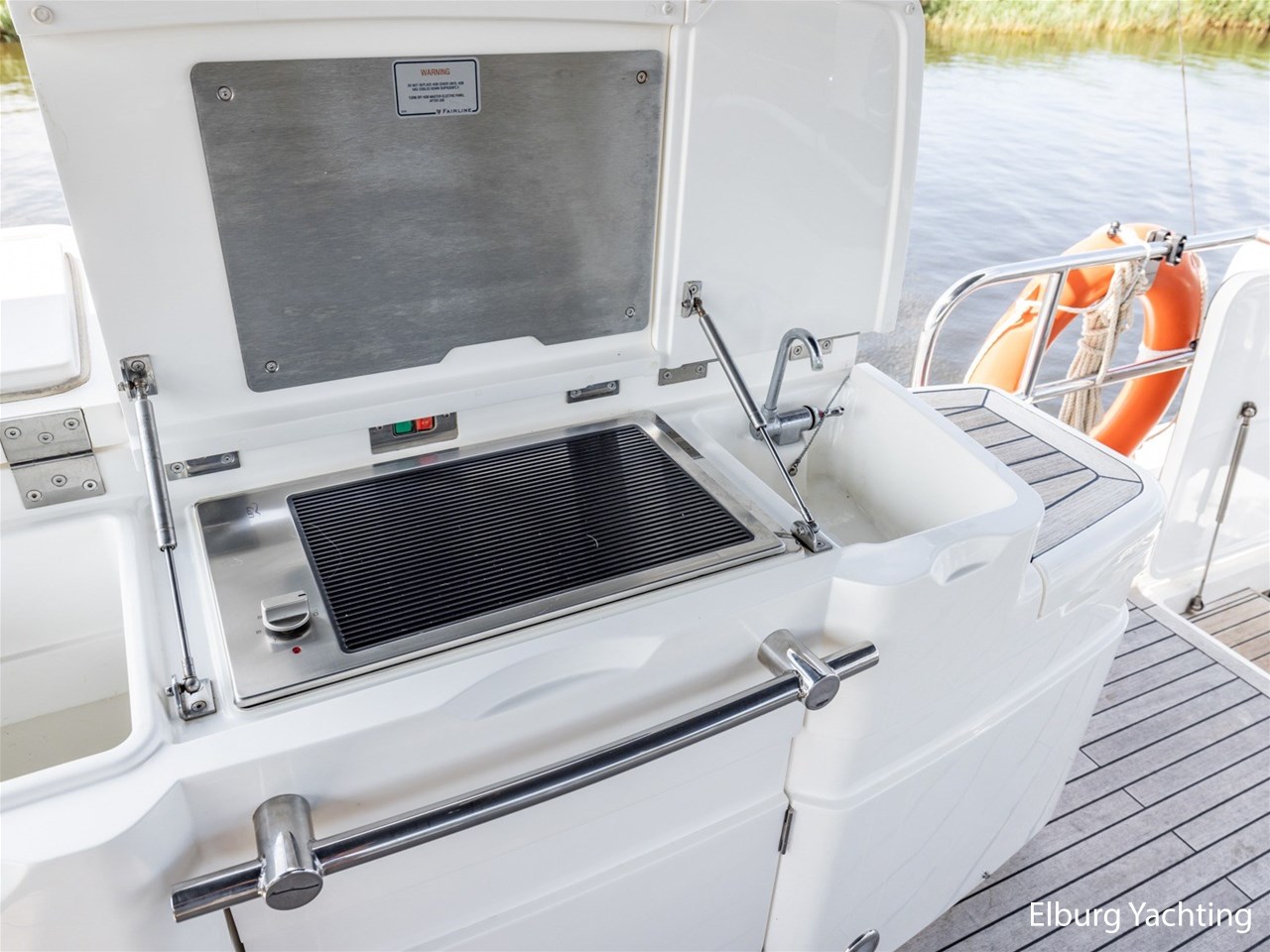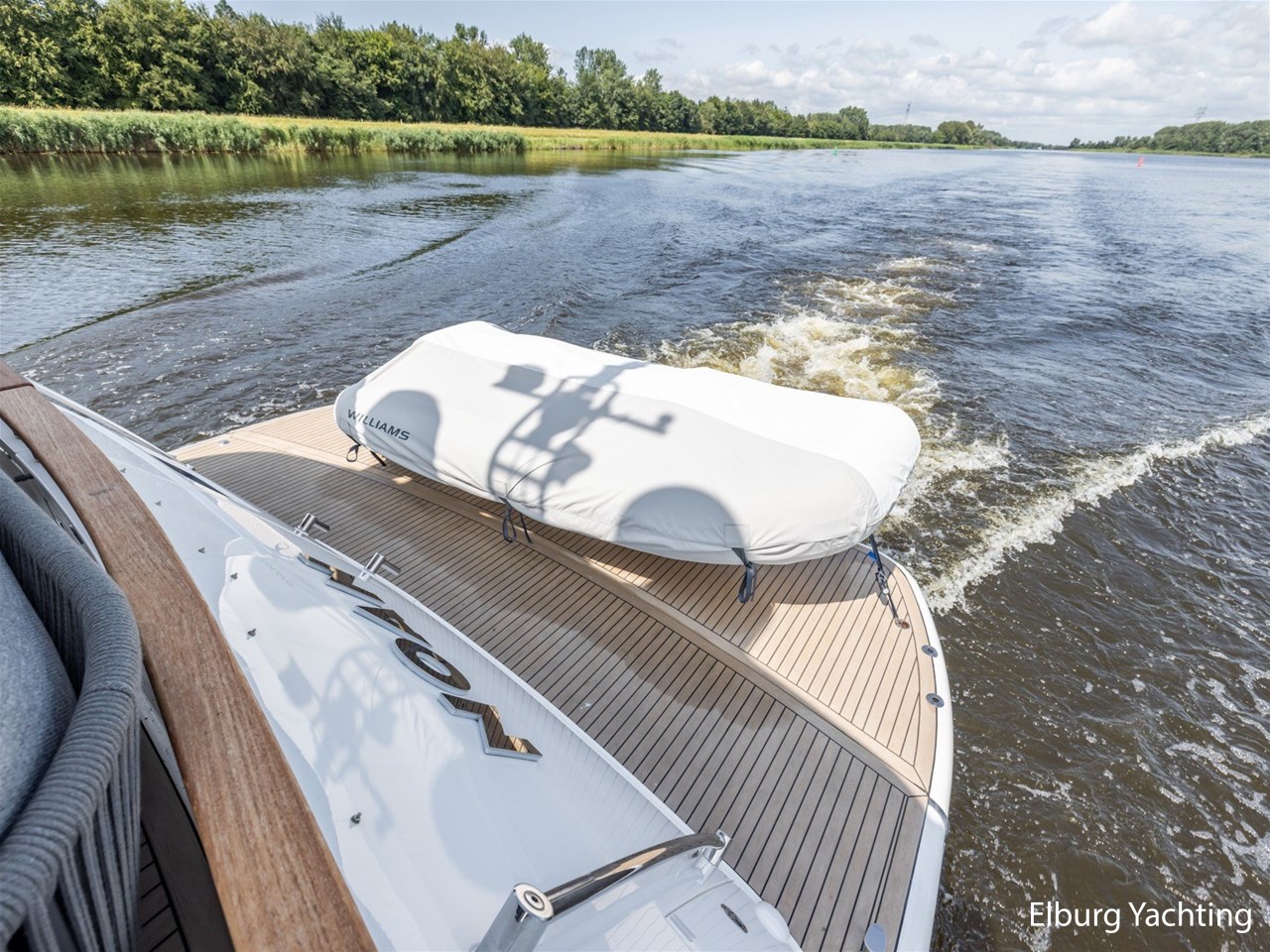 This Fairline Squadron 70 with flybridge is a sport, fast-going GRP built motor yacht. The yacht is very complete and has a luxurious high-quality finish. Recently in 2023/2024, the yacht has undergone a professional update in which the complete upholstery both inside and outside and the tent around the aft deck have been renewed, carpet in the interior has been renewed and the various wall panels have been reupholstered, synthetic permateak has been applied around the side and aft decks, new Raymarine navigation equipment has been installed, service has been carried out on both main engines and the generator. The Fairline has four spacious cabins, three of which have en-suite bathrooms and are all built to the highest standards. The owner's cabin is located amidships with beautiful windows on both sides for a great view on water level. In the aft ship there is a comfortable 2-person (crew) cabin with private bathroom. Luxurious and stylish interior. Spacious open cockpit with sliding door to the saloon, by opening the sliding door the interior space can be expanded even further. The open cockpit can be completely closed off by means of a tent with removable parts, so that the living space on board can be optimally used. The saloon has an L-shaped sofa with 2 lounge chairs and a 6-person dining table, Loewe TV on lift and drink bar. This Fairline Squadron 70 is equipped with walnut interior with high-gloss finish, electrically operated slats, alcantara ceilings, sun blinds around the saloon exterior windows. The yacht is equiped with a full bimini over the flybridge, exterior lighting, 'lazy' stairs to the flybridge, large sunbed on foredeck with foldable awning, dishwasher, Samsung washing machine (2023), Samsung dryer (2023), 2 x electric capstans on the aft deck, trim tabs, flybridge covers, removable shower on the bathing platform, underwater lighting, loose bench with two chairs on the aft deck, WiFi on board (SIM card not included), TVs with chromecast, Bose audio system in saloon, rear view camera via plotter, 2-person sunbed on the flybridge.