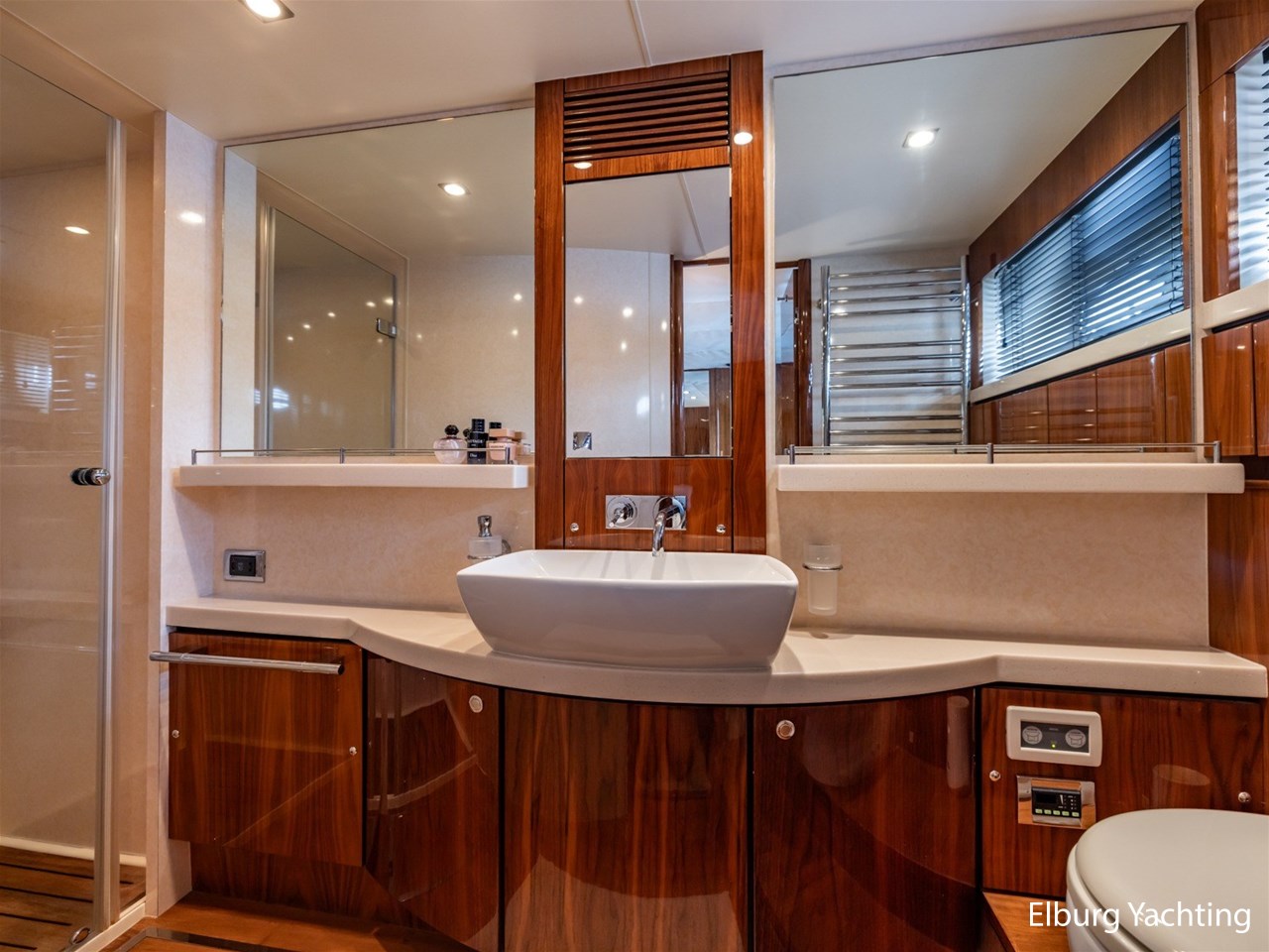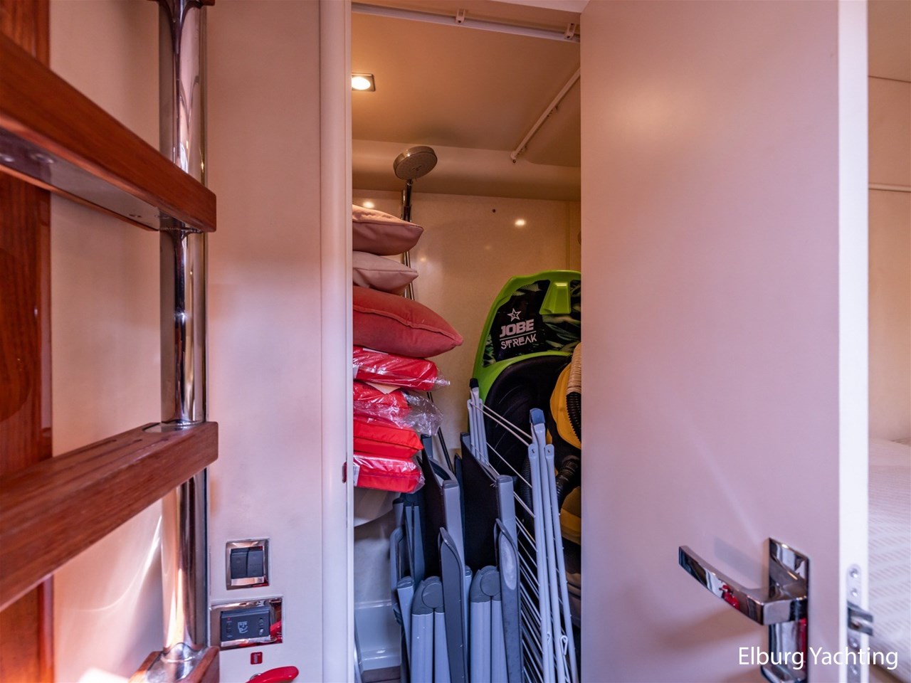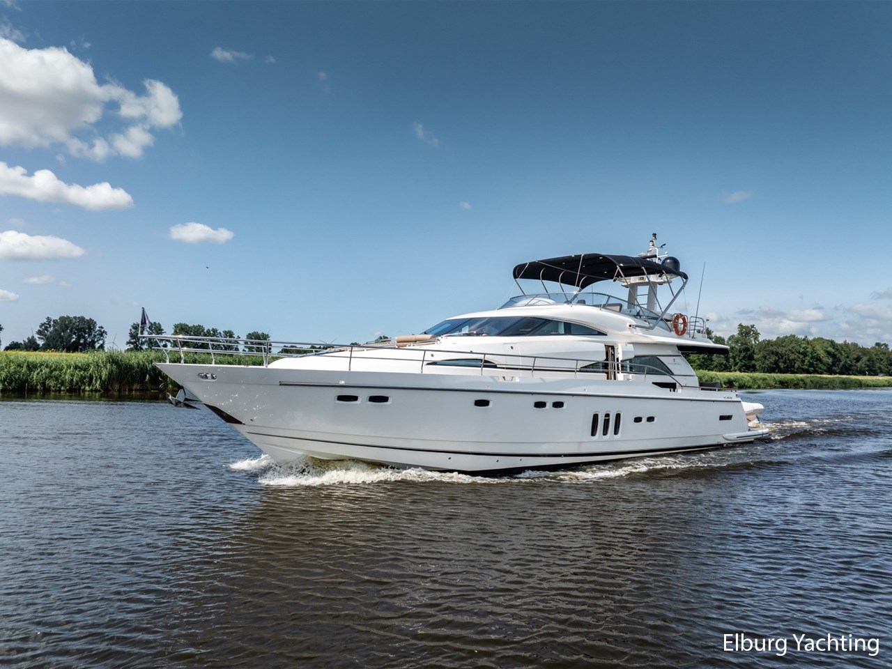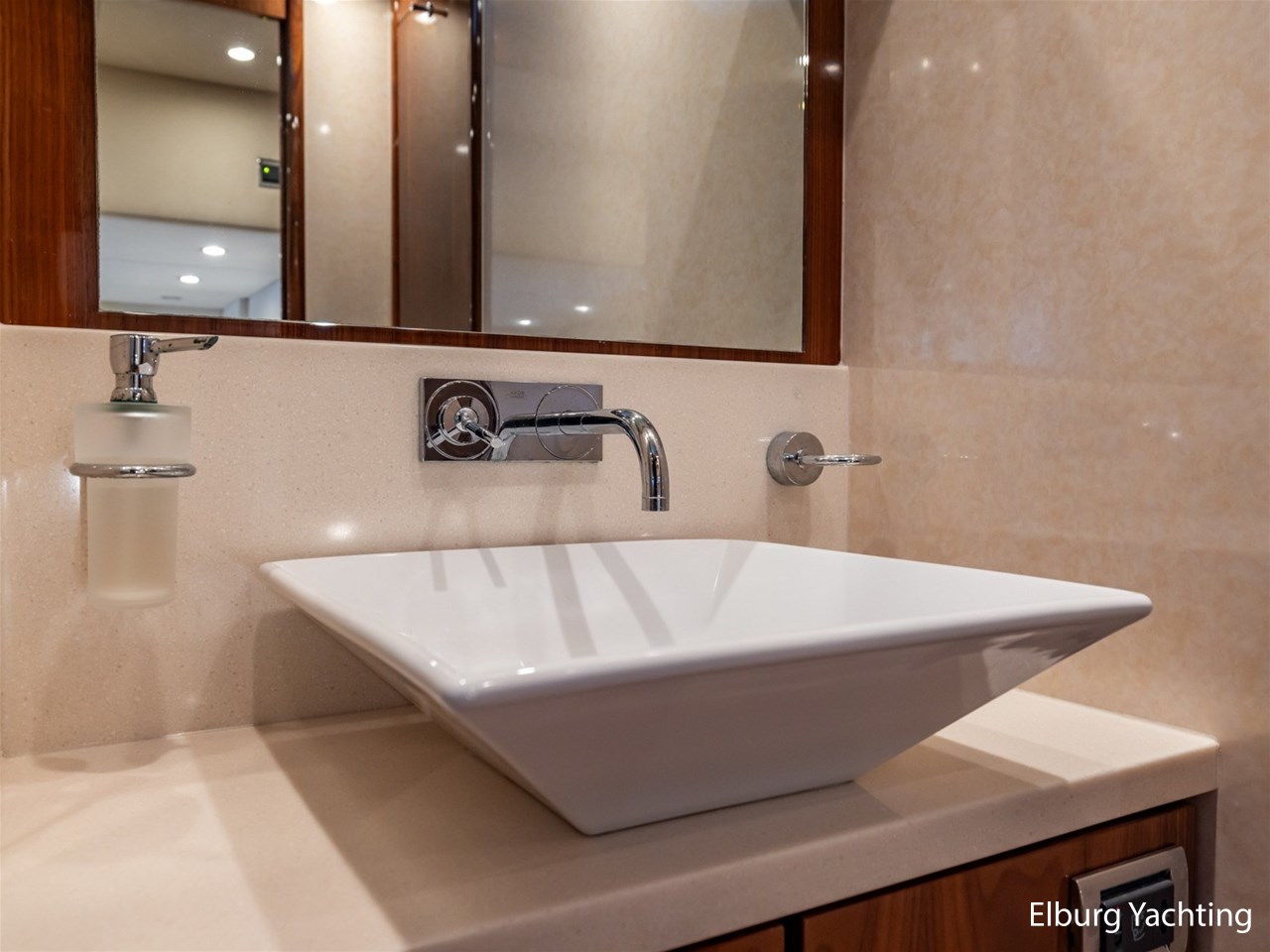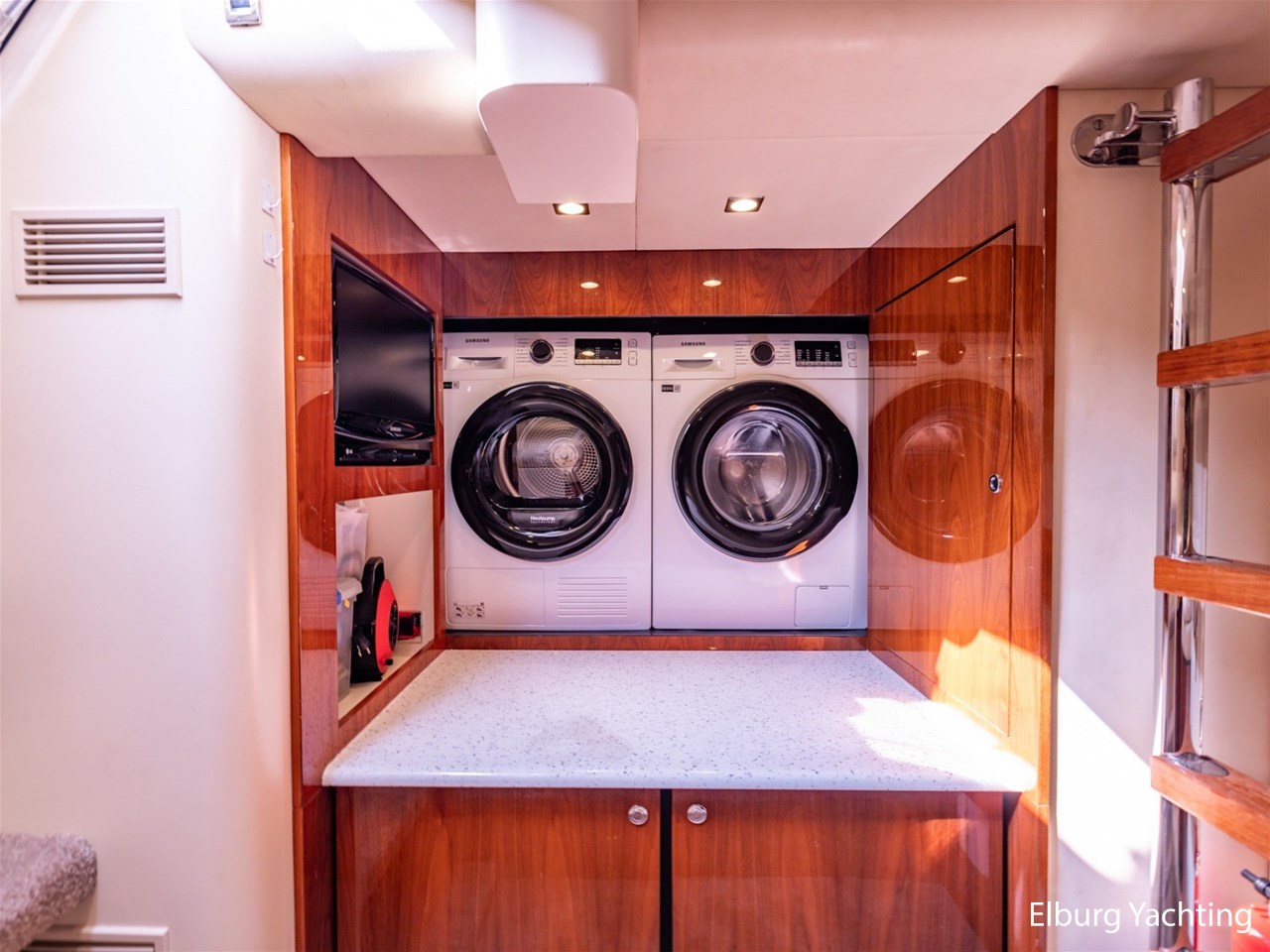 This Fairline Squadron 70 with flybridge is a sport, fast-going GRP built motor yacht. The yacht is very complete and has a luxurious high-quality finish. Recently in 2023/2024, the yacht has undergone a professional update in which the complete upholstery both inside and outside and the tent around the aft deck have been renewed, carpet in the interior has been renewed and the various wall panels have been reupholstered, synthetic permateak has been applied around the side and aft decks, new Raymarine navigation equipment has been installed, service has been carried out on both main engines and the generator. The Fairline has four spacious cabins, three of which have en-suite bathrooms and are all built to the highest standards. The owner's cabin is located amidships with beautiful windows on both sides for a great view on water level. In the aft ship there is a comfortable 2-person (crew) cabin with private bathroom. Luxurious and stylish interior. Spacious open cockpit with sliding door to the saloon, by opening the sliding door the interior space can be expanded even further. The open cockpit can be completely closed off by means of a tent with removable parts, so that the living space on board can be optimally used. The saloon has an L-shaped sofa with 2 lounge chairs and a 6-person dining table, Loewe TV on lift and drink bar. This Fairline Squadron 70 is equipped with walnut interior with high-gloss finish, electrically operated slats, alcantara ceilings, sun blinds around the saloon exterior windows. The yacht is equiped with a full bimini over the flybridge, exterior lighting, 'lazy' stairs to the flybridge, large sunbed on foredeck with foldable awning, dishwasher, Samsung washing machine (2023), Samsung dryer (2023), 2 x electric capstans on the aft deck, trim tabs, flybridge covers, removable shower on the bathing platform, underwater lighting, loose bench with two chairs on the aft deck, WiFi on board (SIM card not included), TVs with chromecast, Bose audio system in saloon, rear view camera via plotter, 2-person sunbed on the flybridge.