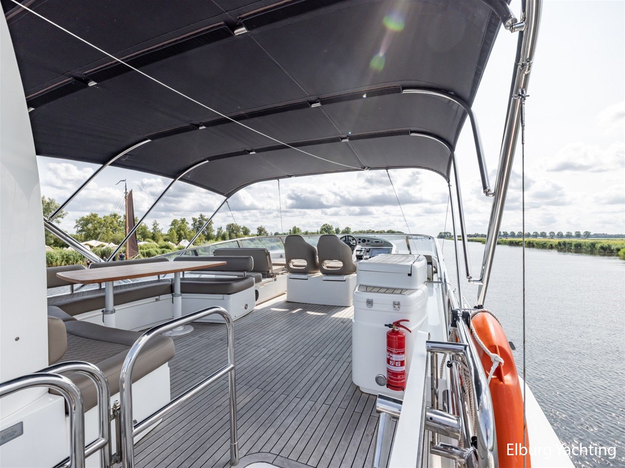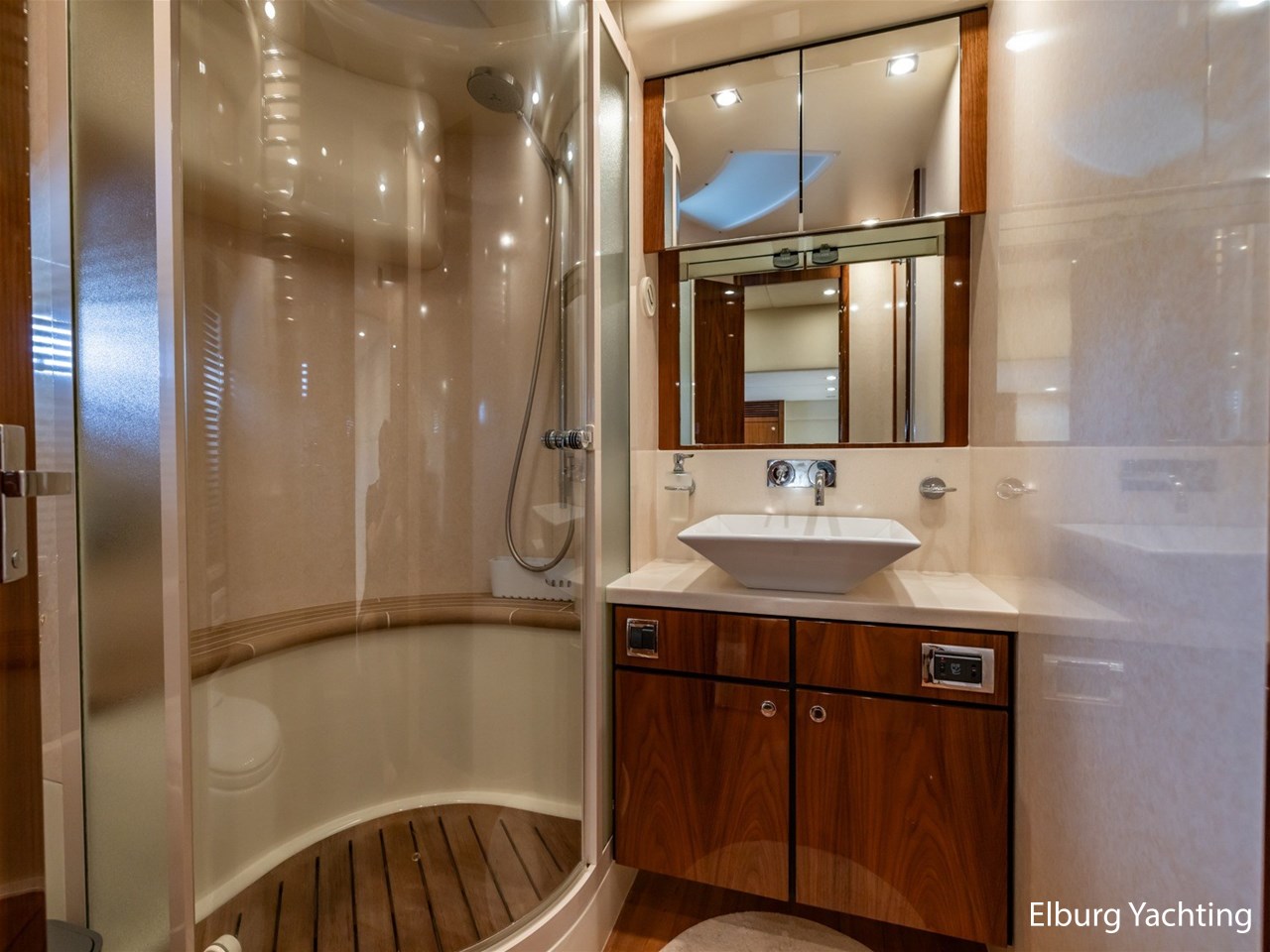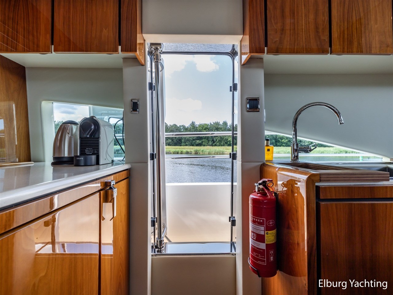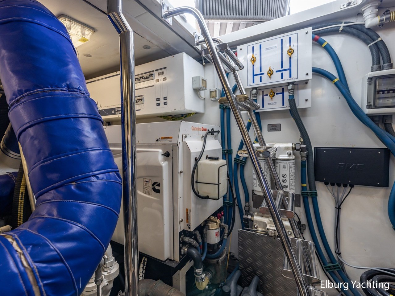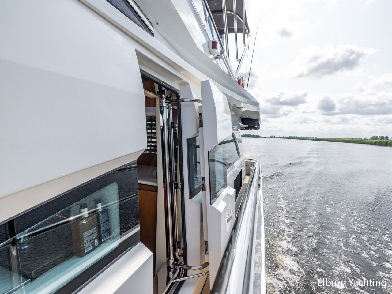 This Fairline Squadron 70 with flybridge is a sport, fast-going GRP built motor yacht. The yacht is very complete and has a luxurious high-quality finish. Recently in 2023/2024, the yacht has undergone a professional update in which the complete upholstery both inside and outside and the tent around the aft deck have been renewed, carpet in the interior has been renewed and the various wall panels have been reupholstered, synthetic permateak has been applied around the side and aft decks, new Raymarine navigation equipment has been installed, service has been carried out on both main engines and the generator. The Fairline has four spacious cabins, three of which have en-suite bathrooms and are all built to the highest standards. The owner's cabin is located amidships with beautiful windows on both sides for a great view on water level. In the aft ship there is a comfortable 2-person (crew) cabin with private bathroom. Luxurious and stylish interior. Spacious open cockpit with sliding door to the saloon, by opening the sliding door the interior space can be expanded even further. The open cockpit can be completely closed off by means of a tent with removable parts, so that the living space on board can be optimally used. The saloon has an L-shaped sofa with 2 lounge chairs and a 6-person dining table, Loewe TV on lift and drink bar. This Fairline Squadron 70 is equipped with walnut interior with high-gloss finish, electrically operated slats, alcantara ceilings, sun blinds around the saloon exterior windows. The yacht is equiped with a full bimini over the flybridge, exterior lighting, 'lazy' stairs to the flybridge, large sunbed on foredeck with foldable awning, dishwasher, Samsung washing machine (2023), Samsung dryer (2023), 2 x electric capstans on the aft deck, trim tabs, flybridge covers, removable shower on the bathing platform, underwater lighting, loose bench with two chairs on the aft deck, WiFi on board (SIM card not included), TVs with chromecast, Bose audio system in saloon, rear view camera via plotter, 2-person sunbed on the flybridge.