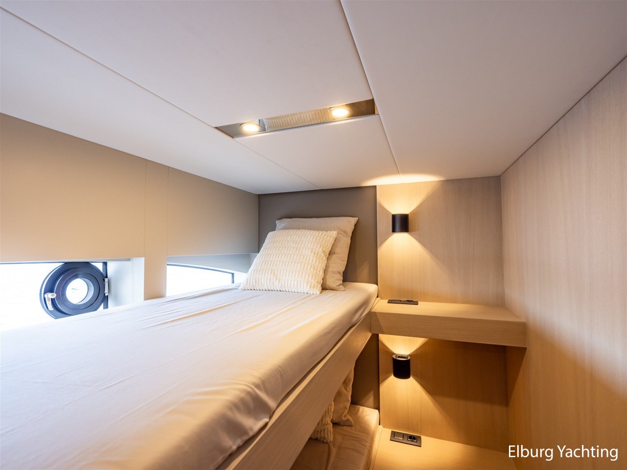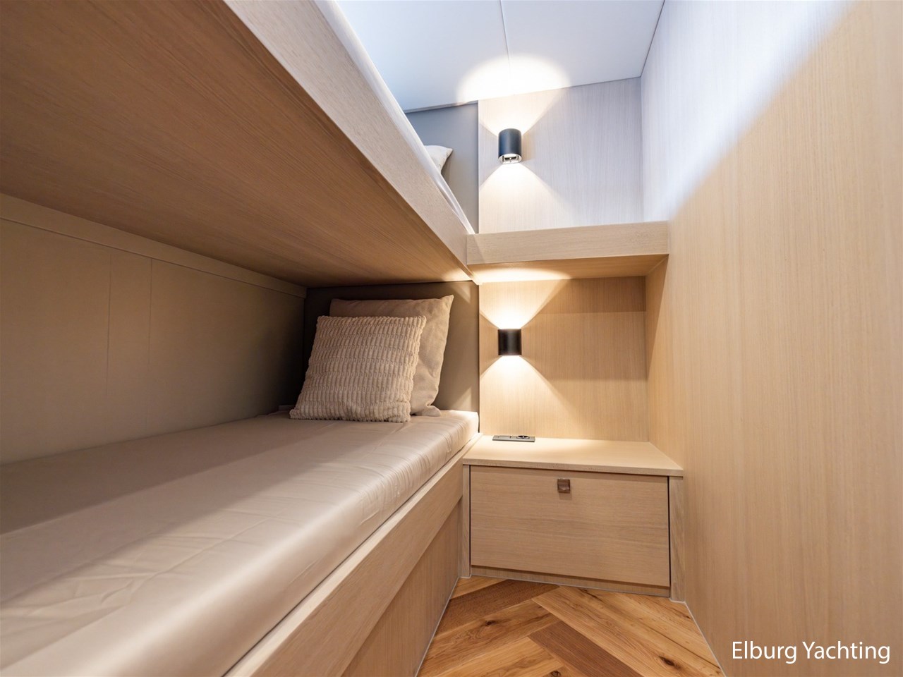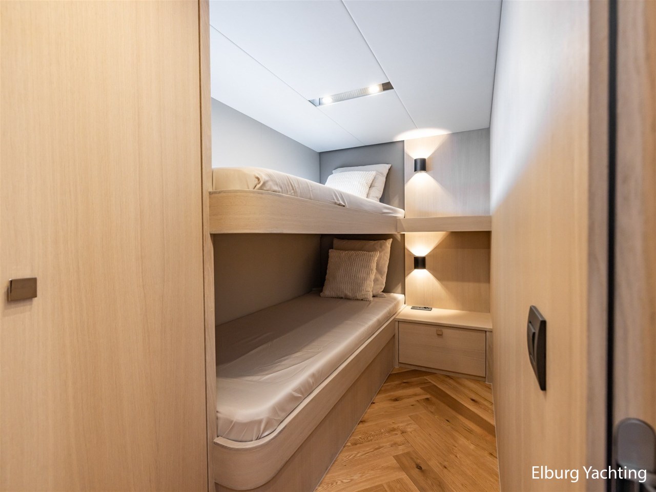 - 6 x fixed (1 x 2 pers. freestanding bed in owners cabin in bow + 1 x 2 pers. freestanding bed in PS side guestcabin + 2 x 1 bunk bed in SB guestcabin)