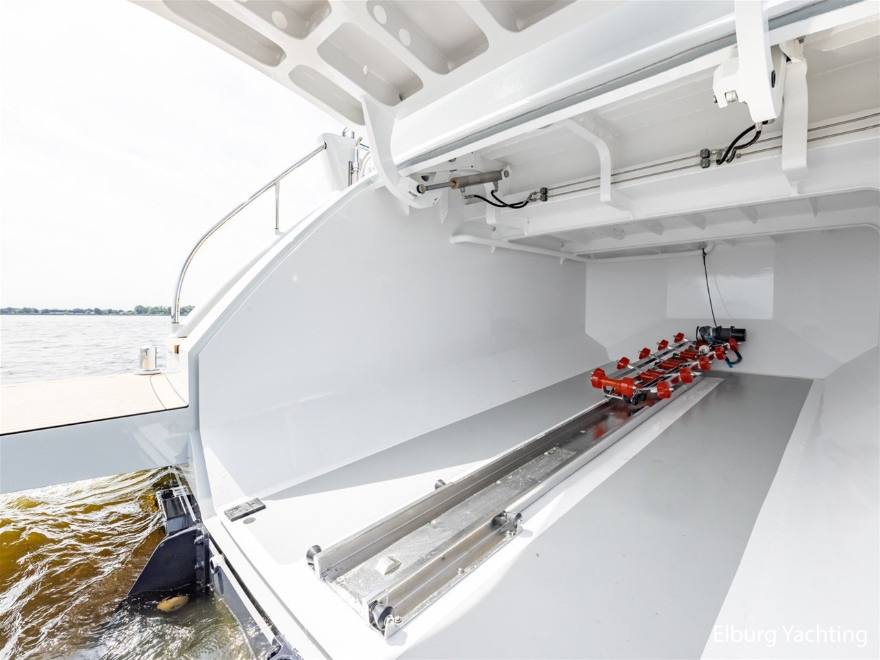 - Tender garage in transom with launch system for taking easily a tender in and out of the water