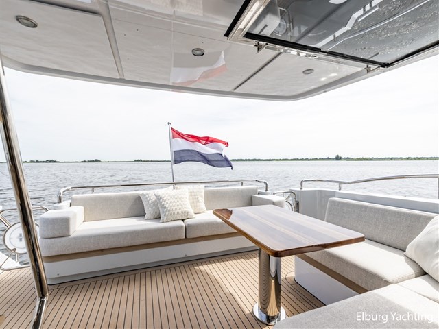 The Van den Hoven Voyager 56 was designed keeping in mind the trend of recent years where 'outdoor living' is central and where the owners and its guests want to live outside as much as possible. The beautifully spacious (largely covered) aft deck has an integrated bench with ten over an additional corner bench with matching cushion set. In the transom, there is a dinghy garage for e.g. a Williams tender (not included). The spacious flybridge (or 'outdoor saloon') has a second helm, sun beds, lounge sofa, dinette and outdoor galley with fridge and grill. A comfortable 2-person lounger is integrated on the foredeck. The interior exudes space and luxury and is fully equipped to make long stays on board as comfortable as possible. The saloon, wheelhouse and galley are open connected for plenty of contact and living comfort. Below deck in the foreship is the spacious and luxurious 2-person owner's cabin with bathroom en-suite. Midships on SB and BB side there is a comfortable 2-person guest cabin with a central bathroom with toilet and separate shower, also a washing and drying combination is installed here. Furthermore, this Van den Hoven Voyager 56 is equipped with: Humphree interceptors trim system, Humphree stabilisers with zero speed function, Hullvane underwater spoiler to reduce sailing drag which benefits onboard consumption and comfort, the yacht is equipped with a complete onboard air-conditioning system in every room, Opacmare gangway (fold-out length appr. 3.70m), 2 x capstans on bow type Bonomi JOY cleat with foot pedal, TV on lift in saloon and owner's cabin, electrically operated pleated curtains in saloon with remote control, WiFi system on board (SIM card required), extensive Raymarine navigation equipment, camera system for rear view, large Mastervolt Li-ion battery pack for users on board, deck wash system. Air draft with mast up approx. 6.00 metres and with mast folded appr. 4.70 metres. Maximum speed appr. 21 knots depending on conditions. Consumption data available on request.