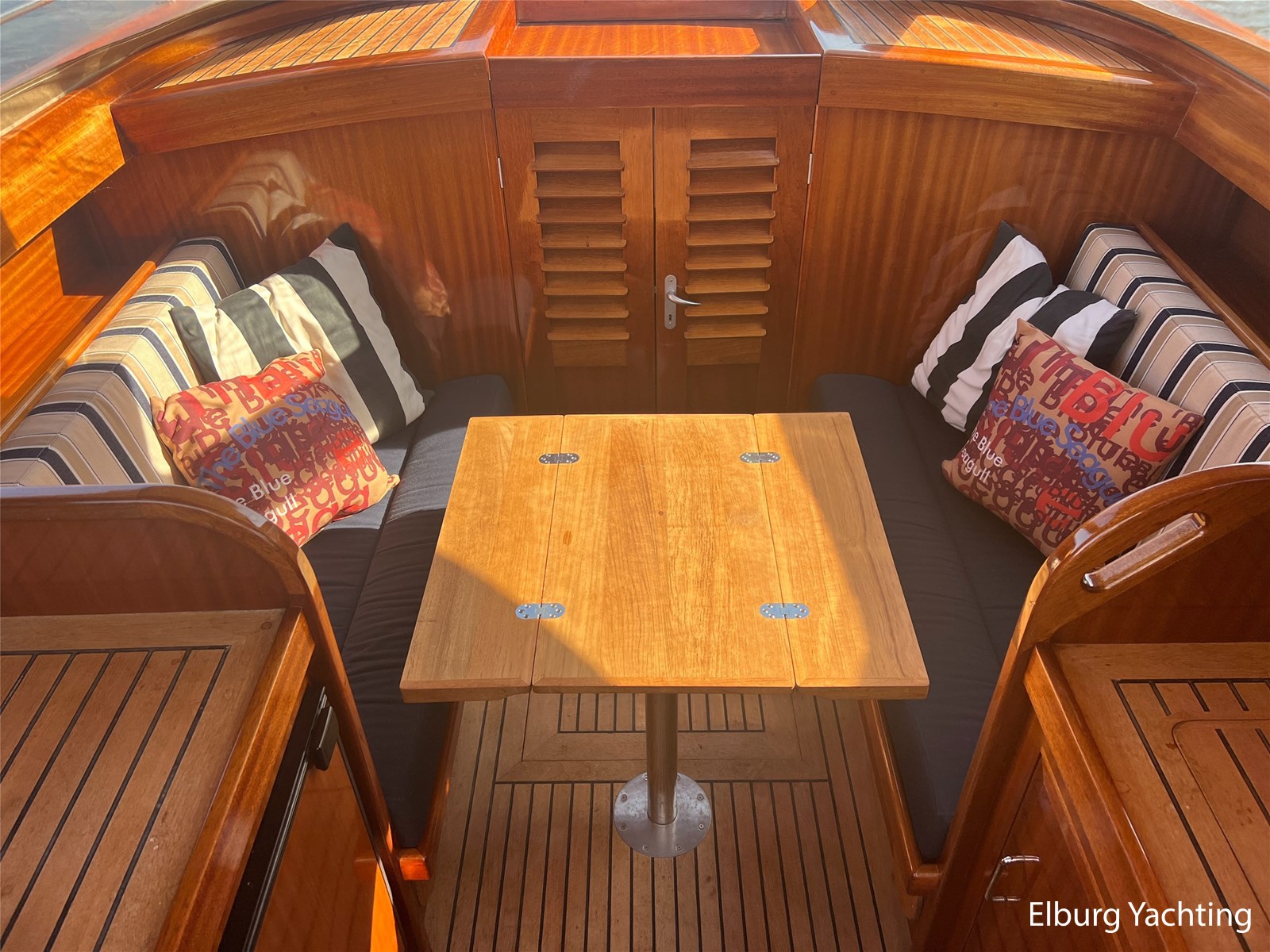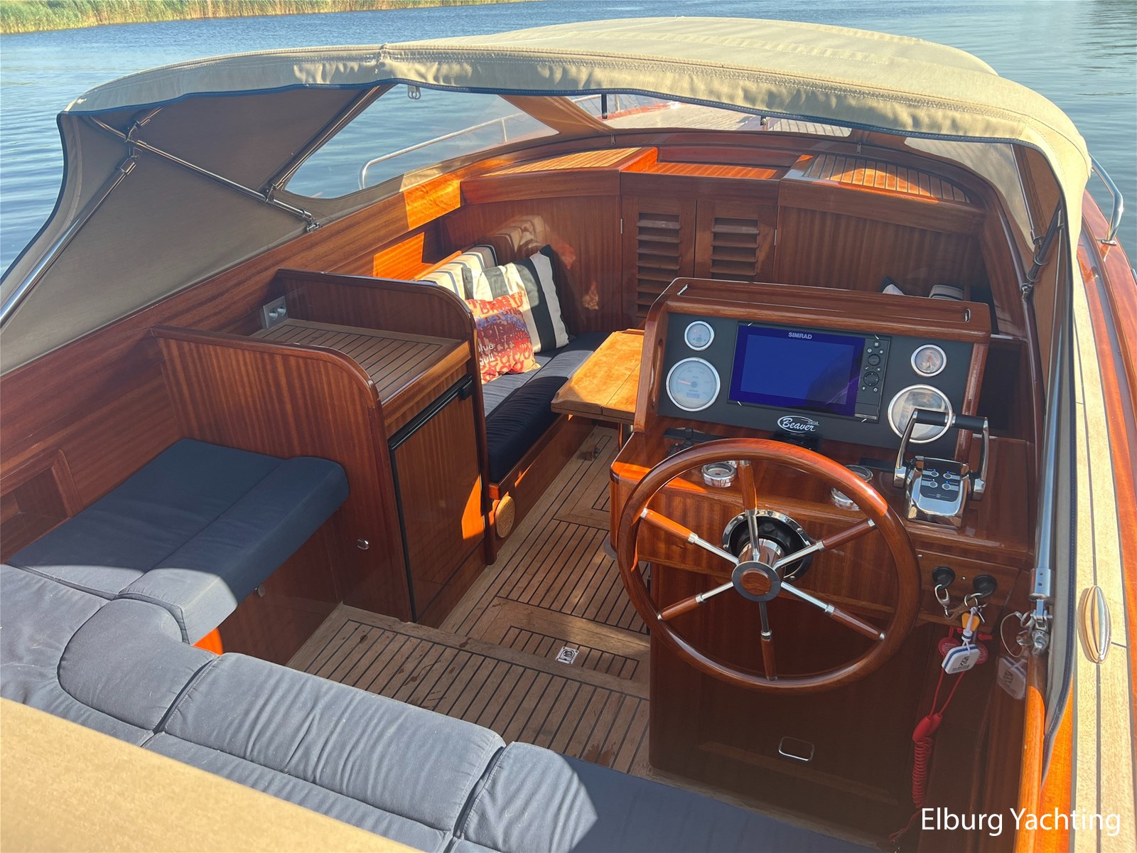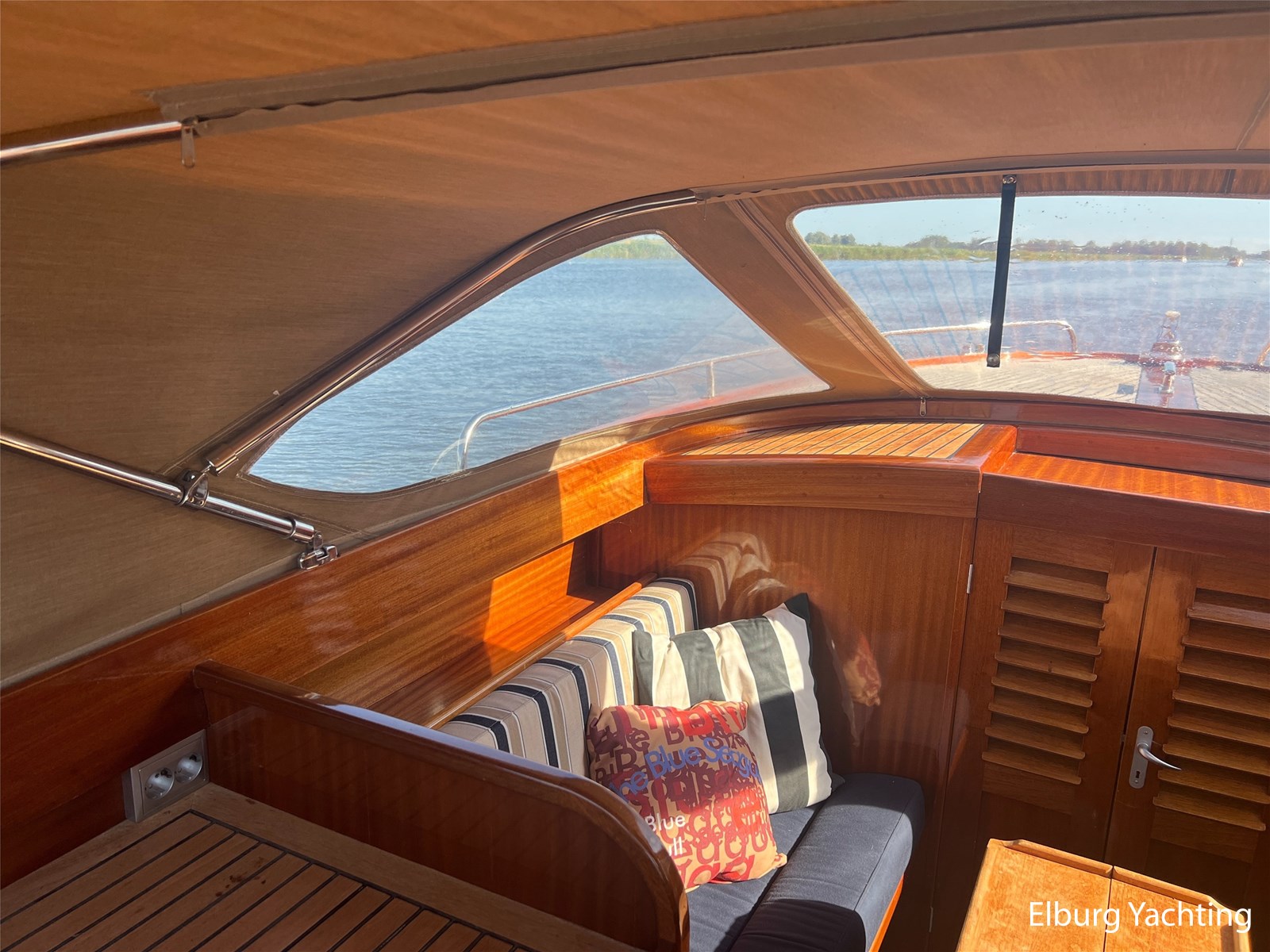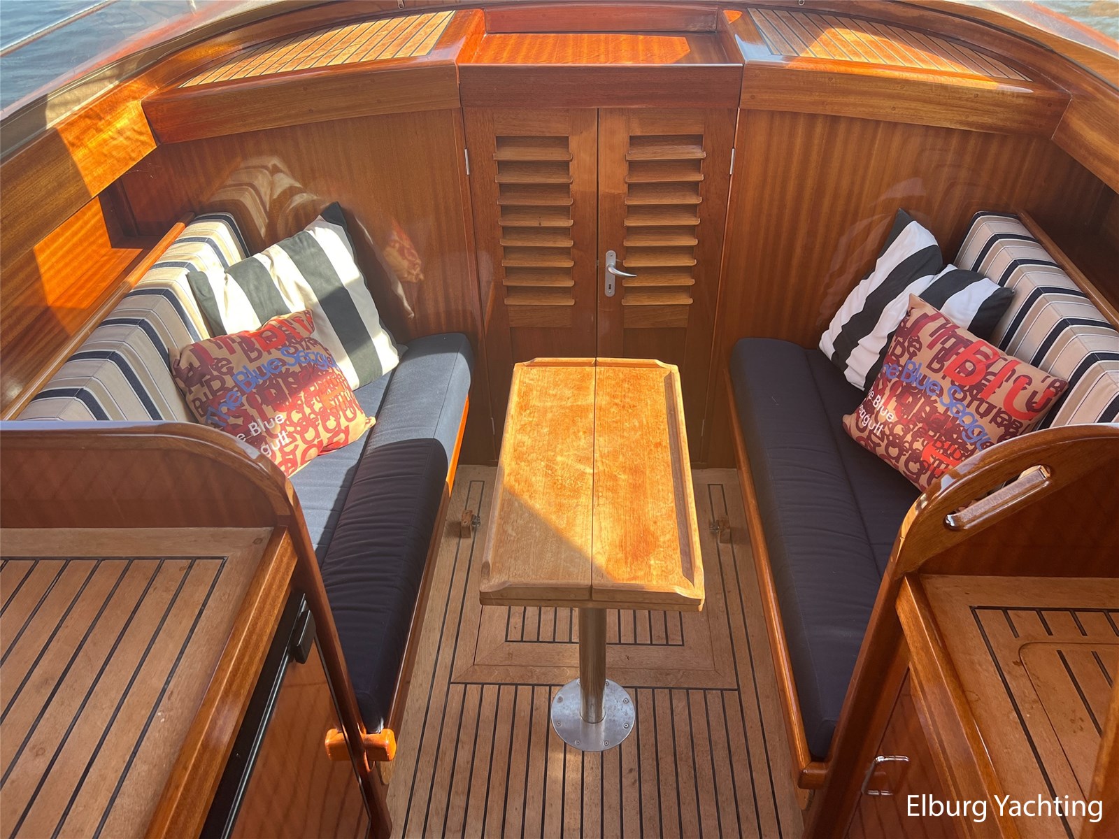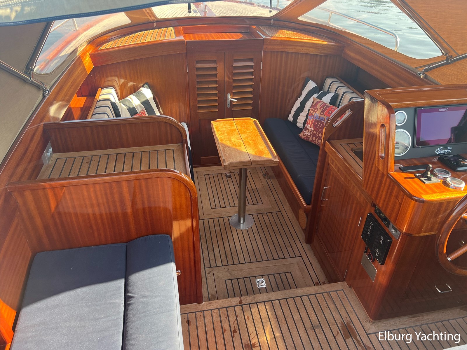 - Teak wooden interior with white/darkblue upholstery