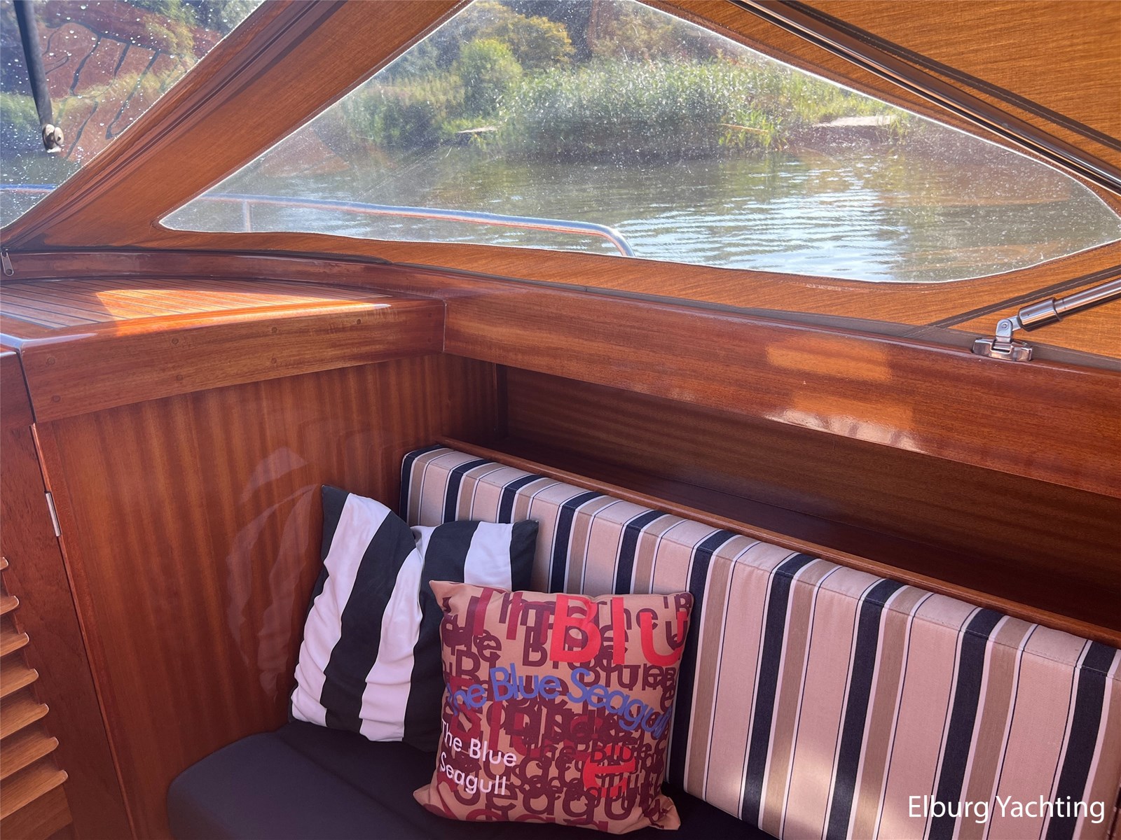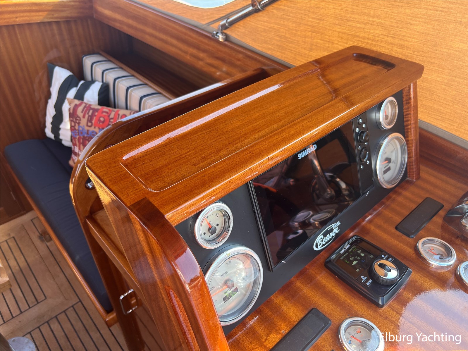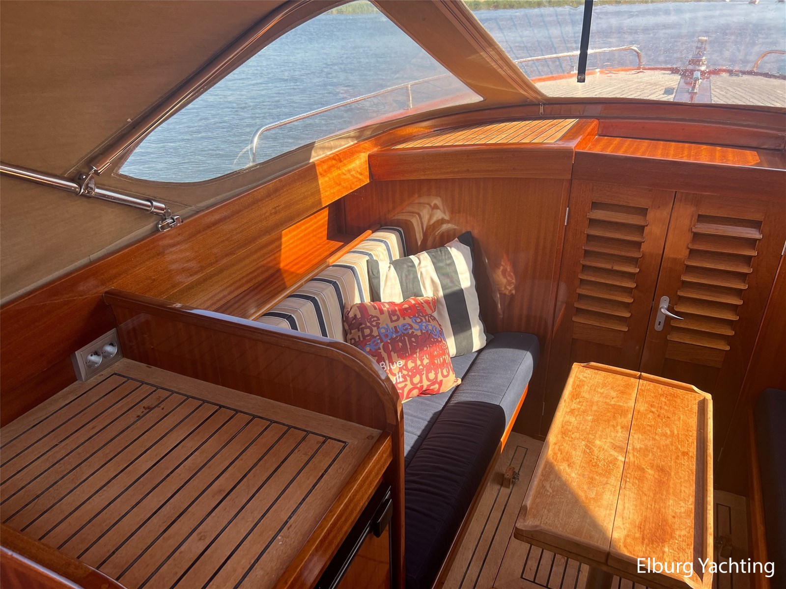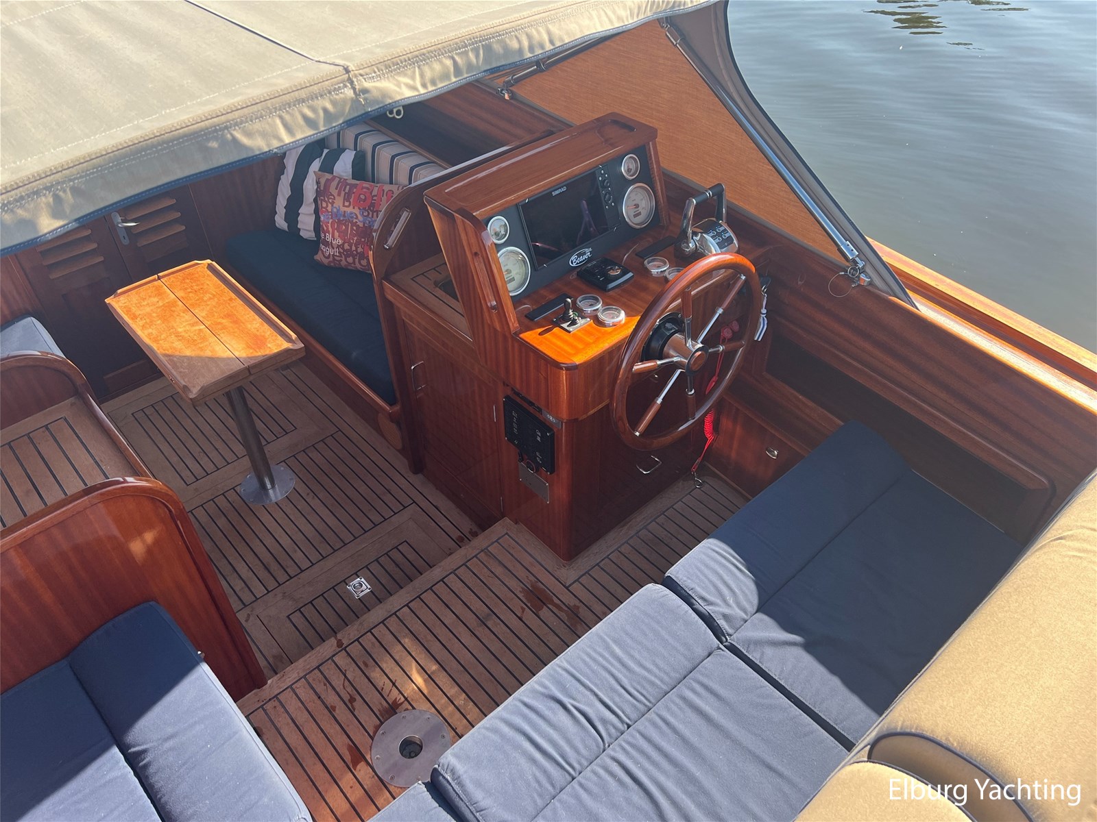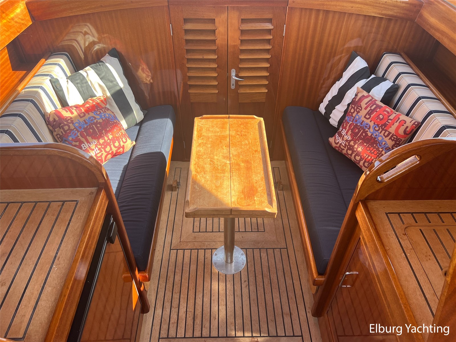 - Teak wooden interior with white/darkblue upholstery