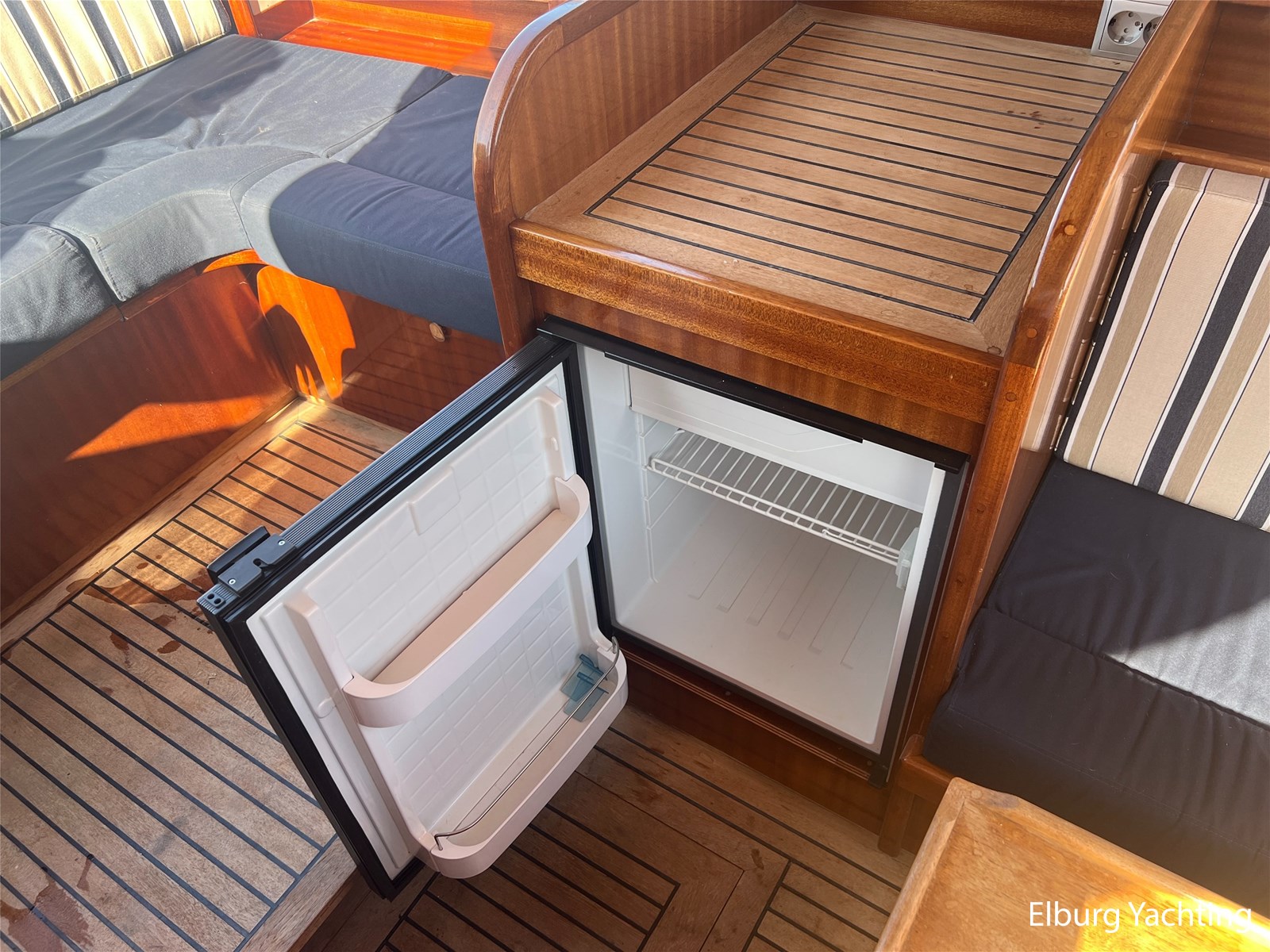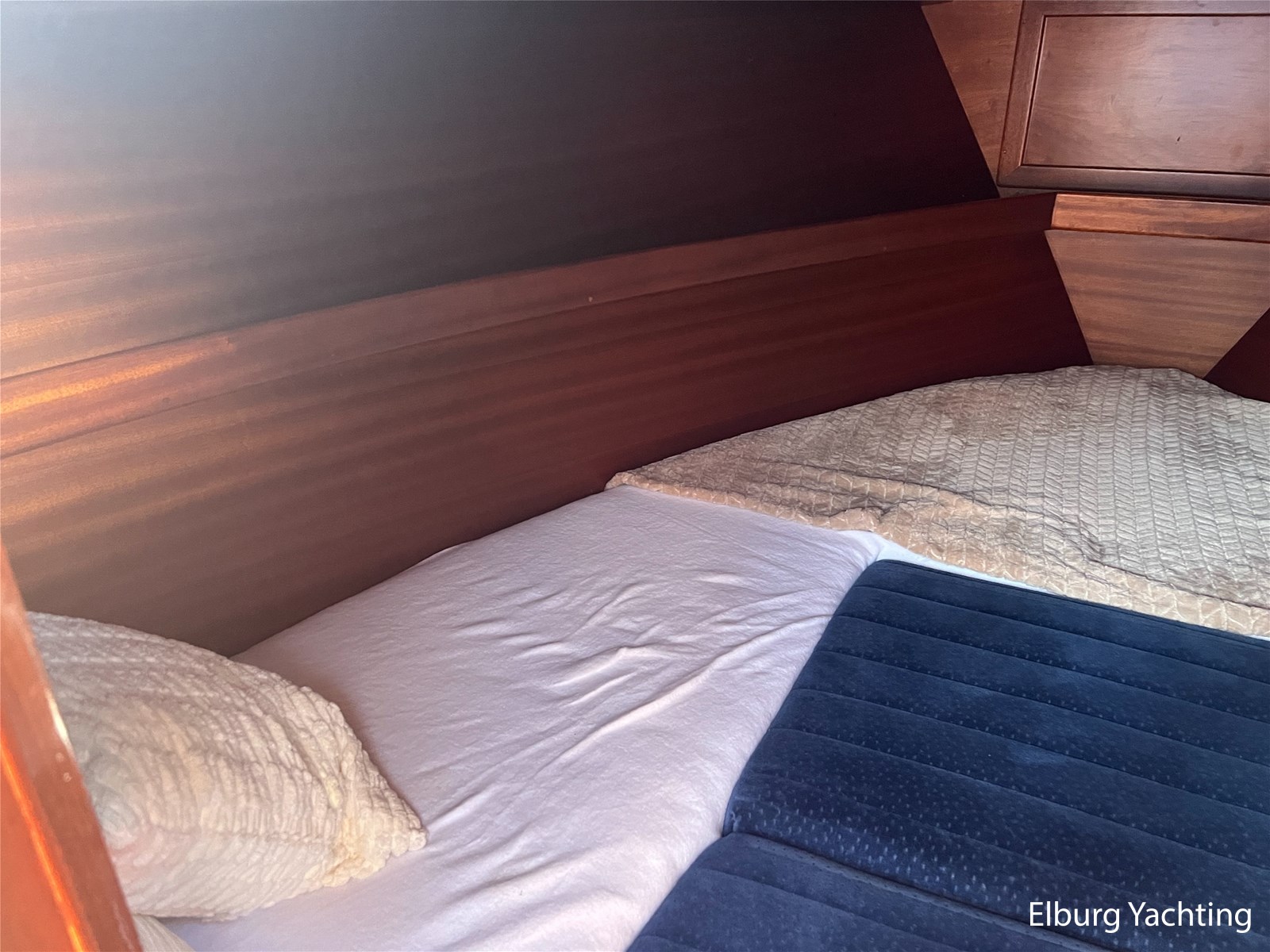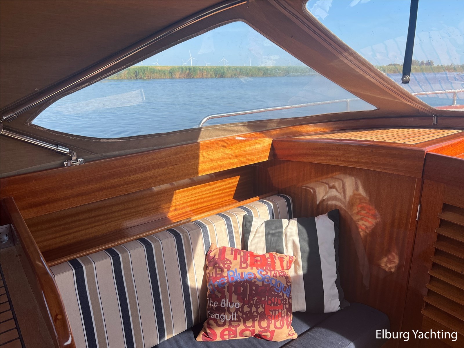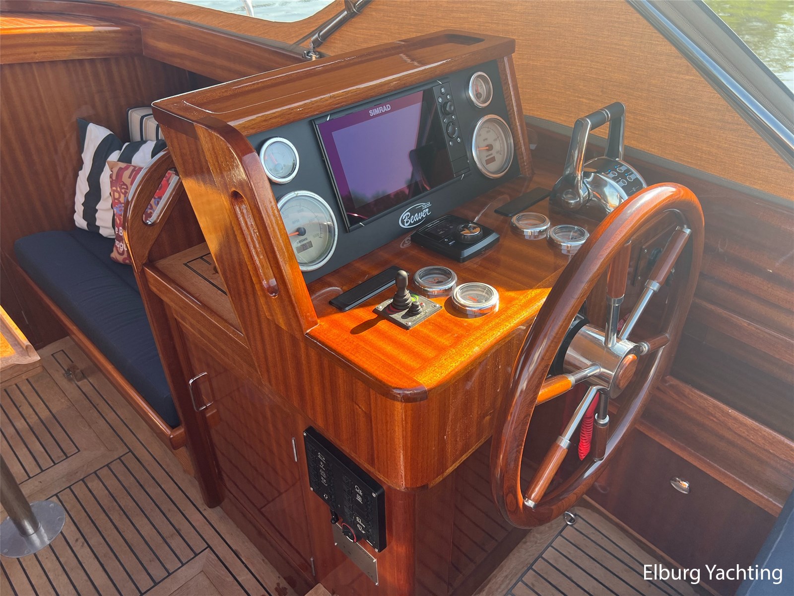 - Teak wooden interior with white/darkblue upholstery