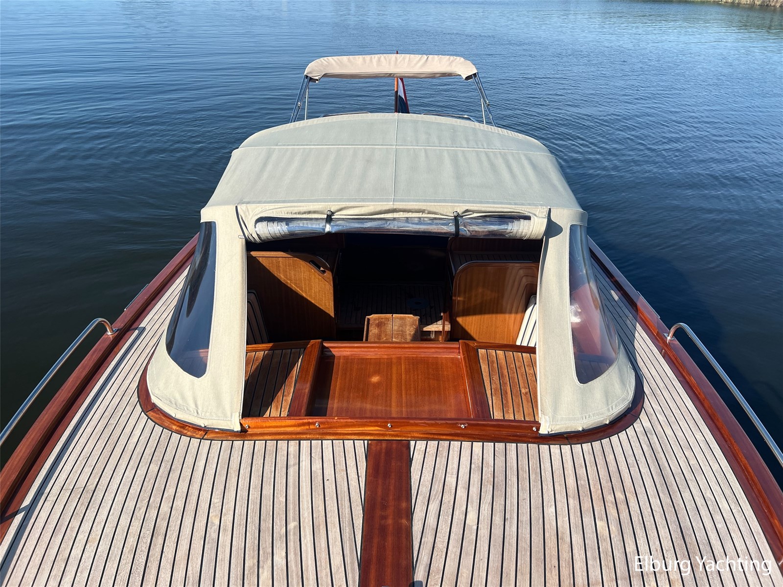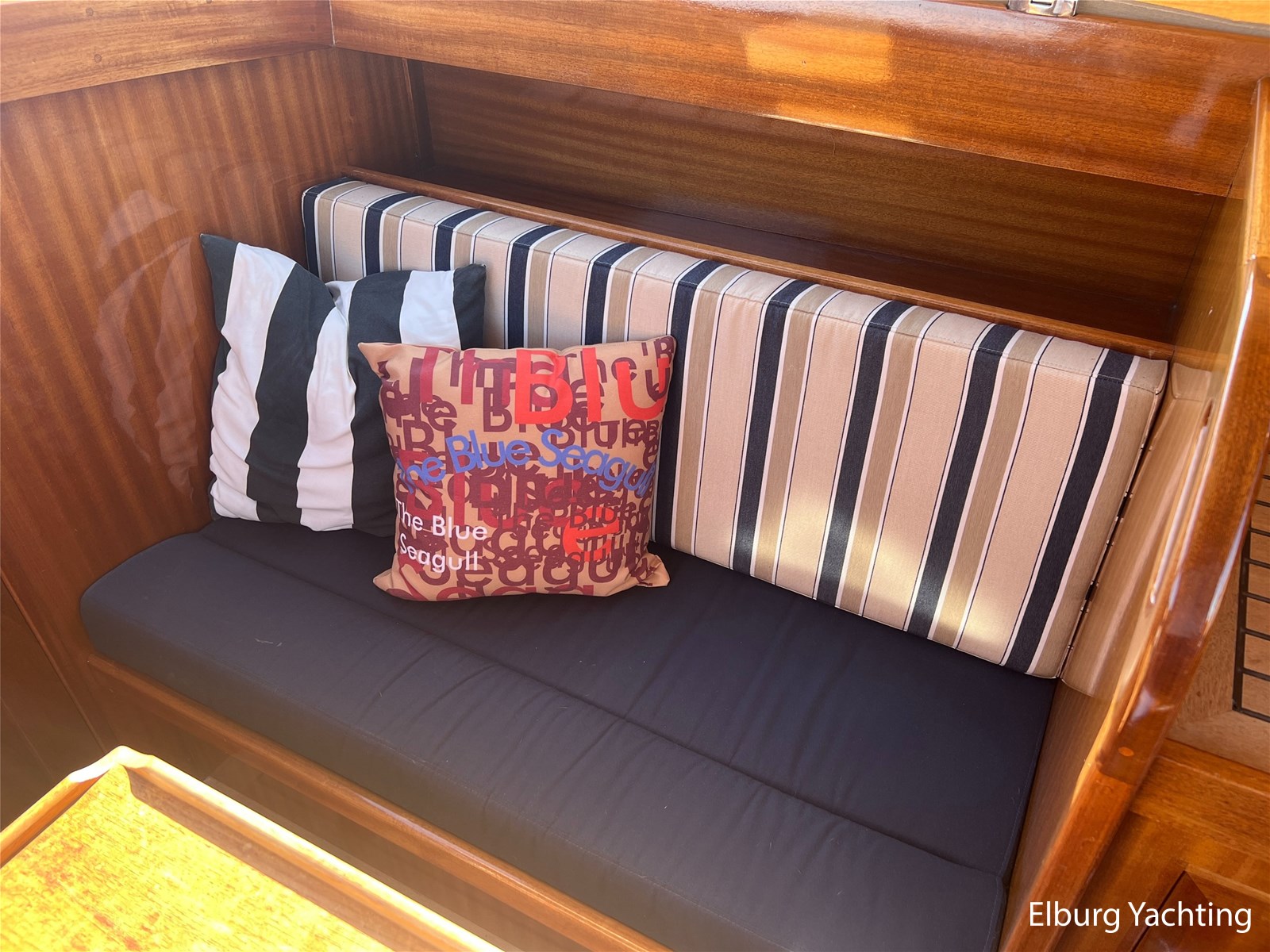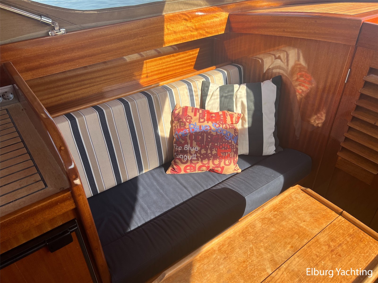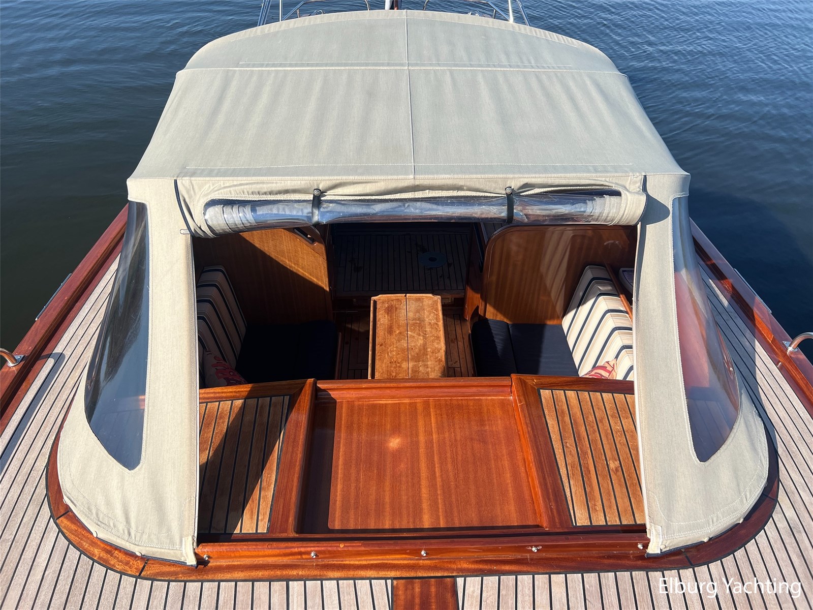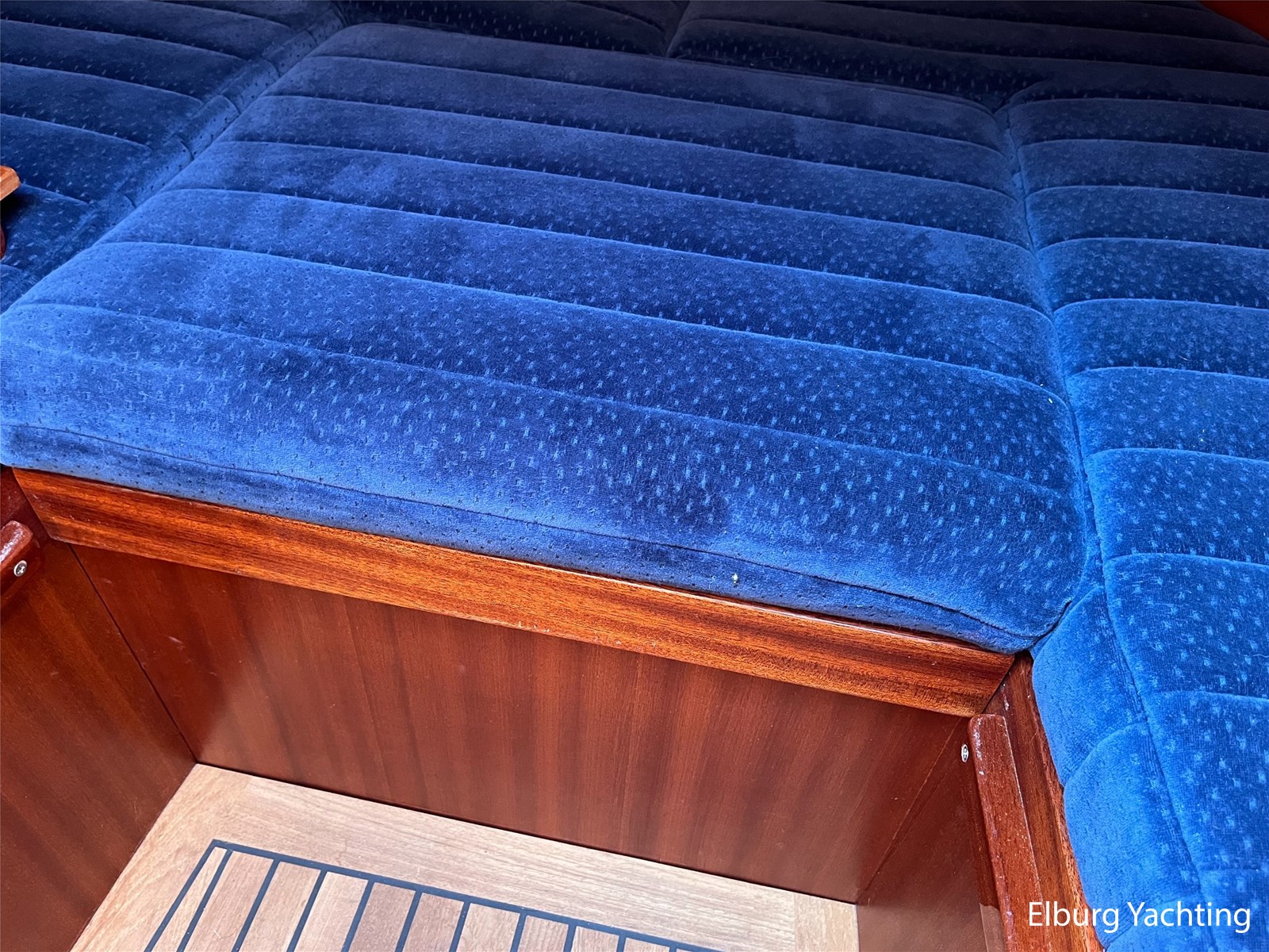 - Teak wooden interior with white/darkblue upholstery
