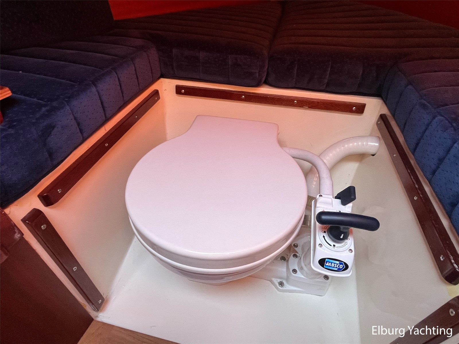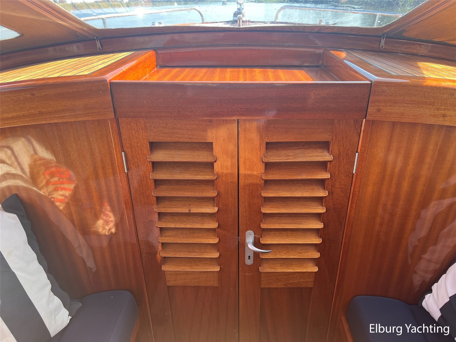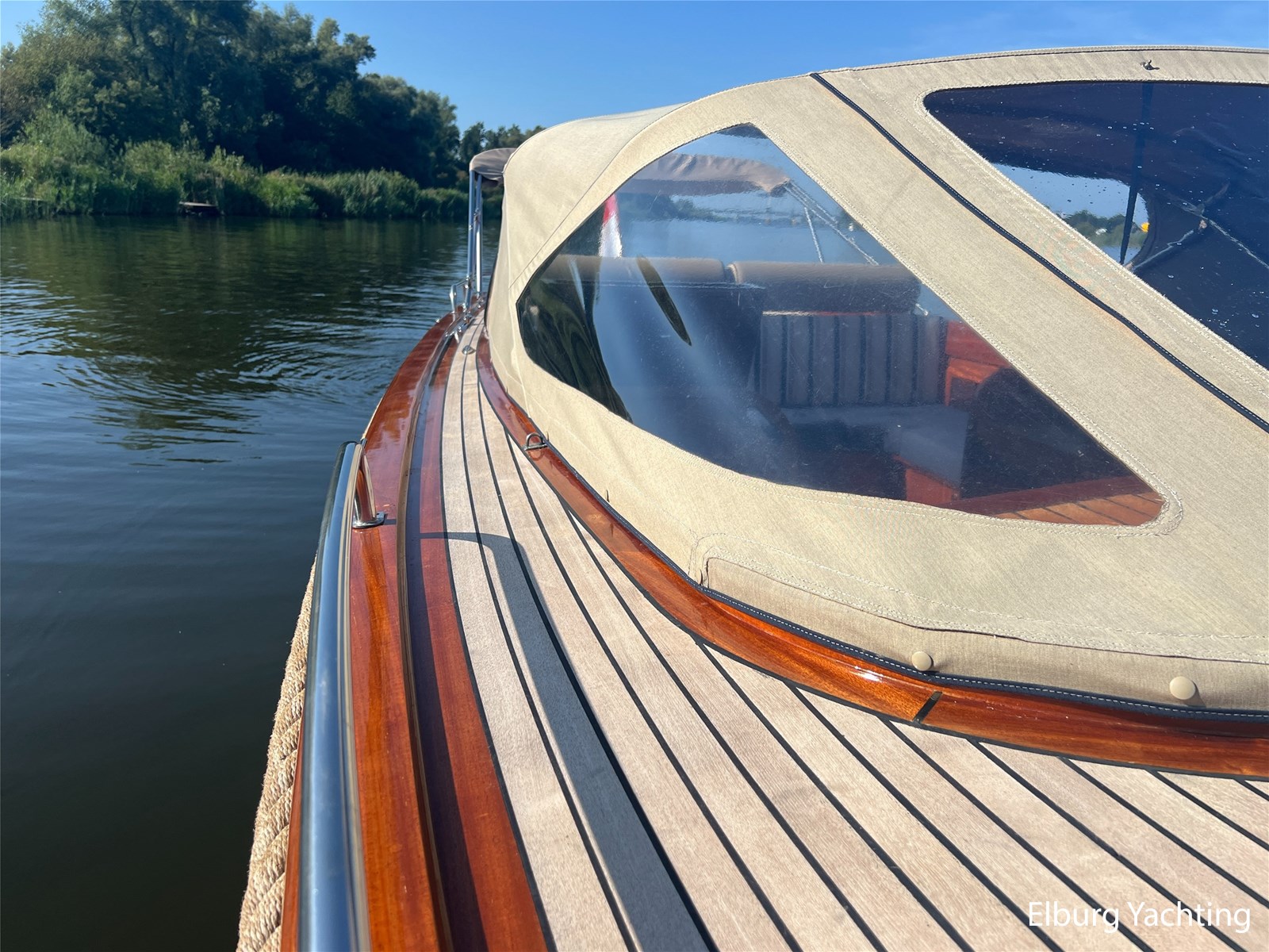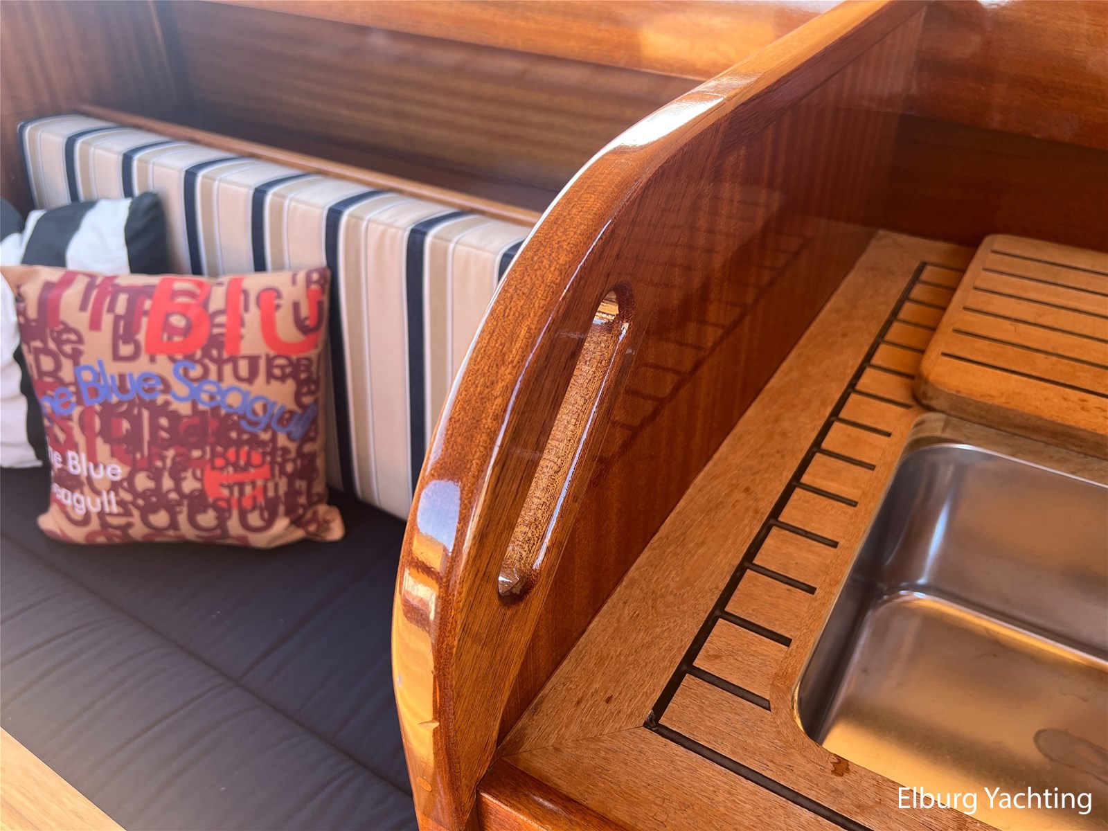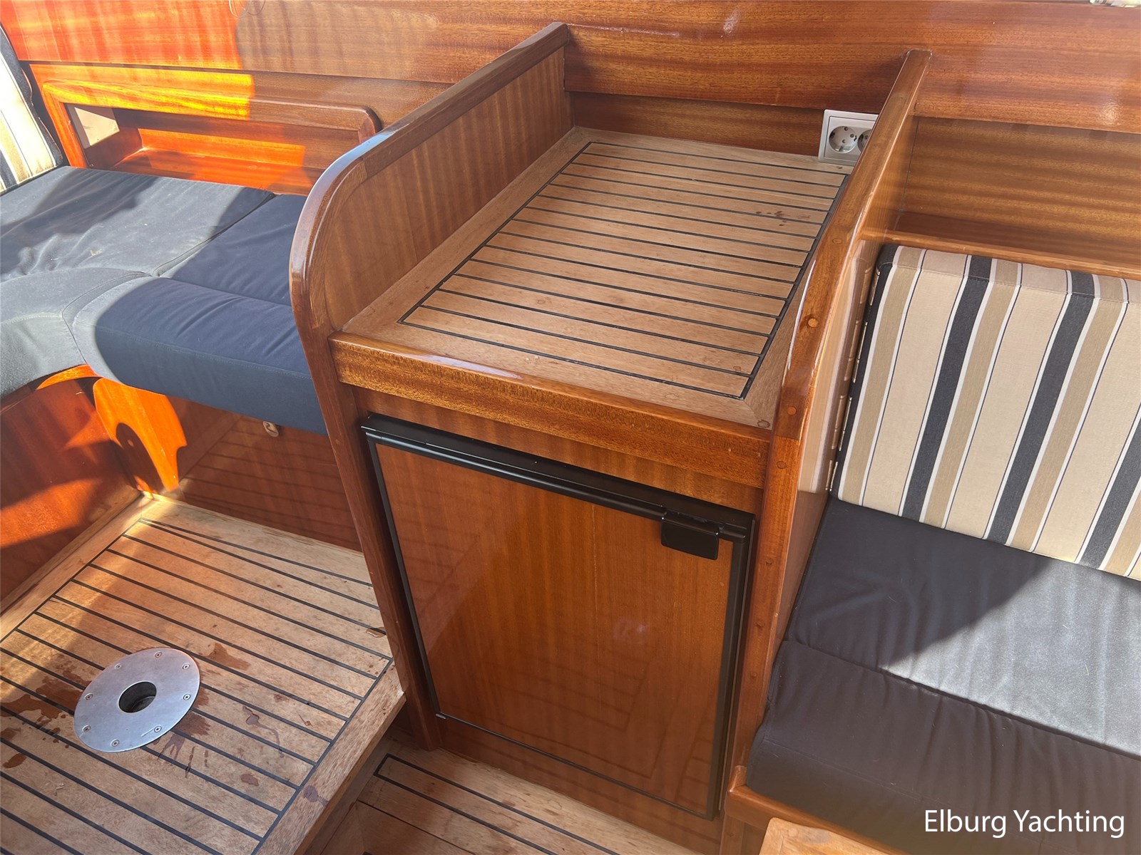 - Teak wooden interior with white/darkblue upholstery