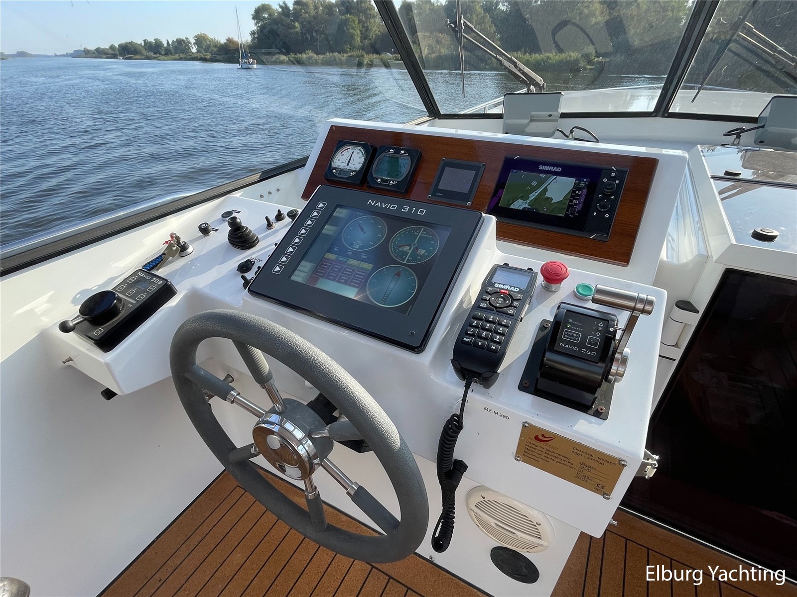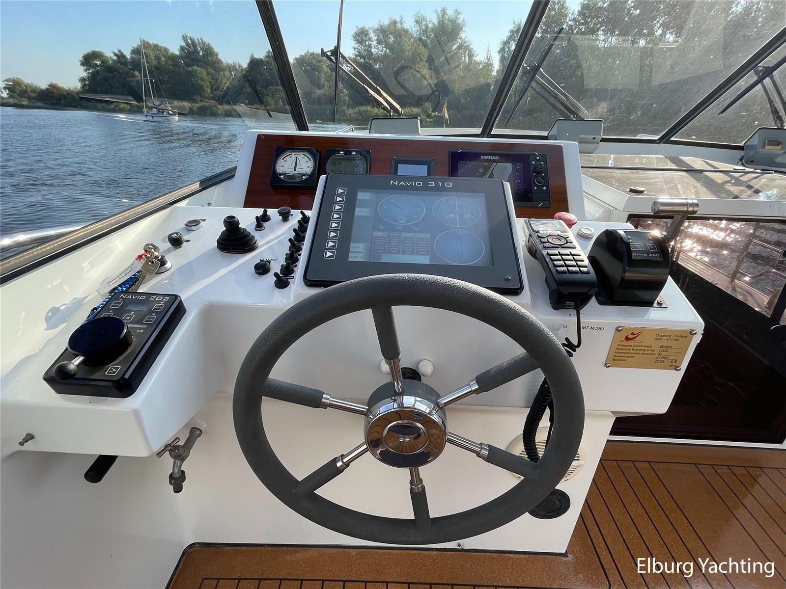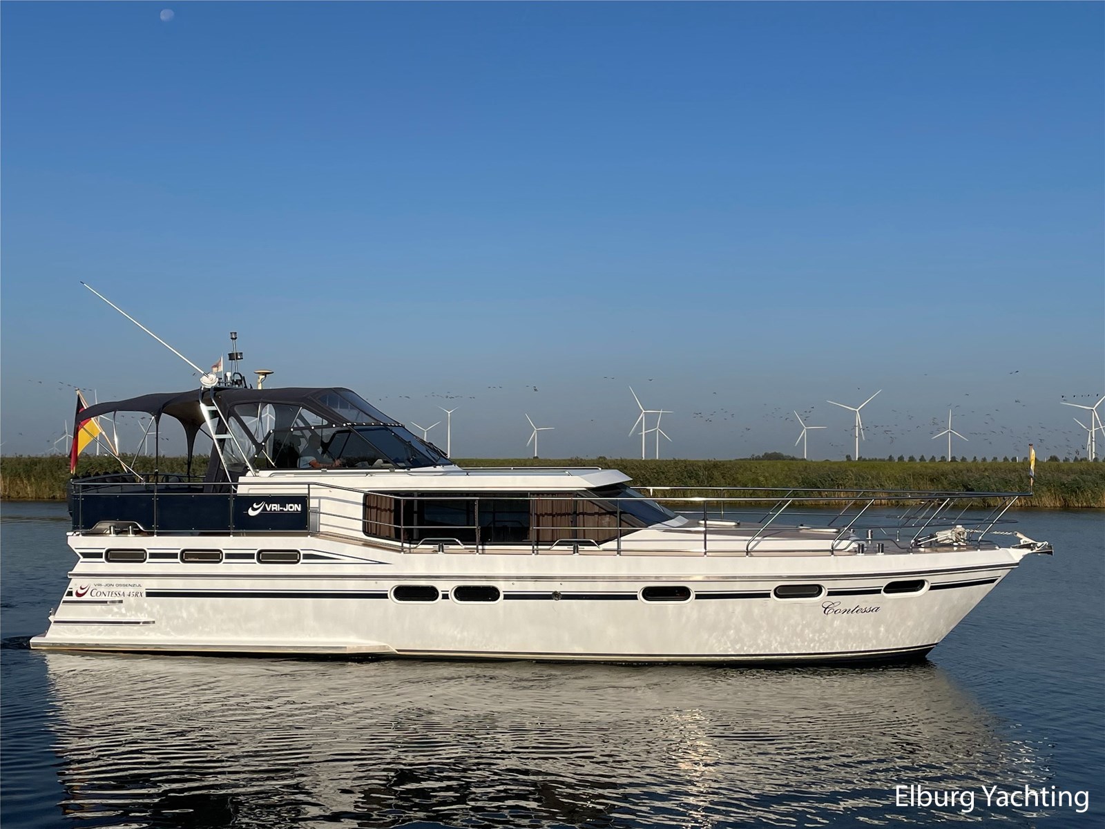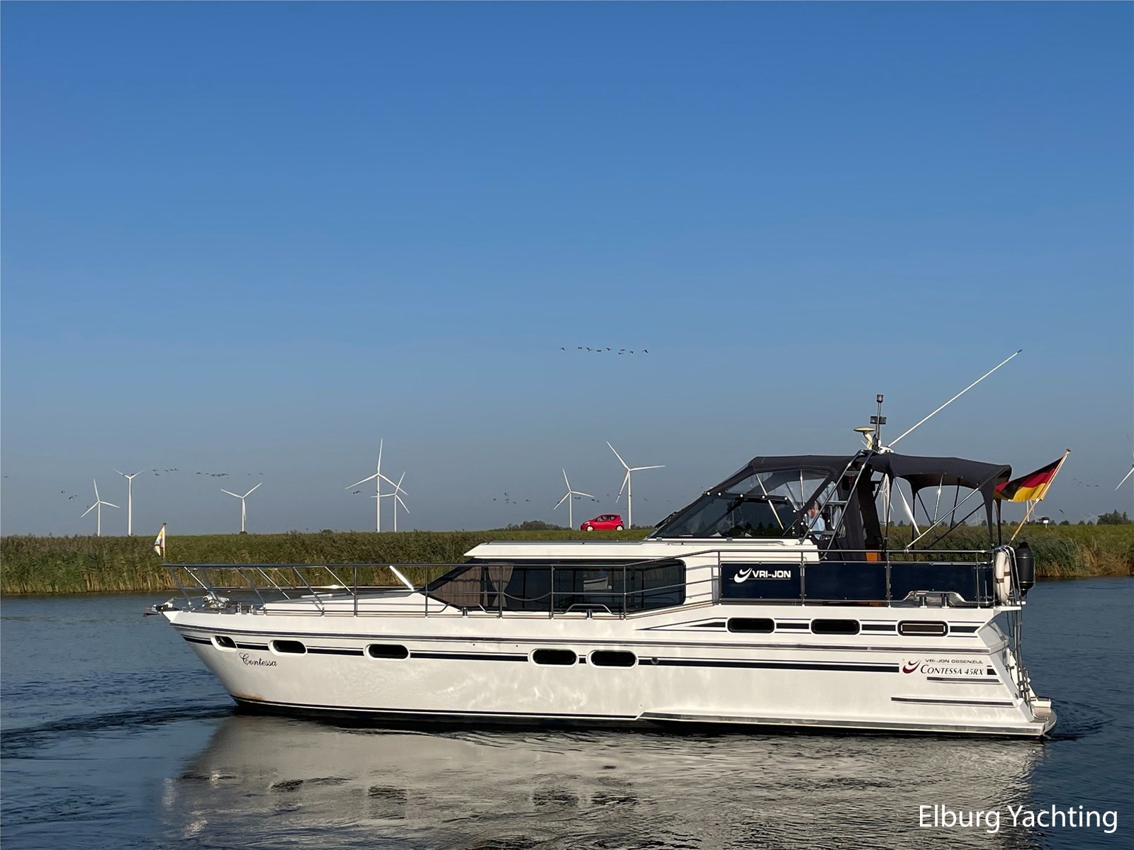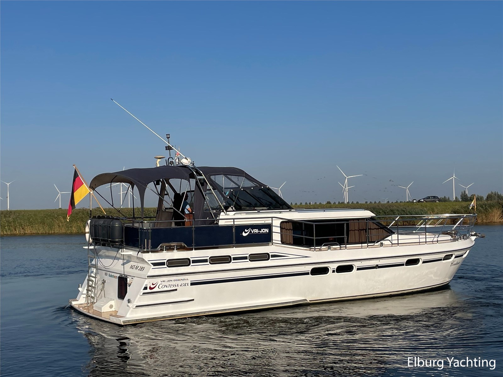 Spacious Vri-Jon Contessa 45RX built by the well-known Dutch Vri-Jon yard in Ossenzijl. This Vri-Jon is a perfect cruiser to explore Dutch, but also foreign waters with. She is equipped with a technically advanced rotating nozzle with pulling propeller. This mechanism is very efficient and gives a lot of control when manoeuvring the yacht. Throughout the yacht, the Vri-Jon yard's years of experience stand out well. The spacious saloon with storage space, cosy dinette opposite the spacious galley, the pleasant forward cabin with its own wet cell and, of course, the spacious aft cabin with free-standing bed and spacious wet cell with shower cubicle and washer/dryer combination. The yacht is equipped all around with a low-maintenance cork deck with a stainless steel sea railing. The outside steering position is equipped with a clear Navio boat control system in combination with a Navio Power steering system that also controls the autopilot. The yacht is also equipped with a recent Simrad chart plotter and electric anchor winch with remote control. This yacht is completely gas - free. Minimum headroom is appr. 2.75 metres. For questions and/or to make an appointment, you are welcome 7 days a week at Elburg Yachting.