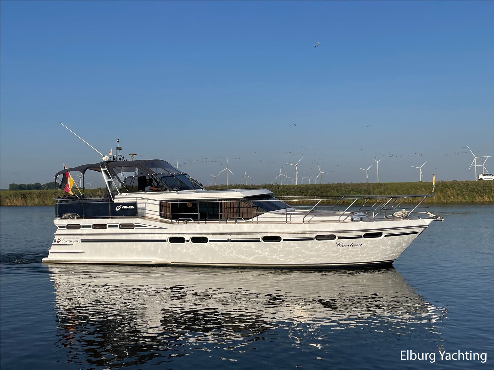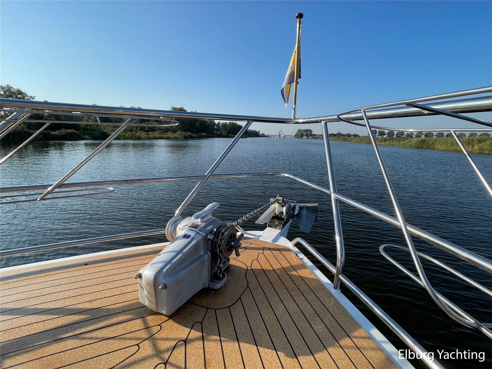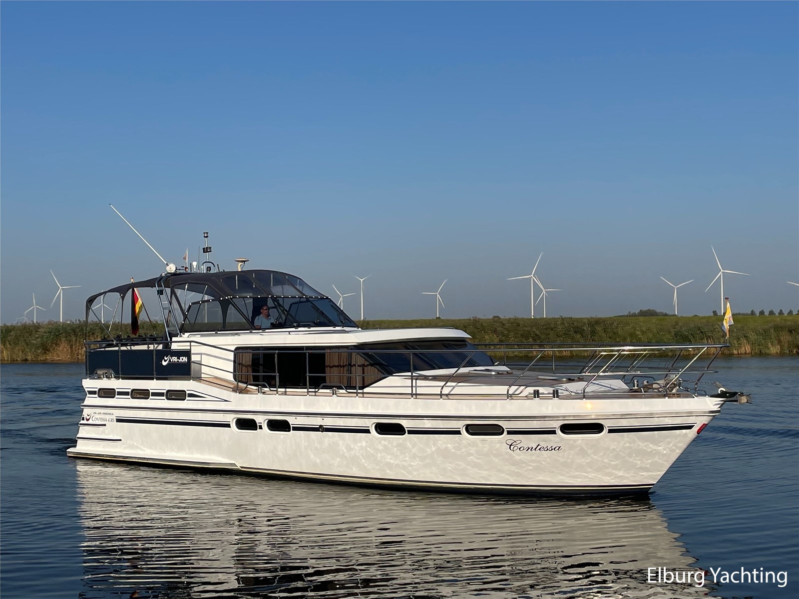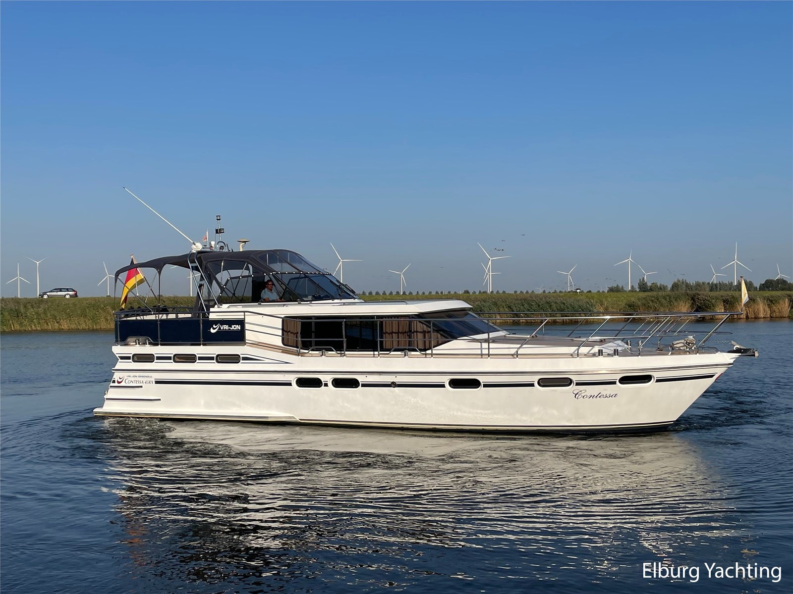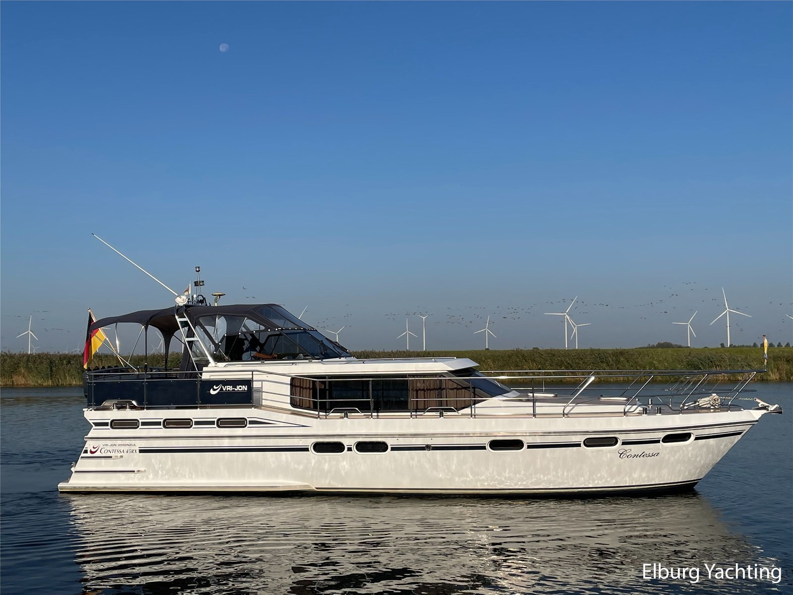 Spacious Vri-Jon Contessa 45RX built by the well-known Dutch Vri-Jon yard in Ossenzijl. This Vri-Jon is a perfect cruiser to explore Dutch, but also foreign waters with. She is equipped with a technically advanced rotating nozzle with pulling propeller. This mechanism is very efficient and gives a lot of control when manoeuvring the yacht. Throughout the yacht, the Vri-Jon yard's years of experience stand out well. The spacious saloon with storage space, cosy dinette opposite the spacious galley, the pleasant forward cabin with its own wet cell and, of course, the spacious aft cabin with free-standing bed and spacious wet cell with shower cubicle and washer/dryer combination. The yacht is equipped all around with a low-maintenance cork deck with a stainless steel sea railing. The outside steering position is equipped with a clear Navio boat control system in combination with a Navio Power steering system that also controls the autopilot. The yacht is also equipped with a recent Simrad chart plotter and electric anchor winch with remote control. This yacht is completely gas - free. Minimum headroom is appr. 2.75 metres. For questions and/or to make an appointment, you are welcome 7 days a week at Elburg Yachting.