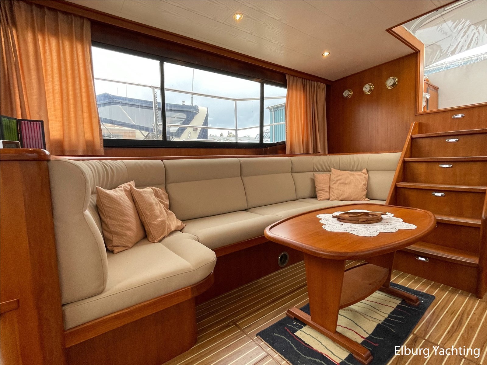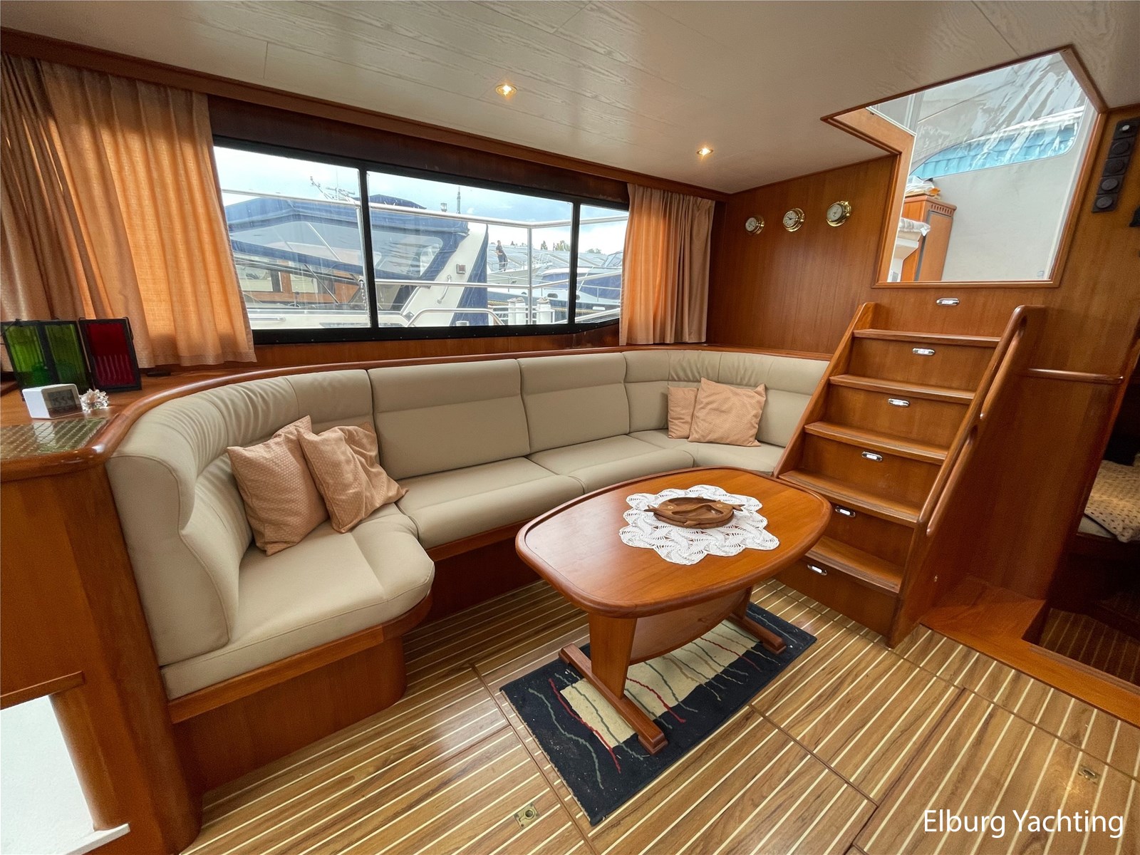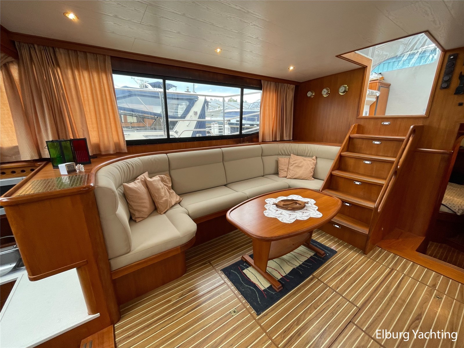 - Solid teak panelling with marine floor throughout the yacht in combination with beige upholstery