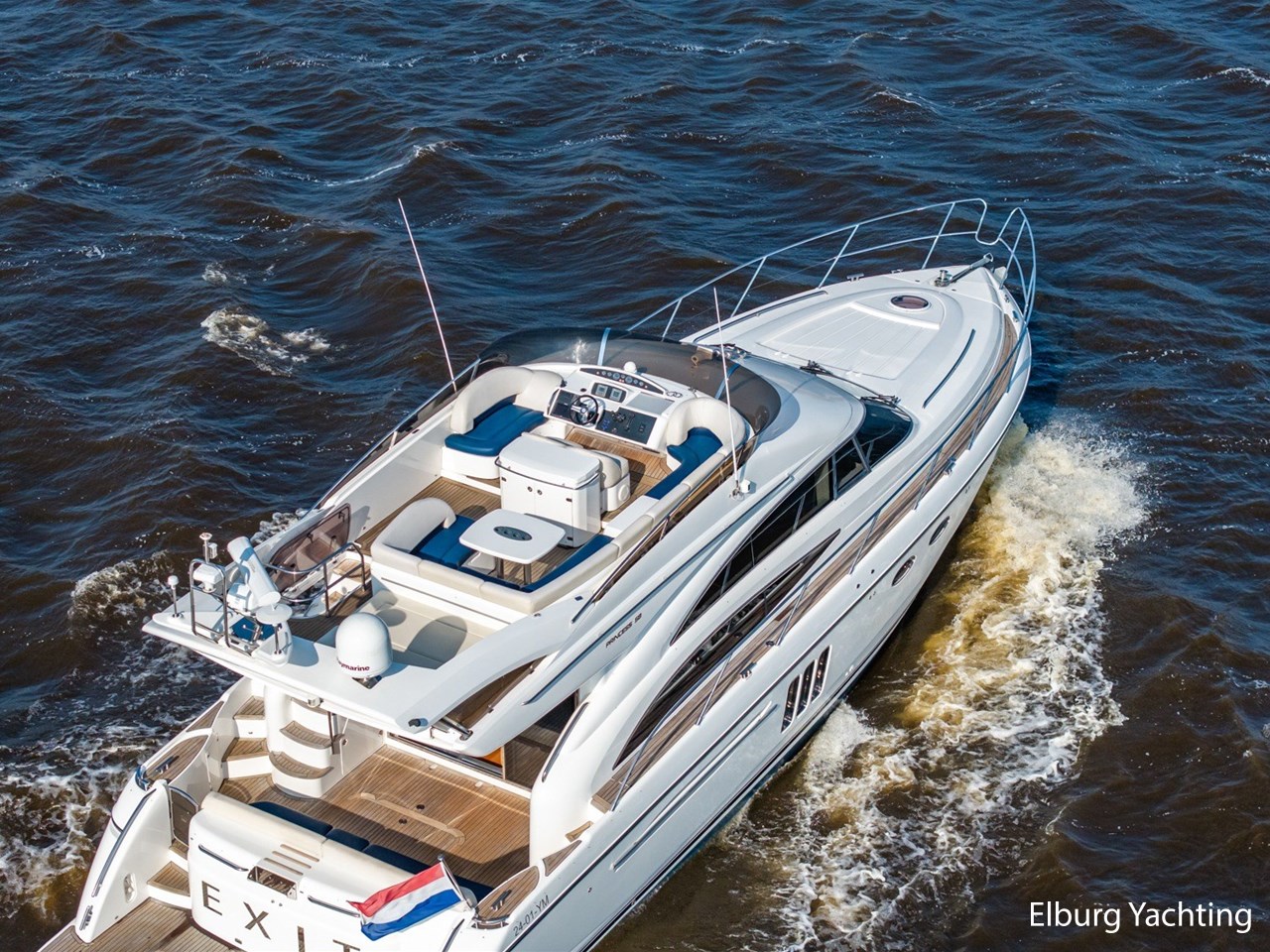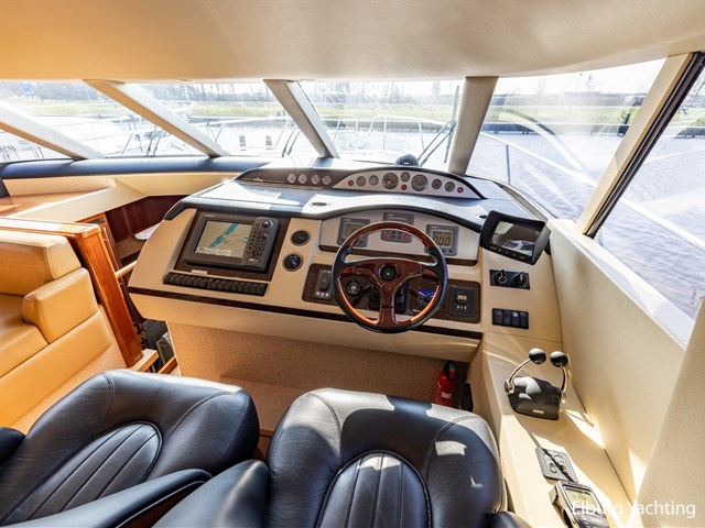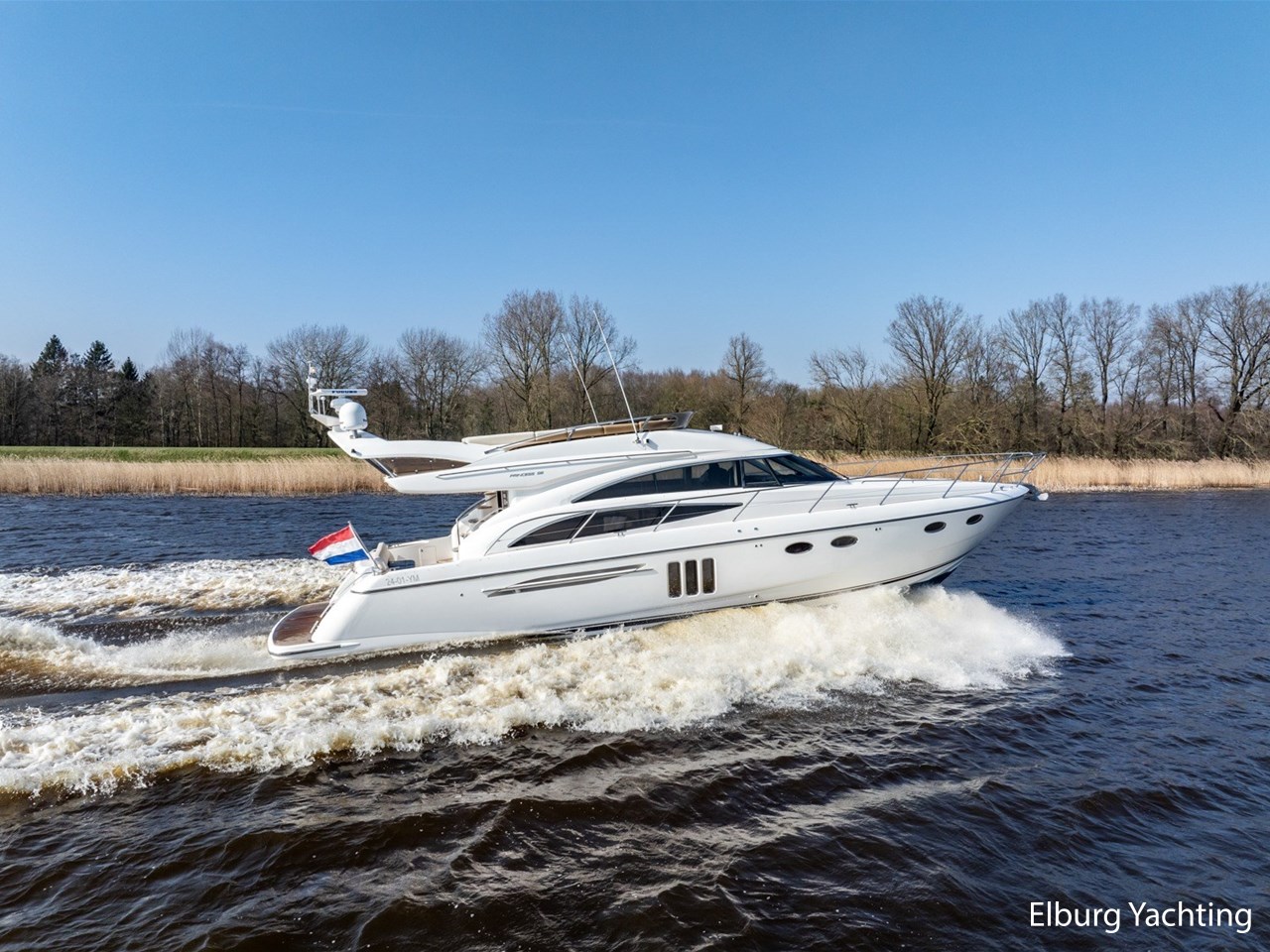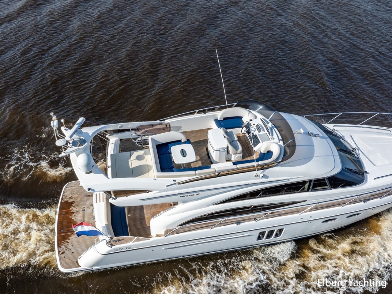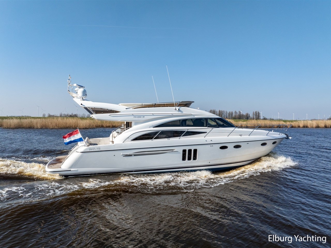Beautiful Princess 58 Flybridge from renowned yacht builder Princess Yachts. The yacht features high-quality finishes and is fully equipped. The Princess 58 Fybridge has three spacious cabins, two of which have en-suite facilities. The yacht also has a crew cabin that can be accessed via the cockpit bench. The owners cabin is amidships with beautiful windows that provide plenty of light, great views and can be opened for ventilation. Luxurious interior. Spacious open cockpit that can be fully closed by means of a tent and has new upholstery (2024). Large stainless steel sliding door to spacious saloon, connecting indoor and outdoor space. Entering the saloon, you will find a spacious u-shaped settee with a TV on lift. The spacious dinette next to the steering position ensures that it is possible for the skipper to stay in touch with the company on board, the steering position features 2 luxury cruising seats, and a yacht controller remote control making docking and mooring easy. The yacht features: complete cockpit tent + bimini (2024), screens for the windows (2024), high-gloss cherry wood interior with beige leather upholstery, white suede ceilings, Bose audio system, fridge in saloon, new combi microwave (2024), dinette at co-sailing height, 2 leather cruising seats, rear-view camera, CruisAir air conditioning controllable in each room, Zanussi dishwasher, Bosch washer-dryer combination, lots of light through large windows in owner's cabin, one of the windows can be opened for ventilation, 2 showers in lockable cabin, spacious cockpit with lazy stairs to flybridge, wetbar with sink and grill on flybridge, refrigeration space between the benches, berth space on flybridge, upholstery completely covered with covers. For questions and/or to make an appointment, you are welcome 7 days a week at Elburg Yachting.