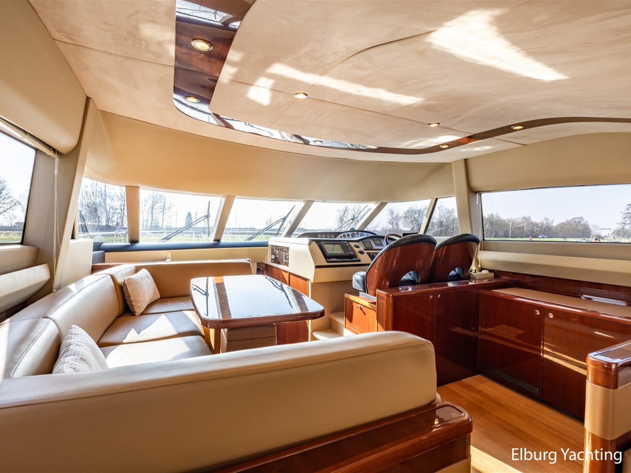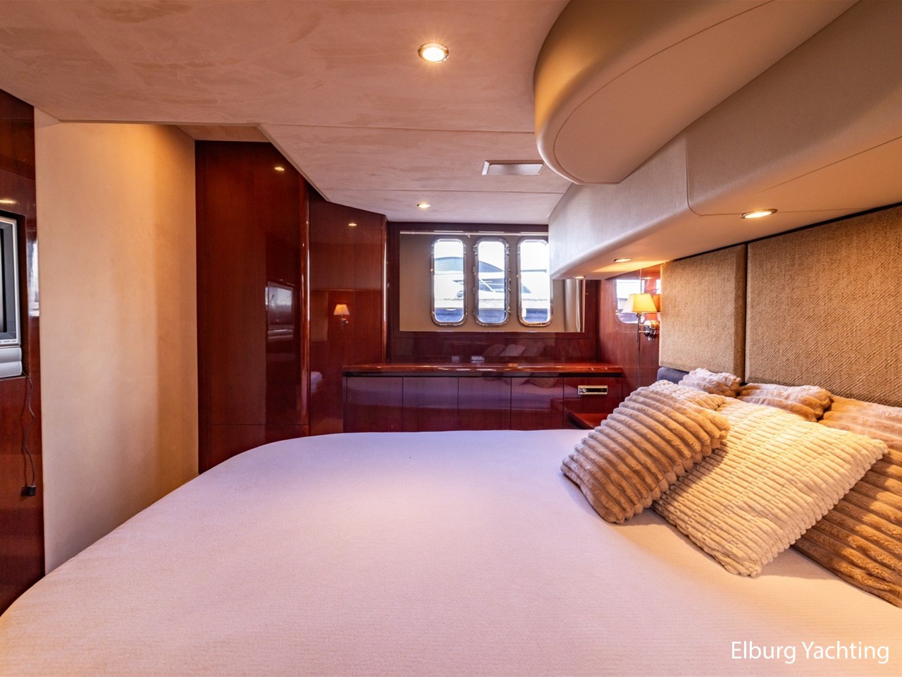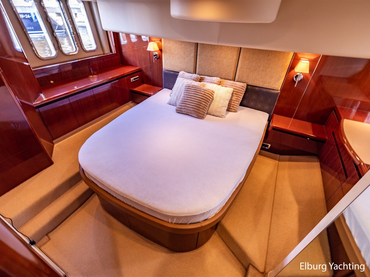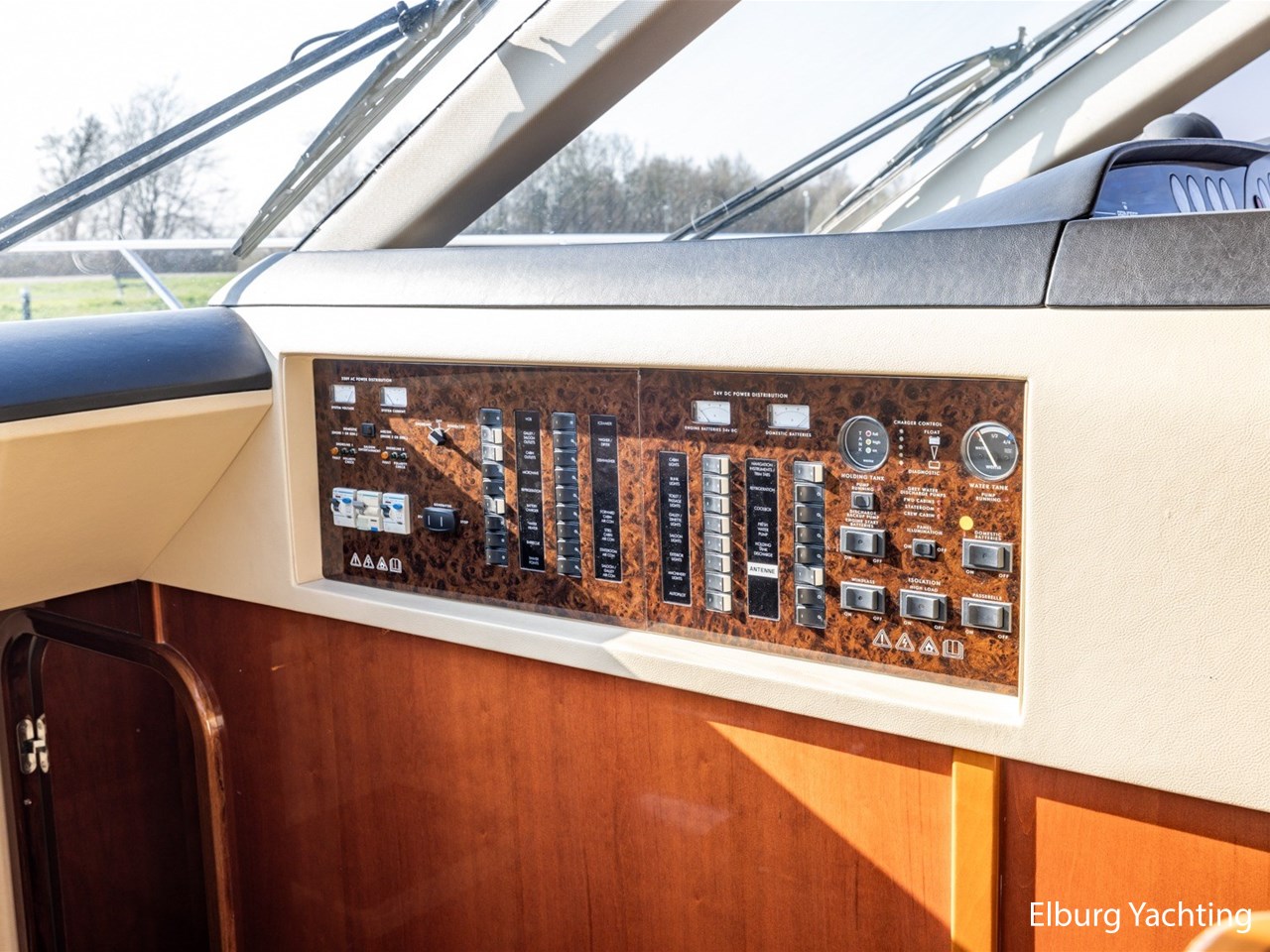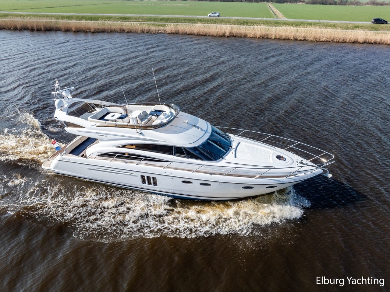 Beautiful Princess 58 Flybridge from renowned yacht builder Princess Yachts. The yacht features high-quality finishes and is fully equipped. The Princess 58 Fybridge has three spacious cabins, two of which have en-suite facilities. The yacht also has a crew cabin that can be accessed via the cockpit bench. The owners cabin is amidships with beautiful windows that provide plenty of light, great views and can be opened for ventilation. Luxurious interior. Spacious open cockpit that can be fully closed by means of a tent and has new upholstery (2024). Large stainless steel sliding door to spacious saloon, connecting indoor and outdoor space. Entering the saloon, you will find a spacious u-shaped settee with a TV on lift. The spacious dinette next to the steering position ensures that it is possible for the skipper to stay in touch with the company on board, the steering position features 2 luxury cruising seats, and a yacht controller remote control making docking and mooring easy. The yacht features: complete cockpit tent + bimini (2024), screens for the windows (2024), high-gloss cherry wood interior with beige leather upholstery, white suede ceilings, Bose audio system, fridge in saloon, new combi microwave (2024), dinette at co-sailing height, 2 leather cruising seats, rear-view camera, CruisAir air conditioning controllable in each room, Zanussi dishwasher, Bosch washer-dryer combination, lots of light through large windows in owner's cabin, one of the windows can be opened for ventilation, 2 showers in lockable cabin, spacious cockpit with lazy stairs to flybridge, wetbar with sink and grill on flybridge, refrigeration space between the benches, berth space on flybridge, upholstery completely covered with covers. For questions and/or to make an appointment, you are welcome 7 days a week at Elburg Yachting.